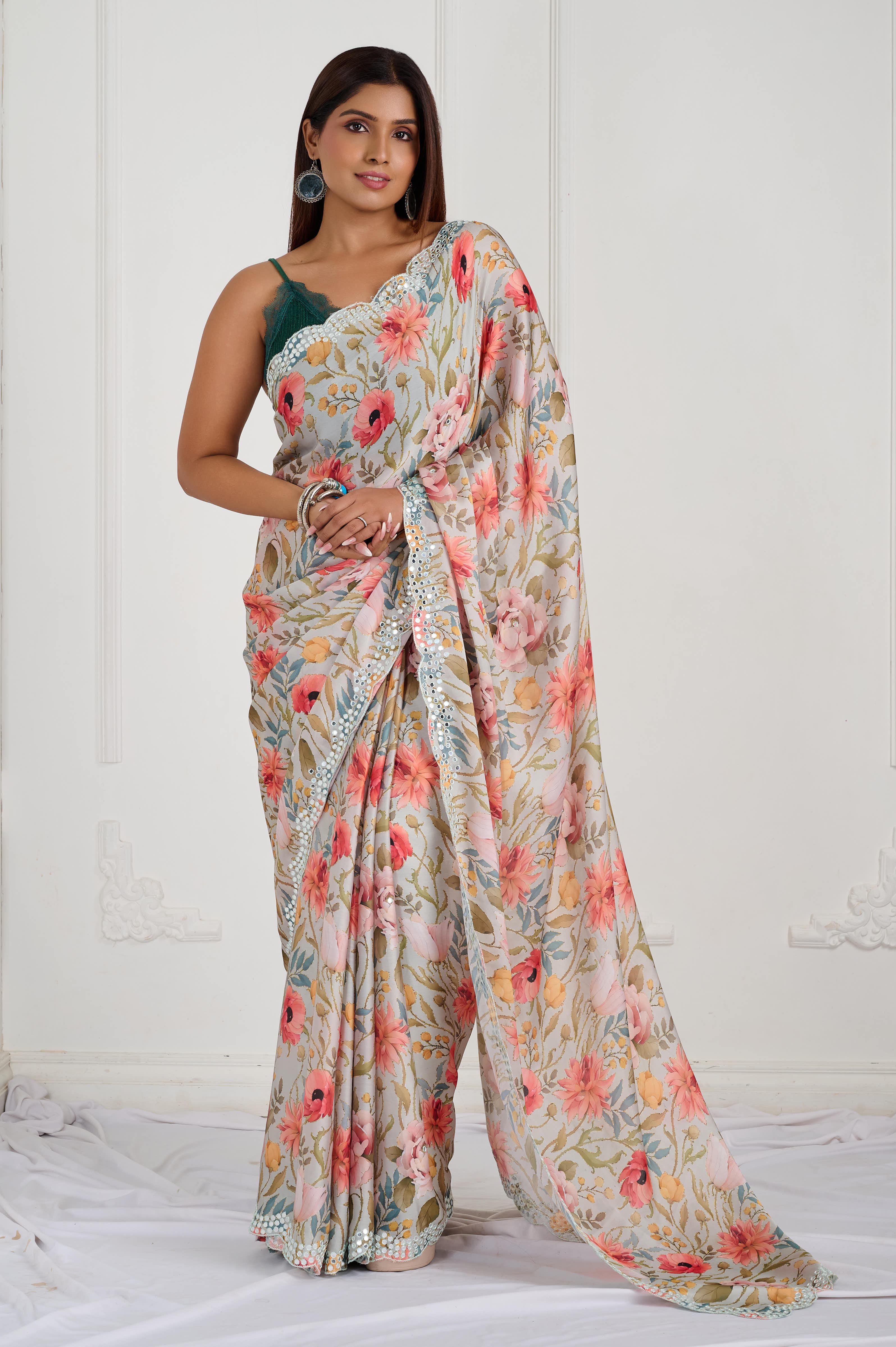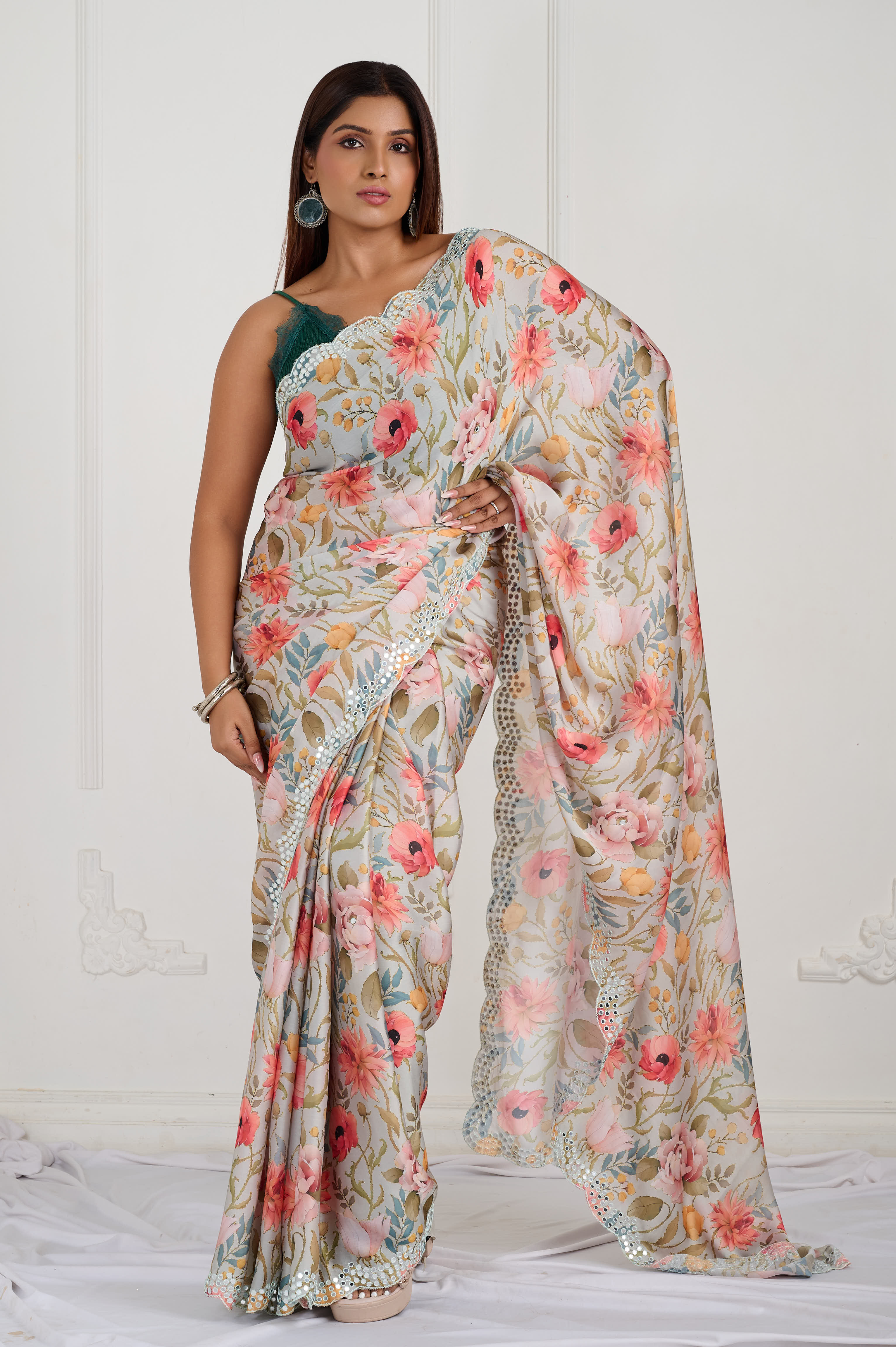 An ethereal satin saree in ice-grey with an all-over pastel floral digital print in blush, peach and sage. Finished with a white scallop cut-work lace accented with mirror work for soft sparkle. Smooth sheen with an airy fall and crisp pleats, perfect for daytime celebrations and elegant evenings.