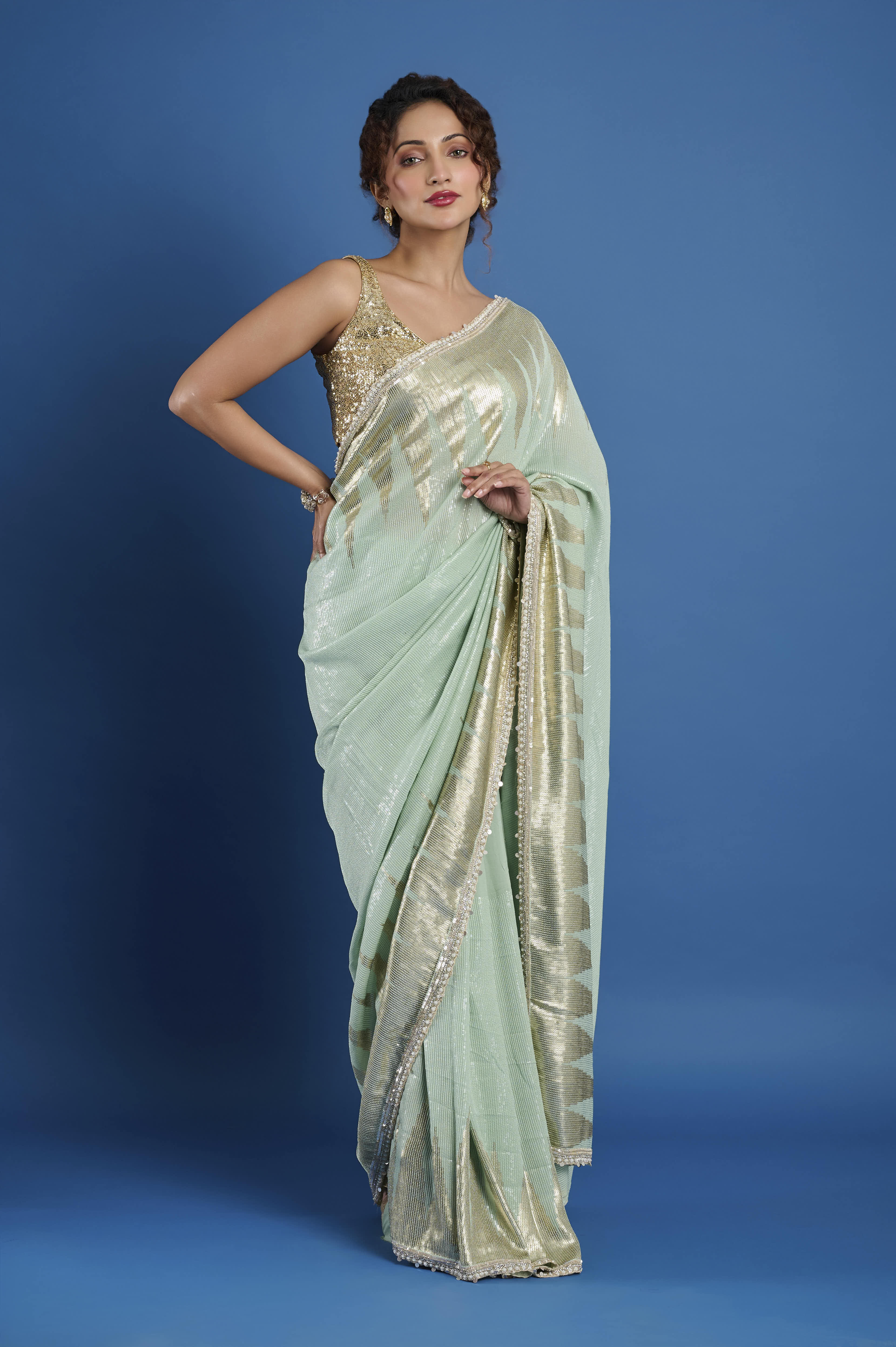 This mint green georgette saree is fully embellished with shimmering sequins, creating a mesmerizing reflective effect with every movement. The lightweight, soft georgette fabric drapes gracefully, while the scalloped sequin border adds a touch of sophistication and festive sparkle. Ideal for cocktail parties, weddings, or glamorous evenings, it comes with a matching blouse piece, perfect for custom fitting and versatile styling.