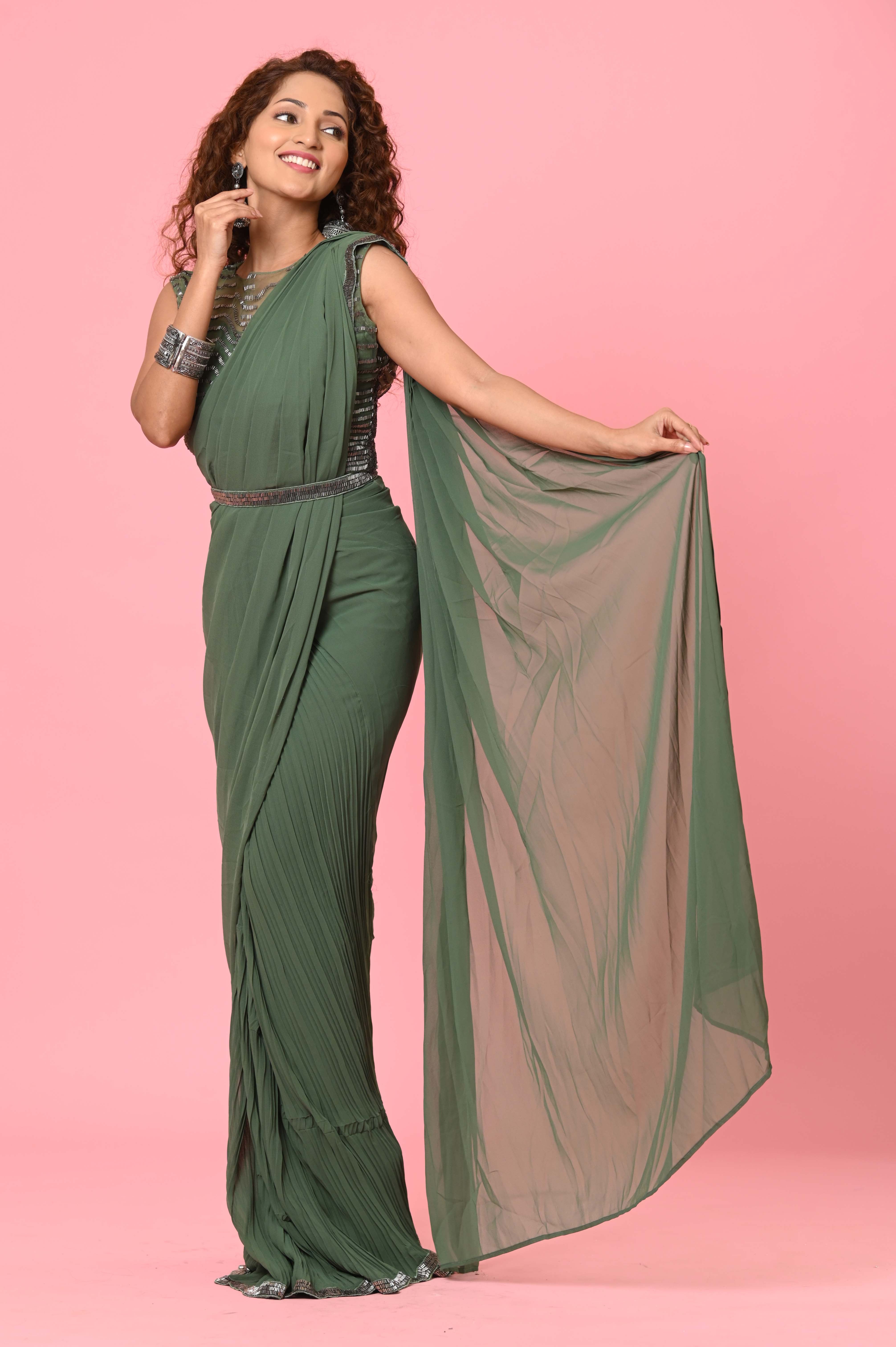 A georgette drape saree, also known as a pre-draped saree or ready-to-wear saree, is a contemporary and convenient variation of the traditional Indian saree. It features a pre-pleated or pre-stitched drape that can be easily worn, making it a popular choice for those who want the elegance of a saree without the intricate draping.