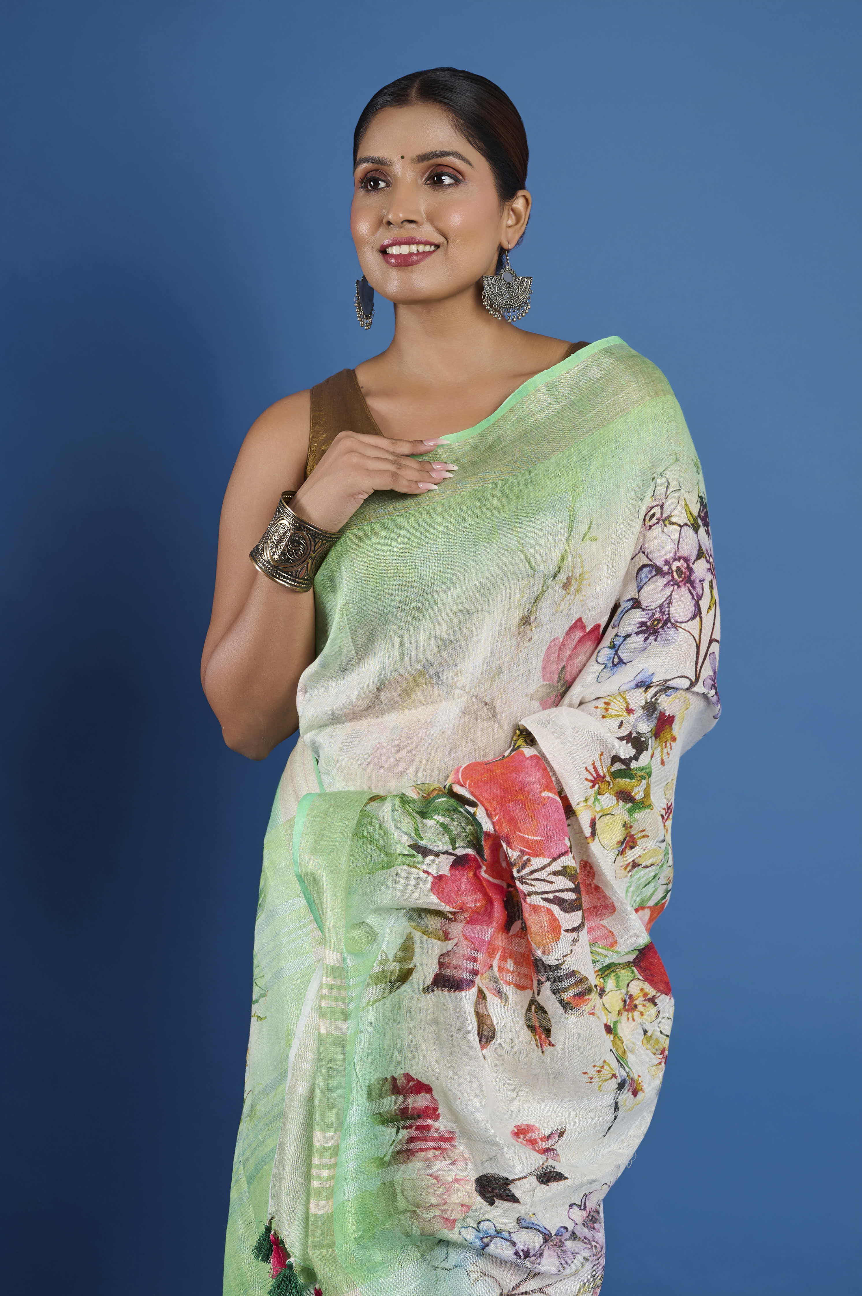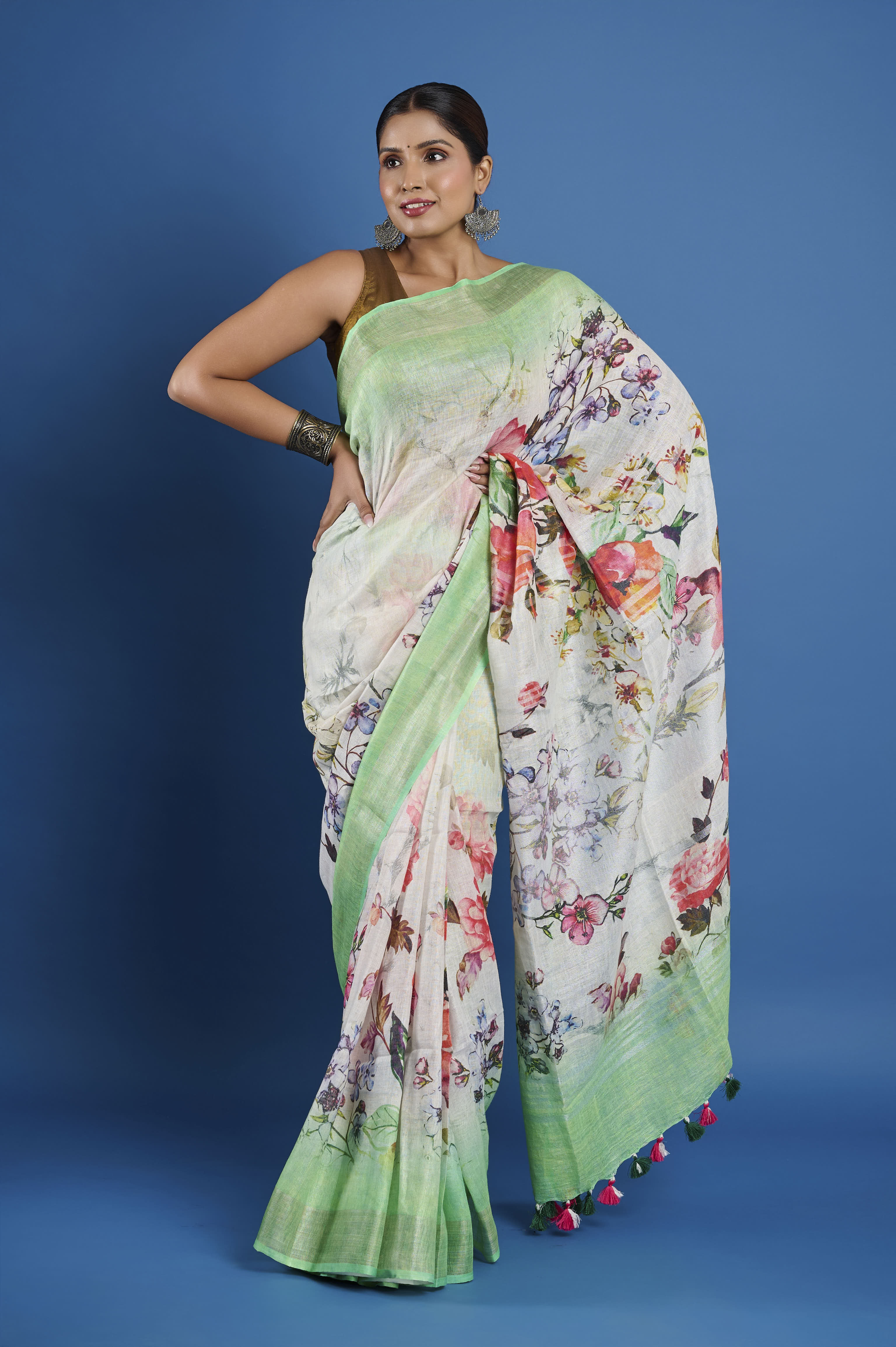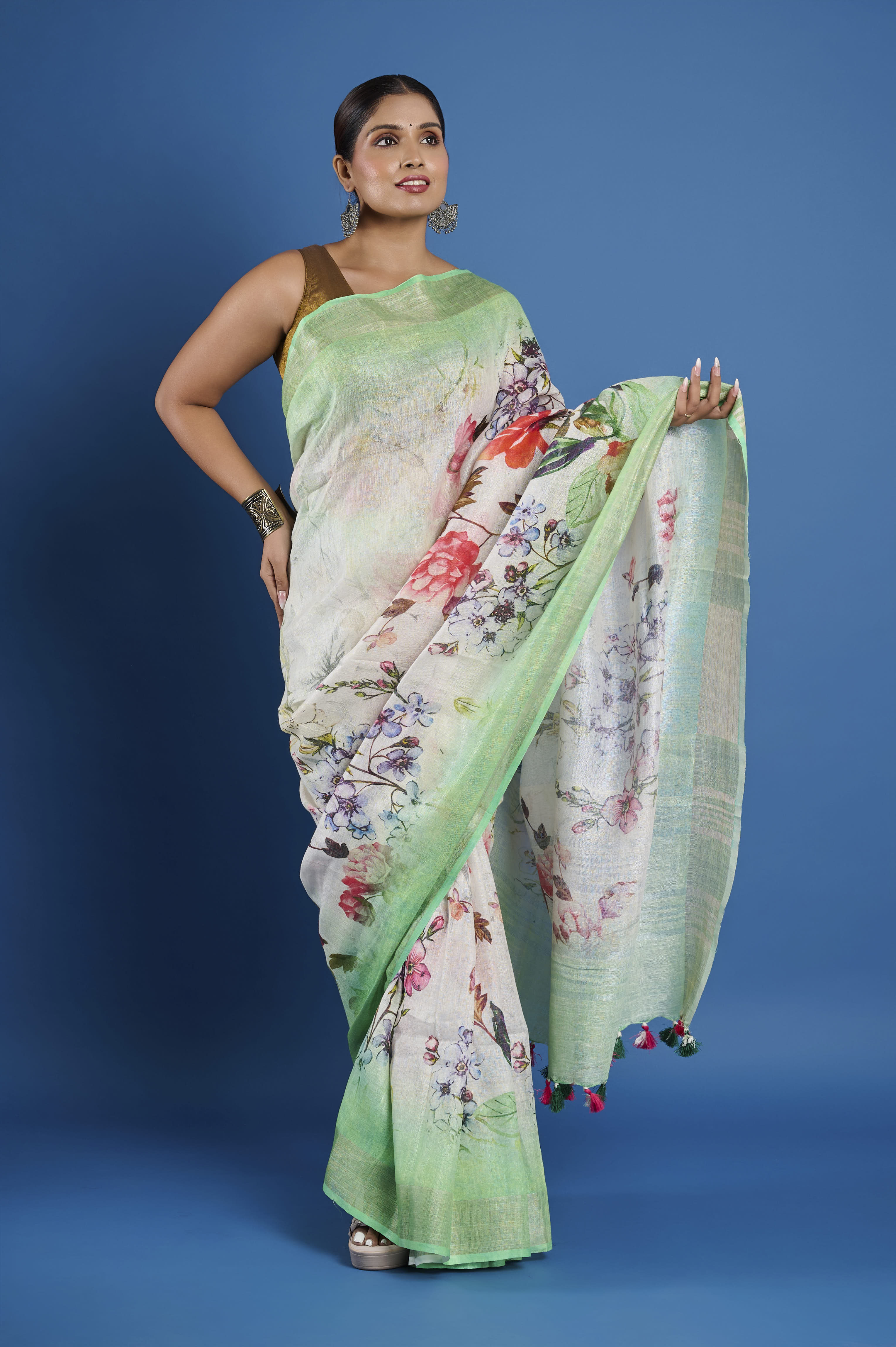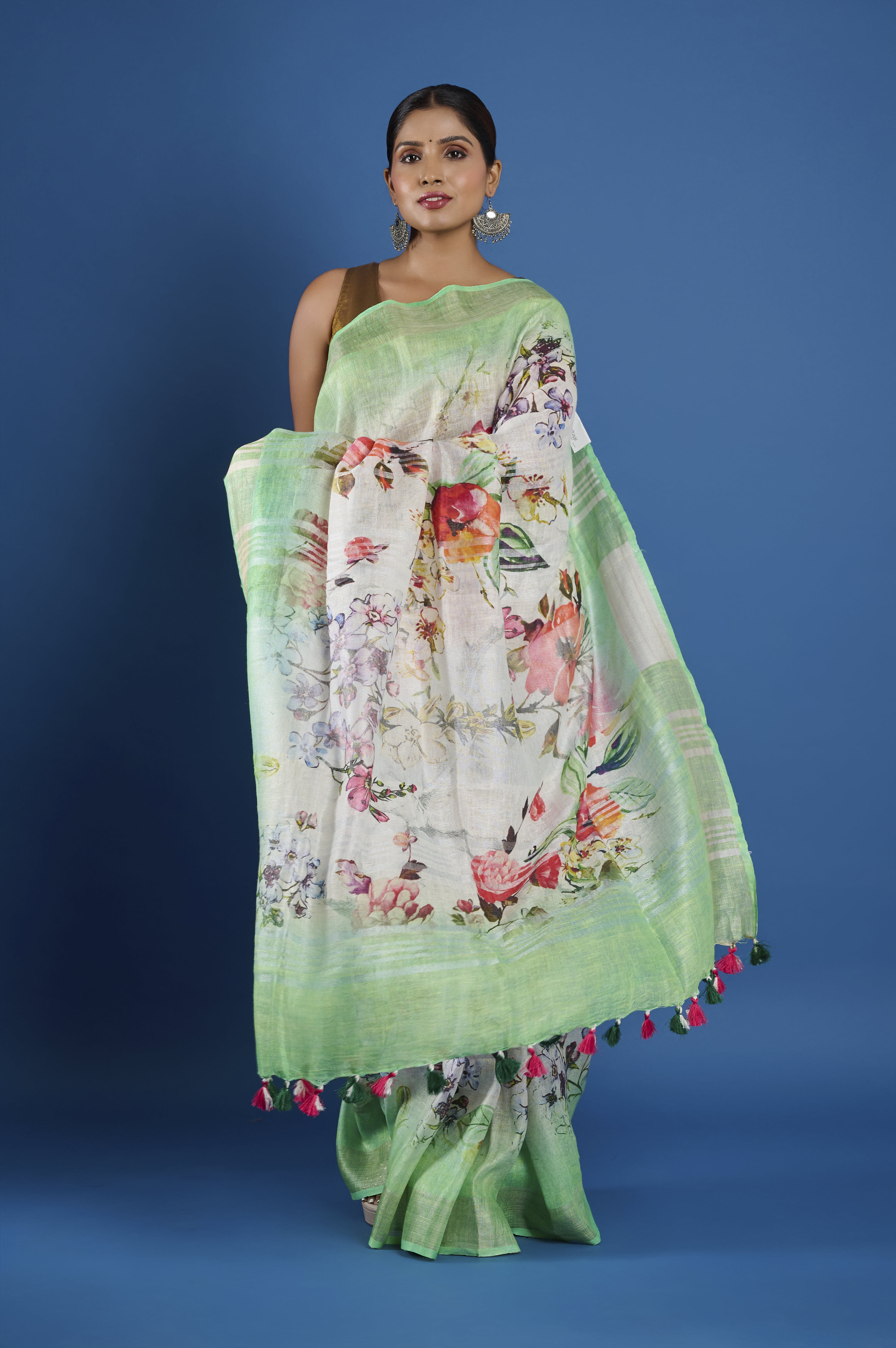 This pure linen saree features a fresh, painterly digital print in soft mint green, cream, and lively multicolored florals, finished with a breezy drape and playful tassel edging. The natural, breathable linen yarn is light and comfortable for all-day wear, giving this saree a relaxed yet artistic elegance that transitions easily from summer brunches to semi-formal gatherings. A matching unstitched blouse piece is included for personalized tailoring.