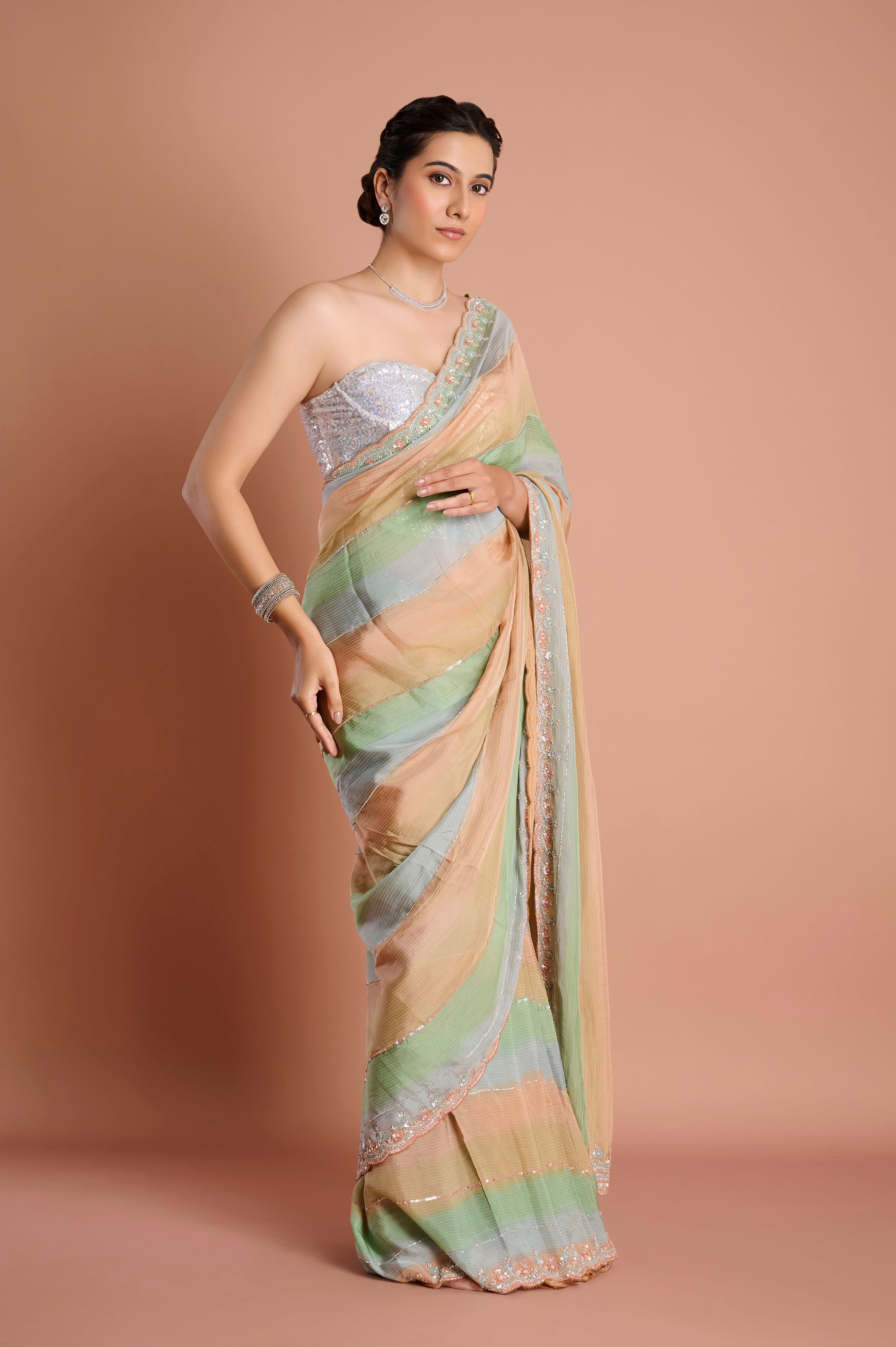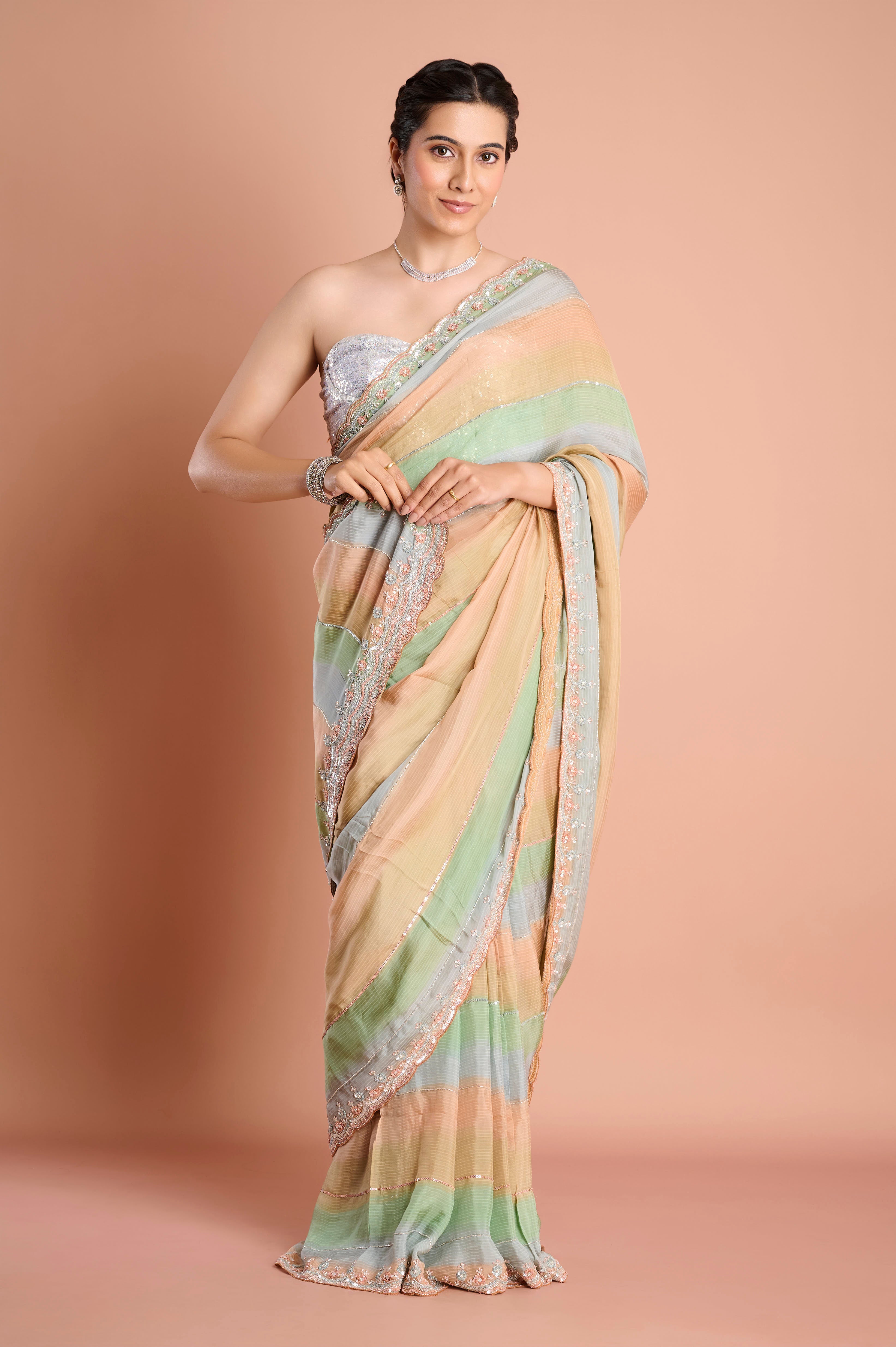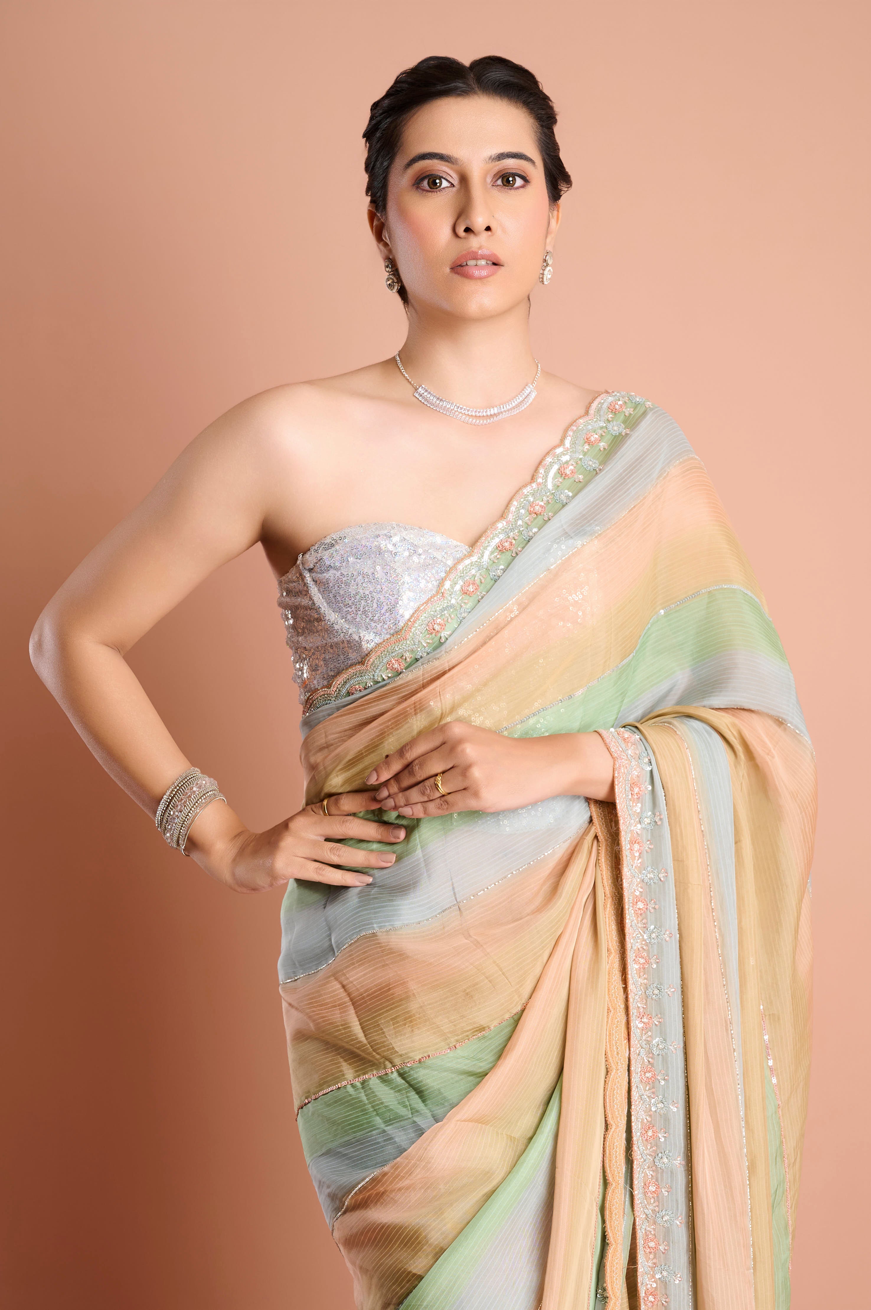 Bring a whimsical touch to any event in this soft organza saree, adorned with pastel stripes in shades of peach, mint, and silvery blue for a dreamy, modern look. The ethereal, lightweight organza fabric enhances the airy appeal and flows gracefully, while a delicately embellished border with subtle sequin and beadwork adds just the right amount of sparkle. Perfect for summer soirees, garden parties, or daytime festivities, this saree ensures youÕll make a sophisticated and unforgettable impression. An unstitched blouse piece is included for your personal finishing touch.