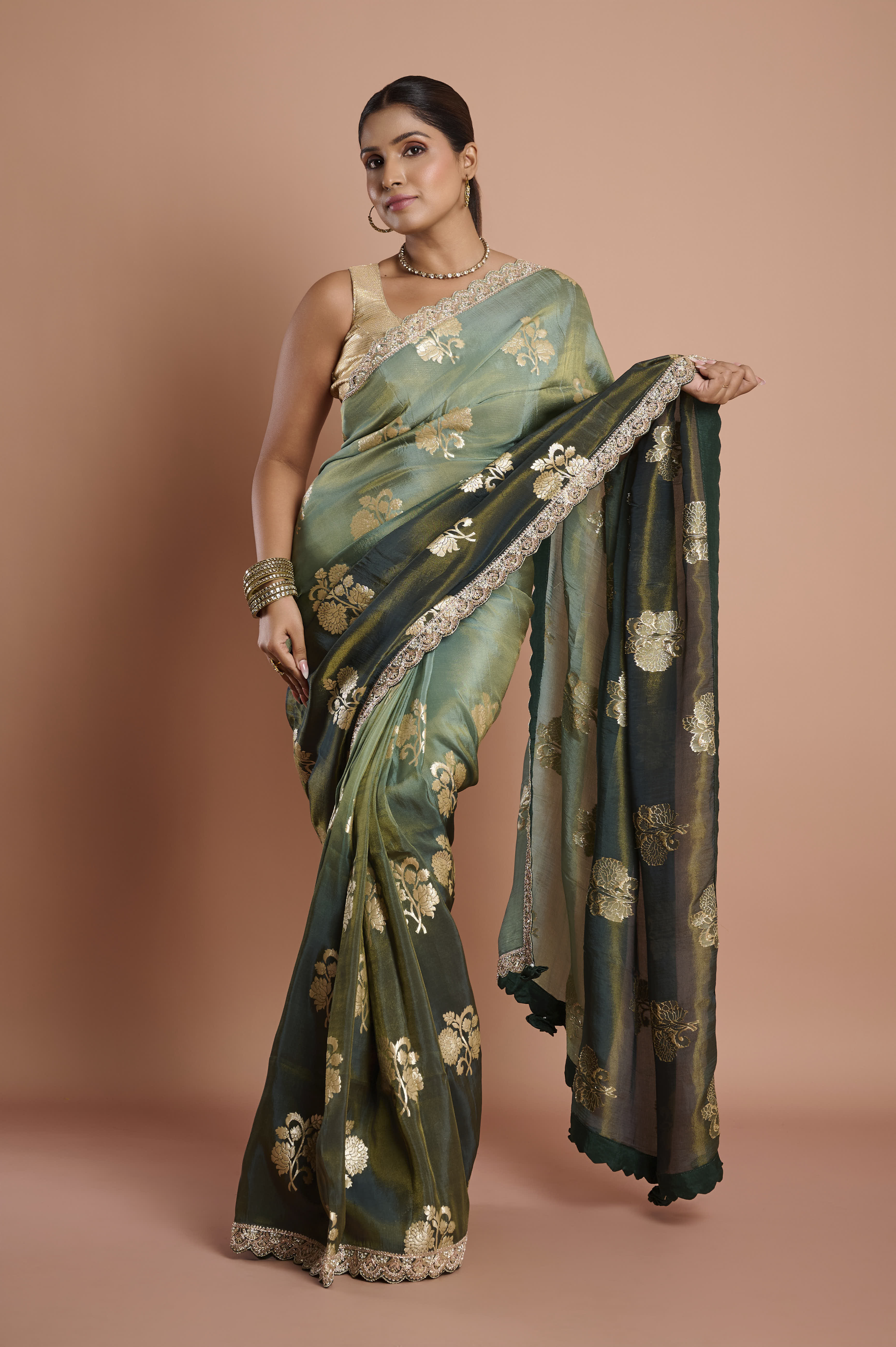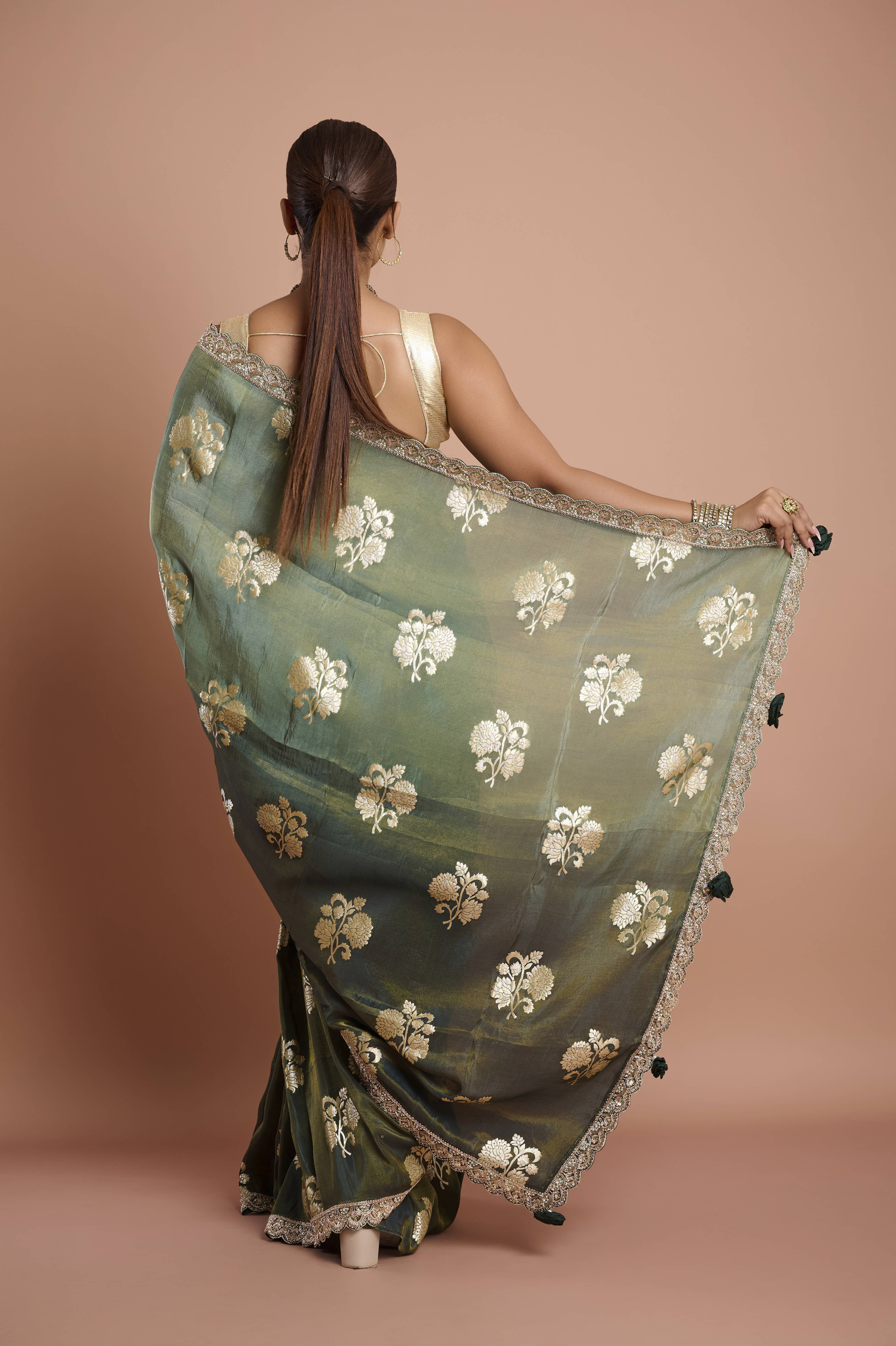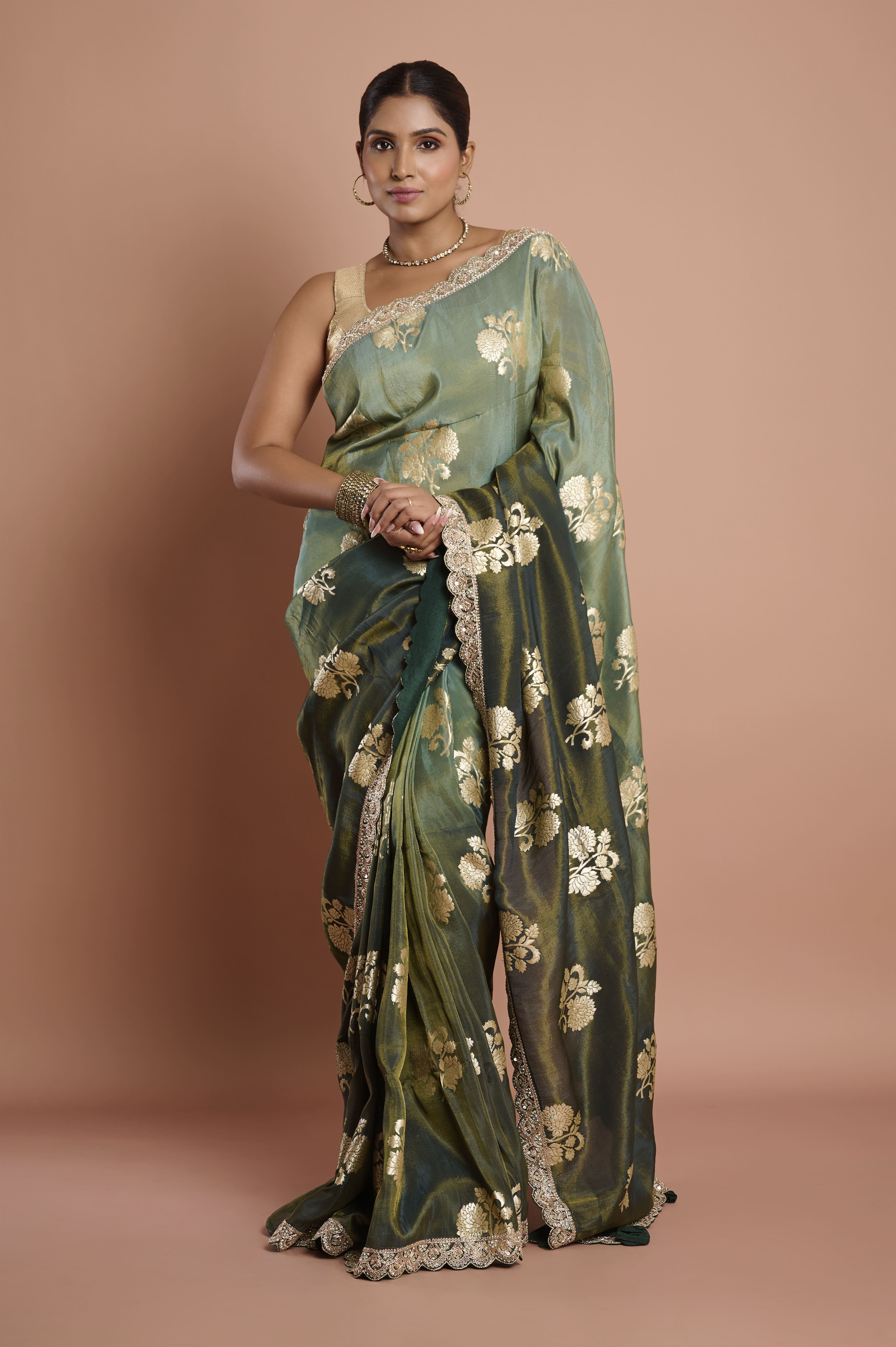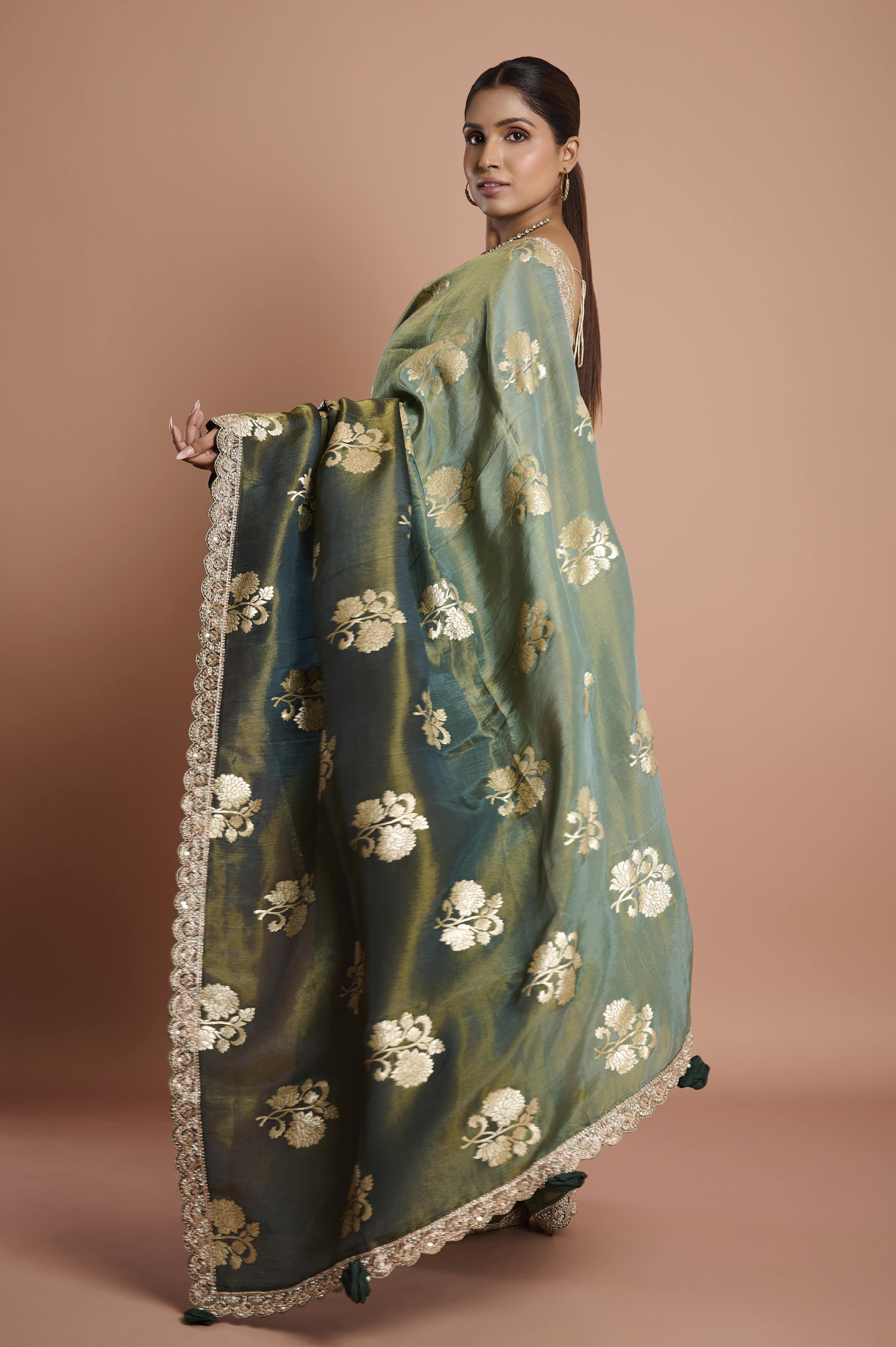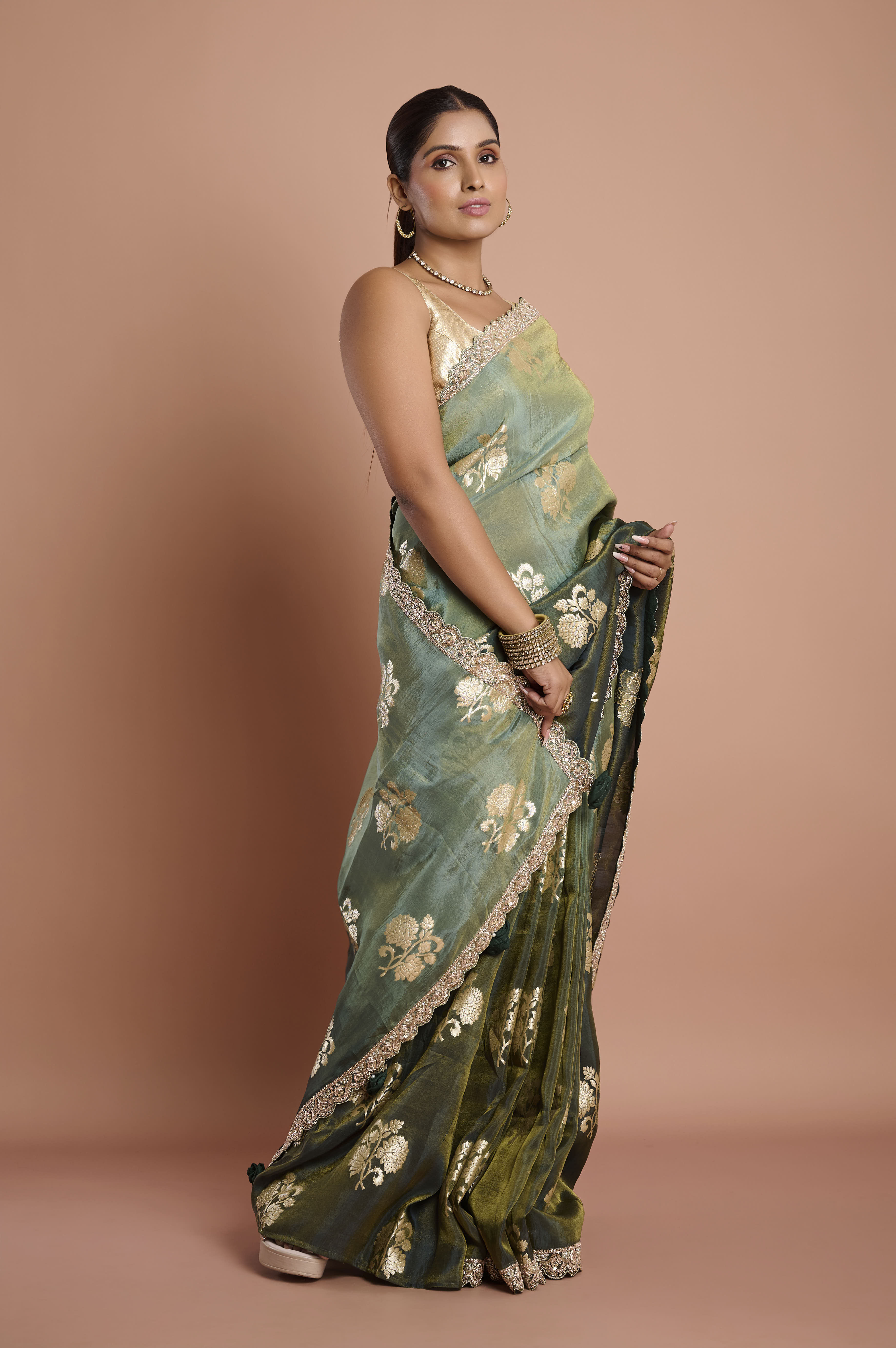 Channel festive elegance with this deep olive green tissue saree, brilliantly adorned with zari-woven floral motifs throughout and further elevated by luxurious zardosi and bead work. The border is intricately embellished with hand-done zardosi, pearls, sequins, and metallic threads, adding dimensional shine and opulence. The light, sheer tissue drapes with a glowing finish, perfect for celebratory evenings, weddings, or receptions. An unstitched blouse piece is provided, allowing for personalized tailoring.