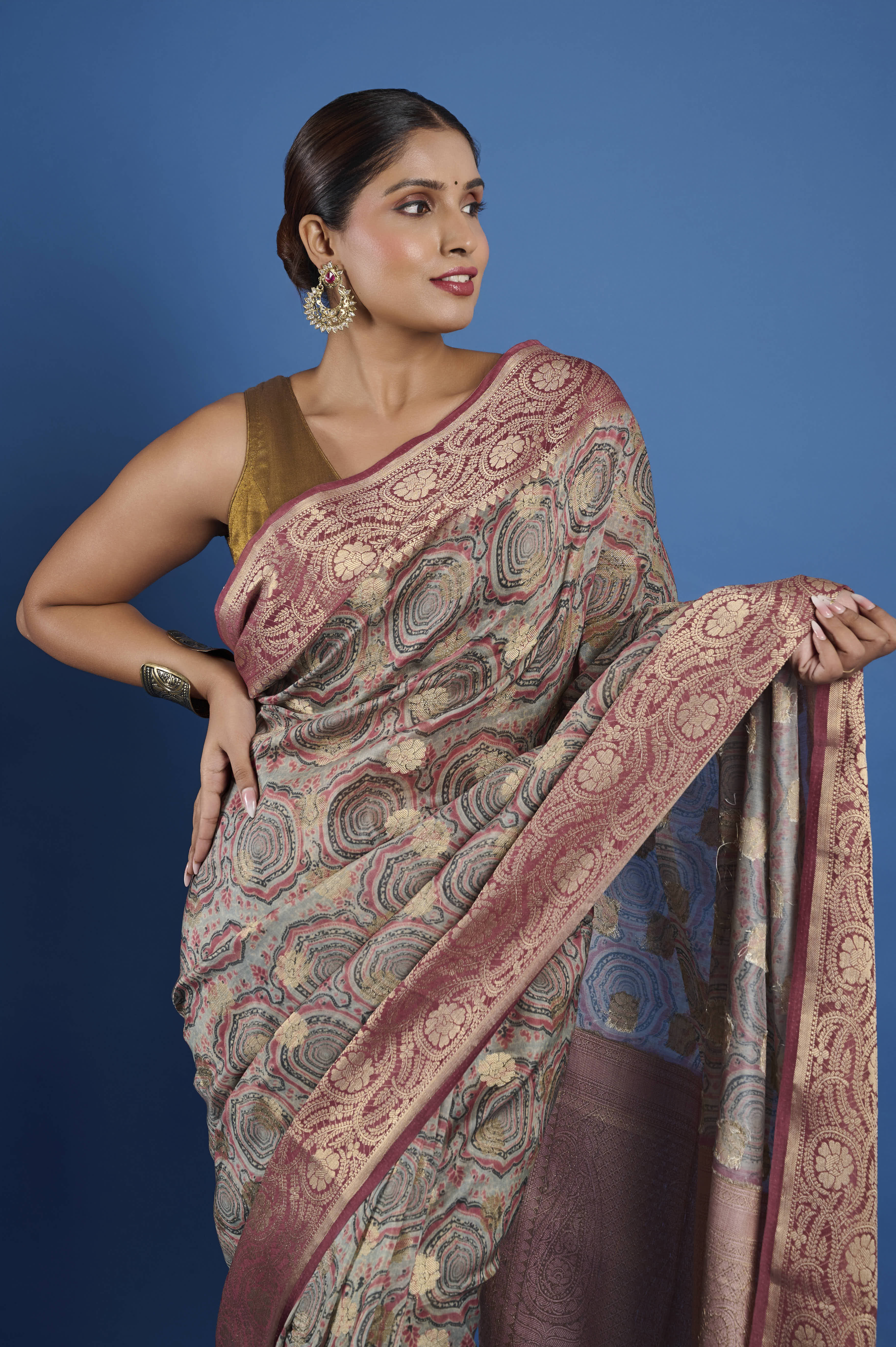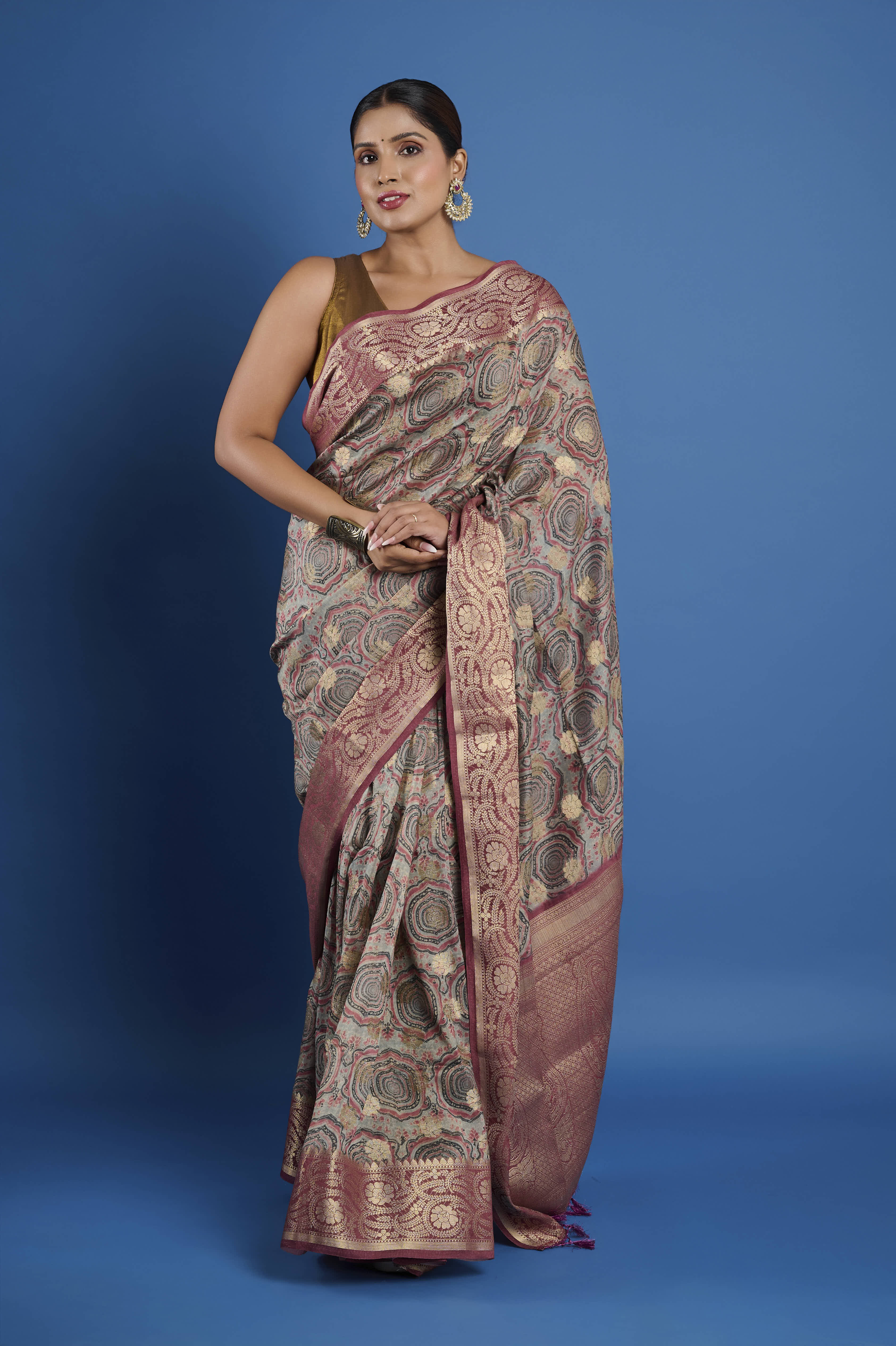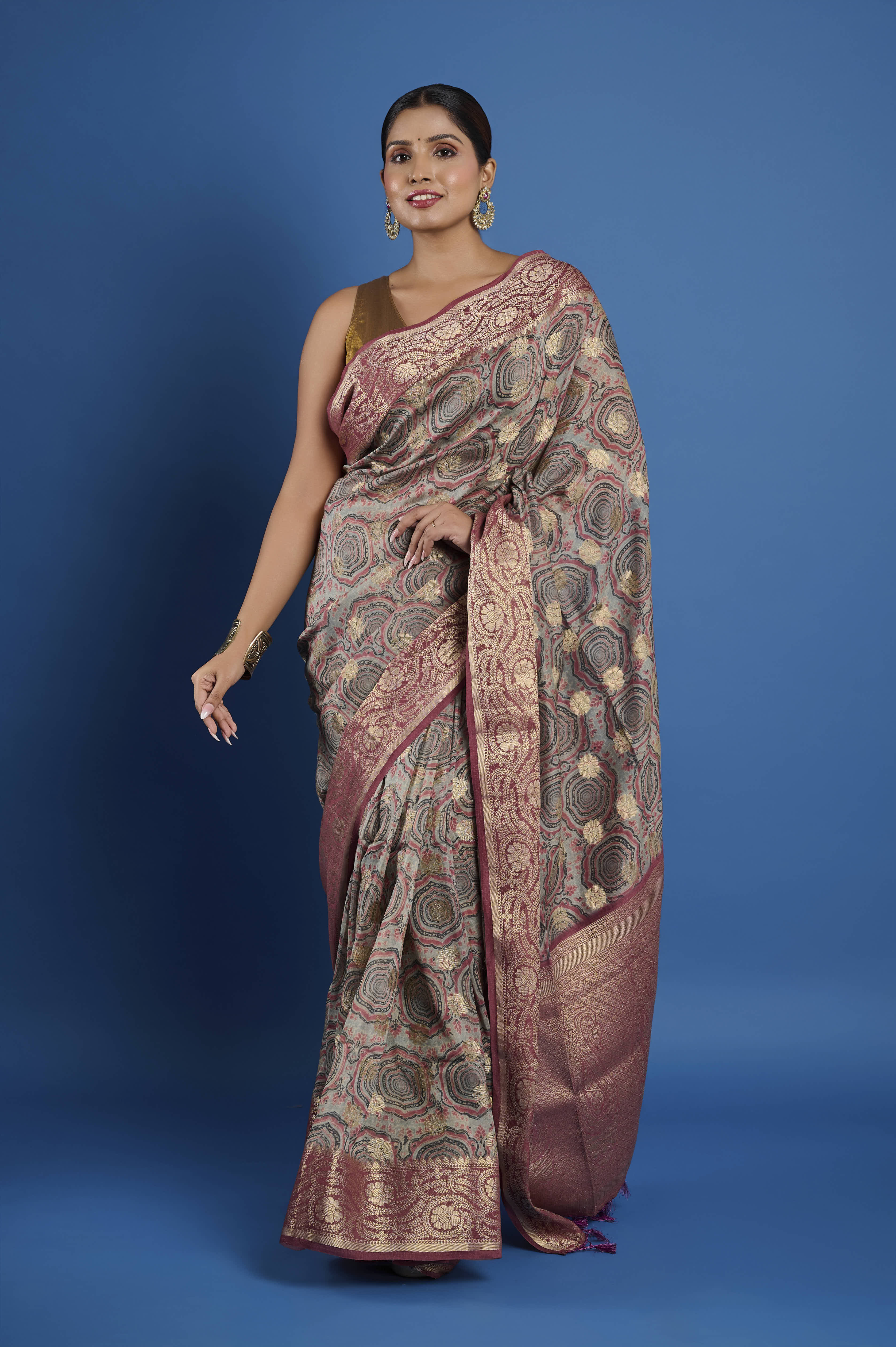 This pure Chanderi saree features a contemporary geometric digital print pattern in muted sage, rose, and champagne tones, paired with an elaborate antique rose gold zari border and pallu. The signature feather-light, semi-sheer Chanderi fabric ensures an elegant, comfortable drape and gentle sheen, making it a sophisticated pick for festive gatherings, formal daytime events, or elegant evening occasions. A matching unstitched blouse piece is included for custom tailoring.