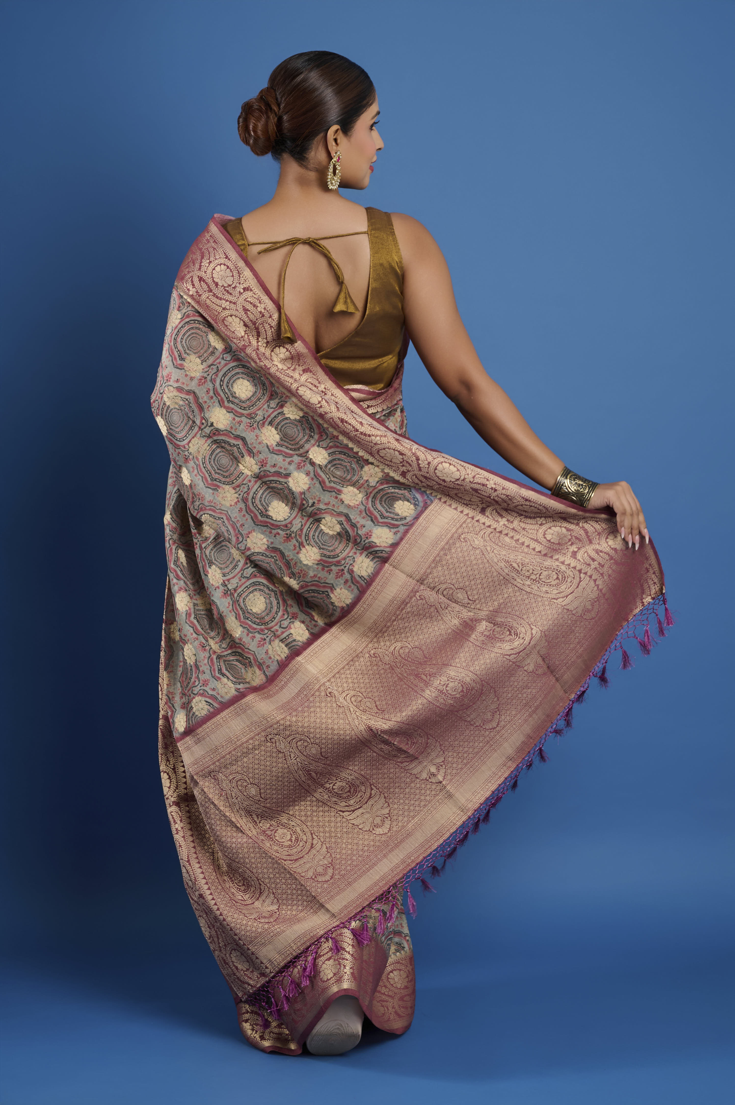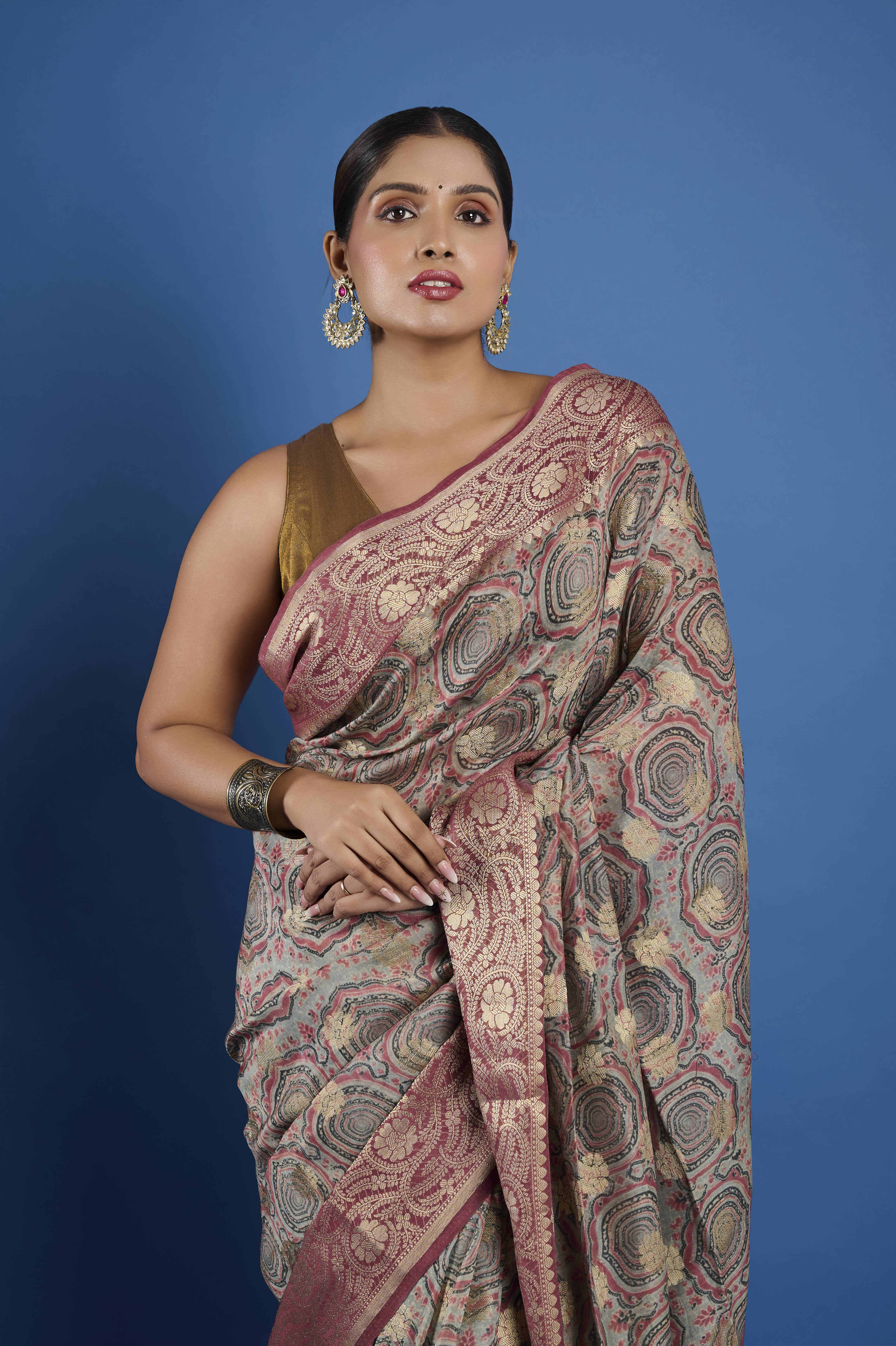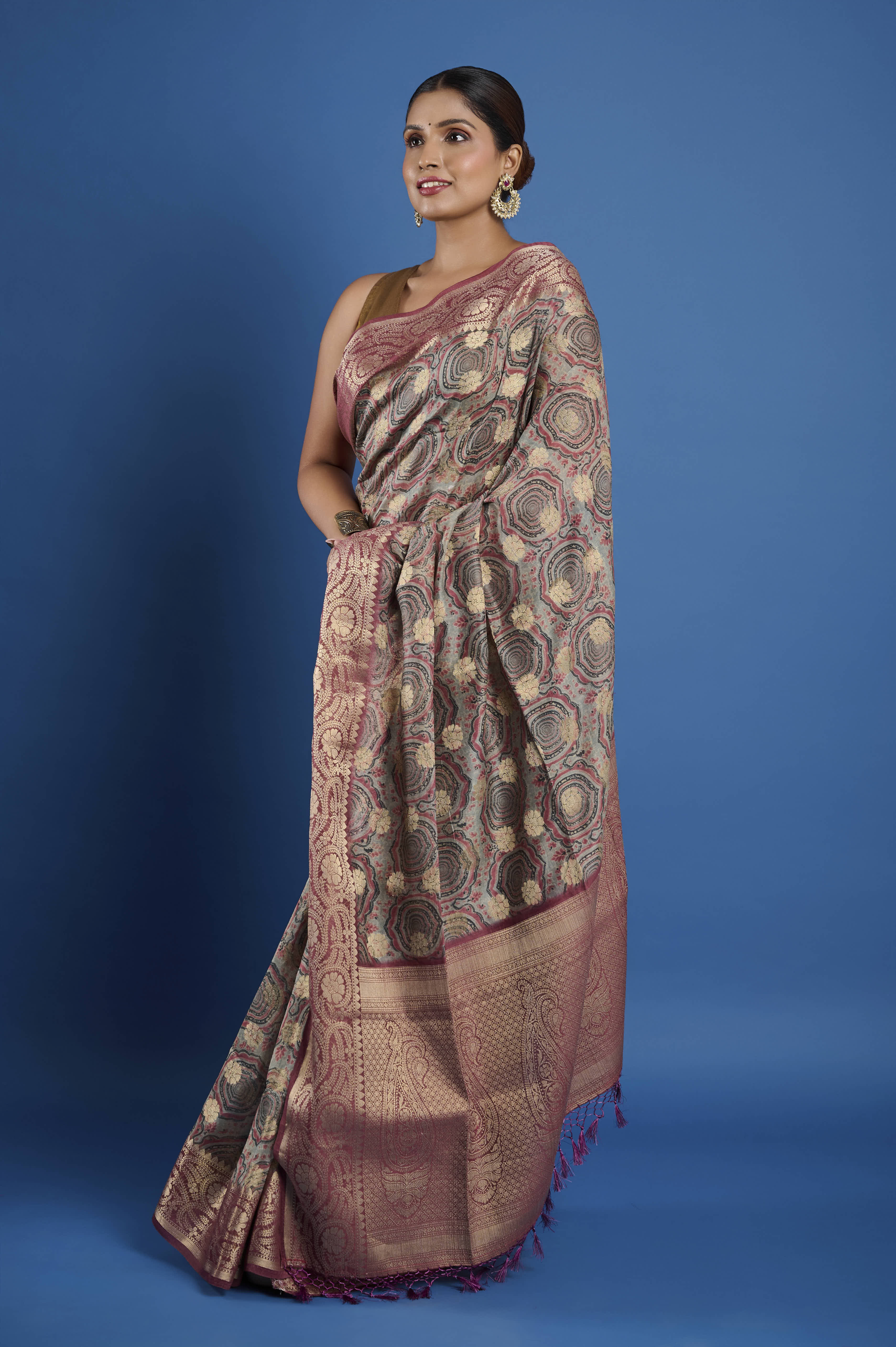 This pure Chanderi saree features a contemporary geometric digital print pattern in muted sage, rose, and champagne tones, paired with an elaborate antique rose gold zari border and pallu. The signature feather-light, semi-sheer Chanderi fabric ensures an elegant, comfortable drape and gentle sheen, making it a sophisticated pick for festive gatherings, formal daytime events, or elegant evening occasions. A matching unstitched blouse piece is included for custom tailoring.