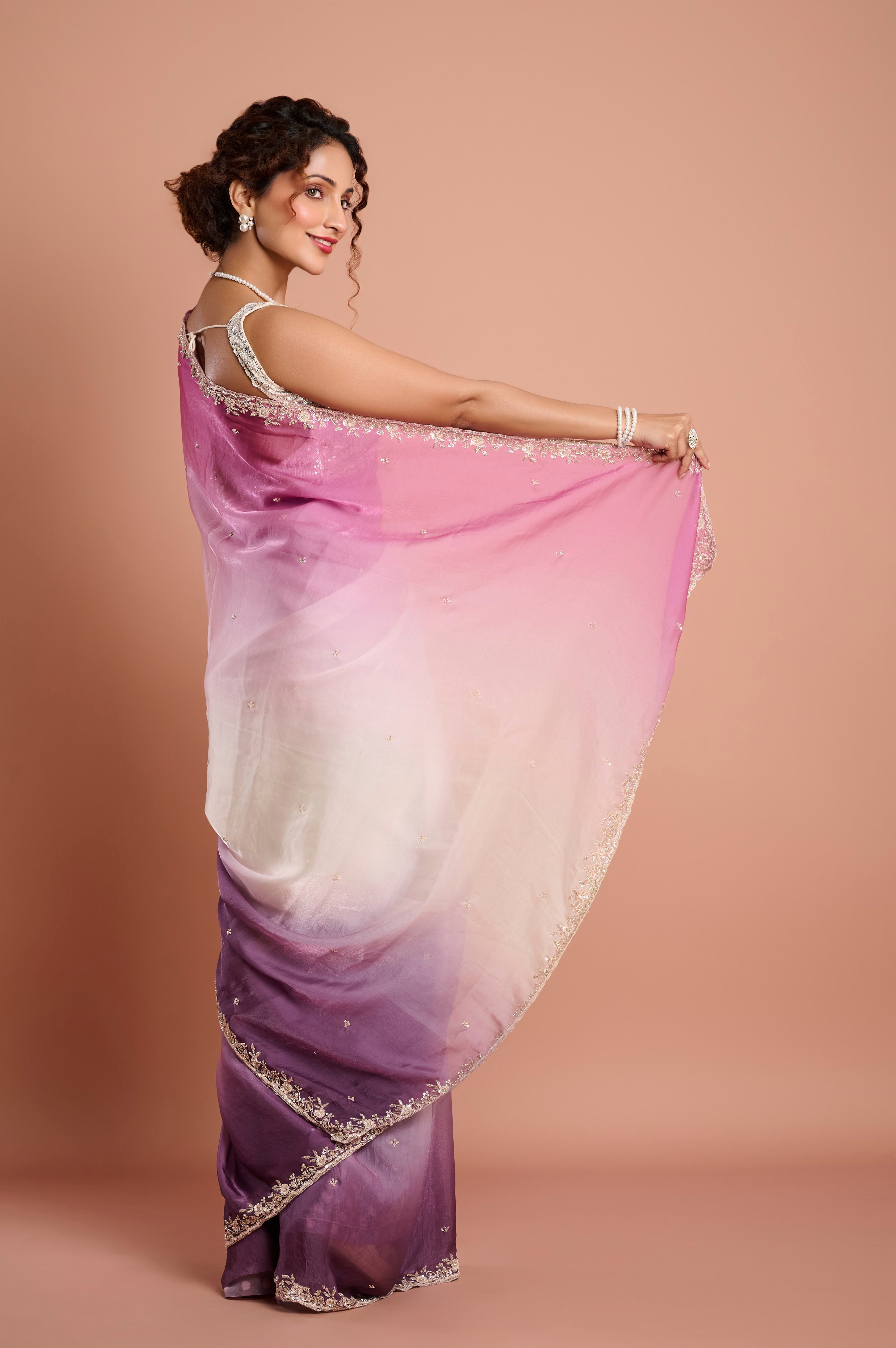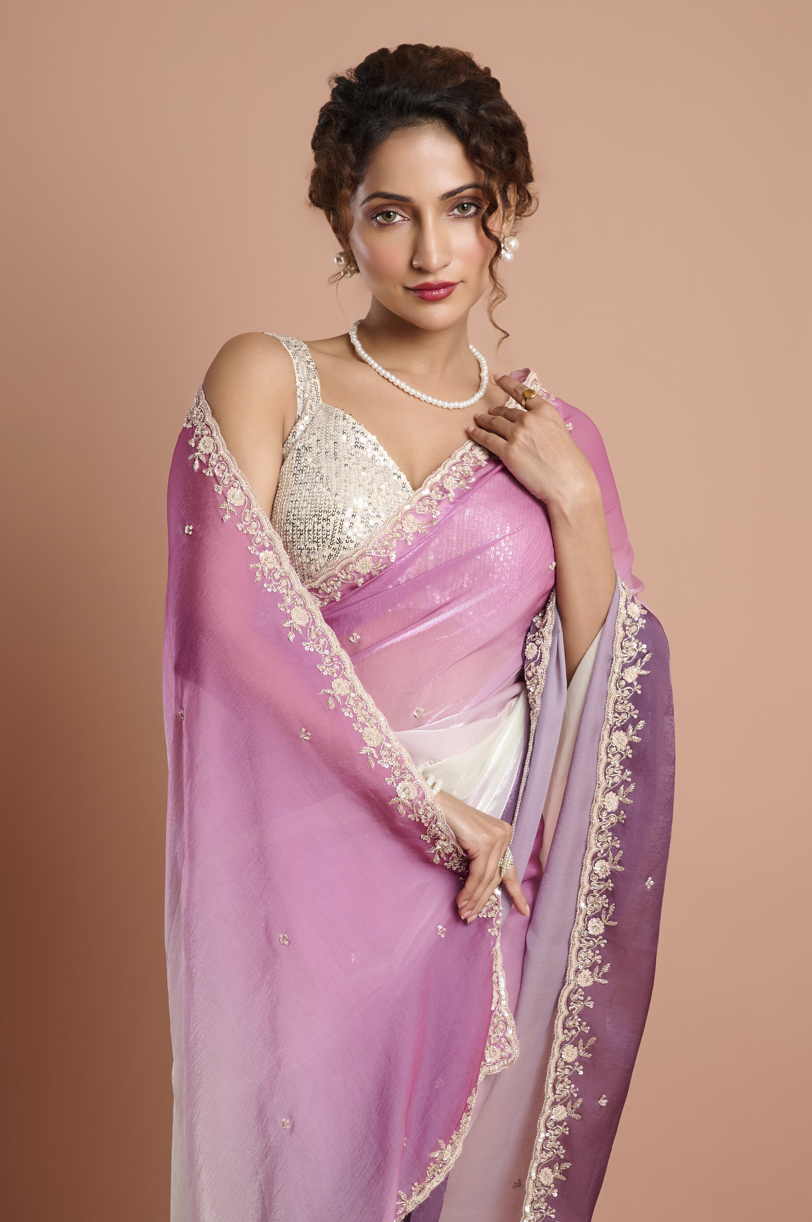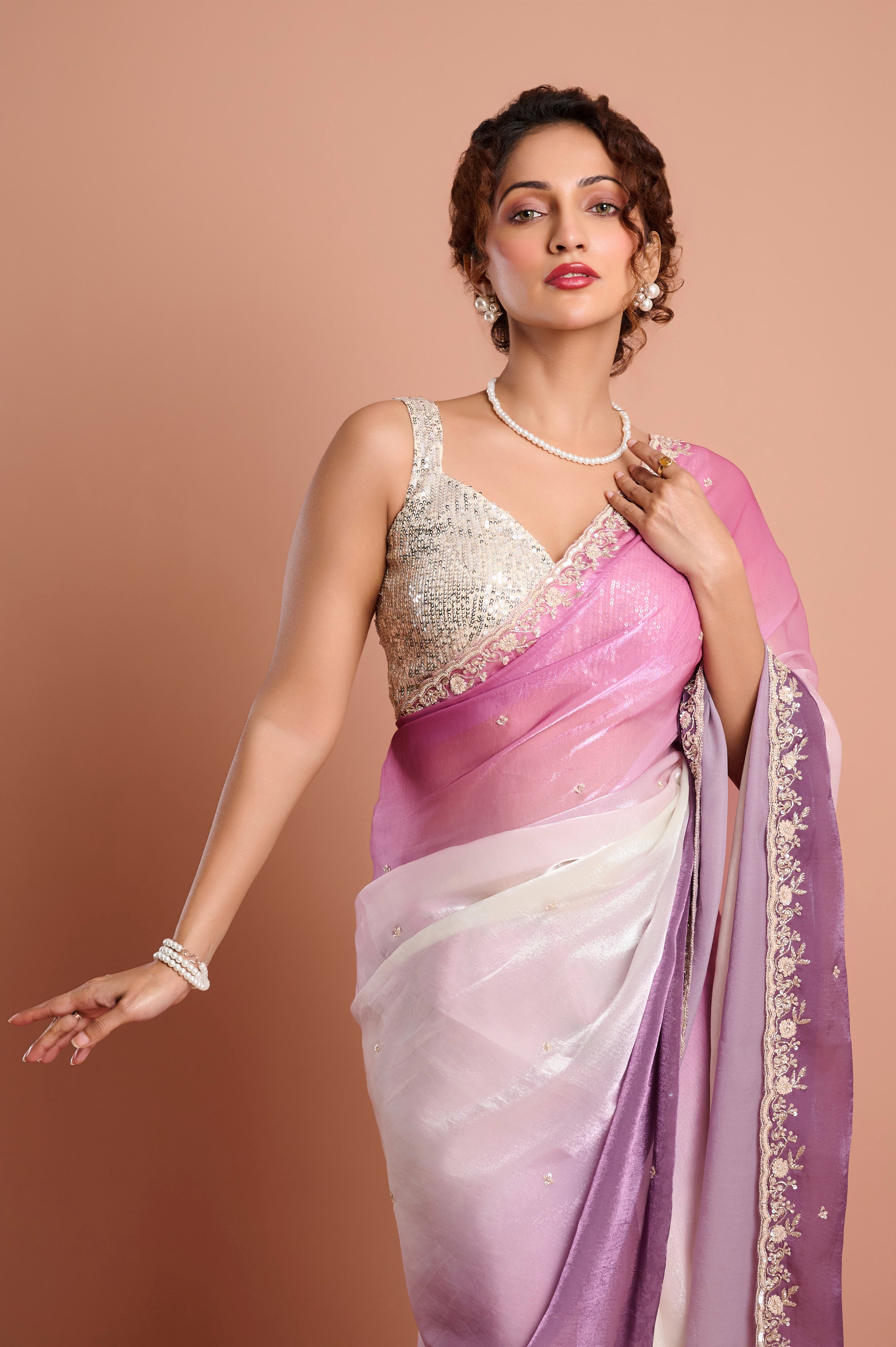 Shine at every occasion with this shimmer satin saree in an exquisite ombre of lilac, blush, and iris violet. The saree is crafted in luminous satin with a subtle shimmer finish, giving a fluid drape and an eye-catching sheen that plays beautifully with light. The fine floral border, adorned with sequin and thread embroidery, enhances its feminine style and festive elegance. Lightweight and effortless, this saree is ideal for cocktail parties, wedding receptions, or evening galas. A matching unstitched blouse piece is included for your personal styling.