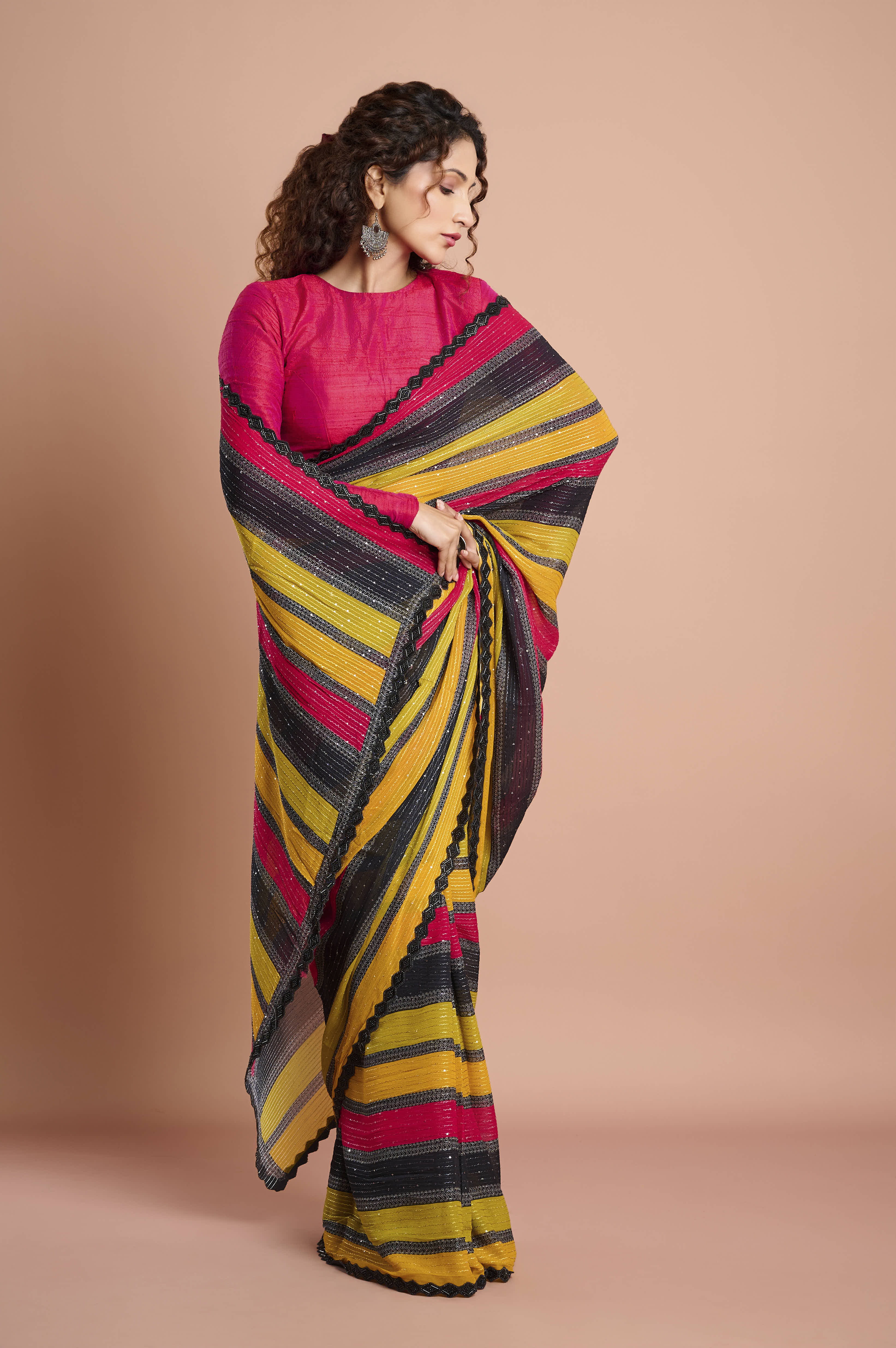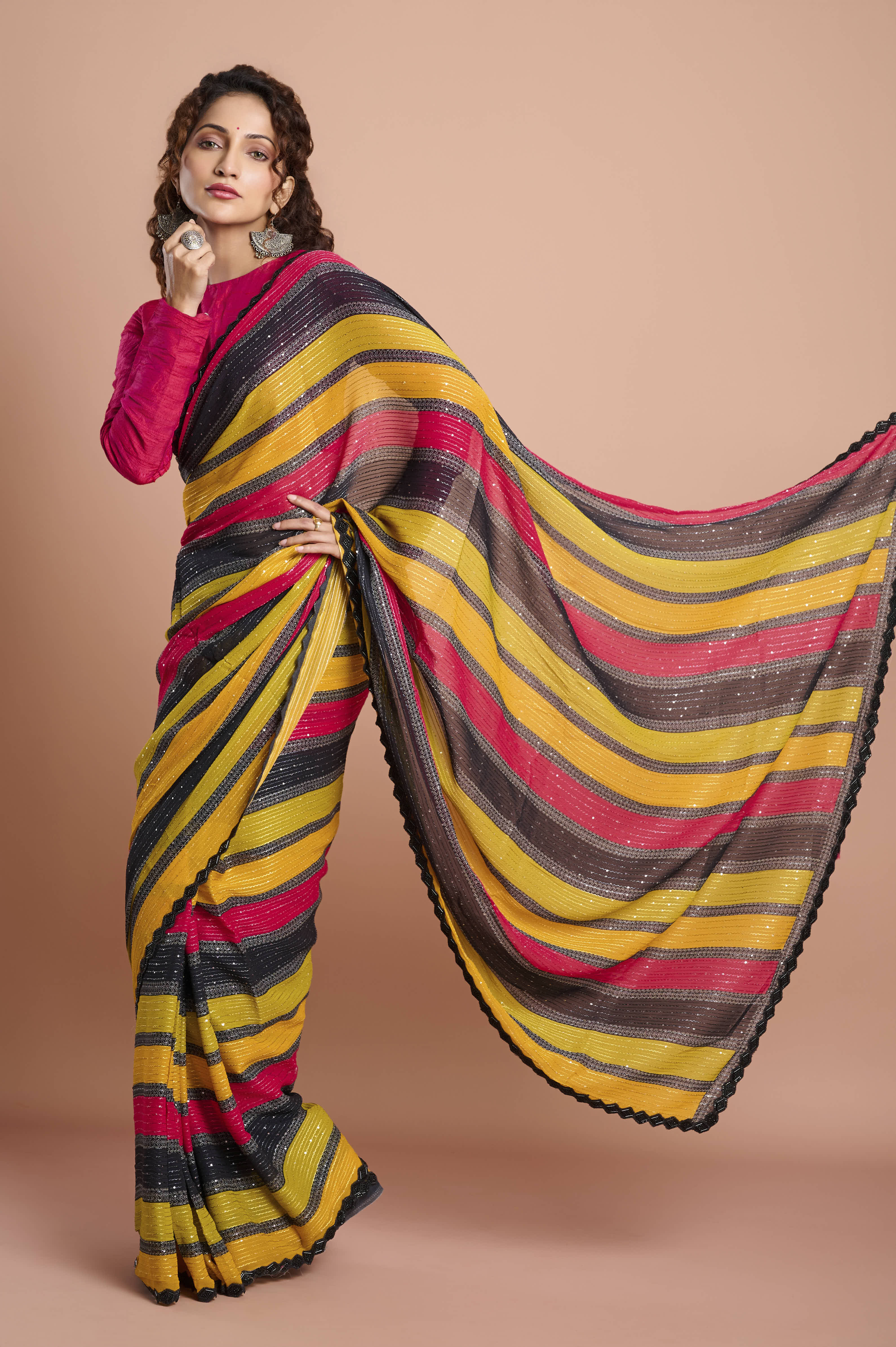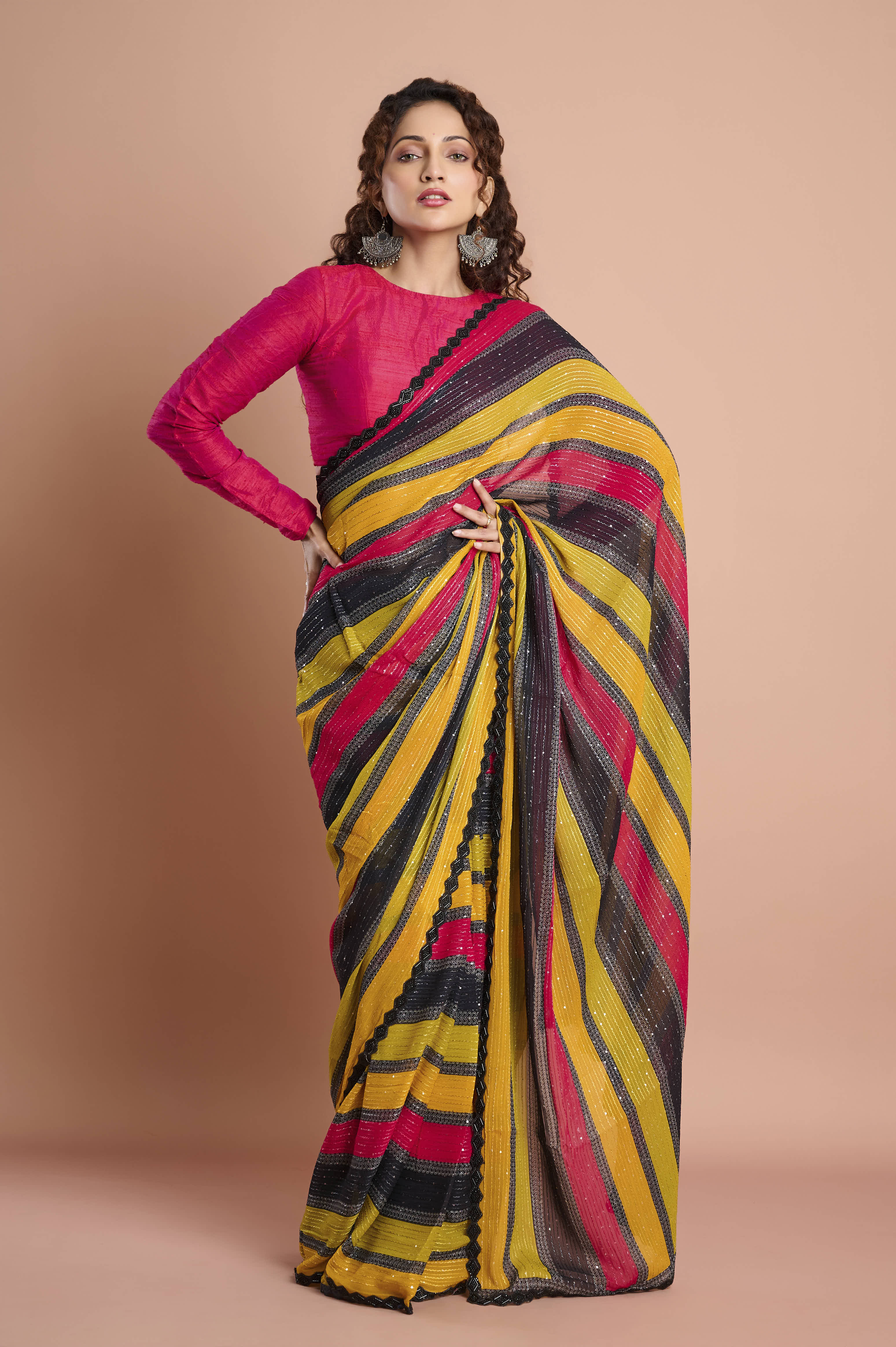 A light, fluid georgette saree with bold diagonal stripes in mustard, rani pink and charcoal. Delicate lurex-style sparkle lines add a gentle sheen, while a refined scallop lace border with contrast piping frames the drape. Crisp pleats, effortless movement, ideal for mehendi, sangeet and festive evenings.