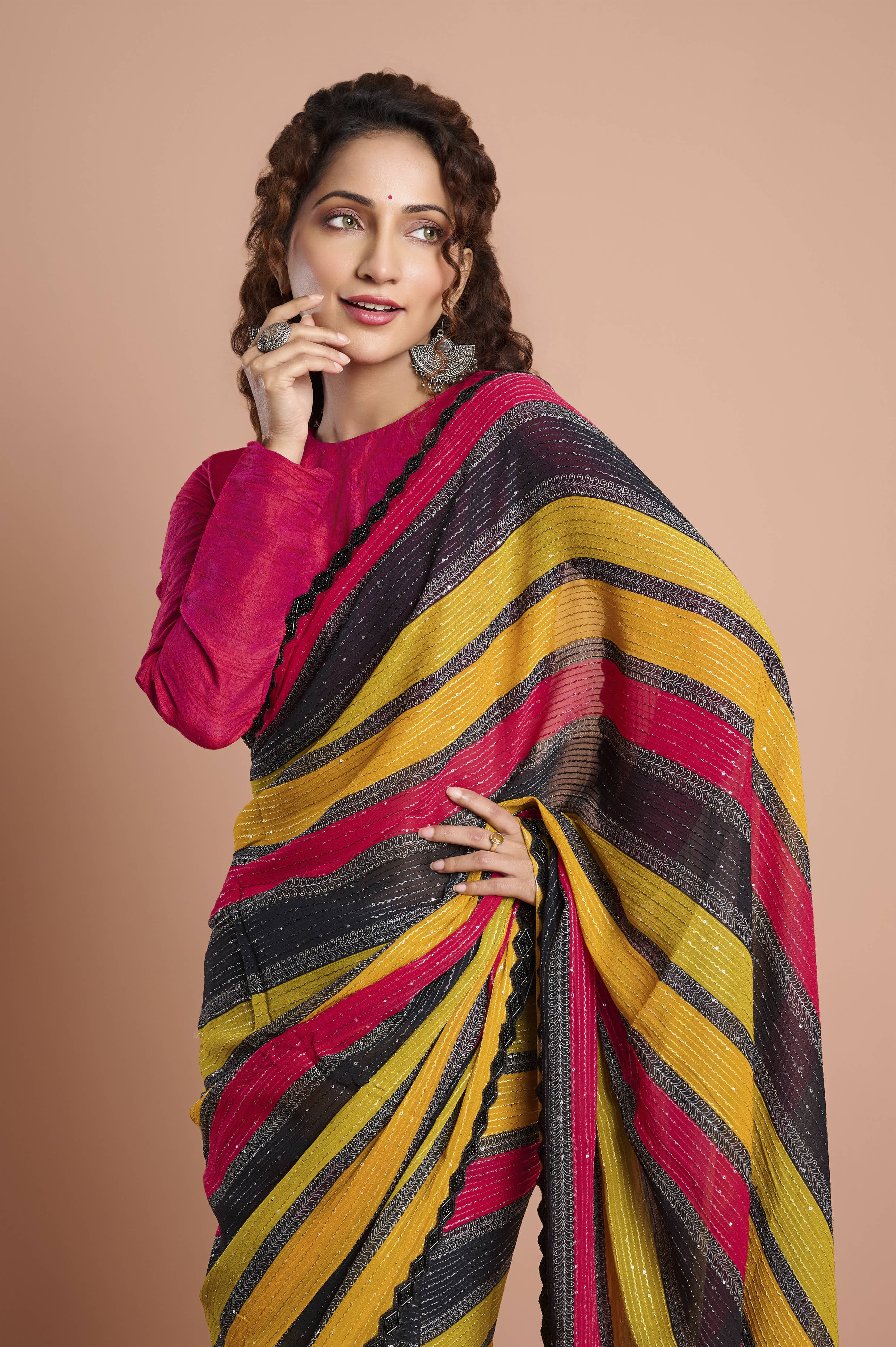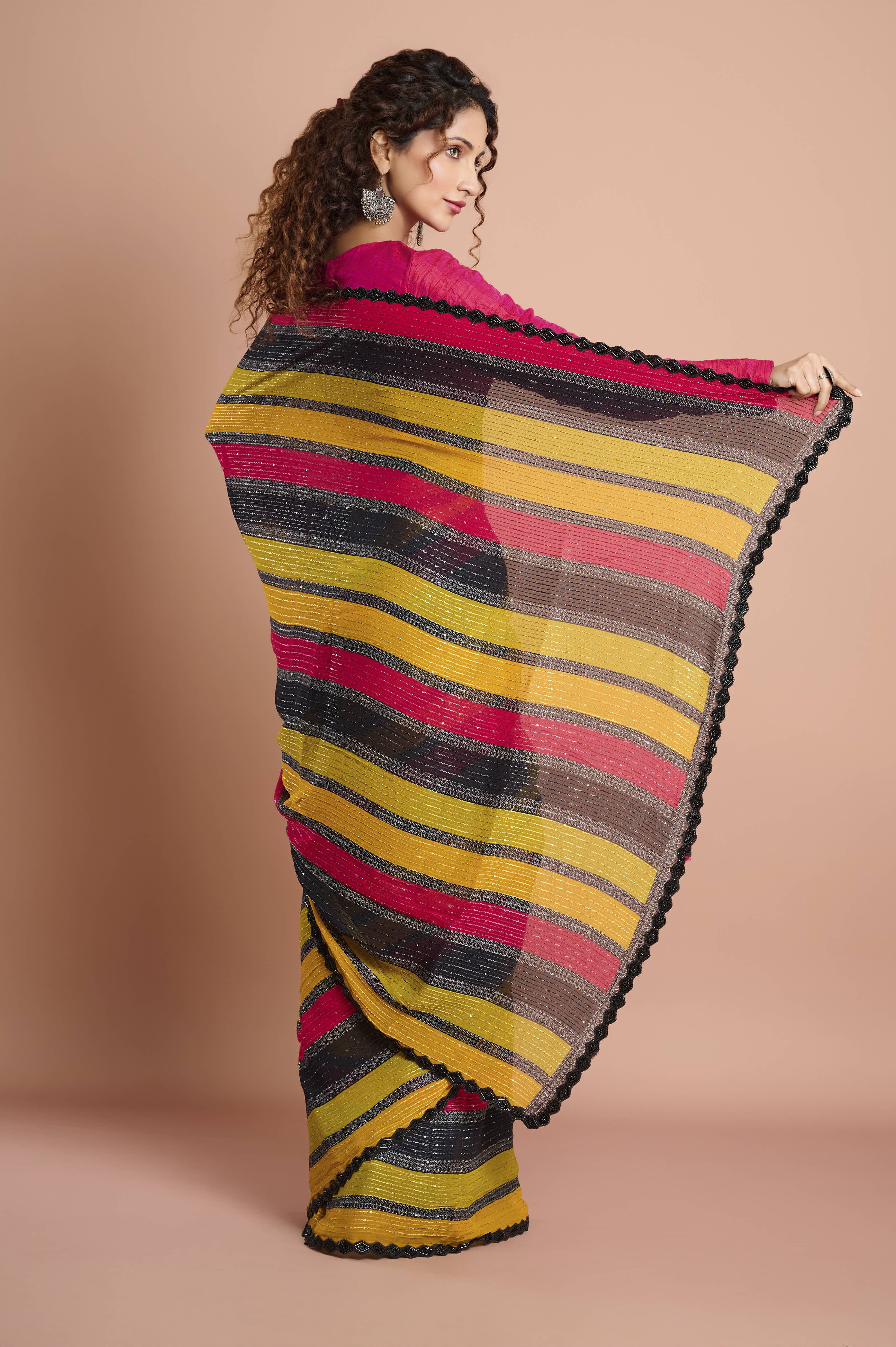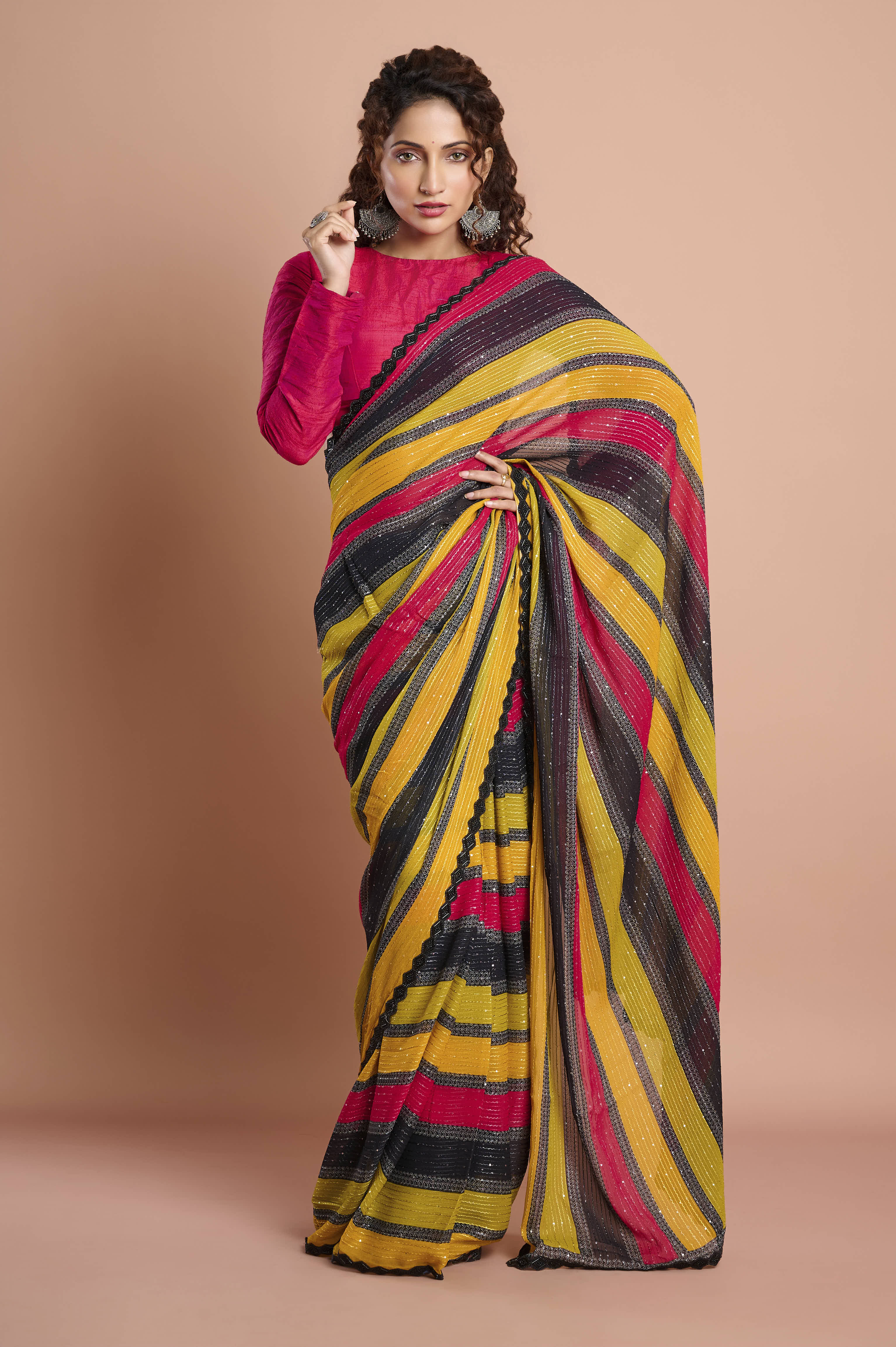 A light, fluid georgette saree with bold diagonal stripes in mustard, rani pink and charcoal. Delicate lurex-style sparkle lines add a gentle sheen, while a refined scallop lace border with contrast piping frames the drape. Crisp pleats, effortless movement, ideal for mehendi, sangeet and festive evenings.