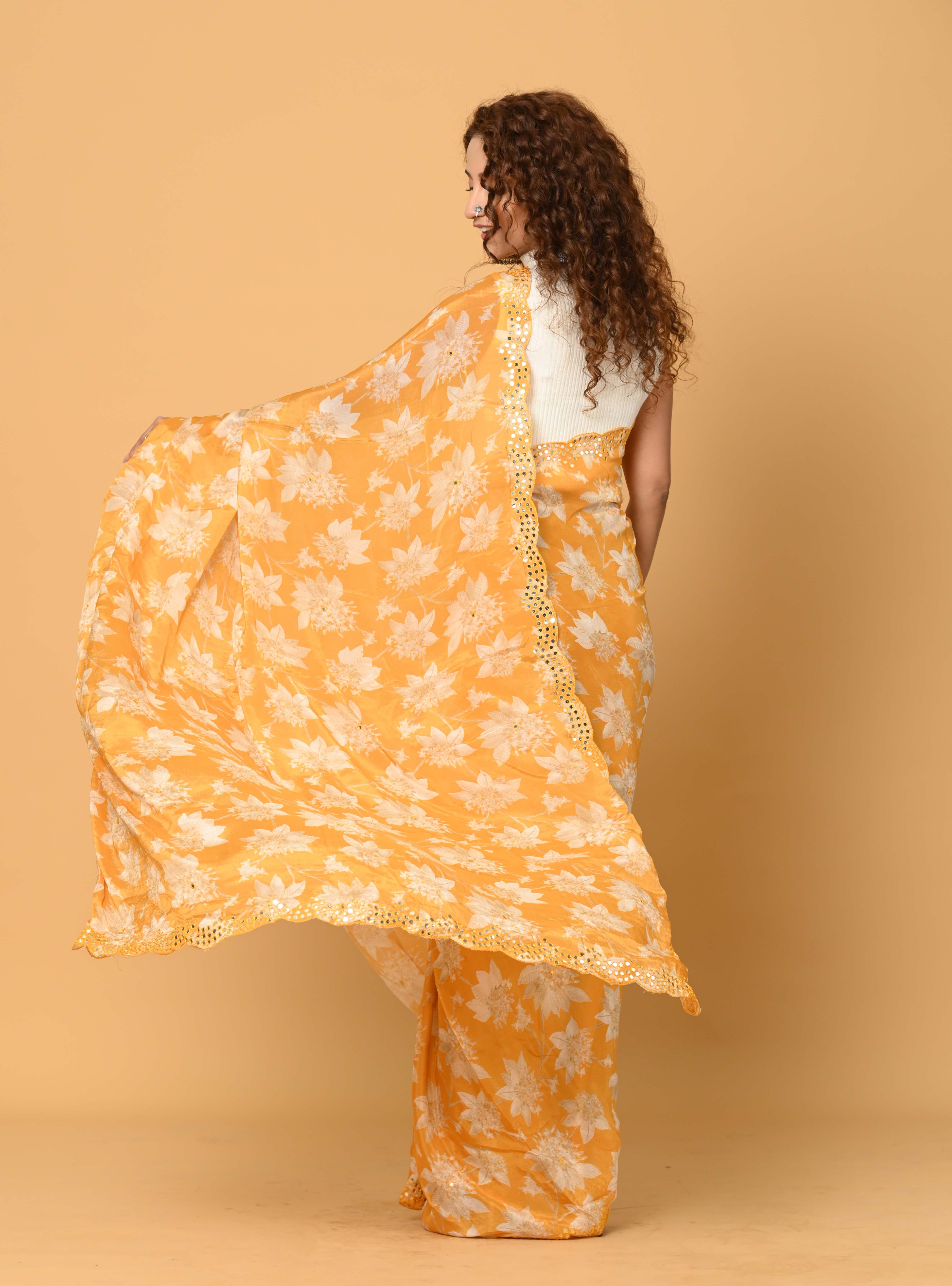 A Chinon printed saree is a stylish and contemporary Indian outfit that features a saree made from Chinon fabric adorned with printed designs"