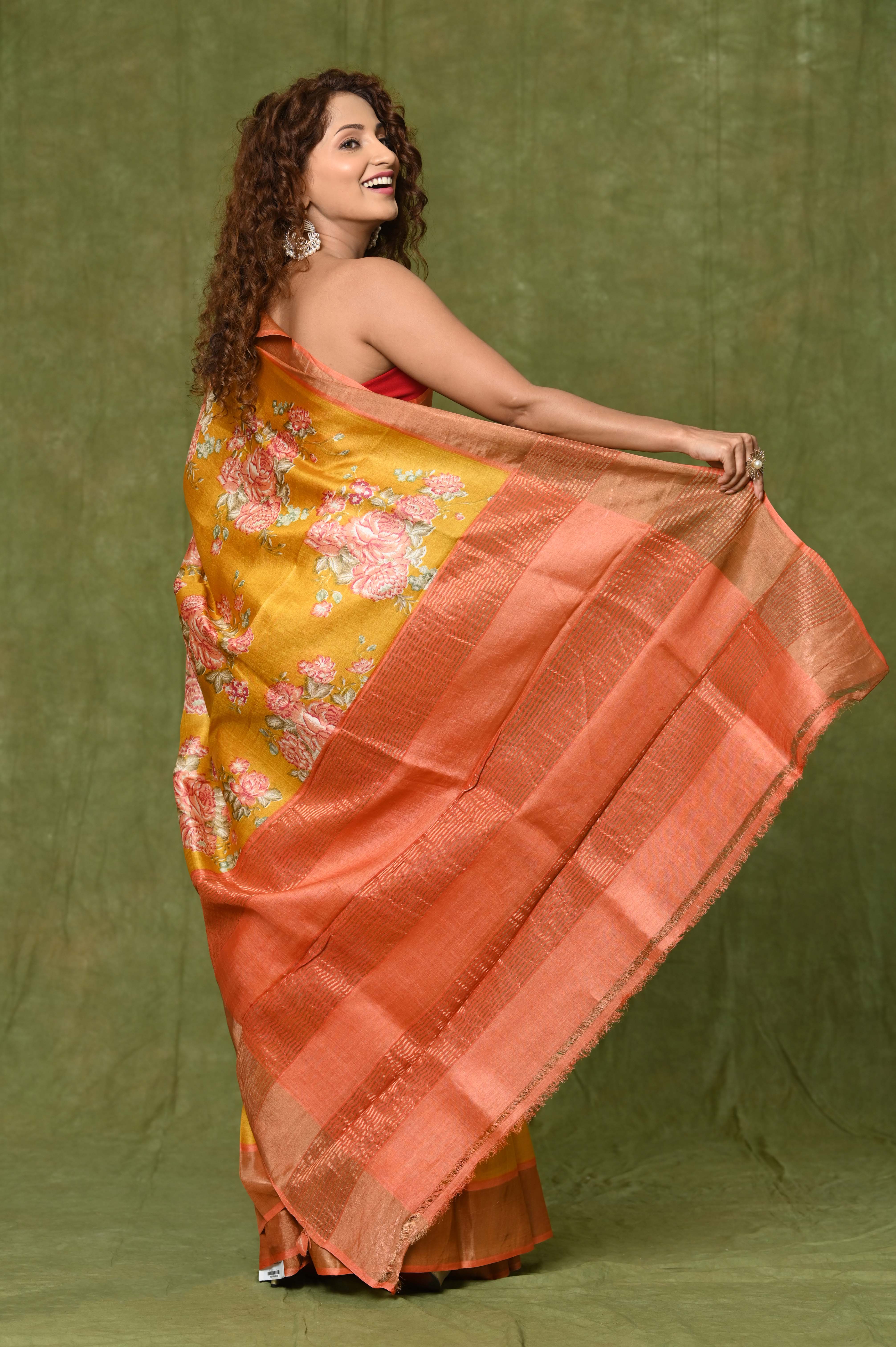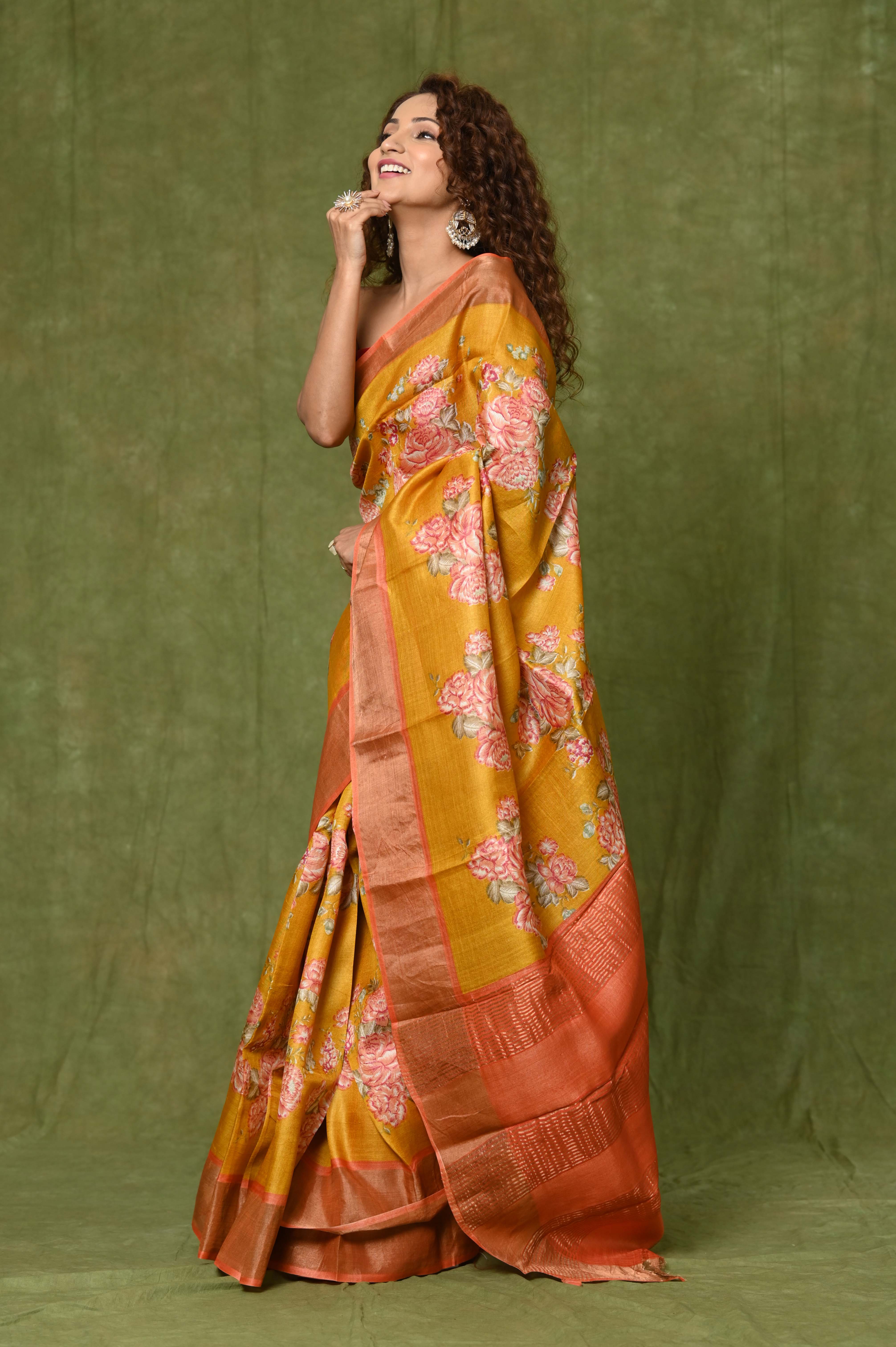 A pure Tussar printed saree is a beautiful and elegant traditional Indian outfit. Tussar silk, also known as "Tasar" silk, is a fine and textured silk fabric produced from the cocoons of the Tasar silkworm. These sarees are known for their natural sheen, texture, and luxurious feel. When combined with prints, they create a stunning visual appeal.
