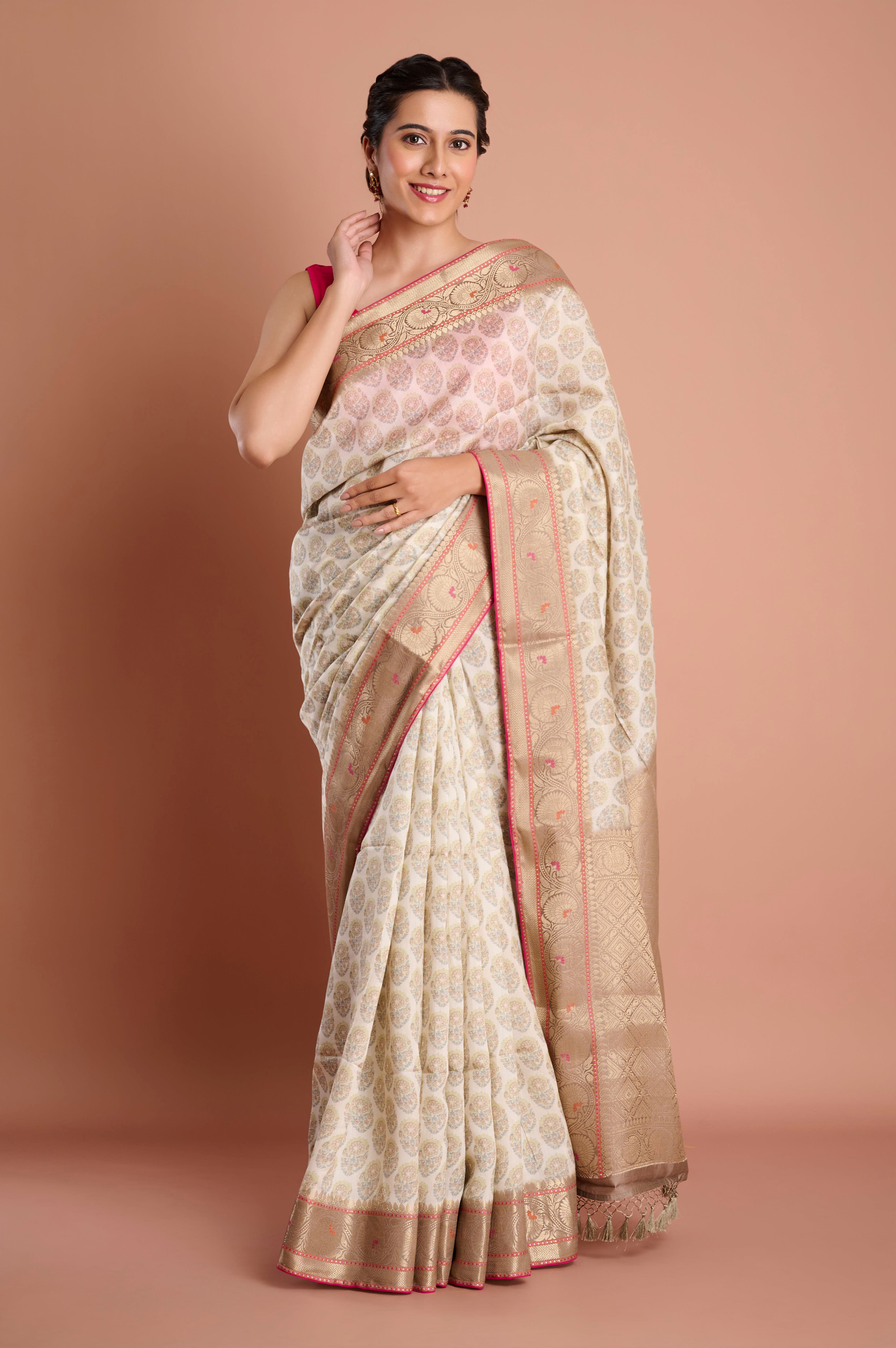 This elegant pure Chanderi saree displays all-over digital-printed motifs in subtle gold and taupe with a touch of pink accent, offering a harmonious blend of tradition and modern artistry. The fabric is lightweight, airy, and naturally glossy, ensuring a beautiful drape and luxurious comfort. The intricate digitally printed designs evoke timeless sophistication, while the broad zari border adds a festive touch. Includes a matching blouse piece for versatile styling.