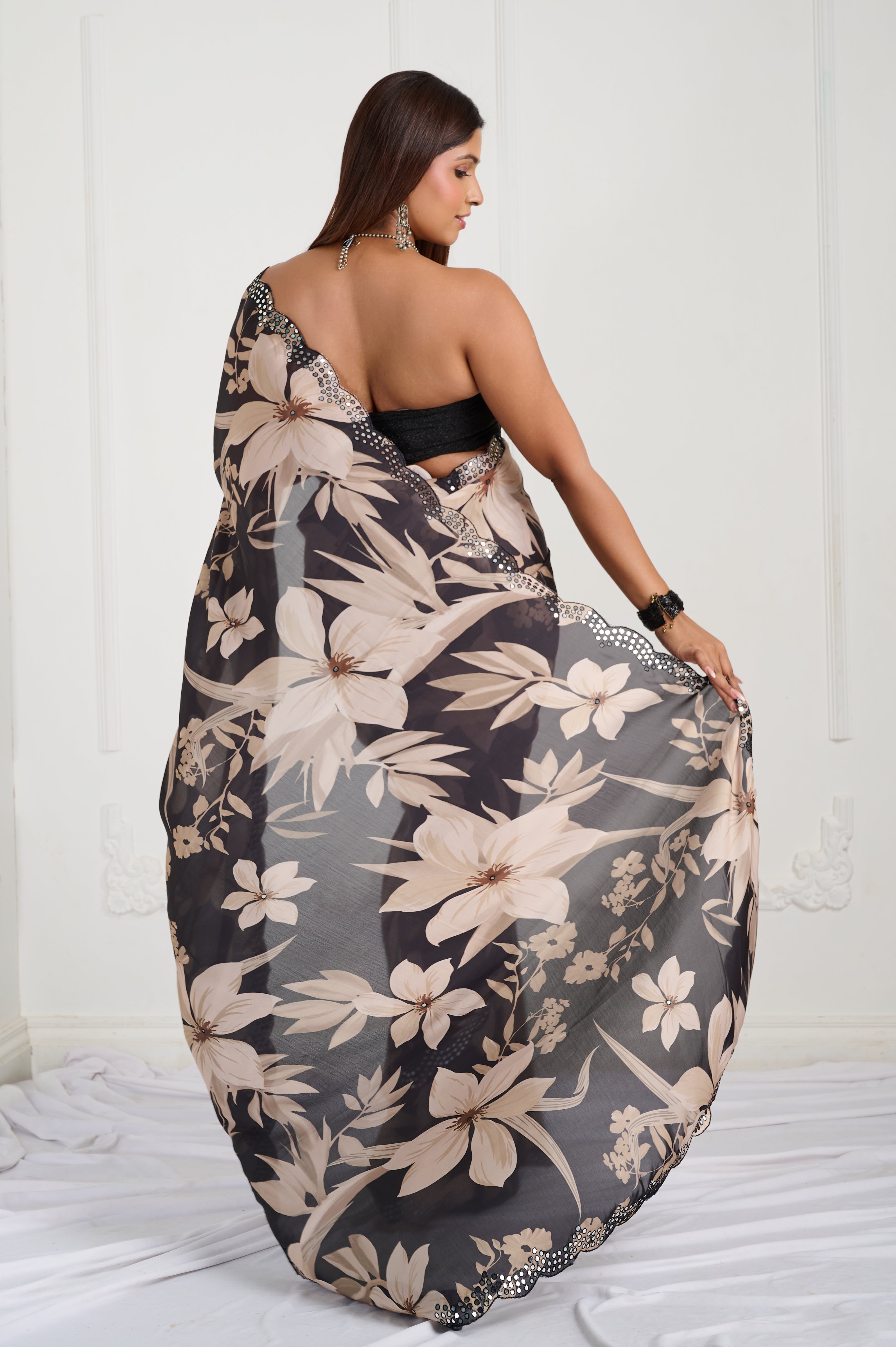 A sleek satin saree in deep black with a chic taupe/stone floral digital print. Finished with a modern black scallop border detailed with mirror-work and subtle tonal hand highlights for a refined sparkle. Smooth sheen, fluid fall and crisp pleats, perfect for cocktail nights and receptions.