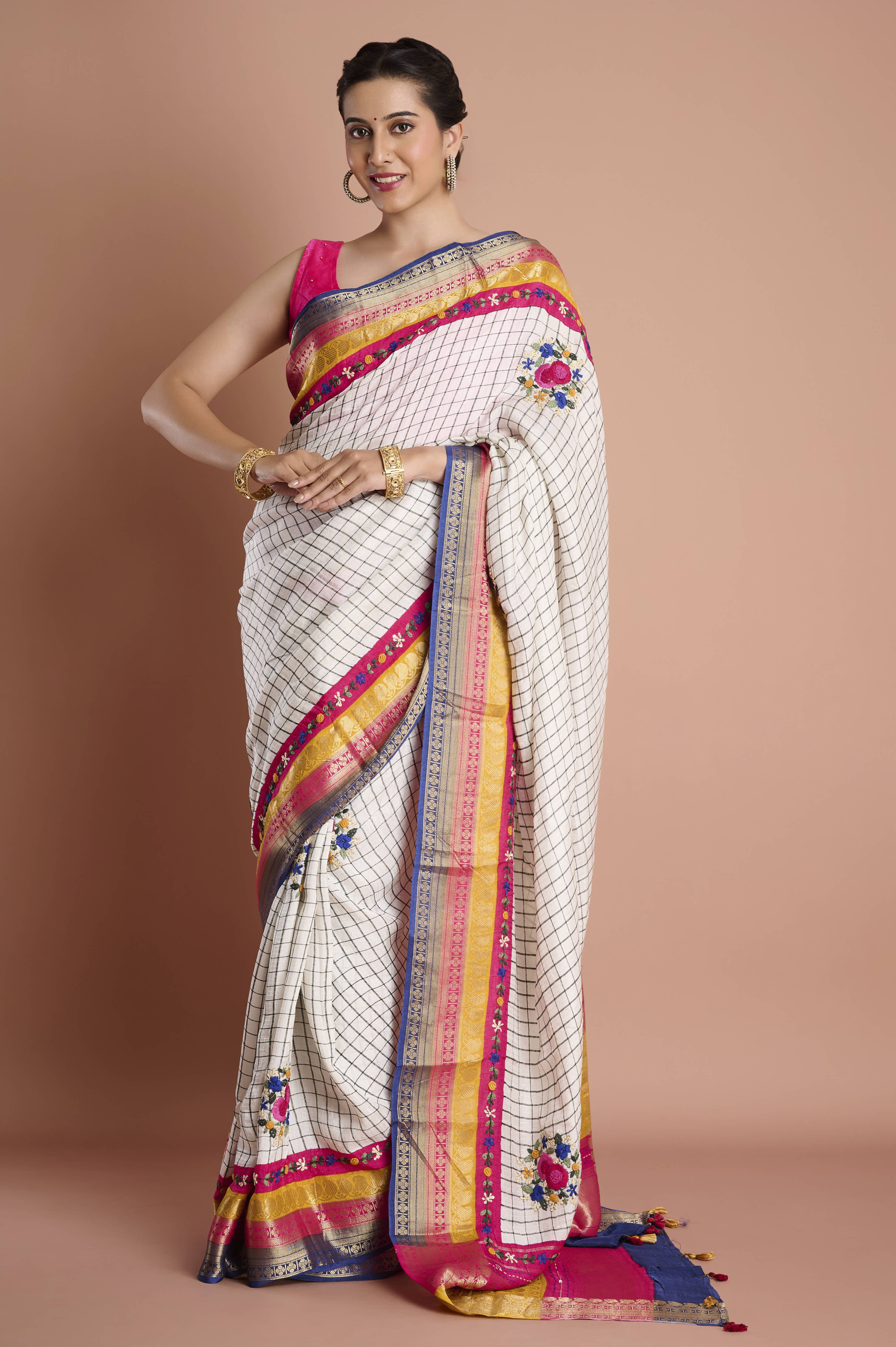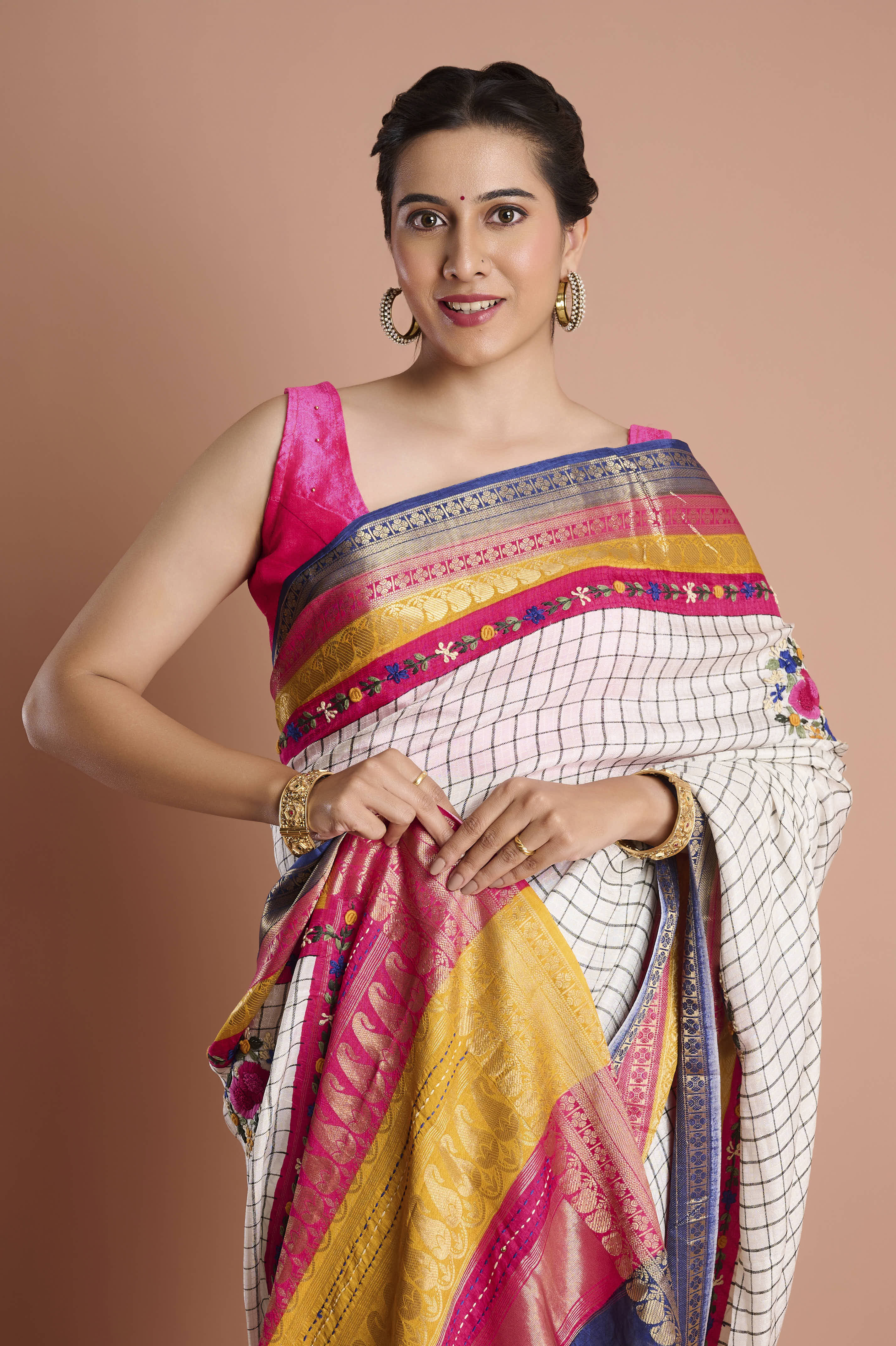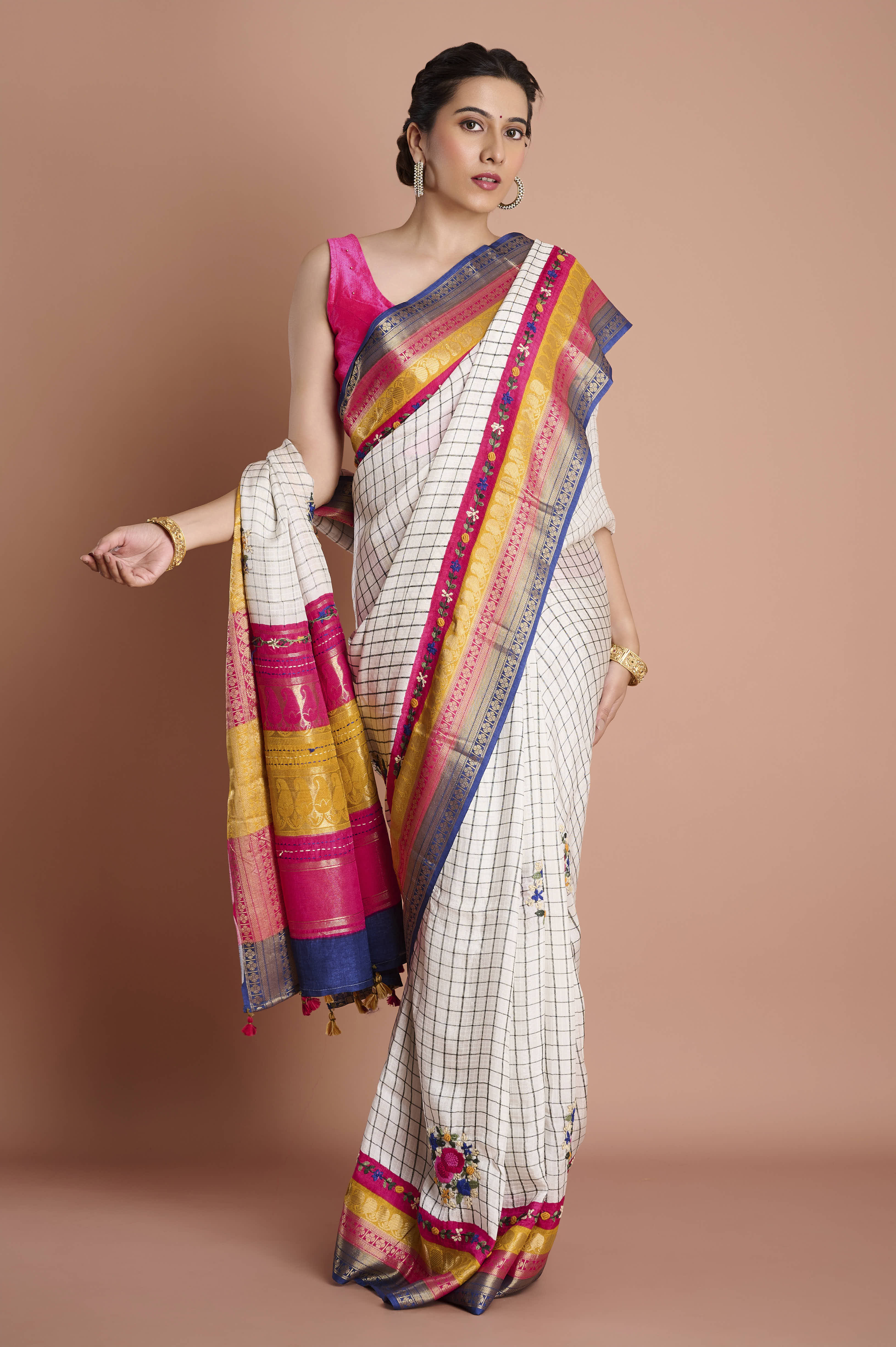 This saree is crafted from luxurious Moonga silk, featuring a crisp white body detailed with contemporary black grid checks for a striking, graphic look. The border stands out with multi-striped detailing in vibrant magenta, mustard, and navy, adorned with zari weaving and delicate floral embroidery for a festive touch. Lightweight yet rich in texture, Moonga silk is comfortable, breathable, and ideal for both celebrations and formal occasions. Each saree comes with an unstitched blouse piece for custom styling.