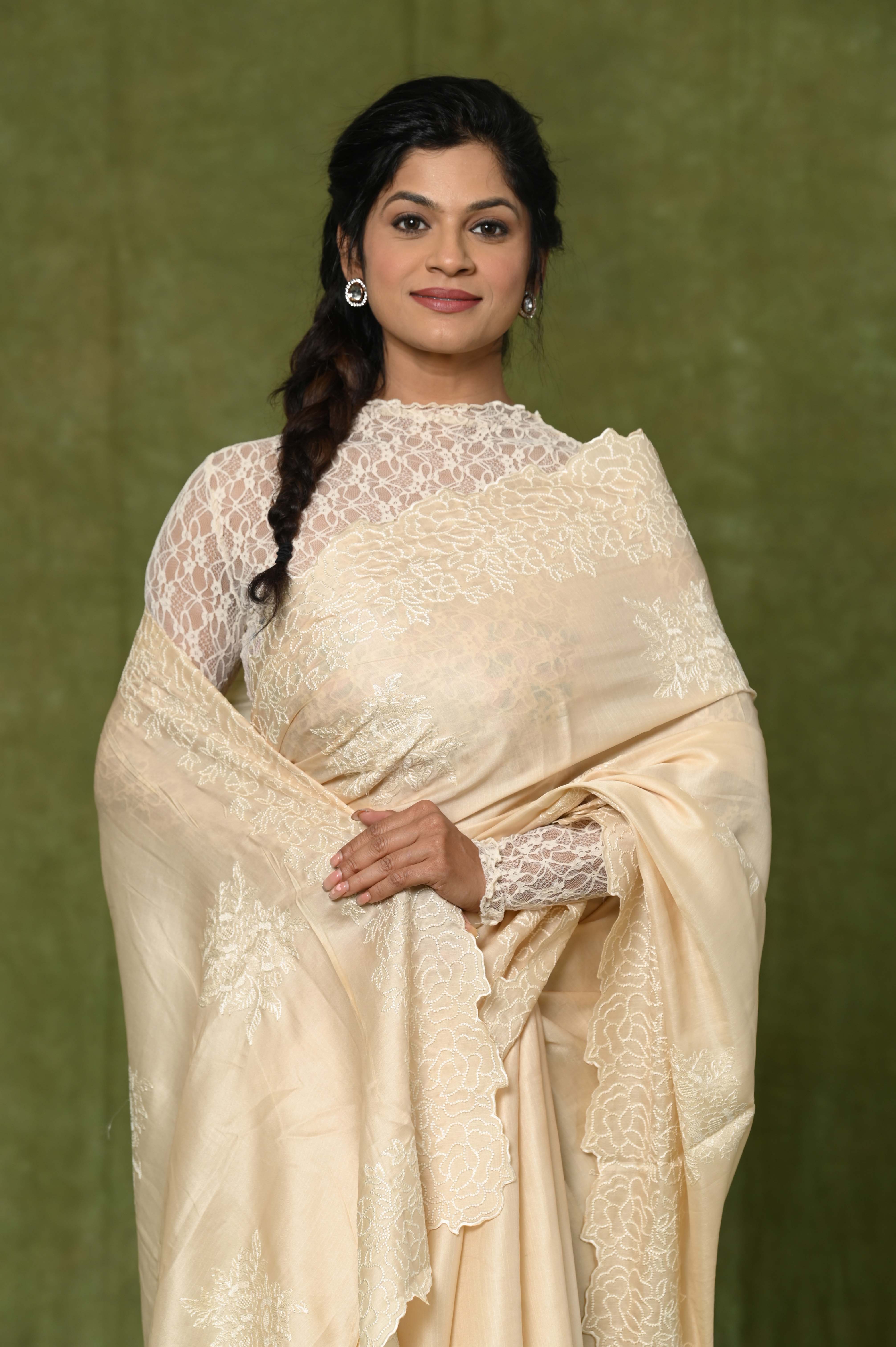 A semi Tussar cutwork saree is an elegant and sophisticated choice for traditional Indian attire. Tussar silk, also known as "Kosa silk," is a fine and textured silk fabric produced from the cocoons of the Tasar silkworm. Semi Tussar silk is a slightly less refined version of Tussar silk, offering a more affordable option while retaining some of the charm and sheen. Cutwork embroidery involves intricate patterns and designs created by cutting sections of fabric and embellishing them