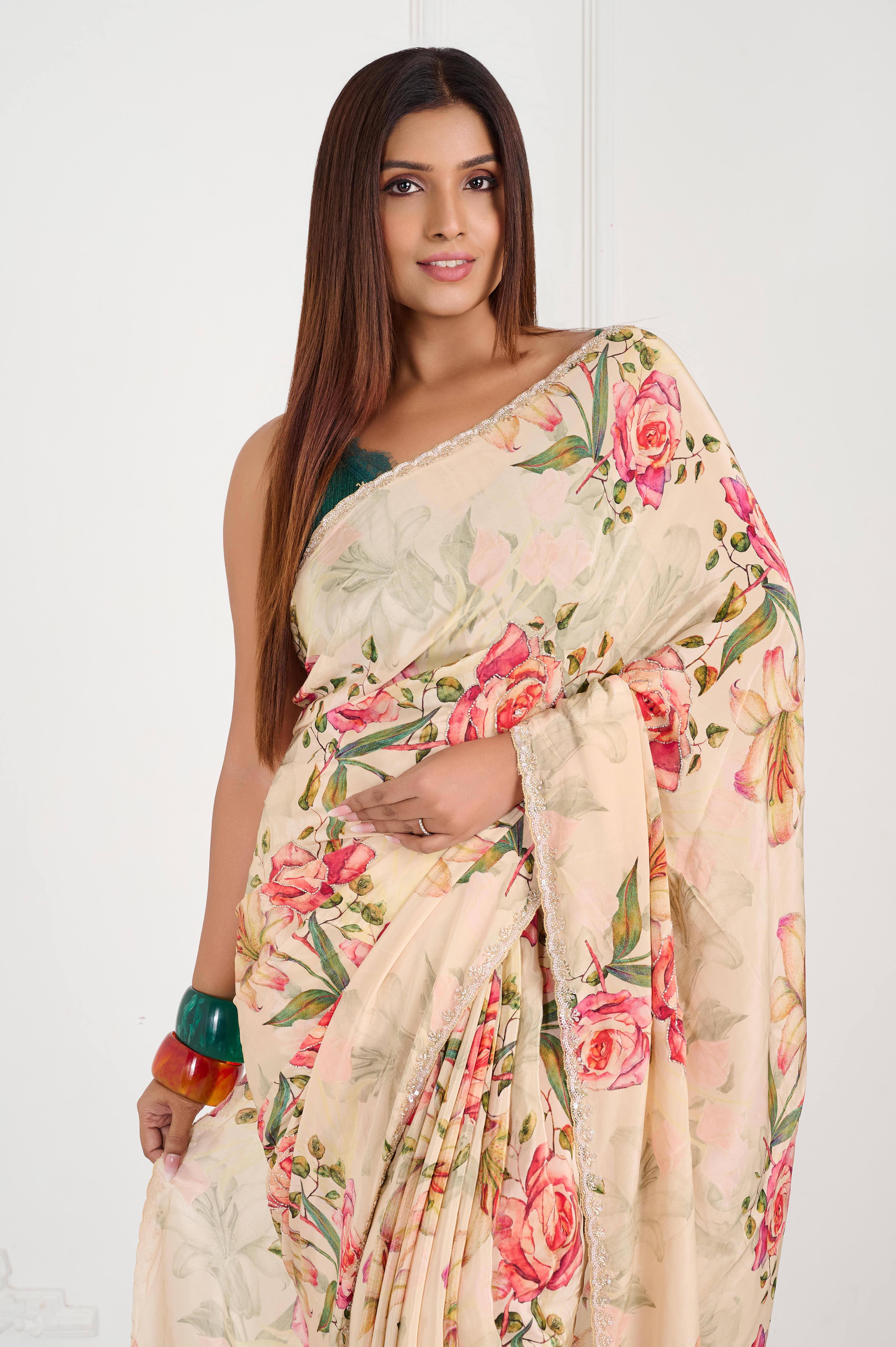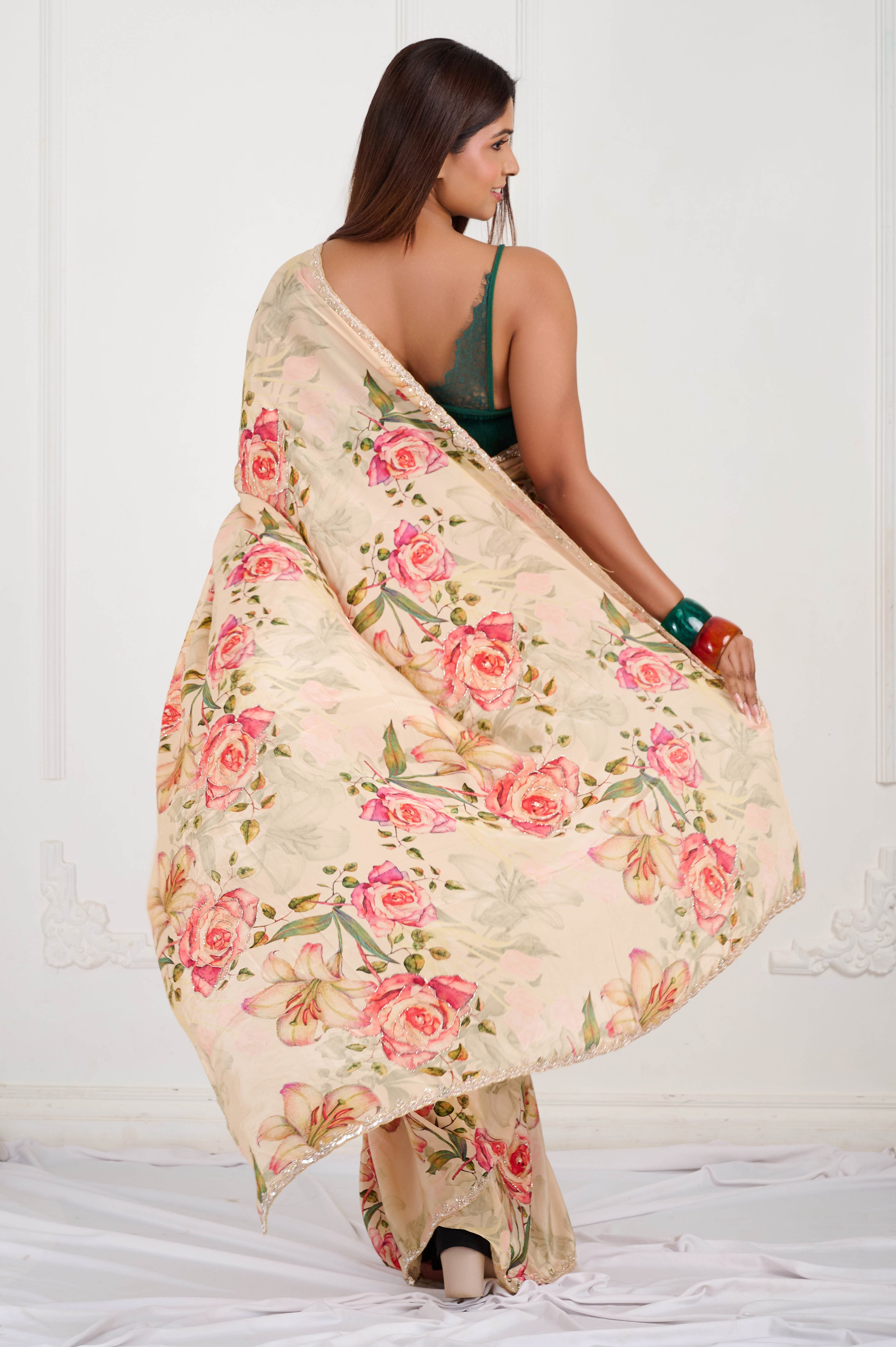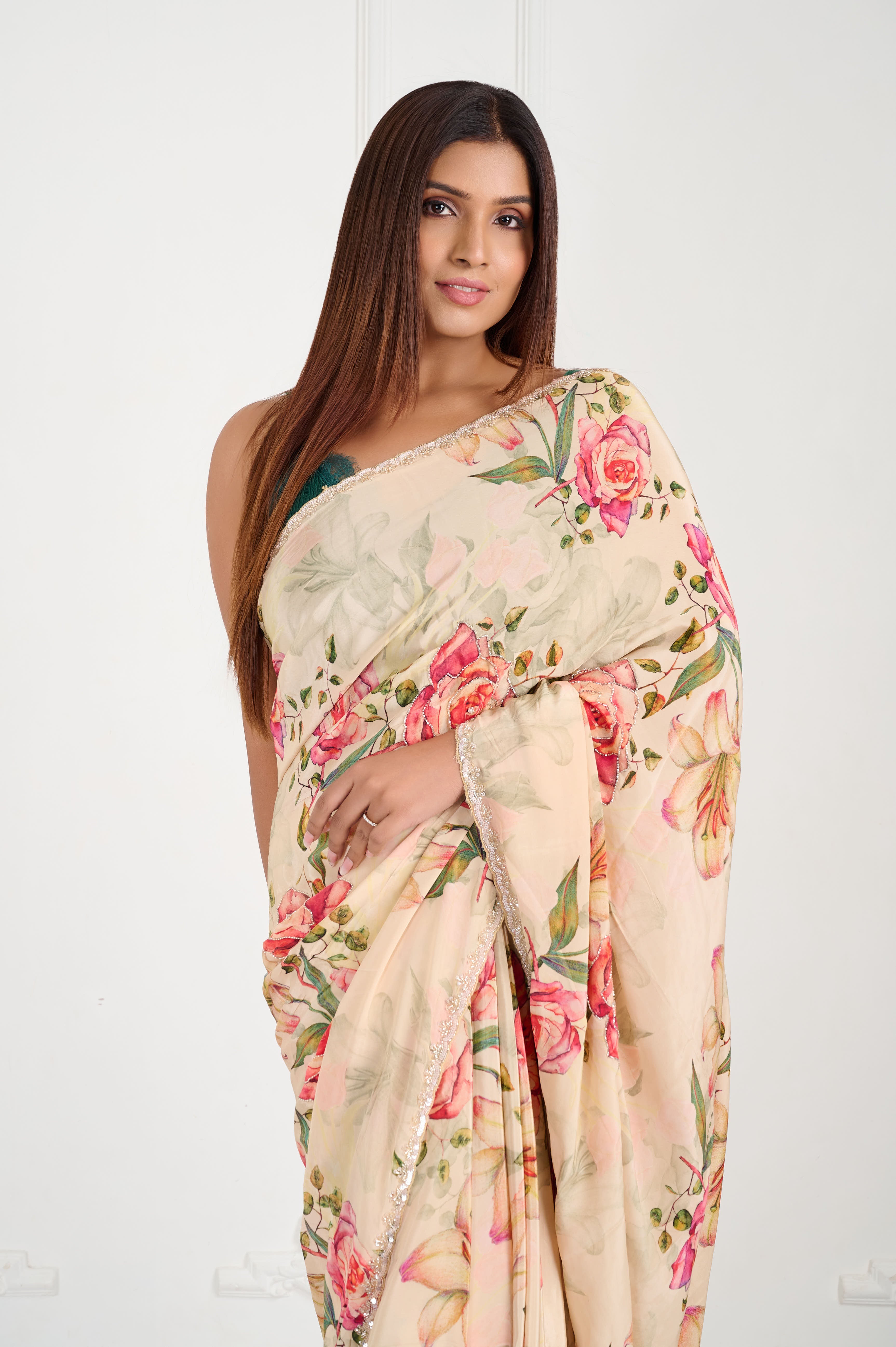 A graceful crepe saree in warm almond-beige with an all-over vintage rose digital print and soft leafy tones. Finished with a champagne scallop lace border and subtle hand highlights (tiny sequins/seed beads). Light-medium weight with a fluid fall and crisp pleats, ideal for day weddings and sundowners.