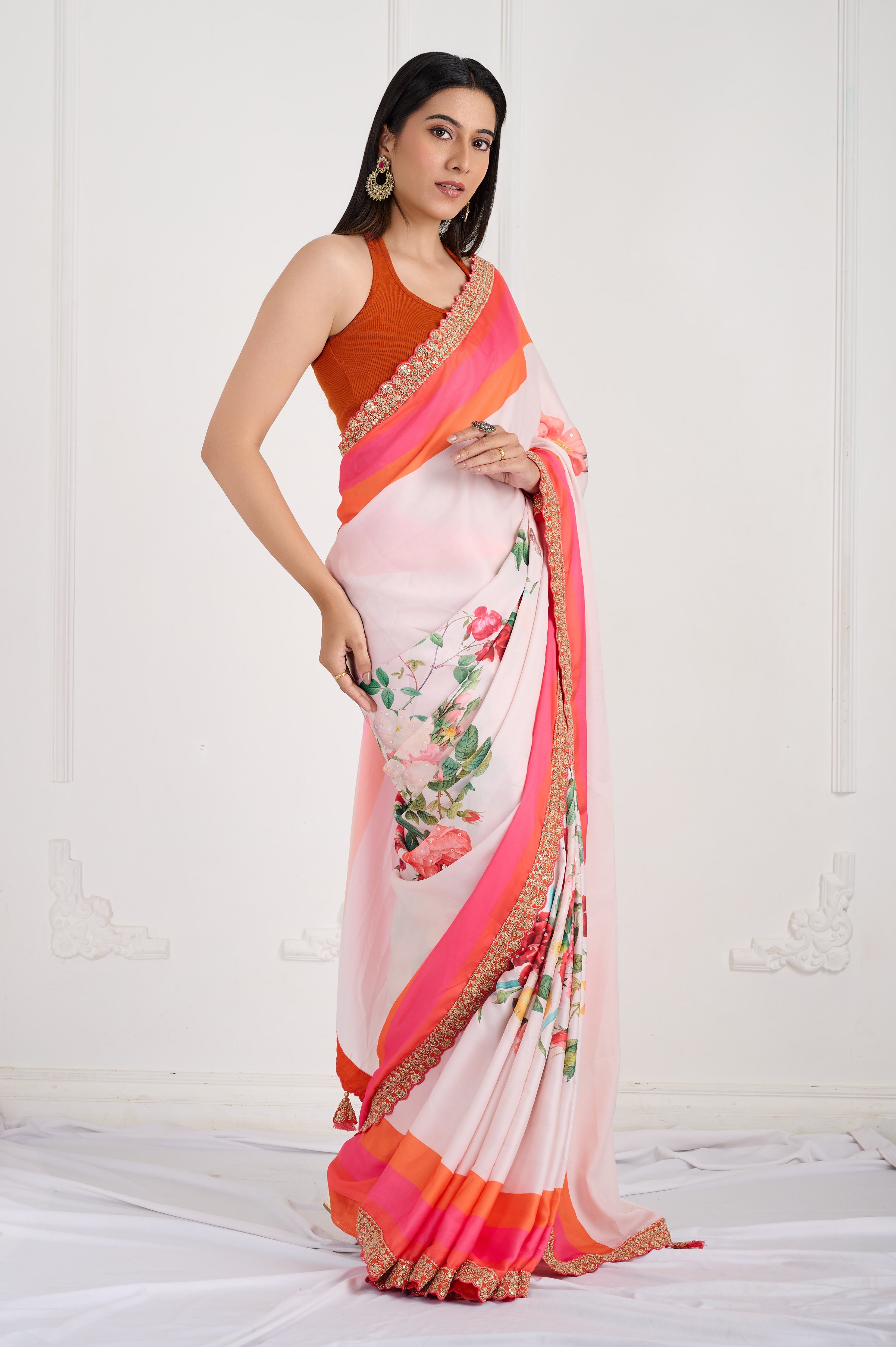 A luminous satin saree in a soft blush base featuring bold rani-pink and coral bands across the pallu and placement botanical florals along the border. Finished with an antique-gold scallop lace and delicate hand highlights with tiny sequins. Elegant without heaviness. Smooth sheen with a fluid fall for crisp pleats and a graceful drape. Perfect for festive days and cocktail evenings.