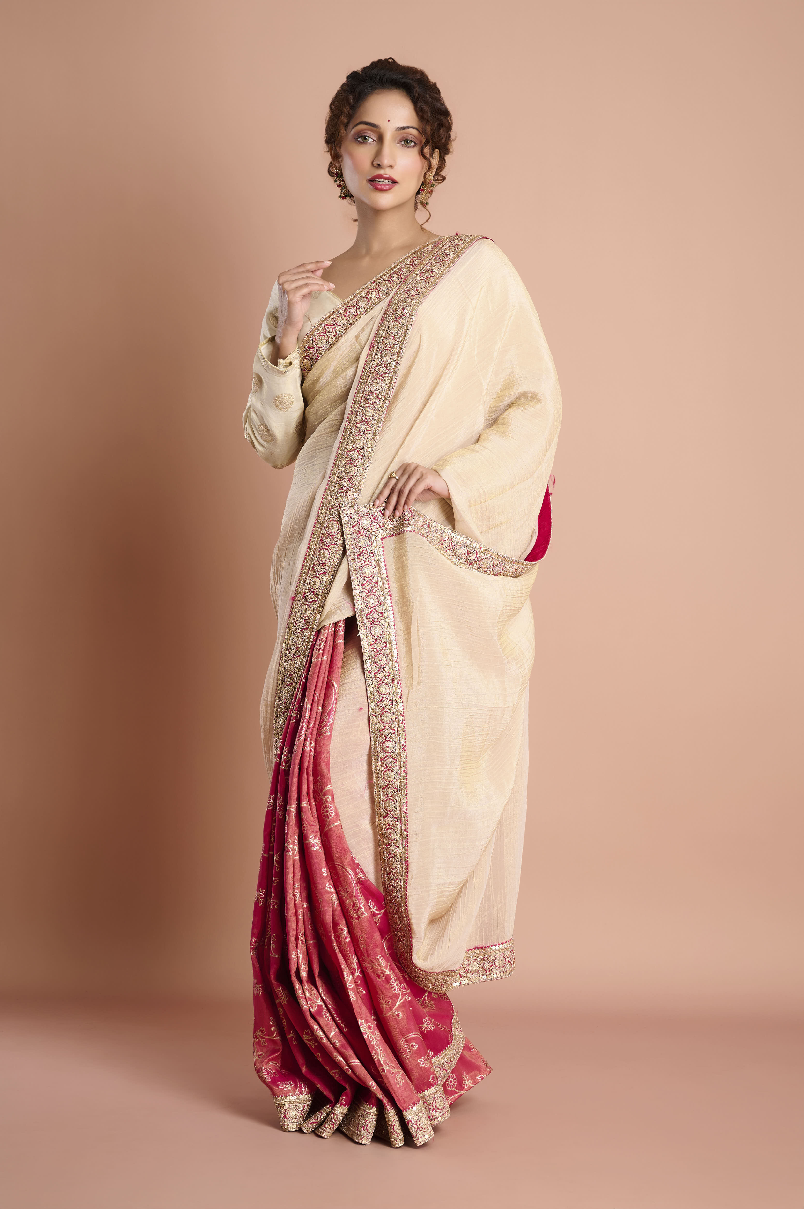 Step into effortless elegance with this half-and-half tissue saree, artfully blending a sheer golden-beige drape with a contrasting deep coral pleated section. The saree features a lavish border embroidered with antique gold thread and blush resham for a royal finish. Tissue's natural shimmer offers a fluid, light texture, while the ornate edge adds festive sophistication, perfect for weddings, special evenings, and celebrations. A complimentary unstitched blouse piece is included for individualized tailoring.
