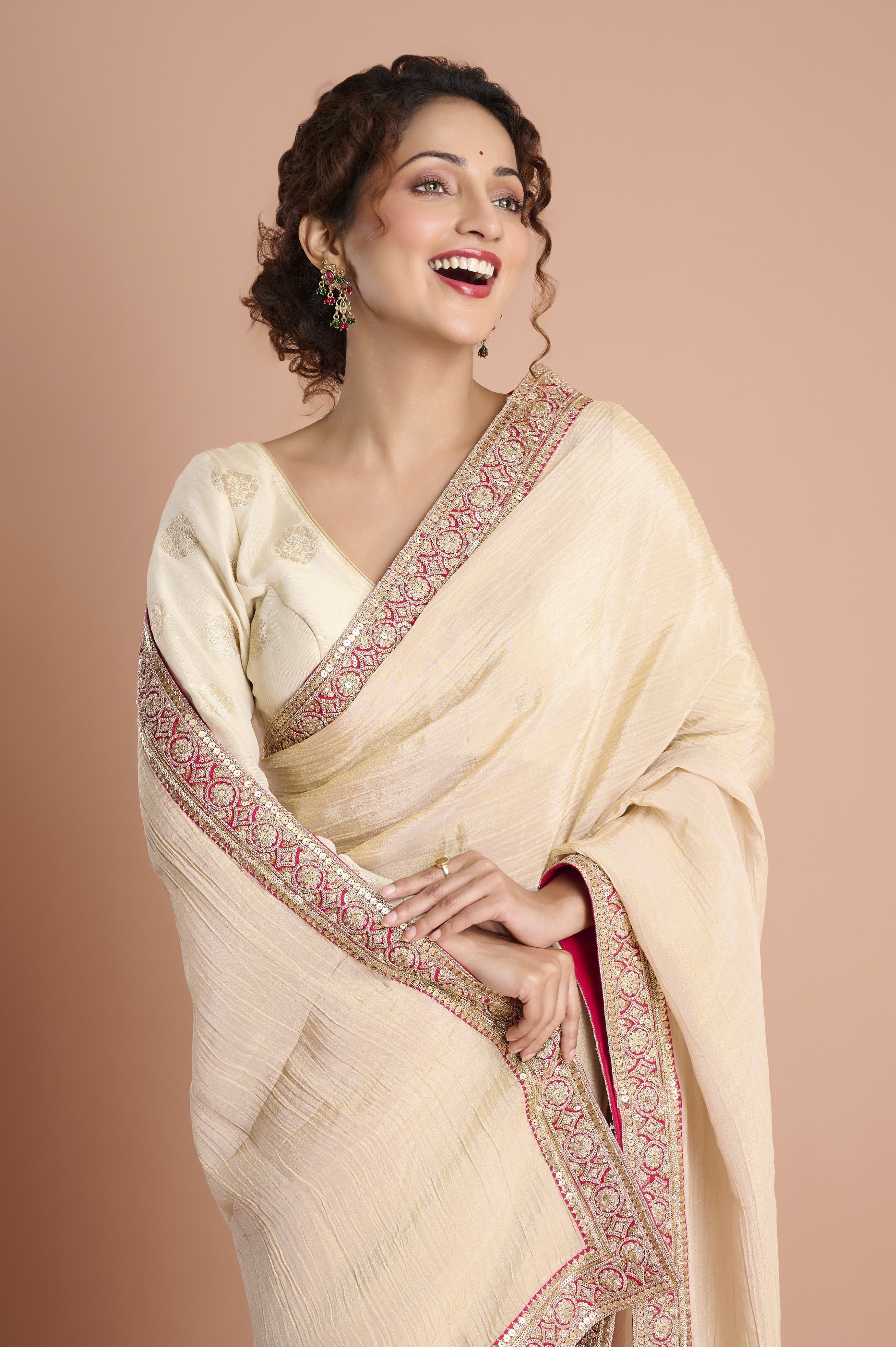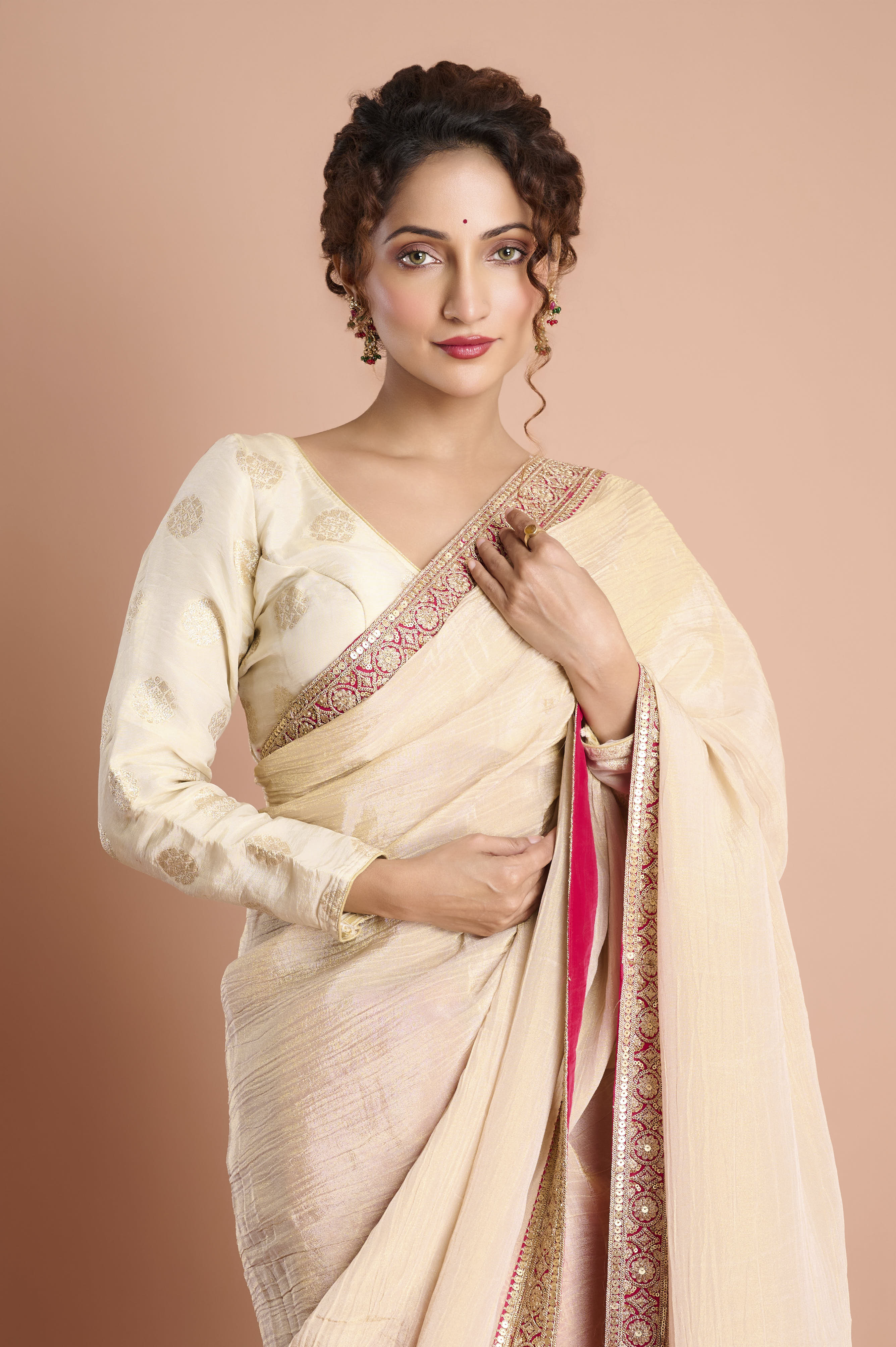 Jewellery: Kundan choker, gold bangles, or blush stone earrings for luxurious finish.