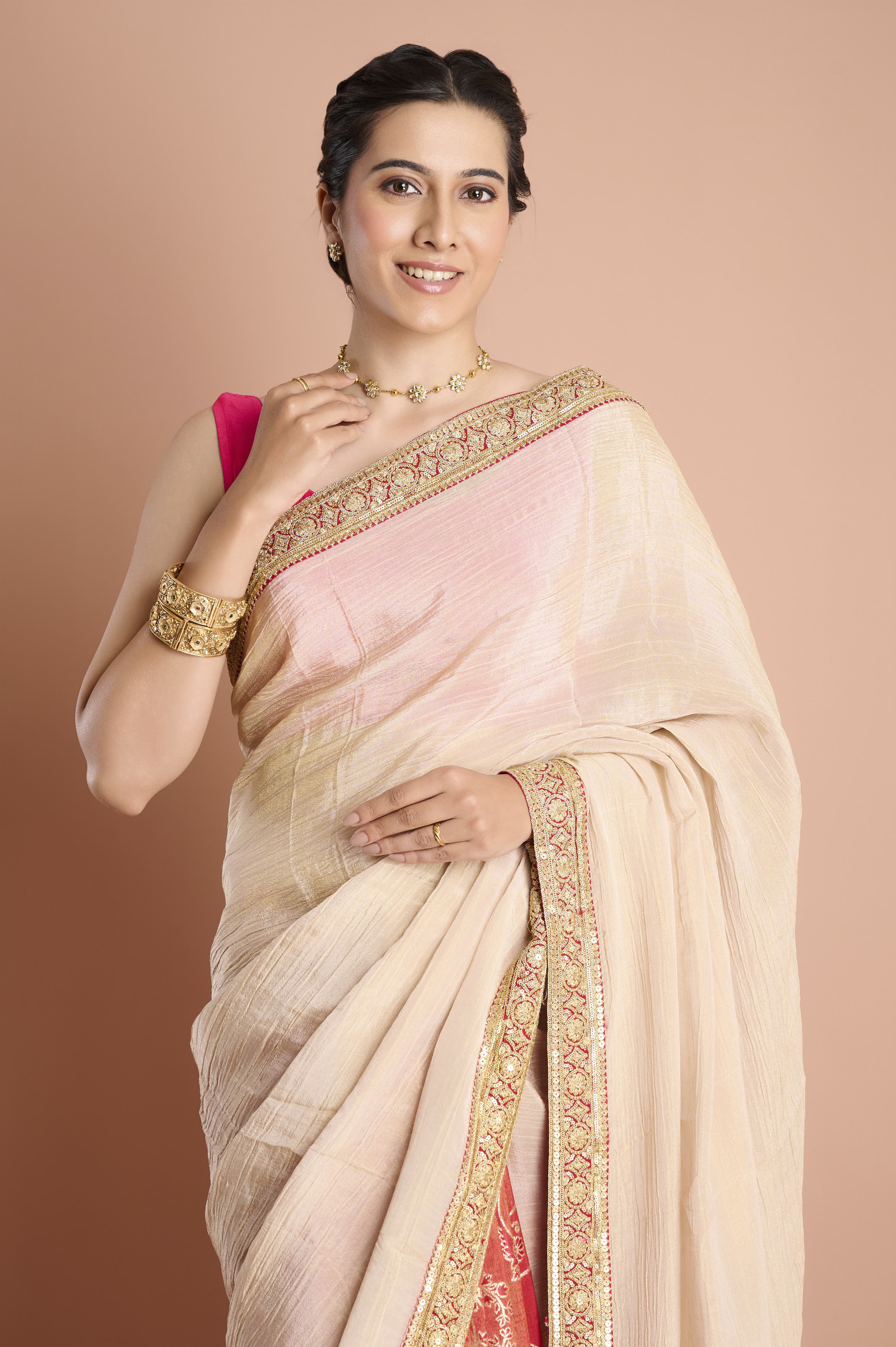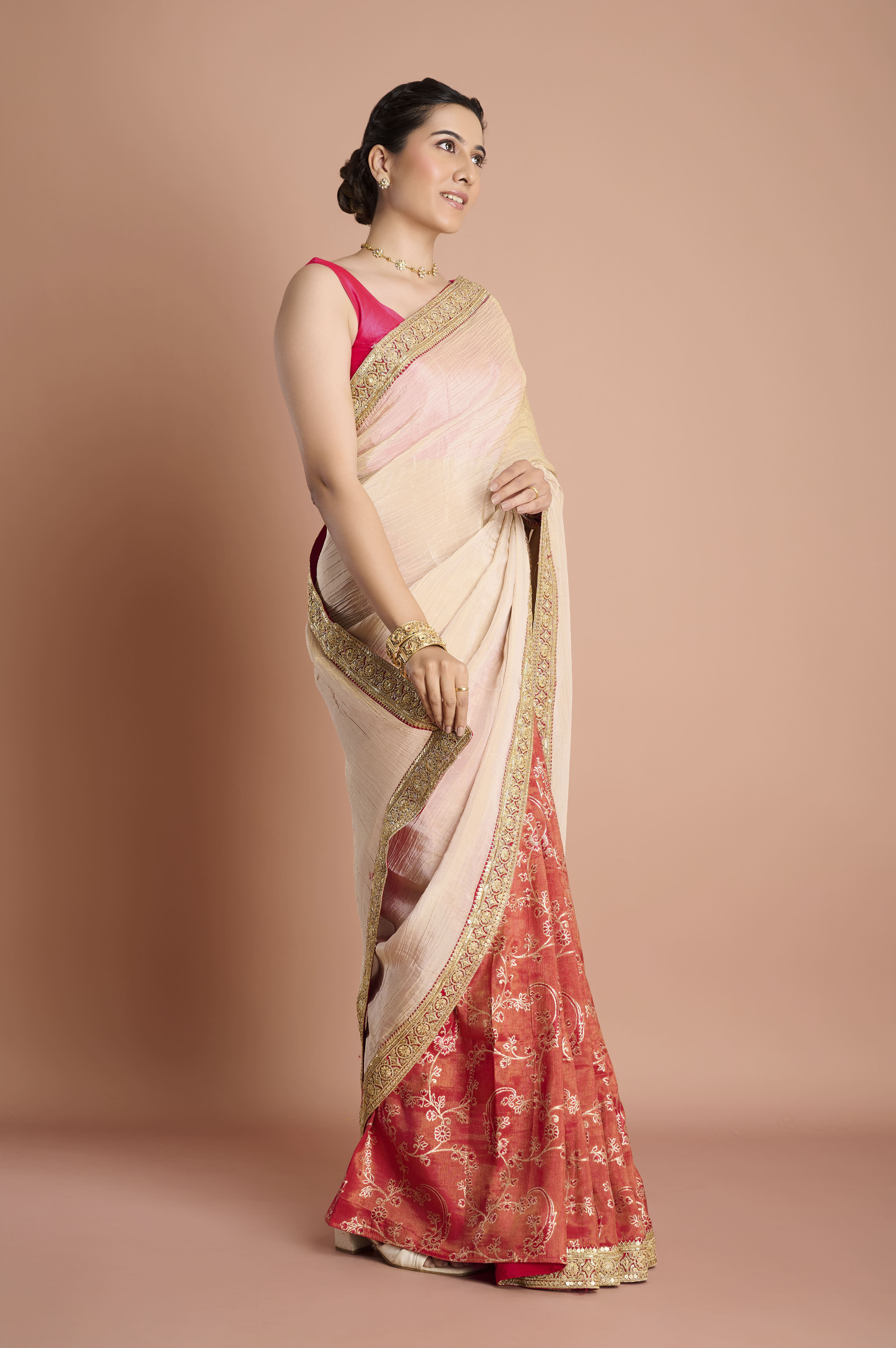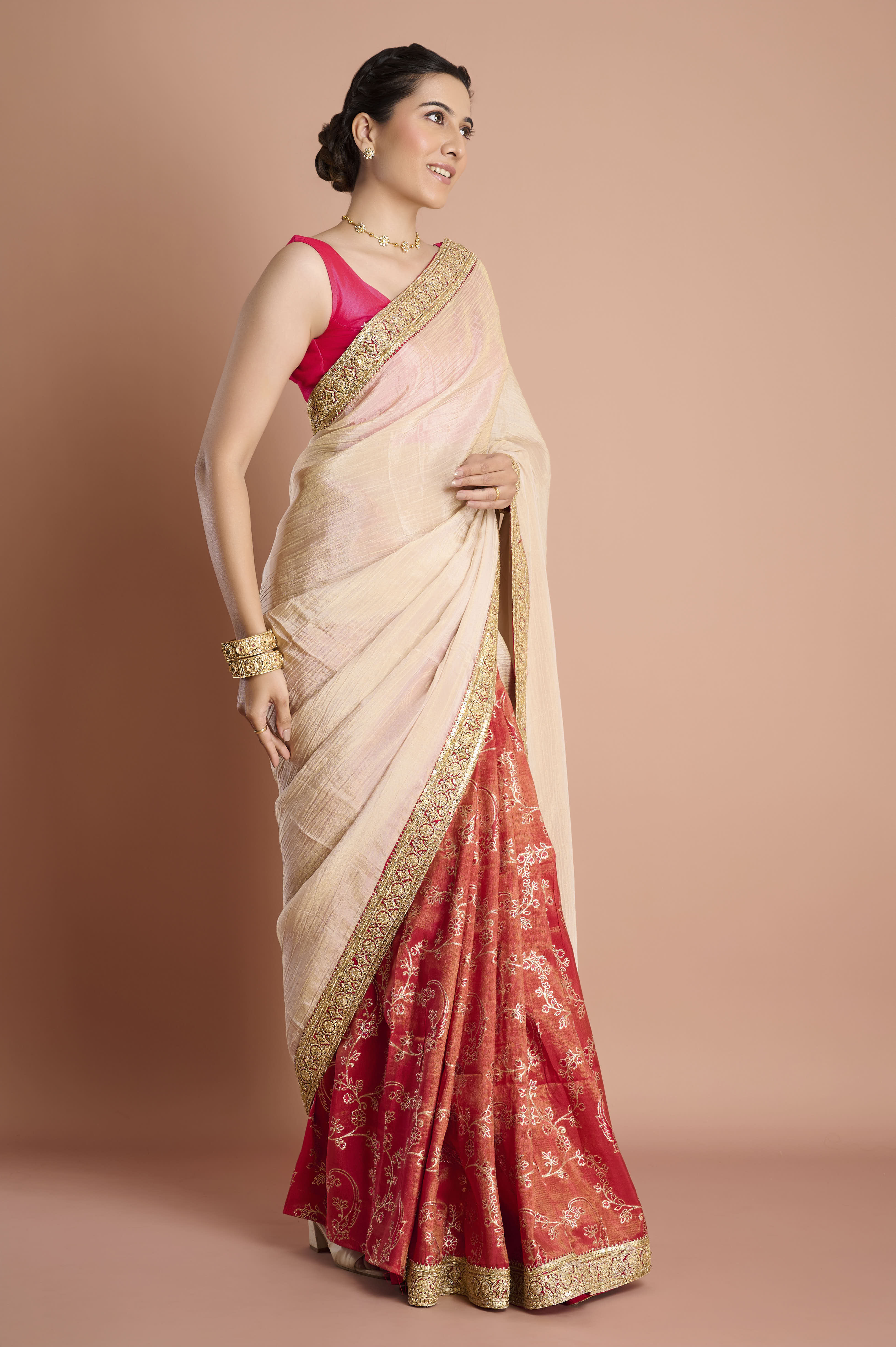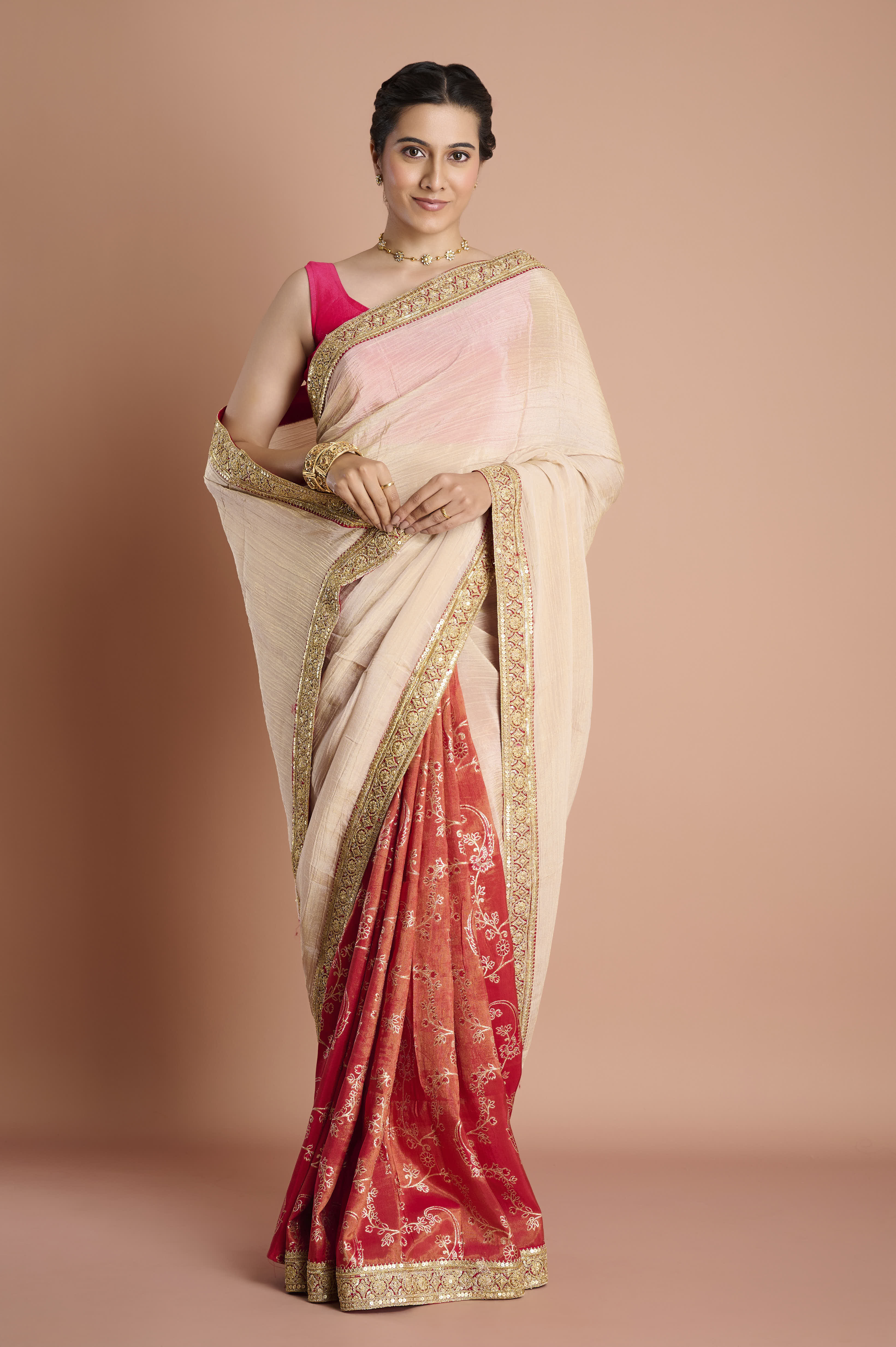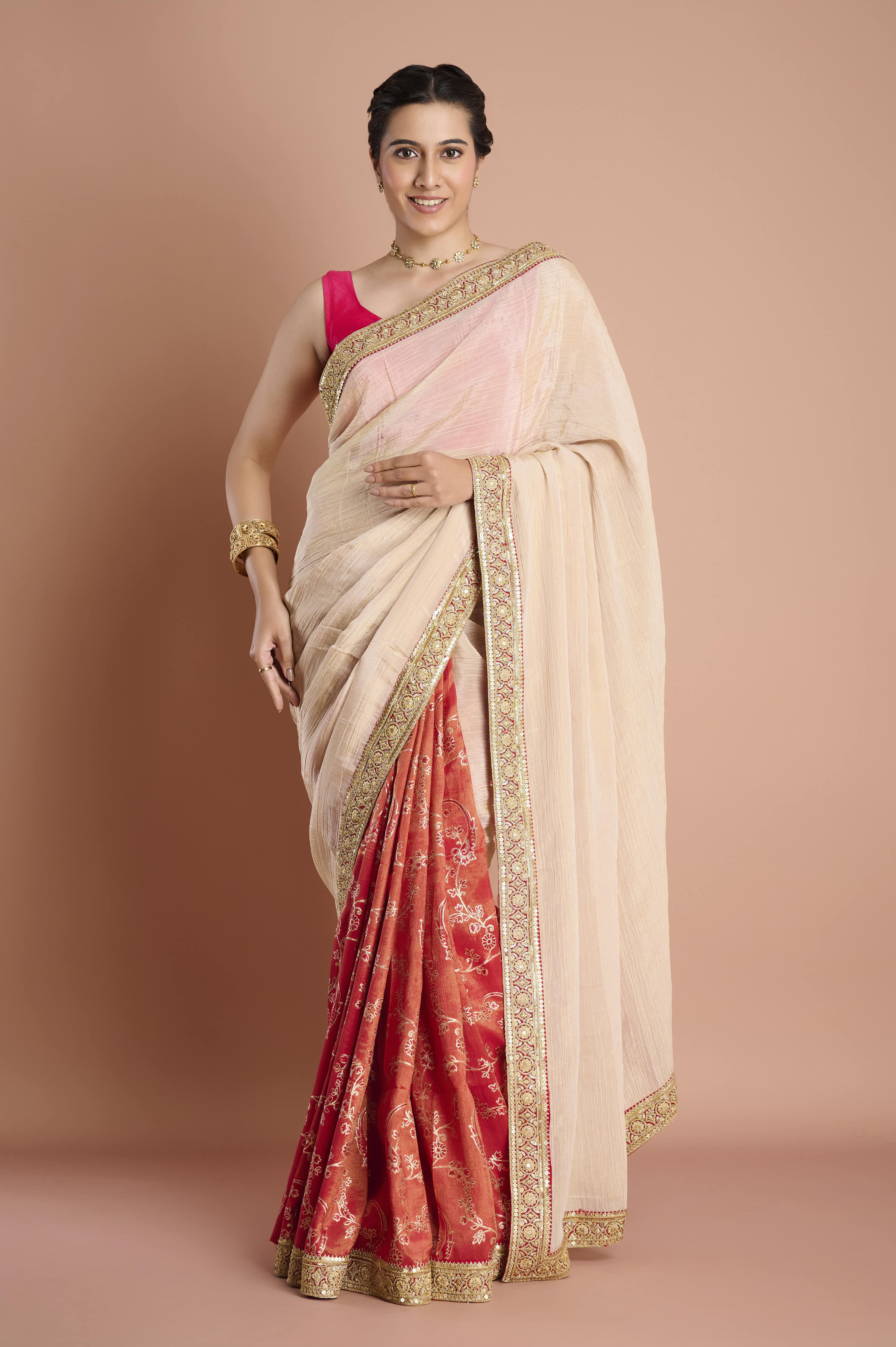 Experience the best of both worlds with this half-and-half weaving tissue saree, featuring a unique blend of creamy beige tissue with a touch of blush pink and a beautifully contrasting tomato red pleated section. The opulent border is adorned with intricate golden and ruby zari embroidery for a touch of regal luxury, enhancing the saree's lightweight, airy drape. Perfect for weddings, festivities, and sophisticated gatherings, the fluid semi-sheer upper half and the rich, lustrous lower half make this design a true statement in contemporary elegance. An unstitched blouse piece is included for complete customisation.