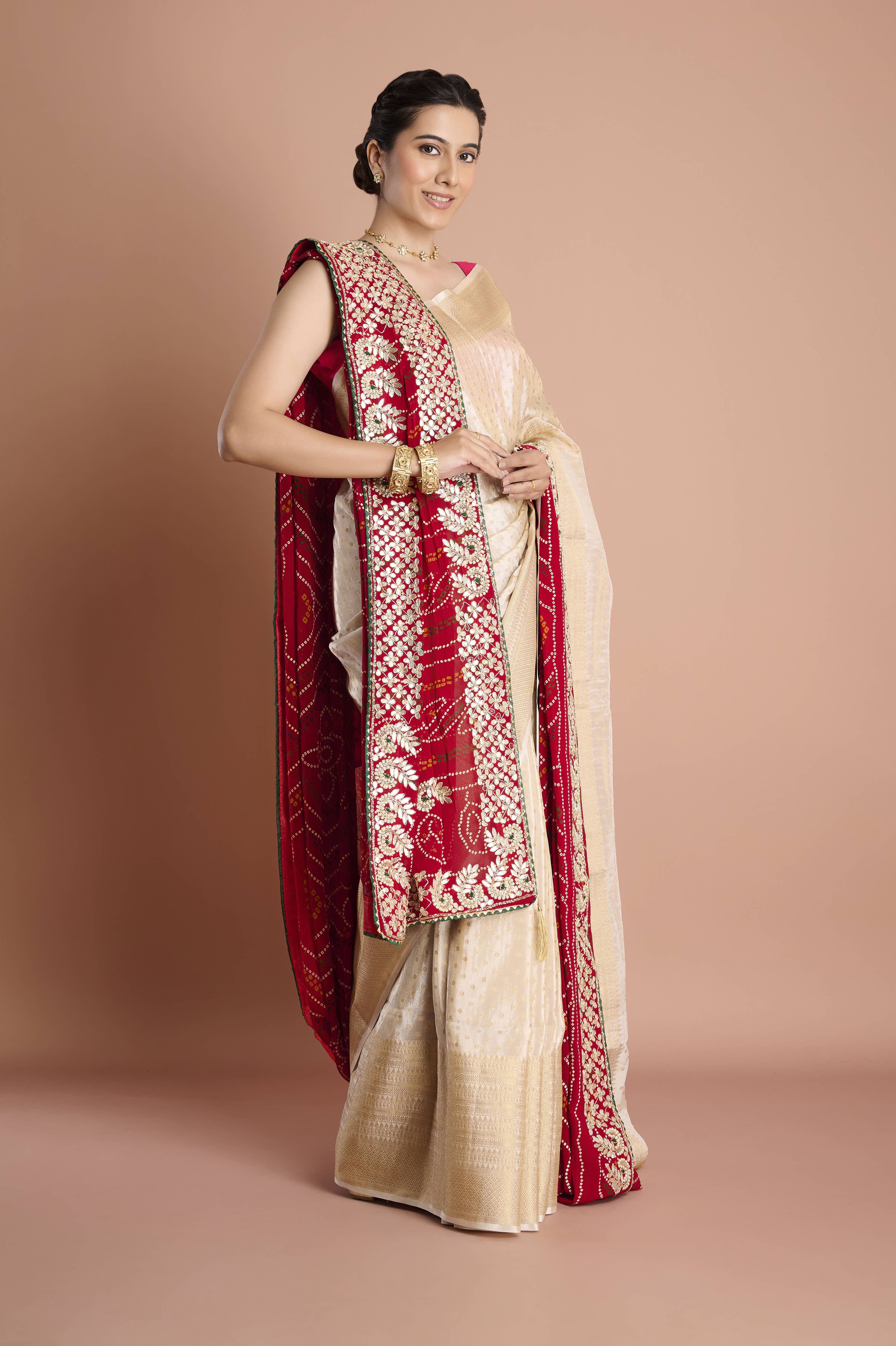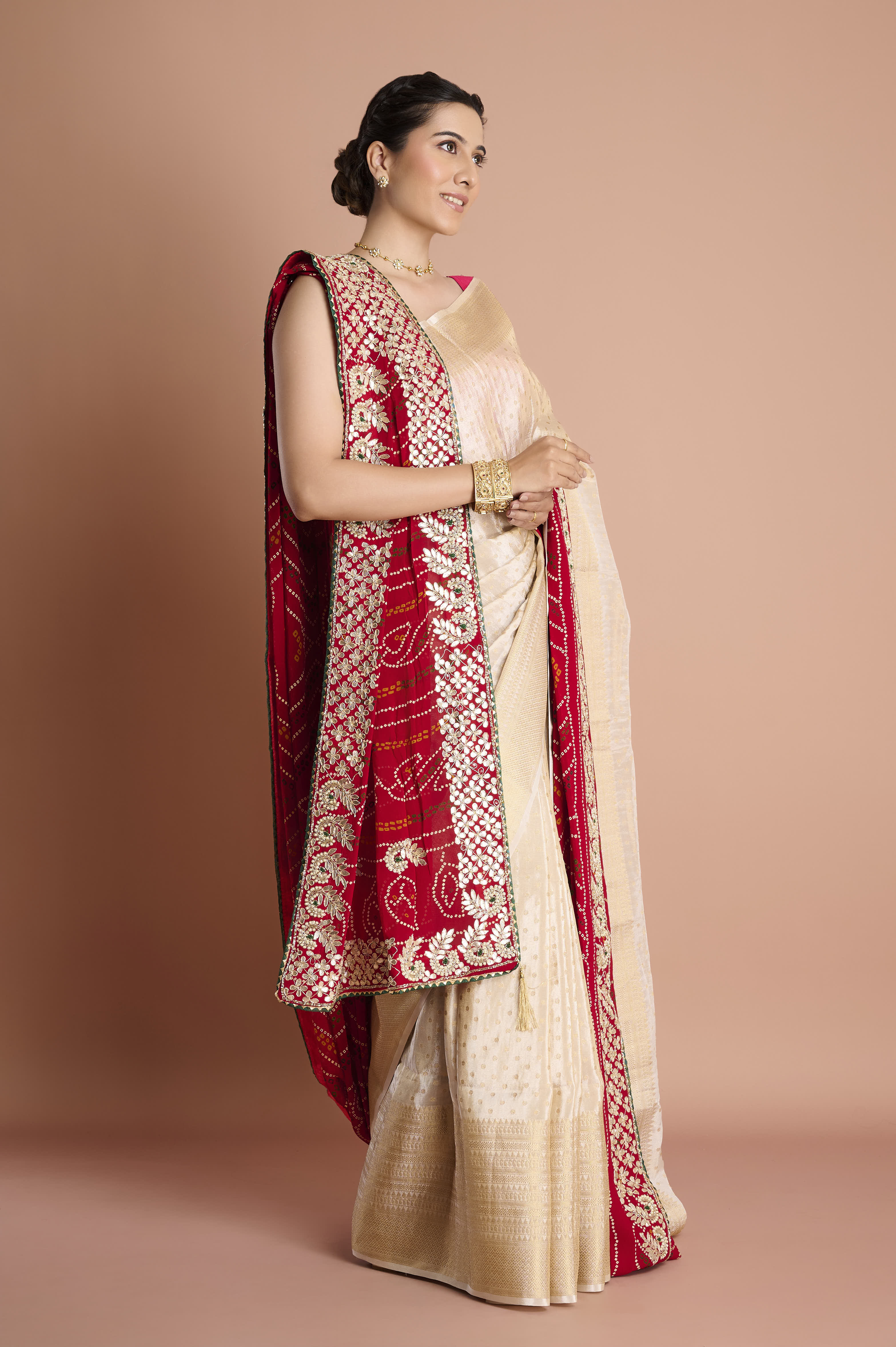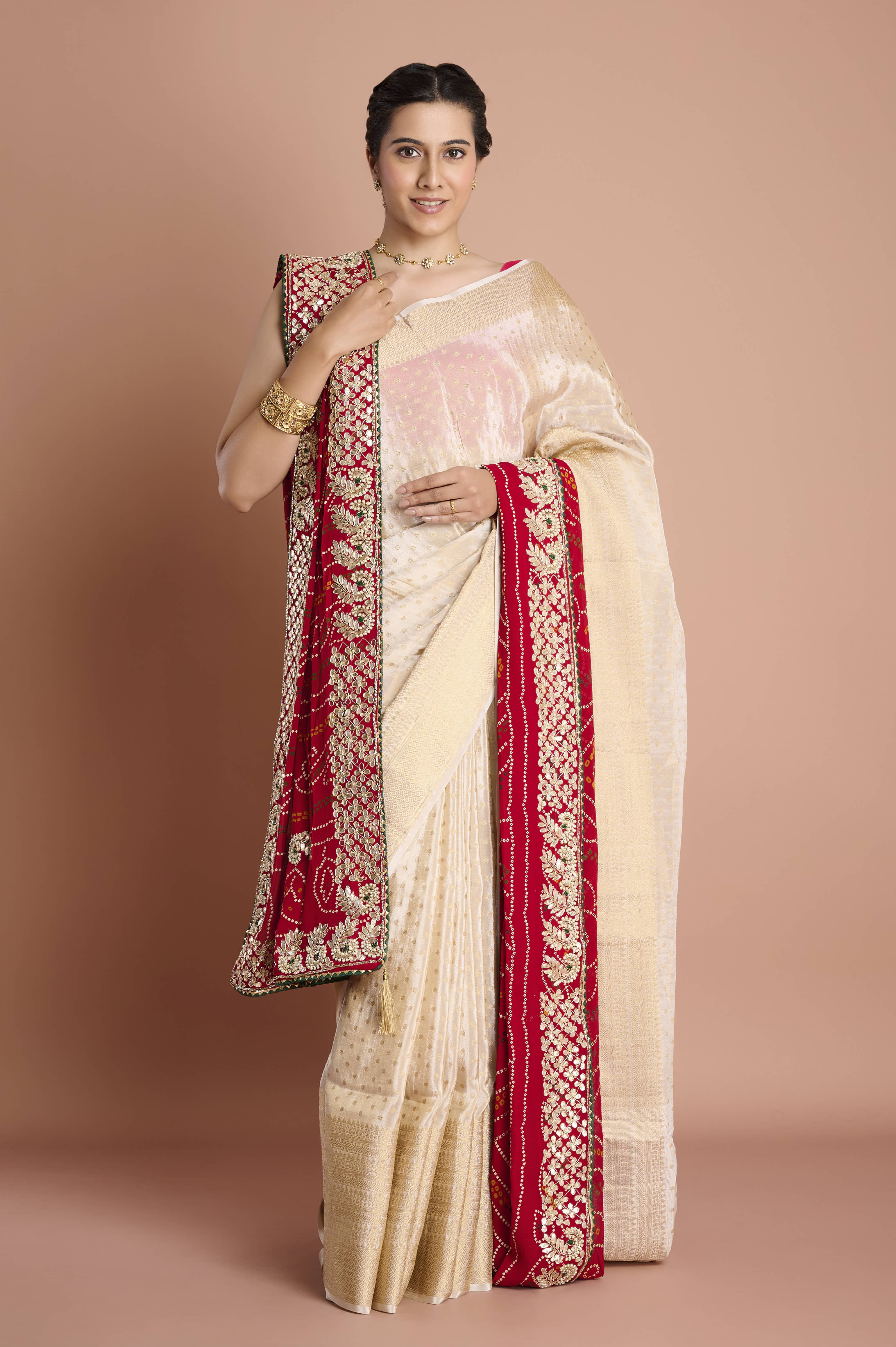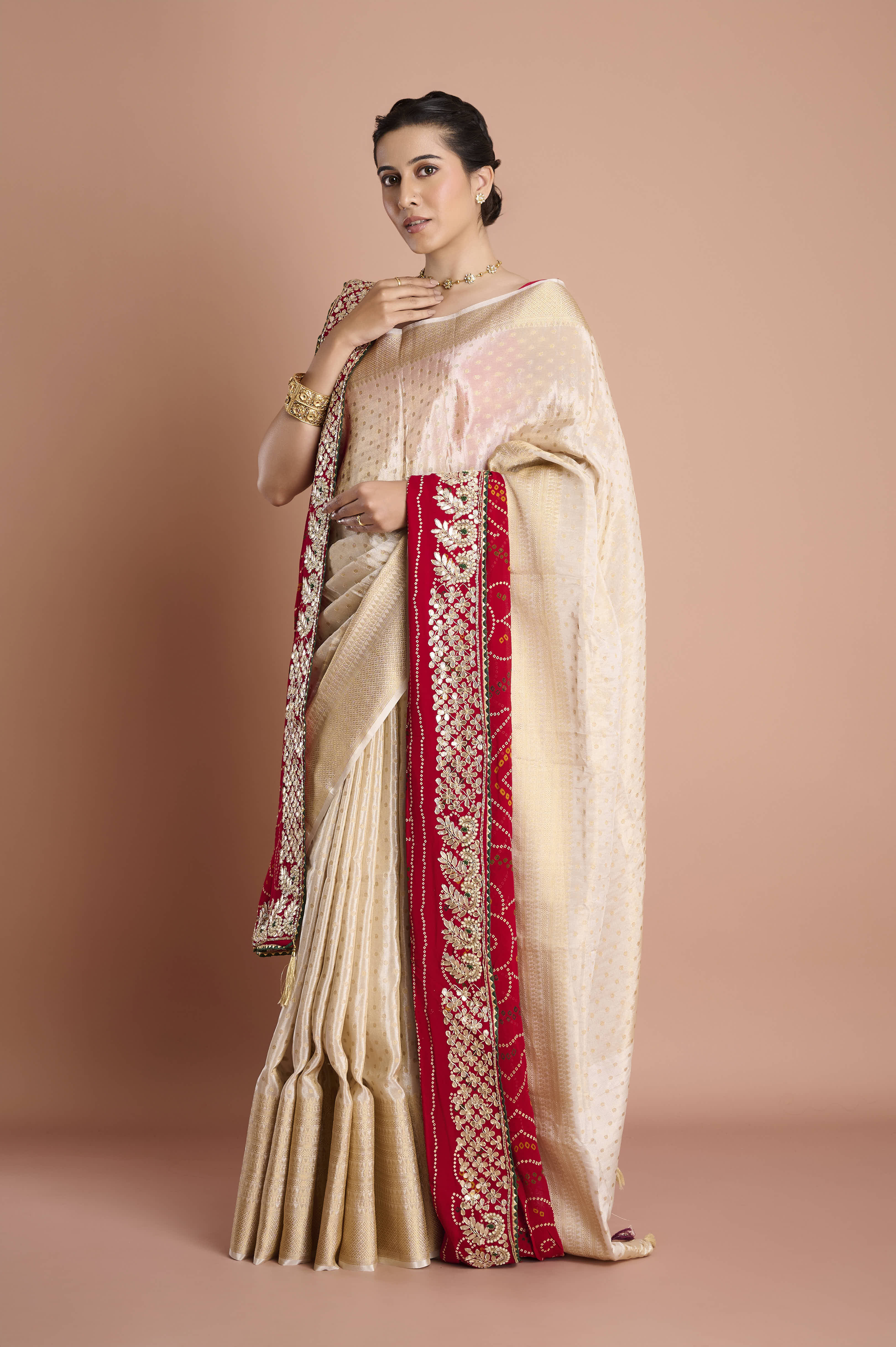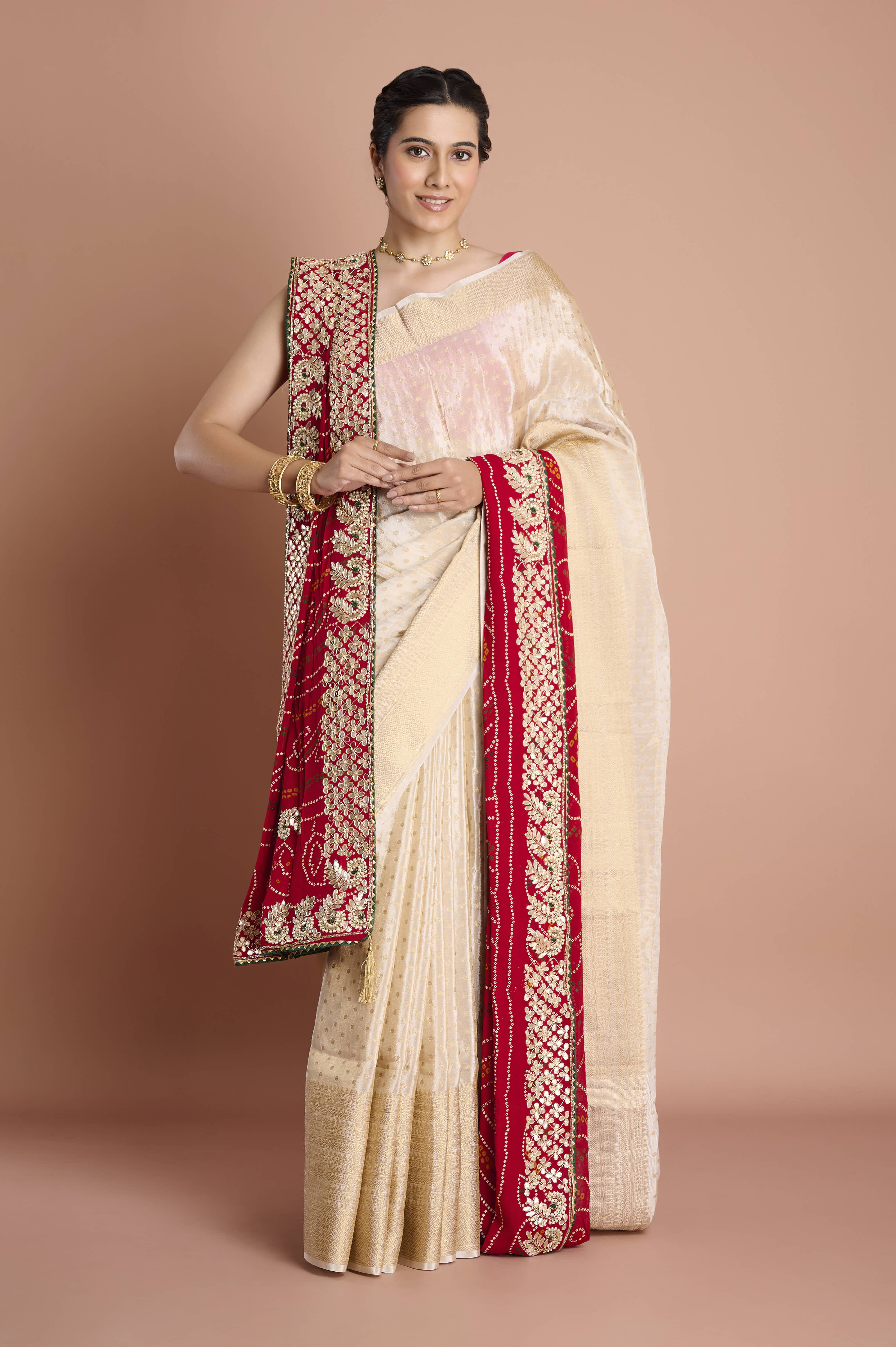 Turn every occasion special with this ethereal ivory tissue saree, intricately woven with gleaming gold zari dots and a sophisticated broad border. The understated shimmer and airy texture give it a regal yet modern appeal, perfect for festive celebrations or elegant evenings. Paired with the saree is a striking unstitched purple blouse piece, designed to create a bold contrast and personalise your final look. Please note: The red dupatta shown in the image is for representation only and is not included with the saree.