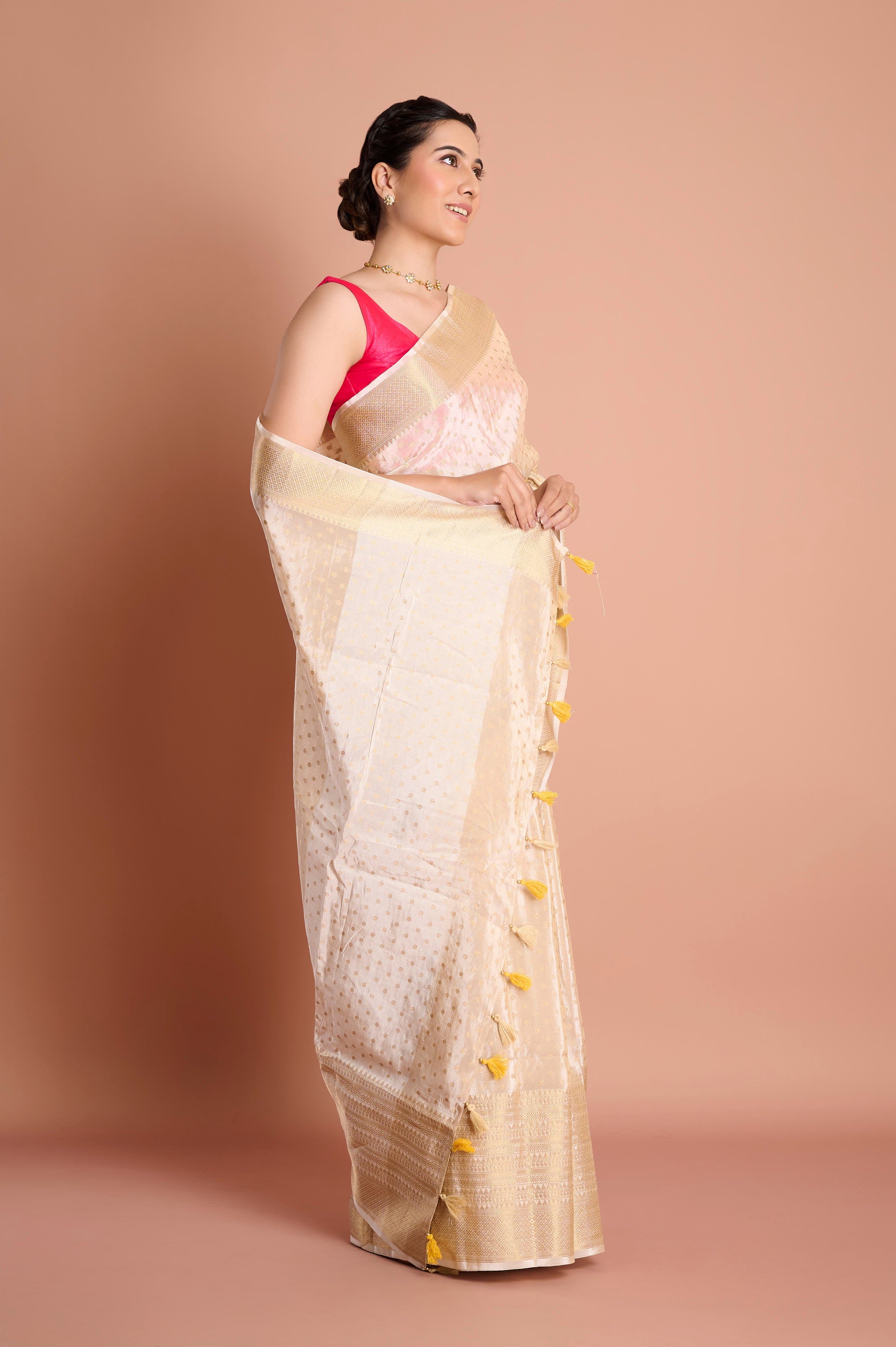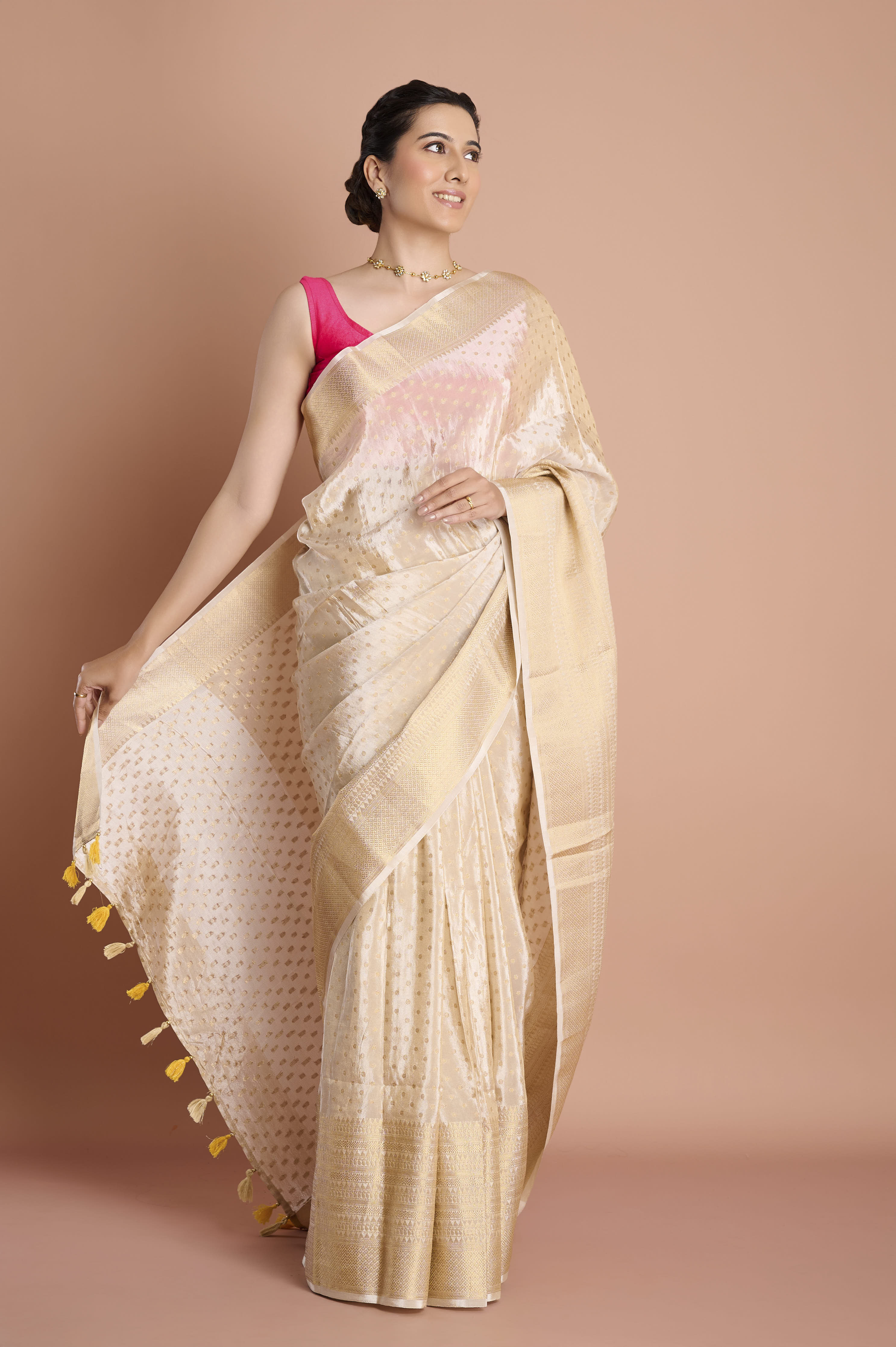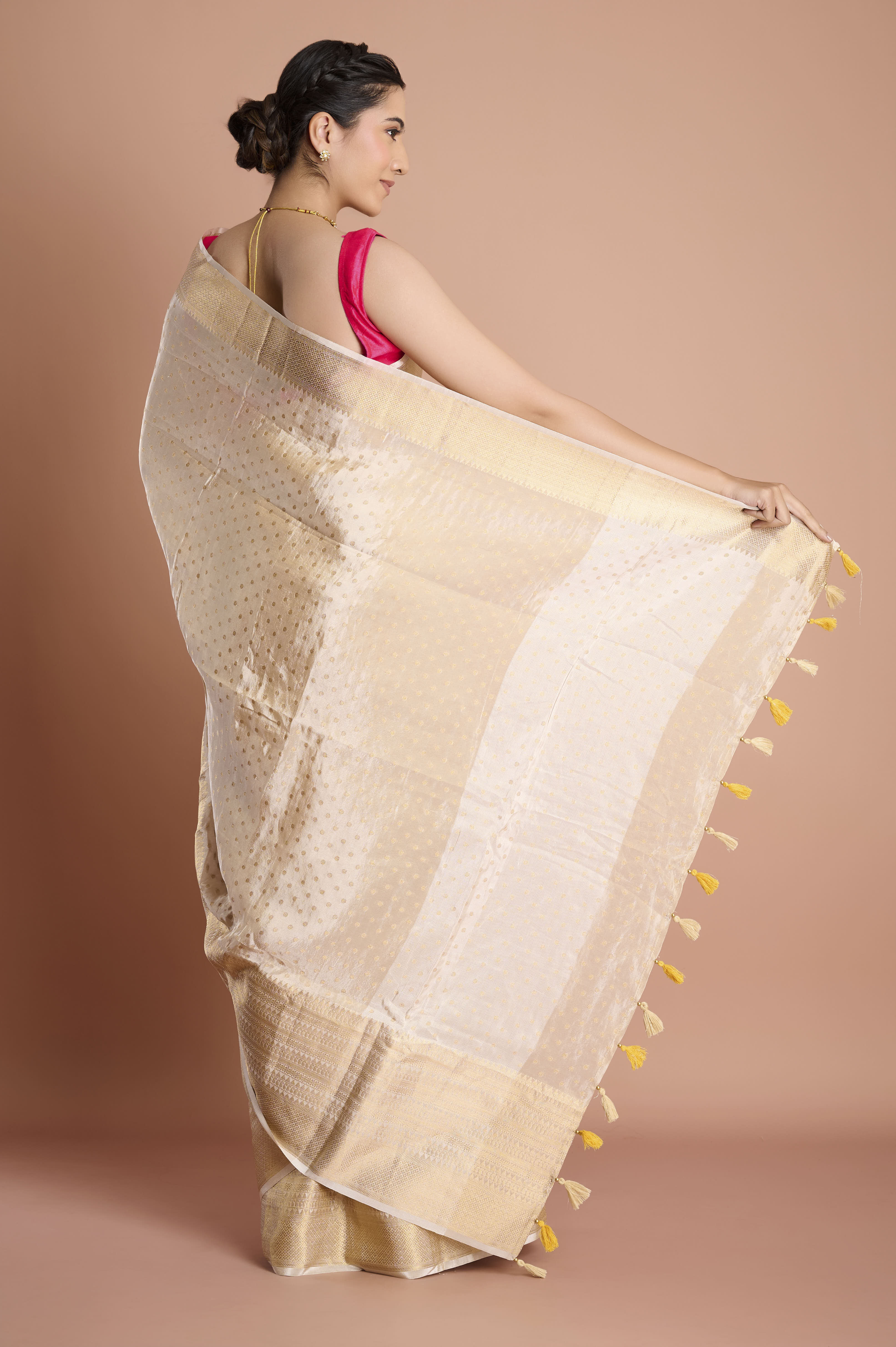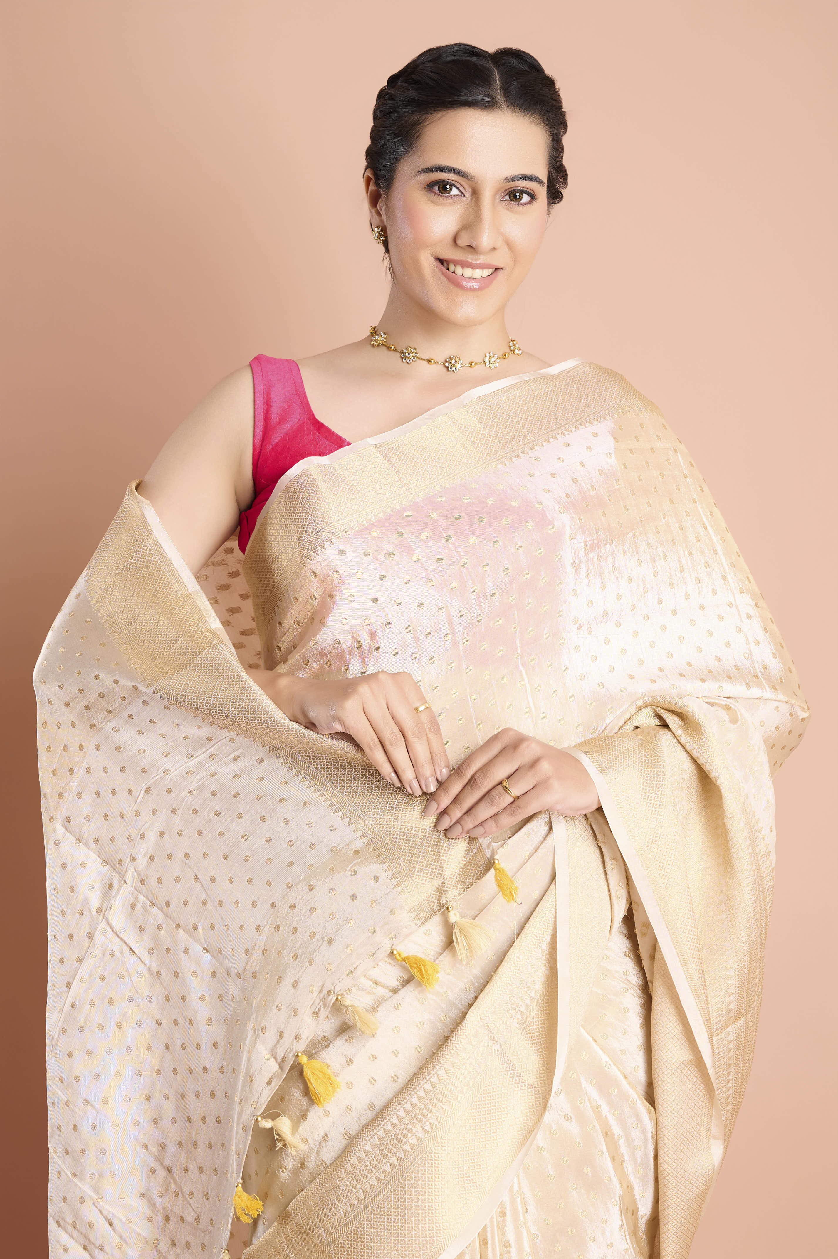 Add instant radiance to your celebration wardrobe with this shimmering tissue saree in luminous ivory, completely woven with delicate gold zari dots for a look thatÕs both ethereal and modern. The sareeÕs soft sheen is beautifully framed by a wide, textured gold border, lending opulence to its airy, feather-light drape. Designed for festive moments and grand soirees, this saree brings understated glamour and luxury to every occasion. The included unstitched contrast yellow blouse piece allows for a personalized, vibrant pairing to brighten your ensemble.