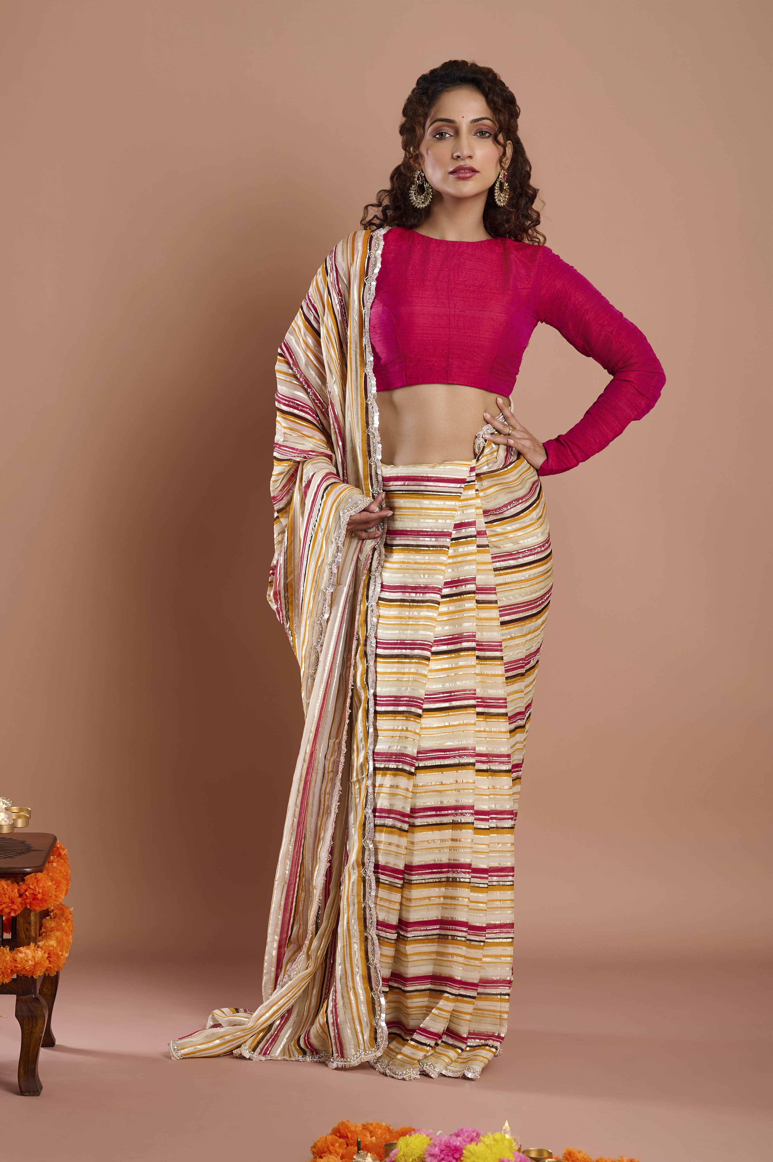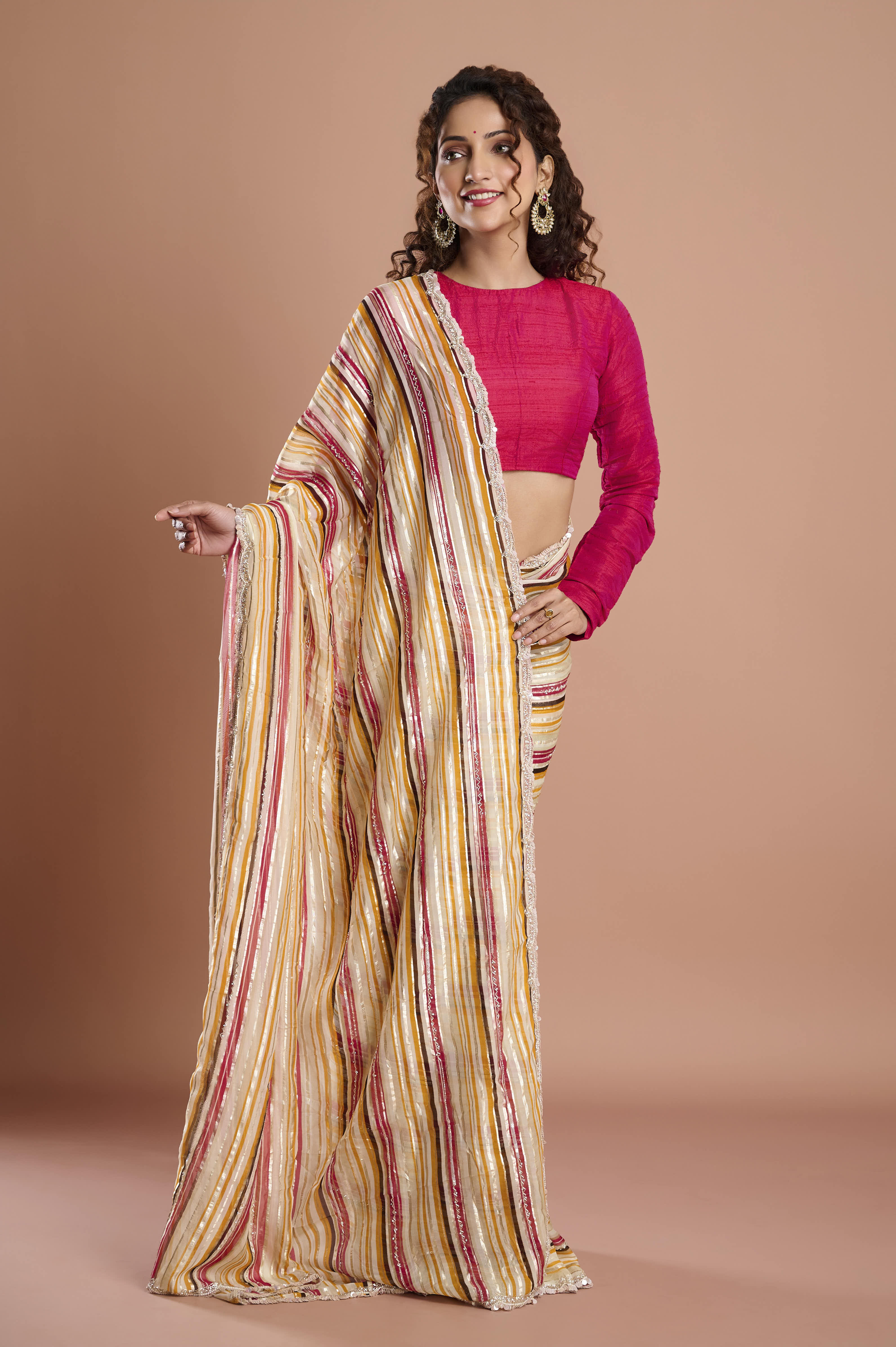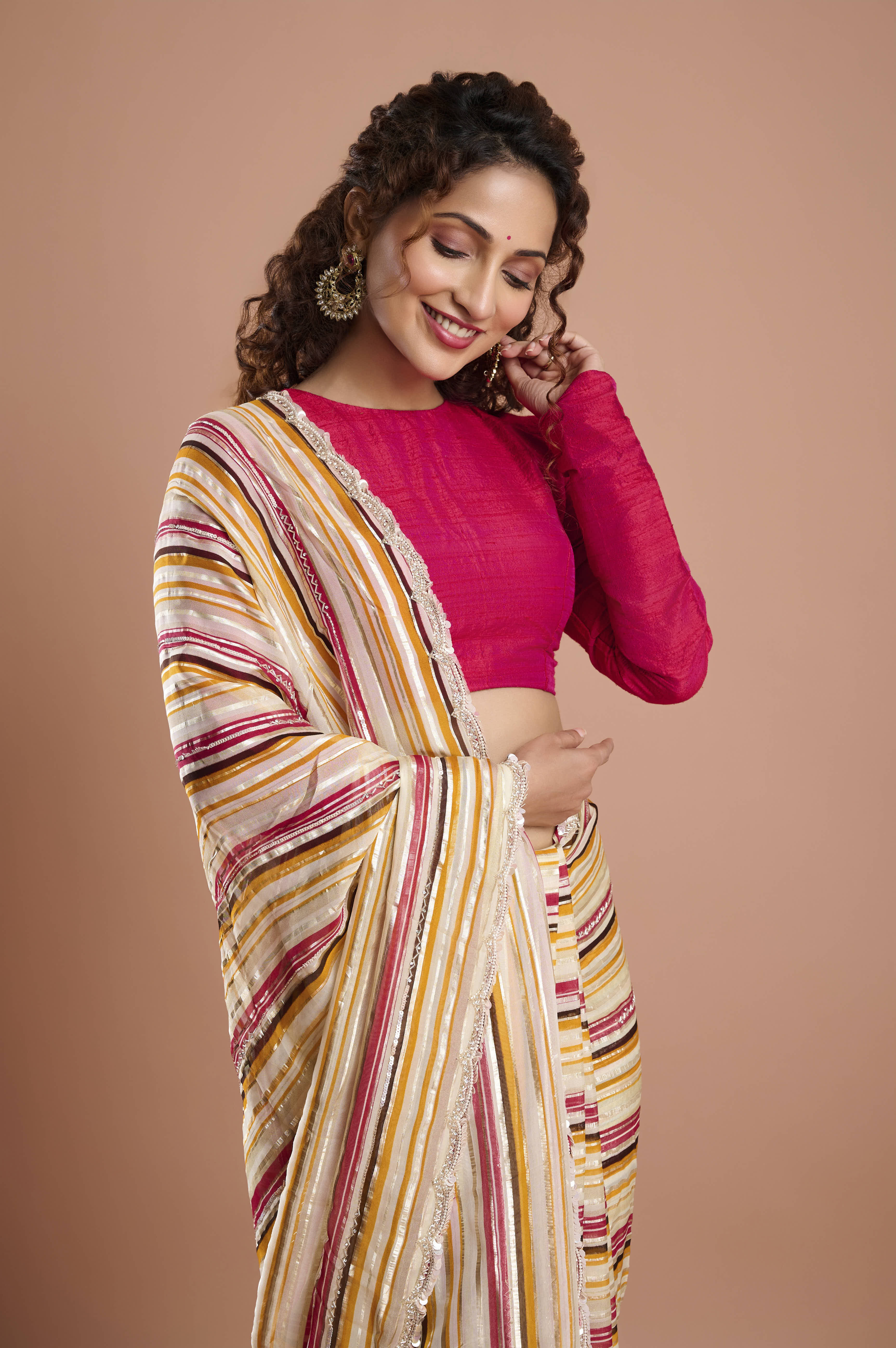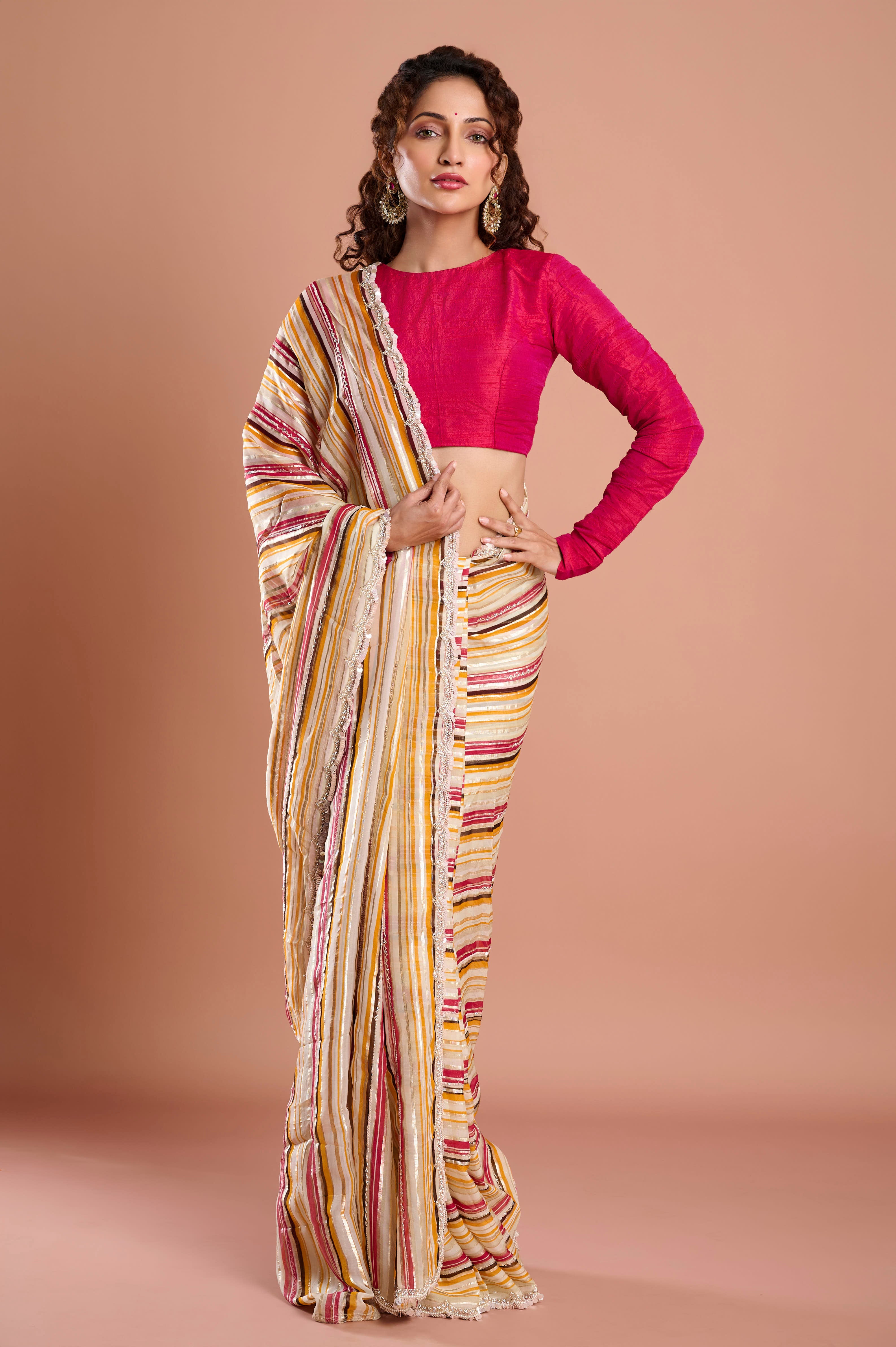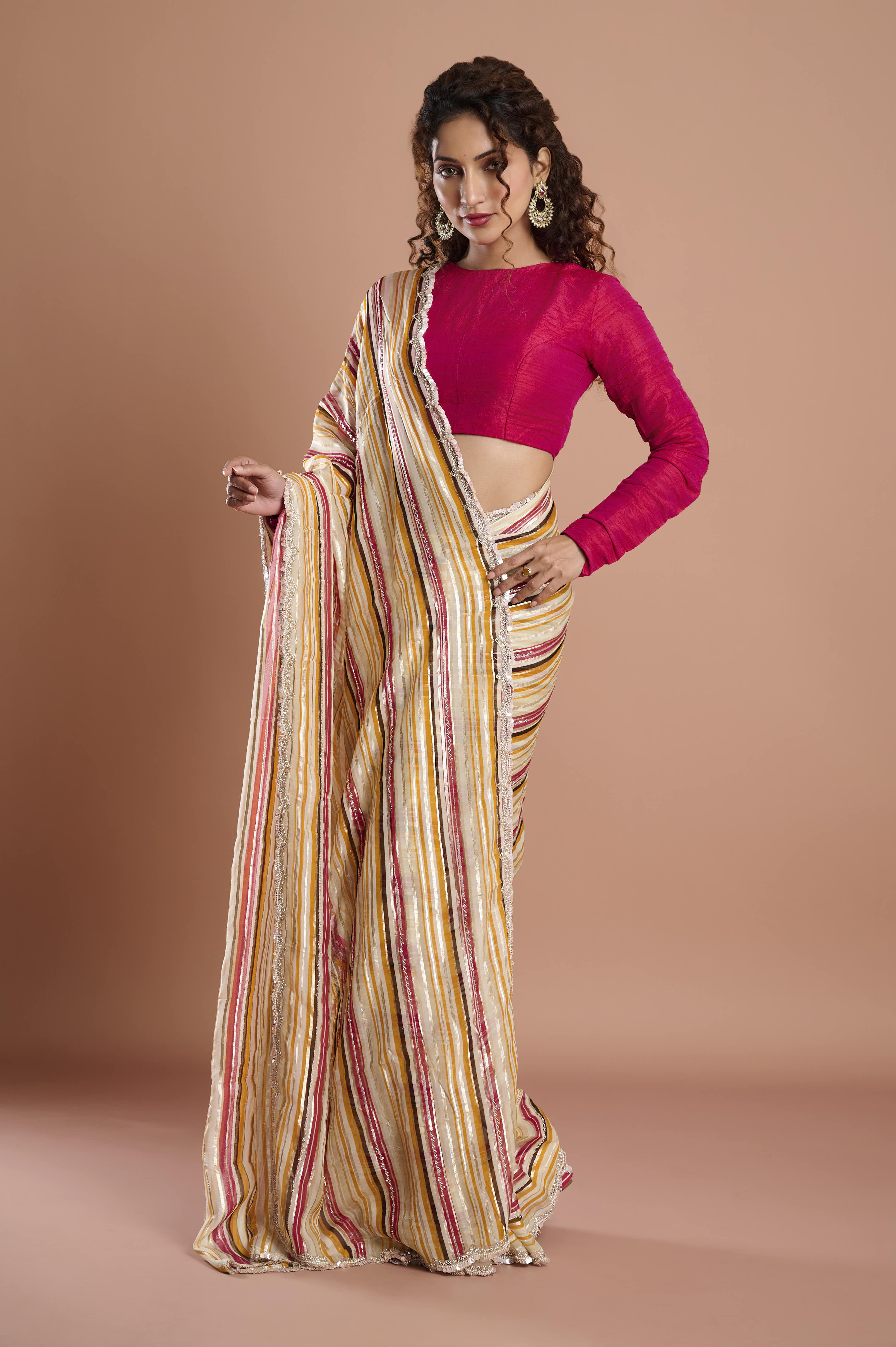 A feather-light organza saree with playful multicolour candy stripes in marigold, wine, blush and ivory. The sheer, airy texture adds lift and volume, finished with a refined silver scallop lace at the border. Naturally crisp with a graceful fall, perfect for day weddings and festive evenings.