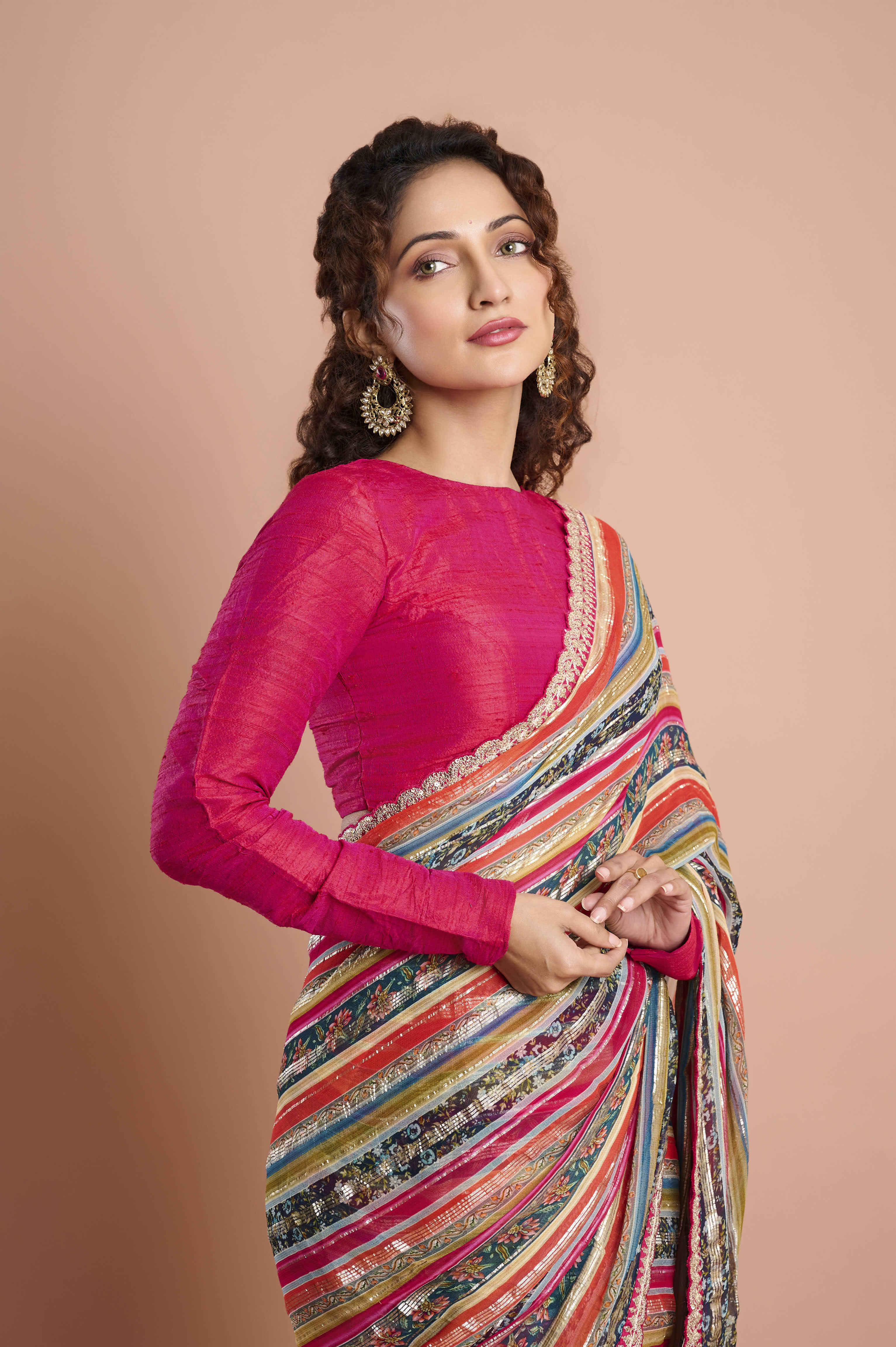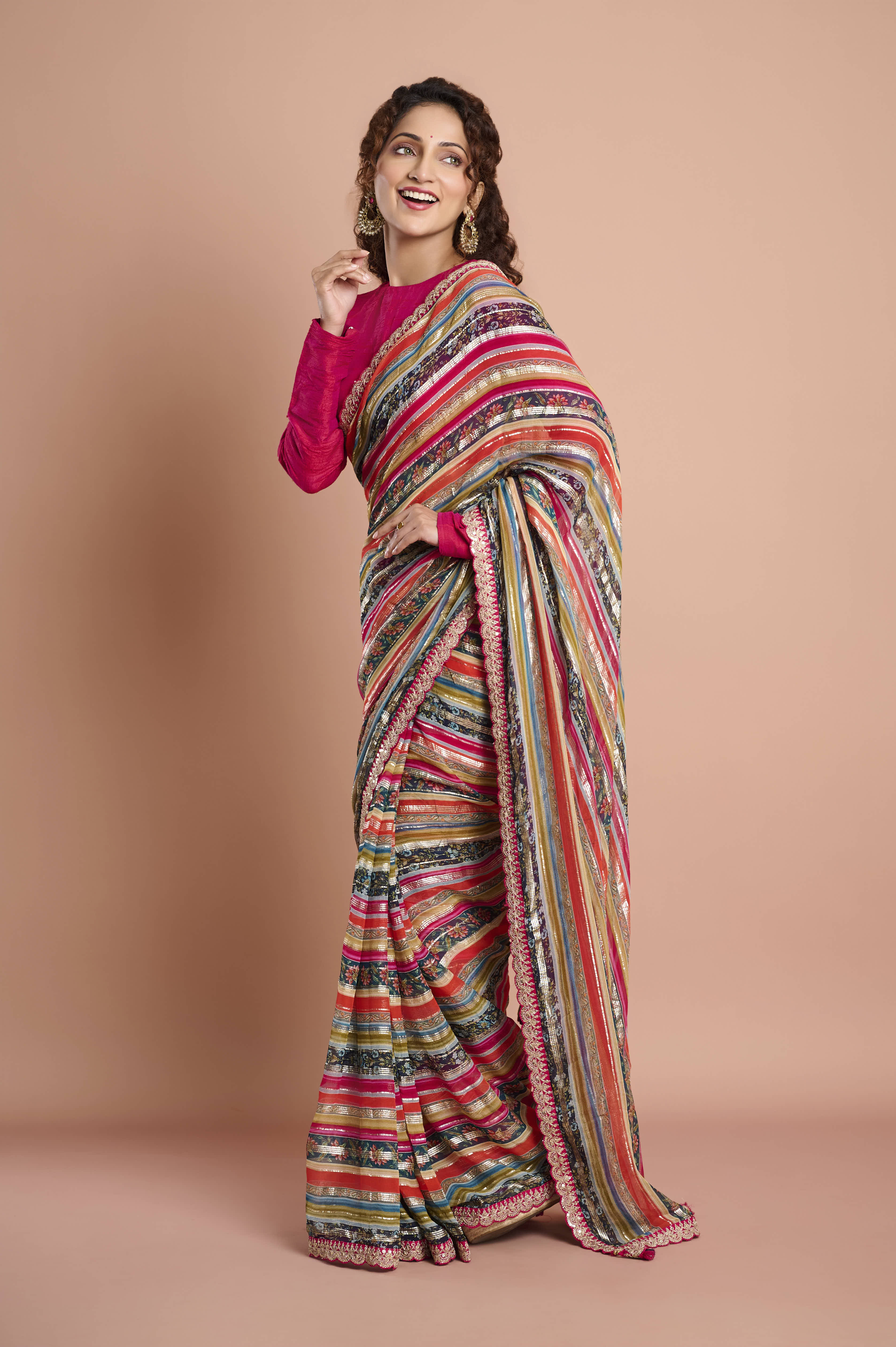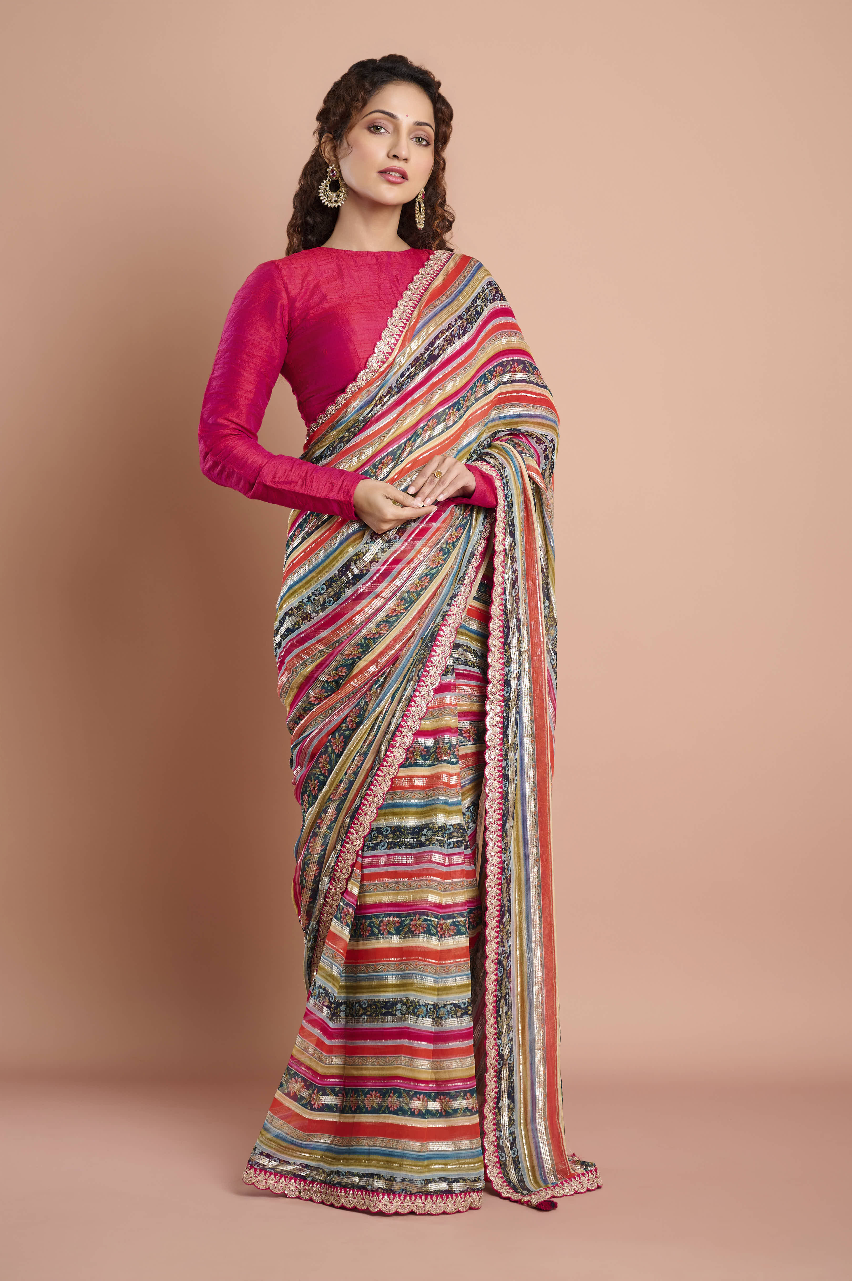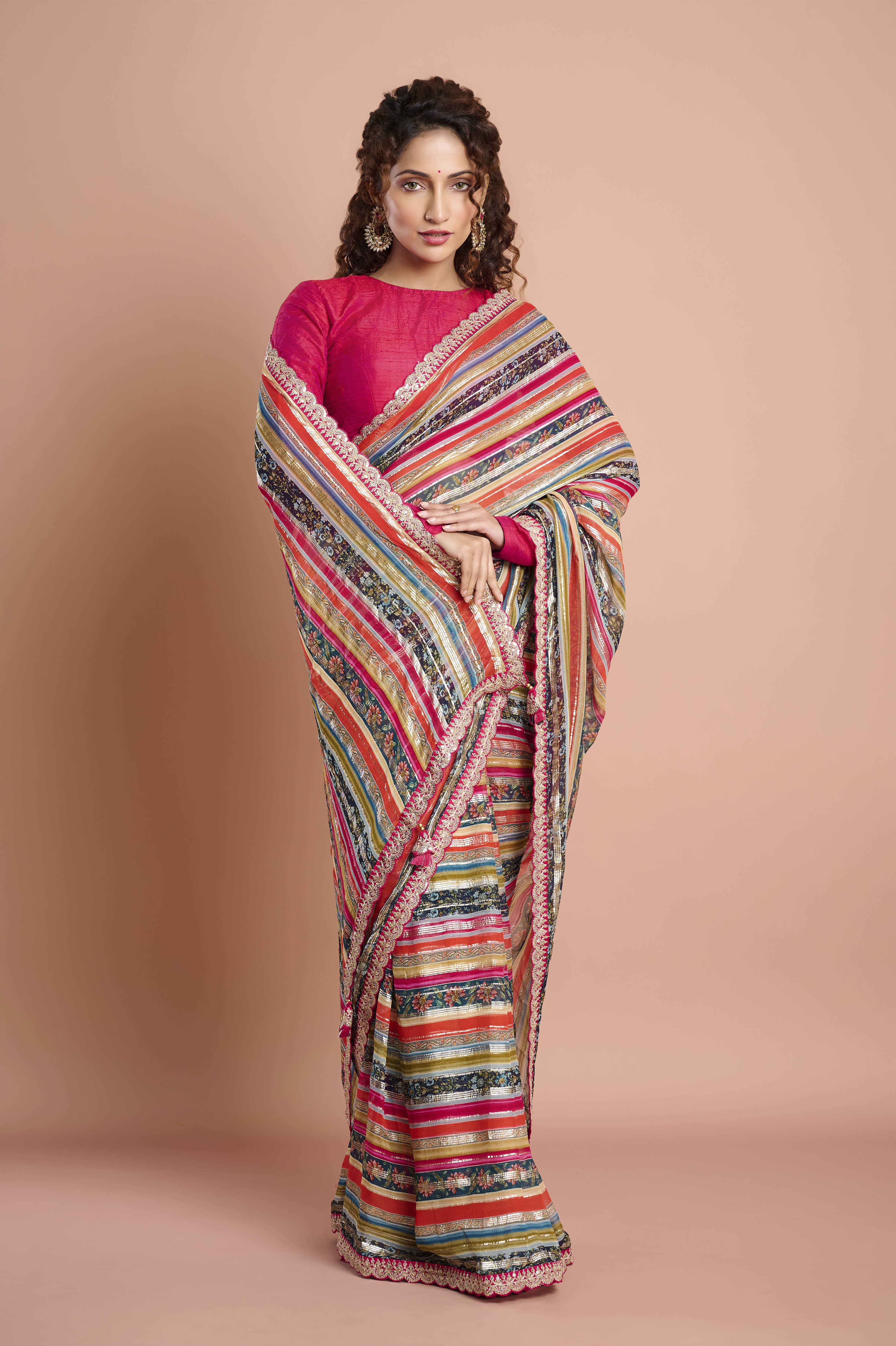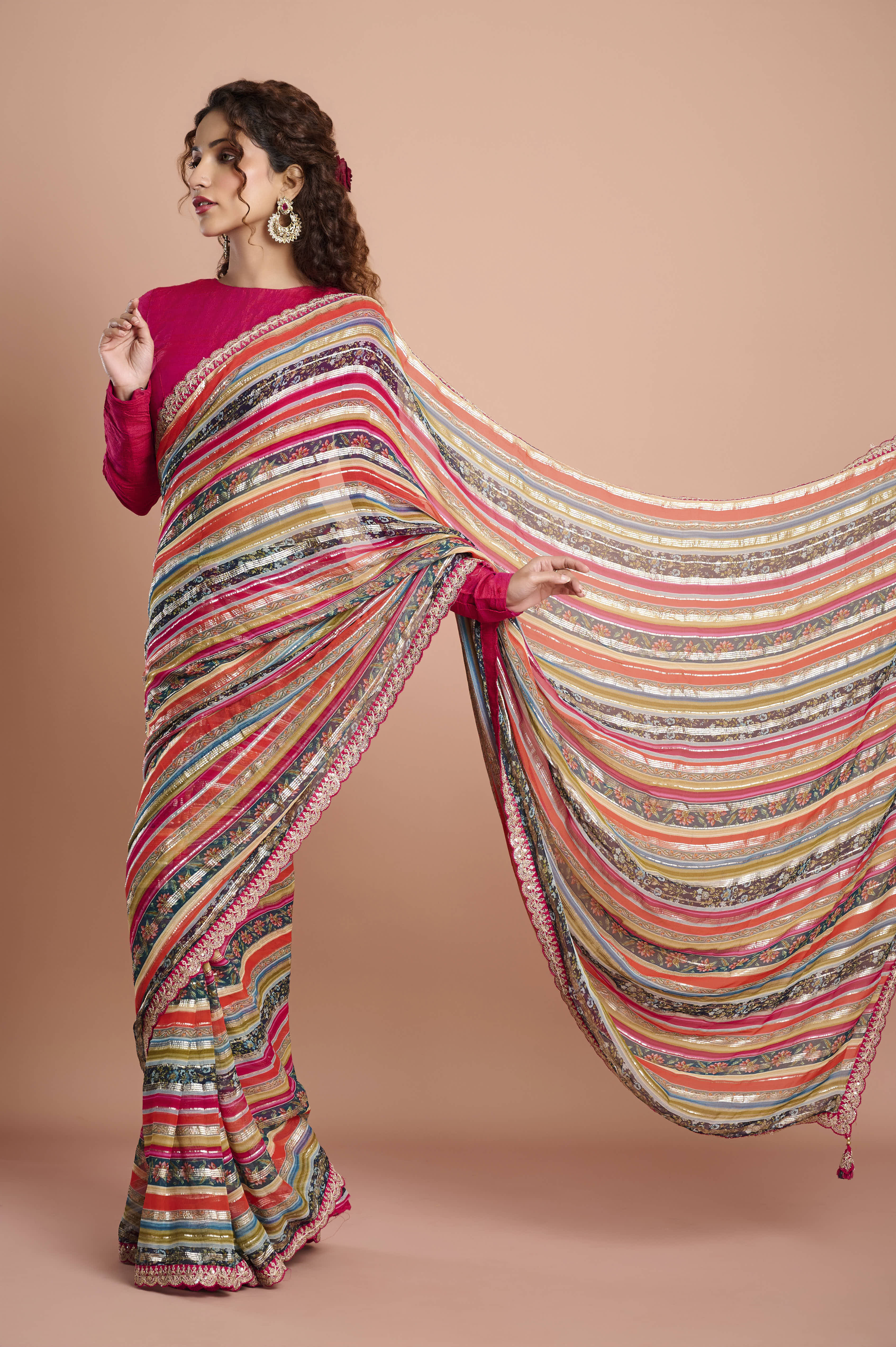 A lightweight georgette saree showcasing bold multicolour stripe digital print (rani, coral, teal, olive, champagne) enhanced with sleek metallic foil lines. Finished with a refined champagne scallop lace and subtle rani piping. Airy, fluid drape with crisp pleatsÑideal for mehendi, sangeet and festive evenings.