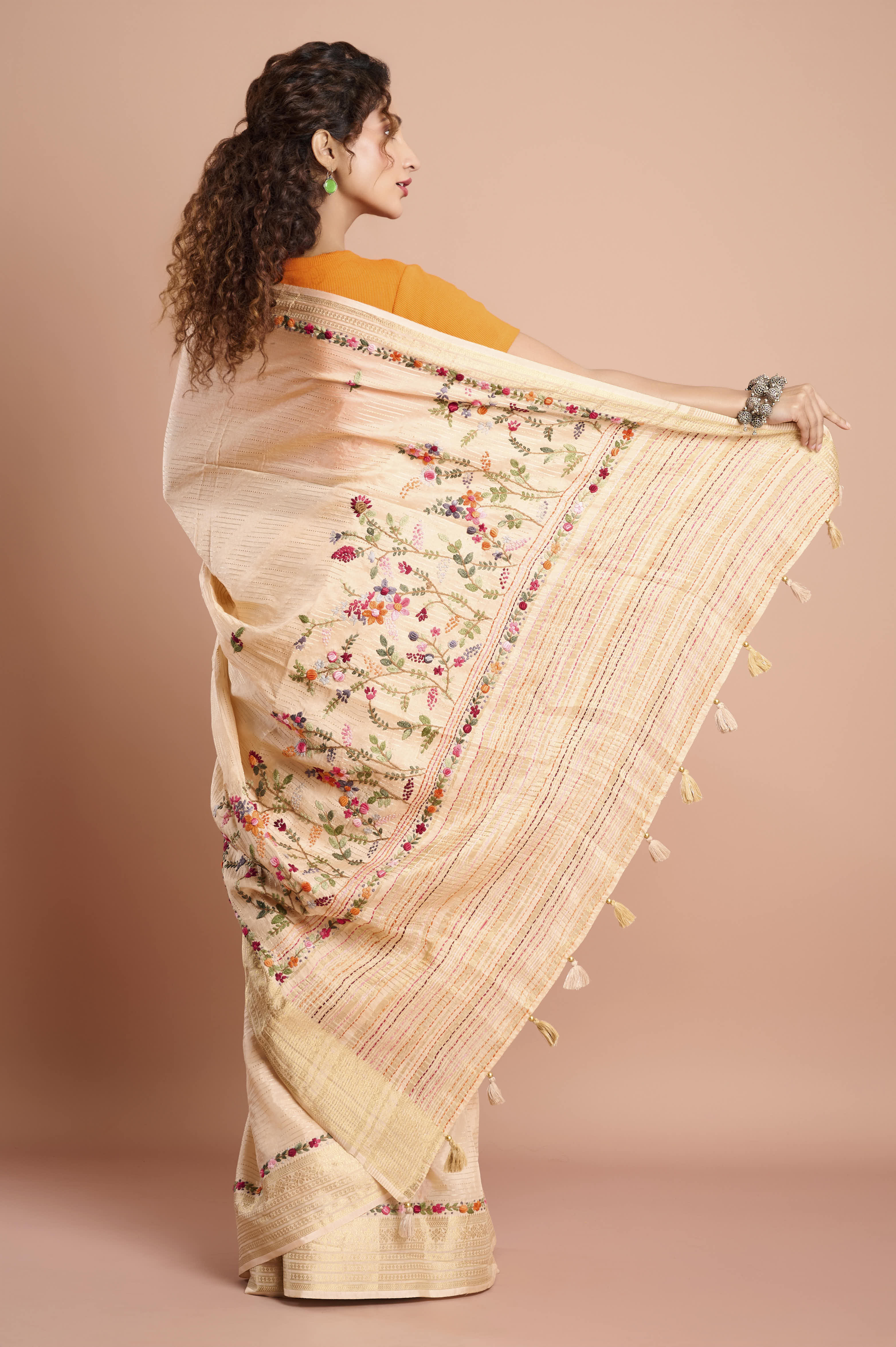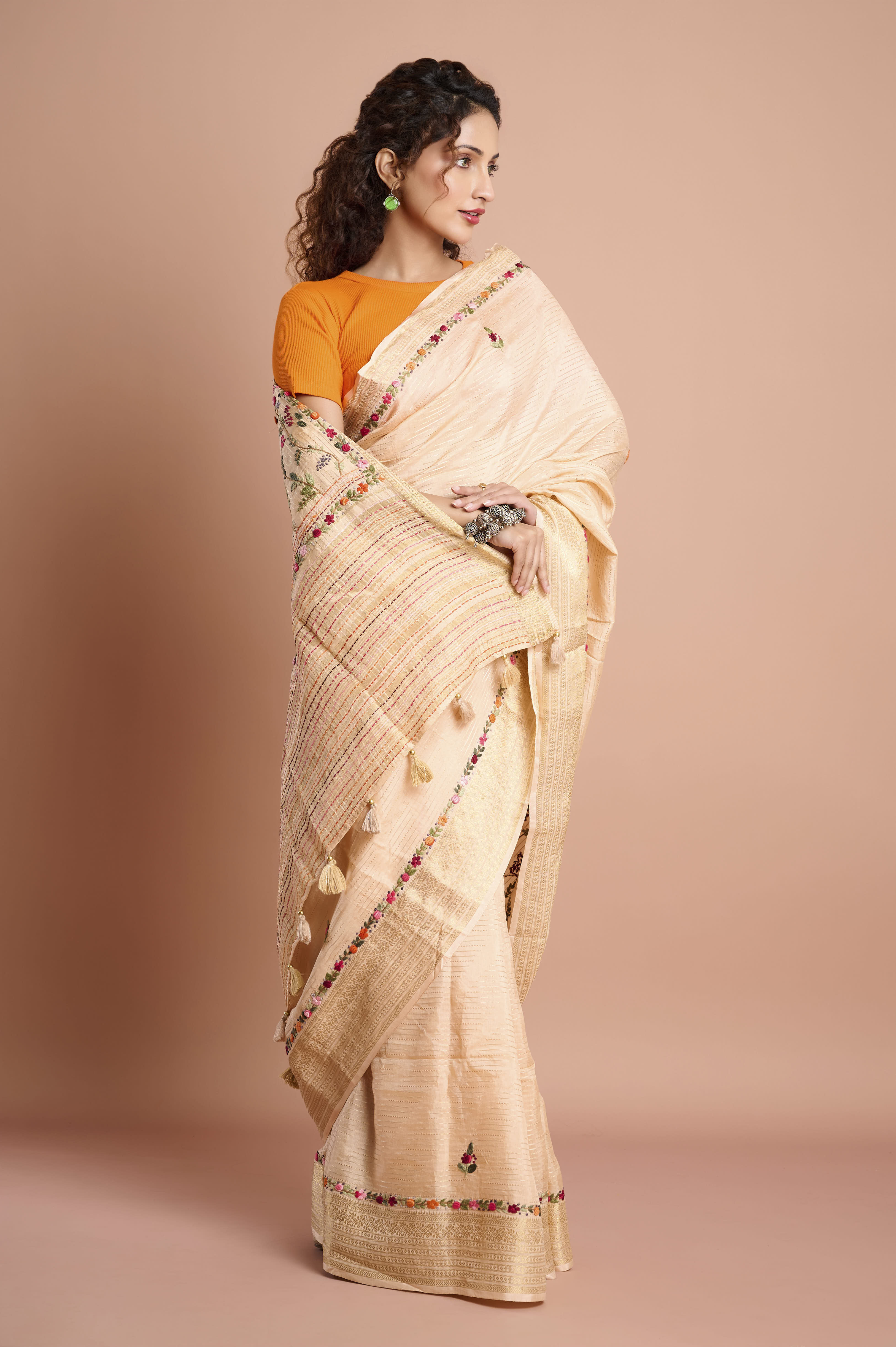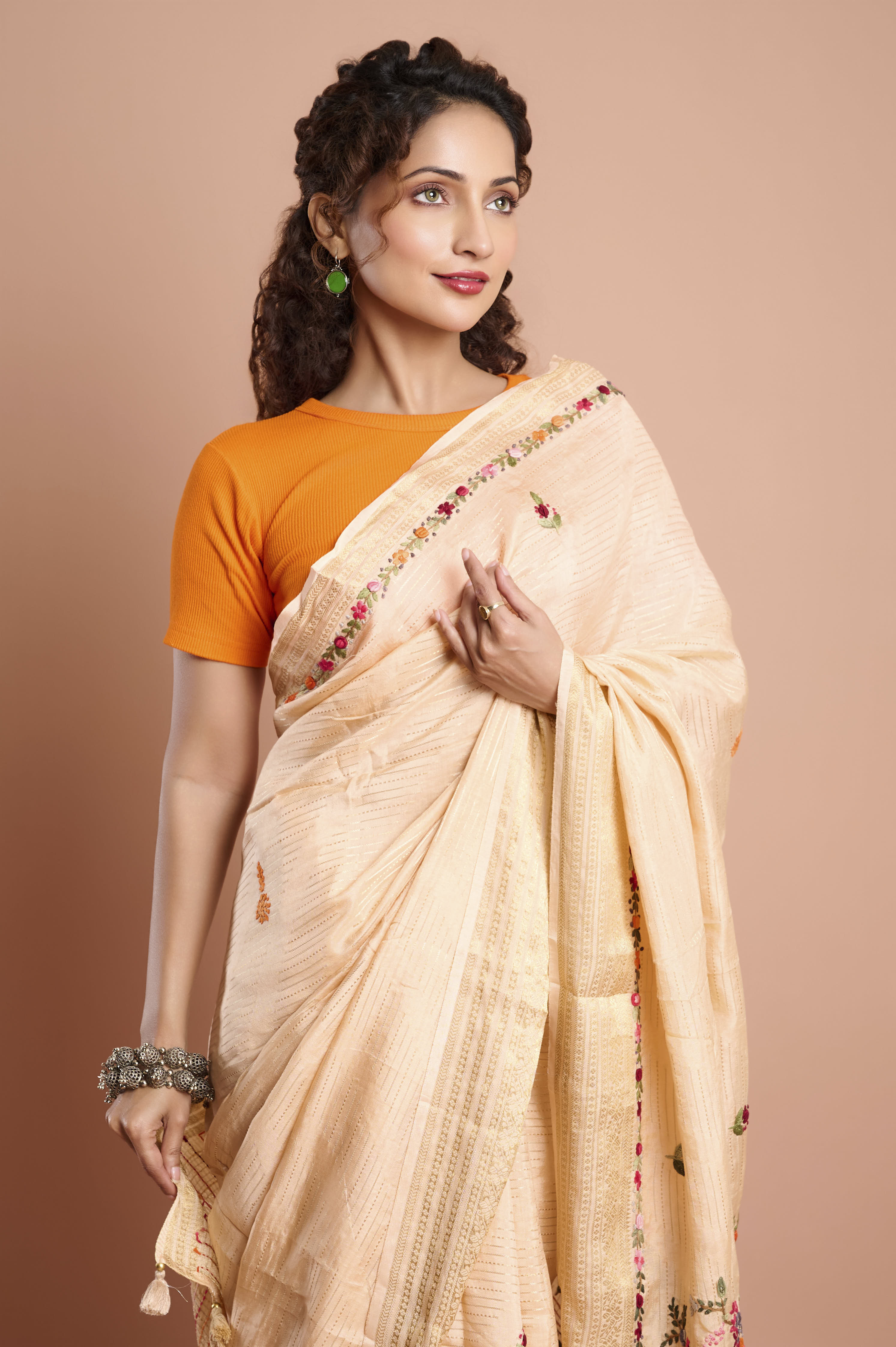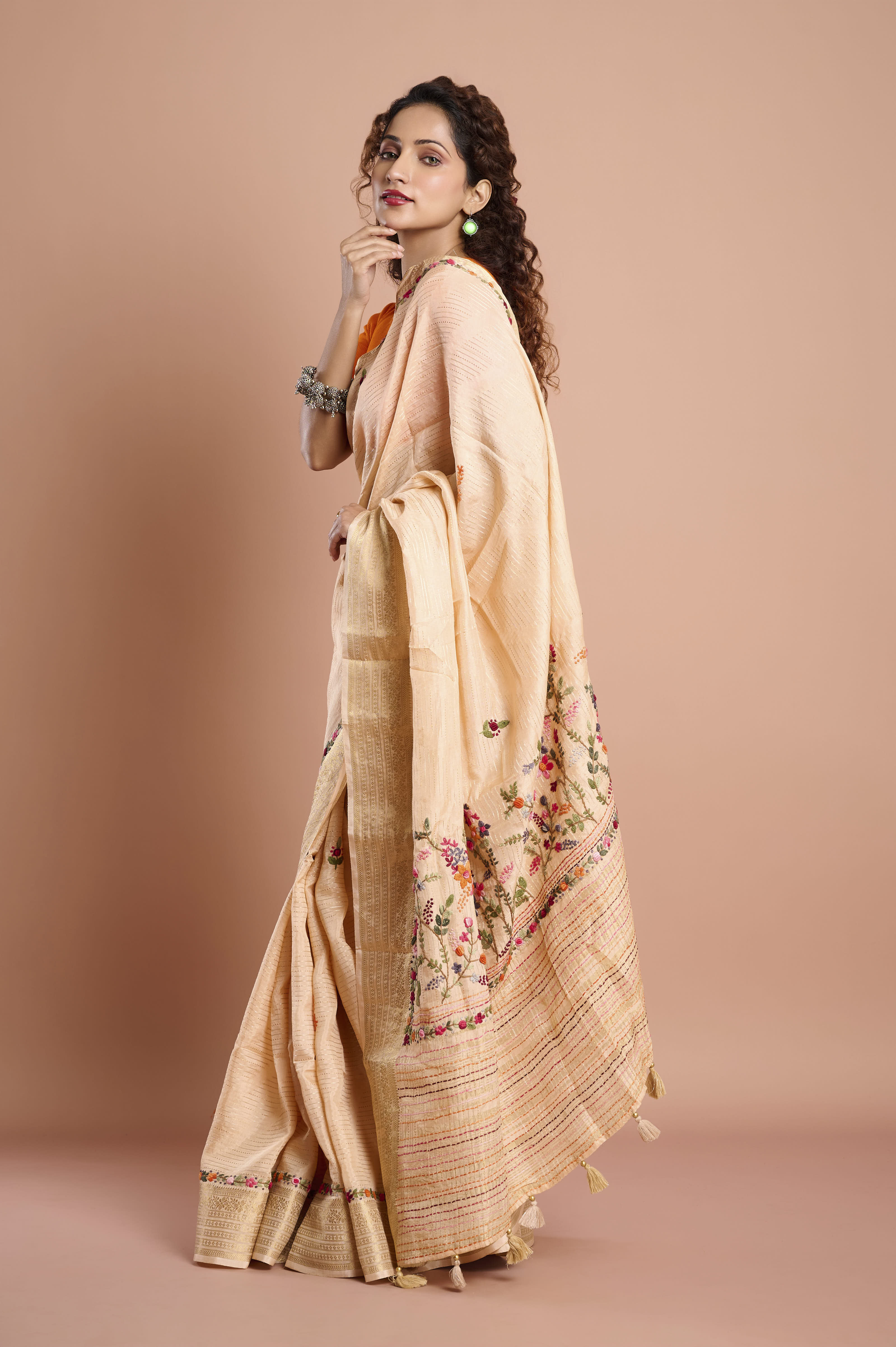 This elegant Dola silk saree features delicate hand embroidery in multi-hued floral motifs along its subtle peach base. The embroidery is refined, accenting the pallu and borders with intricate detailing that adds a touch of artisanal charm. The fabricÕs natural sheen and soft drape make it comfortable, graceful, and ideal for day occasions or festive gatherings. A matching blouse piece is included, allowing for personalized styling and cohesive looks.