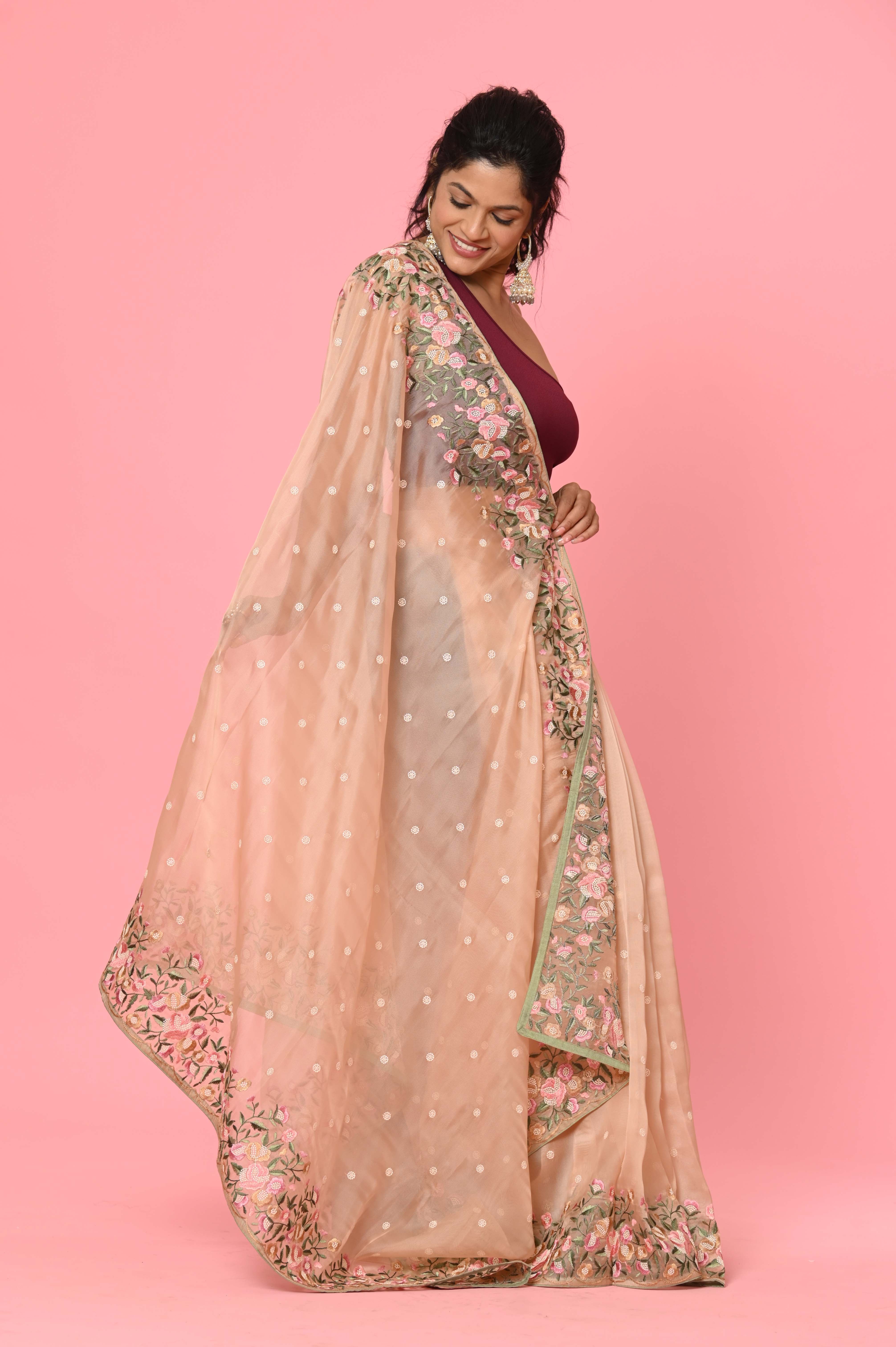 A tissue saree with embroidery is a sophisticated and elegant choice for traditional Indian attire. Tissue fabric is known for its lightweight and translucent quality, which gives it a beautiful sheen and drape. When combined with embroidery, it adds a touch of intricate and artistic design to the saree.