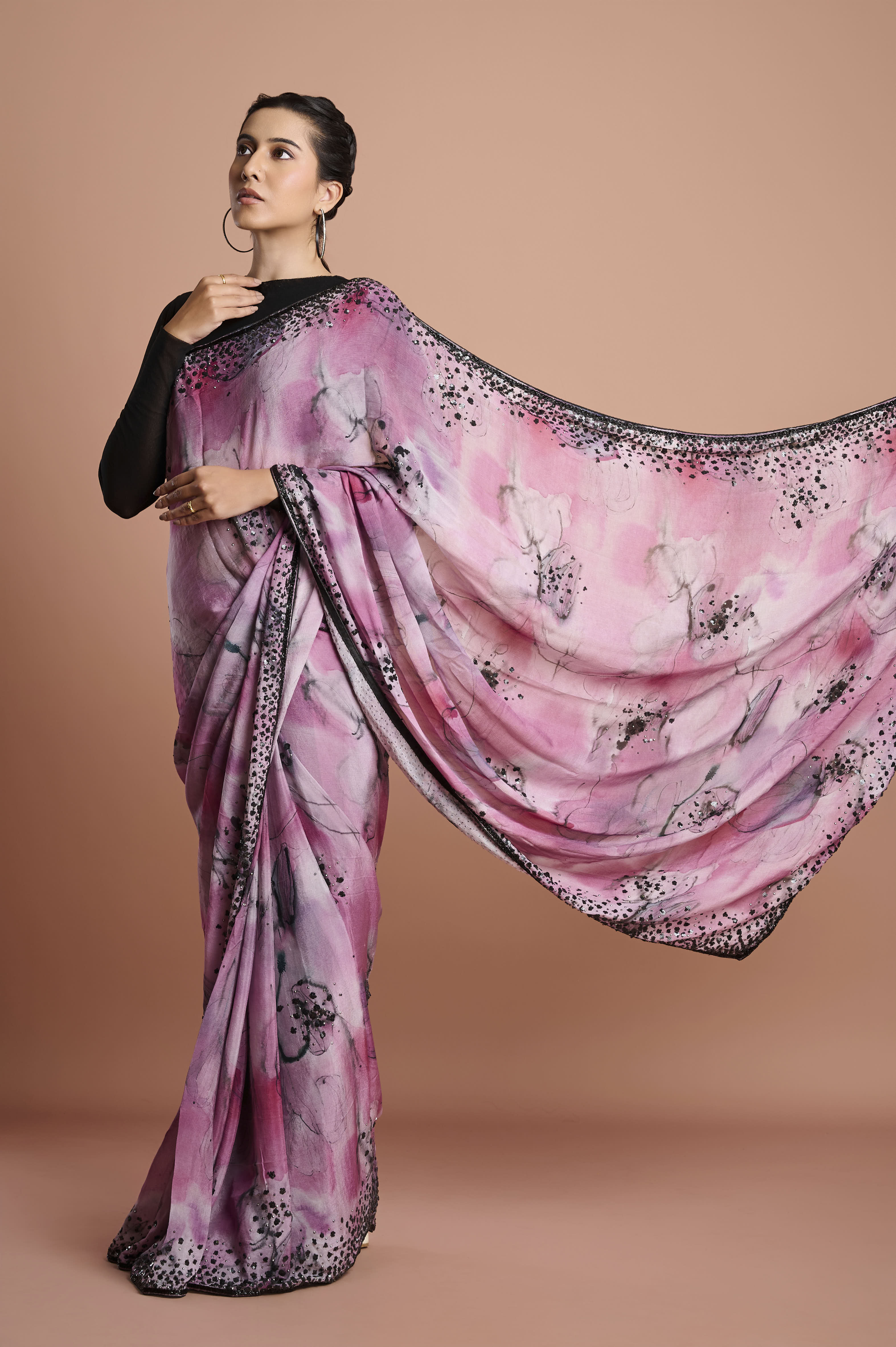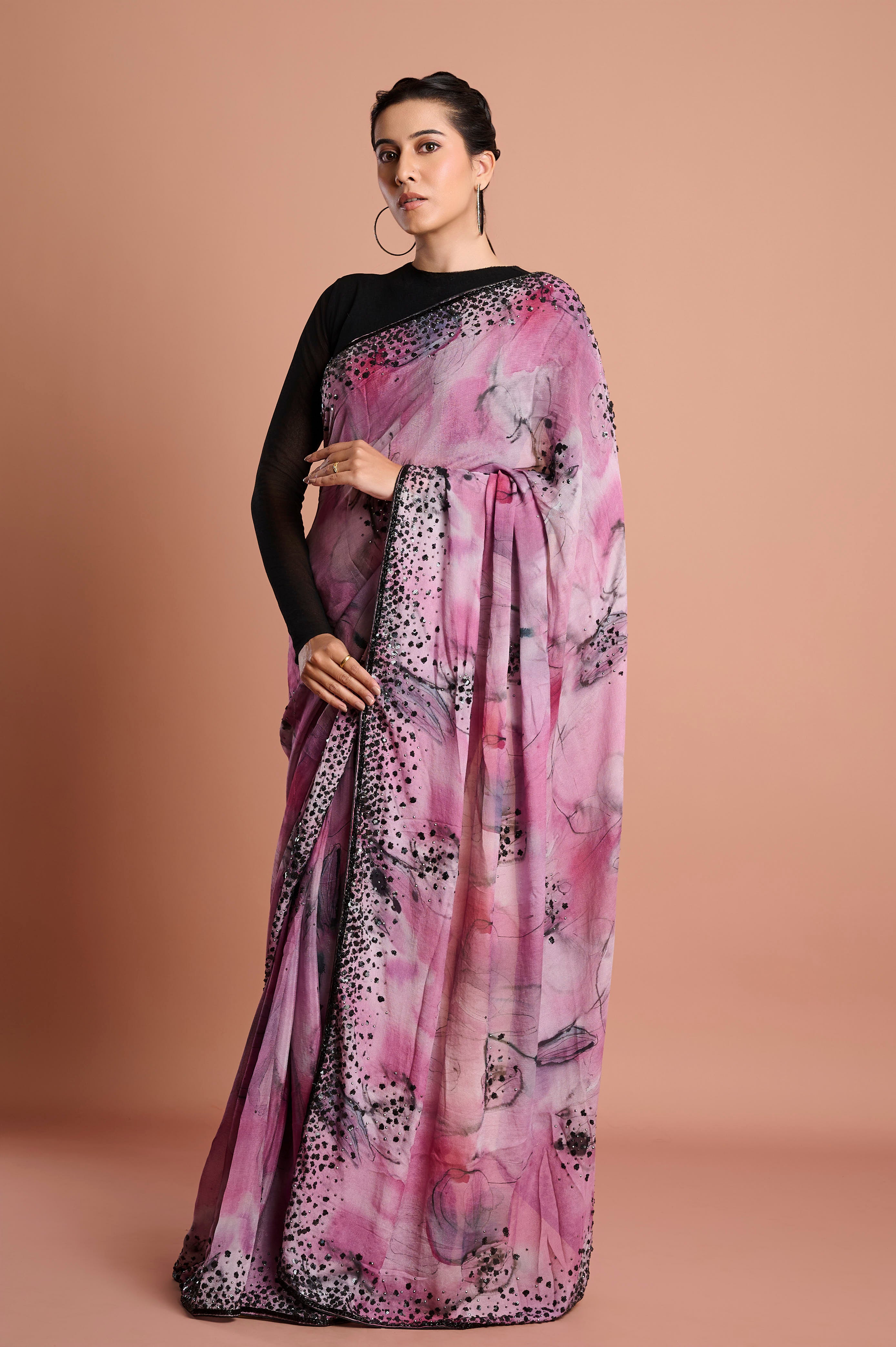 This artistic saree features a beautiful blend of soft pink and grey hues in an abstract watercolor design with elegant black sequin work scattered throughout the premium chinon fabric. The saree showcases fluid artistic patterns that create an elegant contemporary appeal, enhanced by the contrast of structured black sequined borders against the free-flowing abstract motifs. It is finished with sleek black piping that adds a modern touch to the traditional drape while maintaining the ethereal quality of the chinon material. The lightweight chinon fabric ensures graceful movement and comfortable wear, making it perfect for contemporary celebrations, art exhibitions, and modern festive occasions.