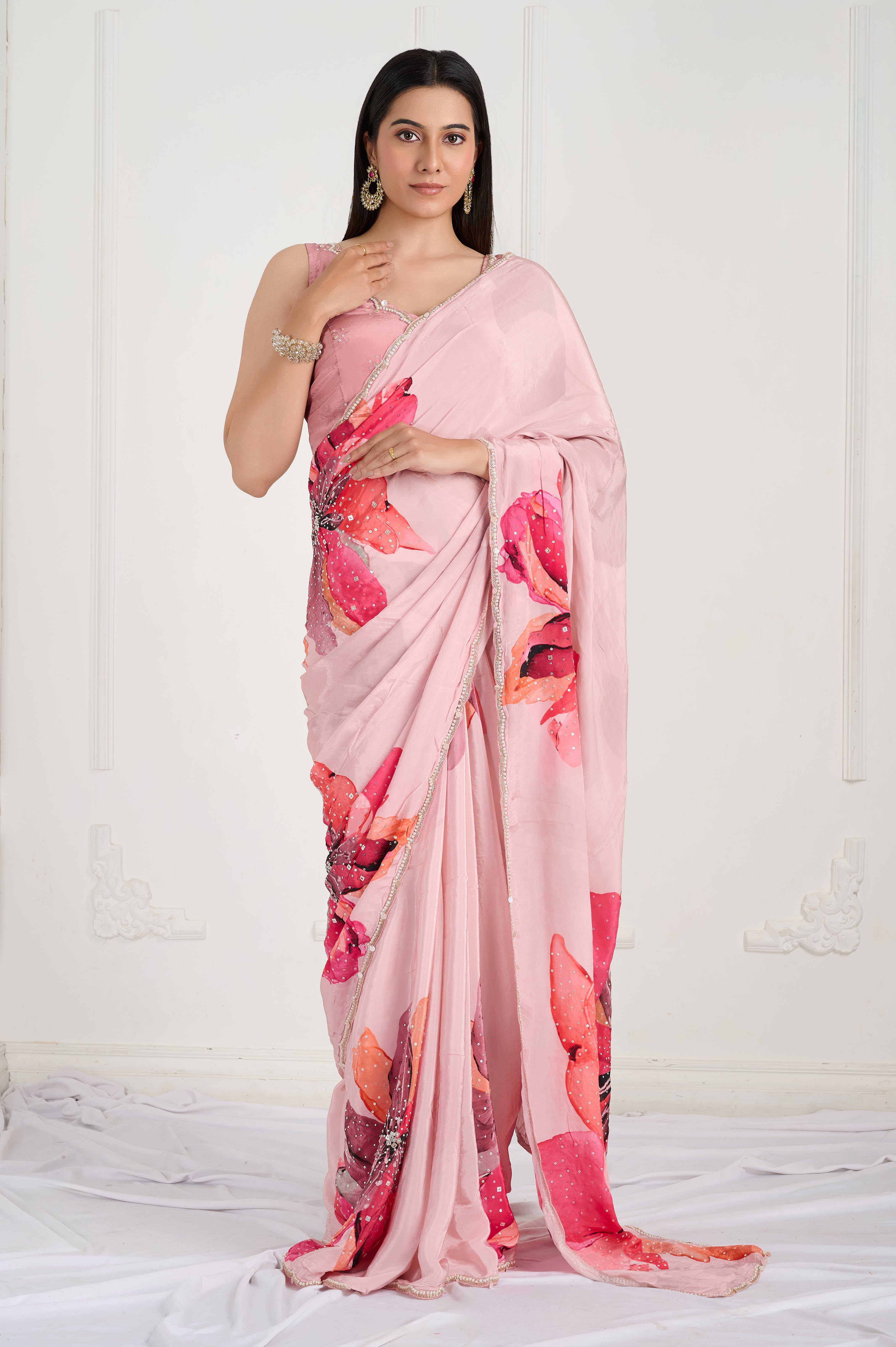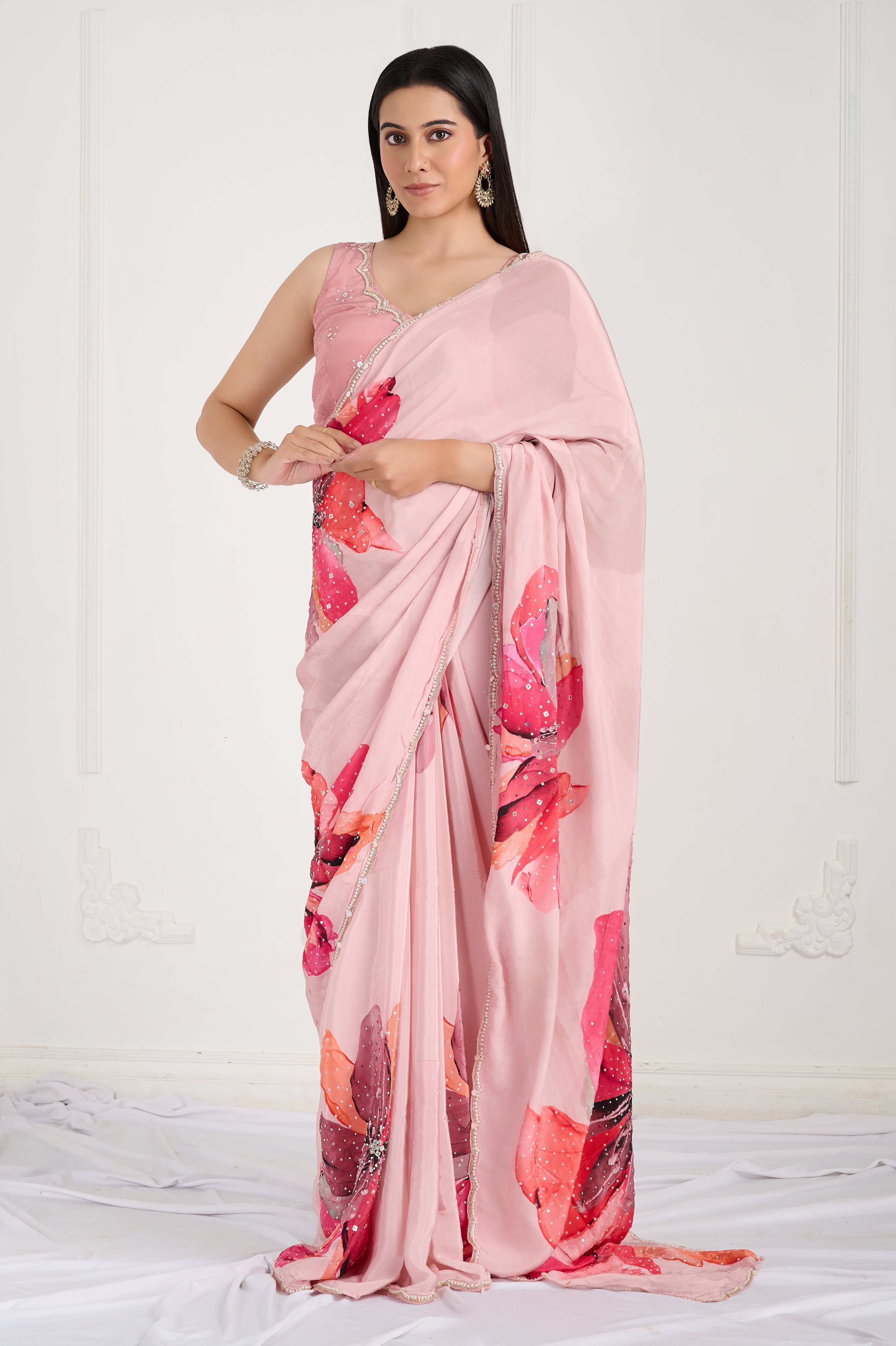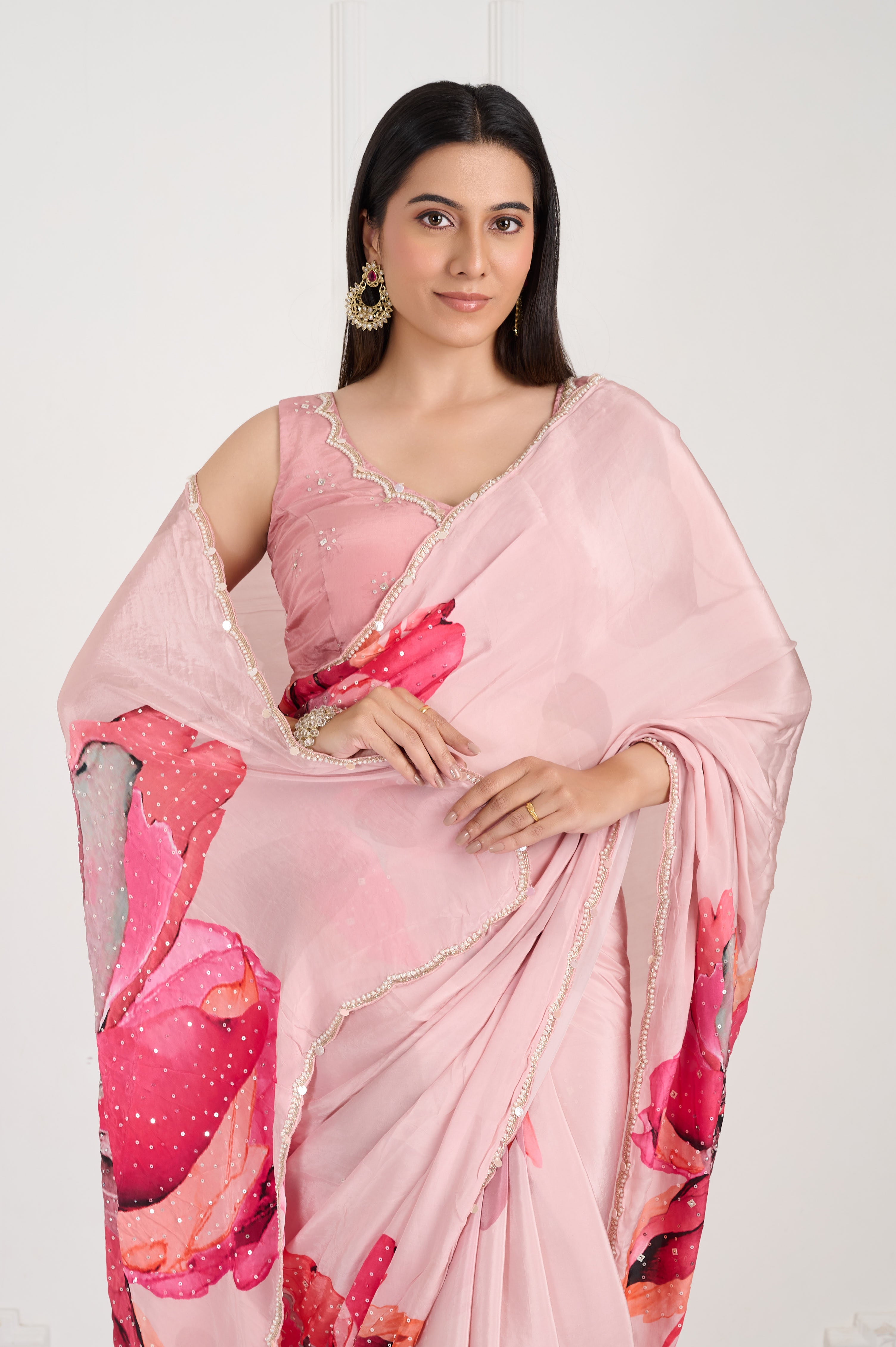 A feminine crepe saree in soft blush pink with oversized fuchsia coral petal placements and dotted highlights. Finished with a delicate pearl-scallop border for refined shimmer. Light-medium weight with a fluid fall and crisp pleats, ideal for daytime parties, sangeets, and cocktail evenings.