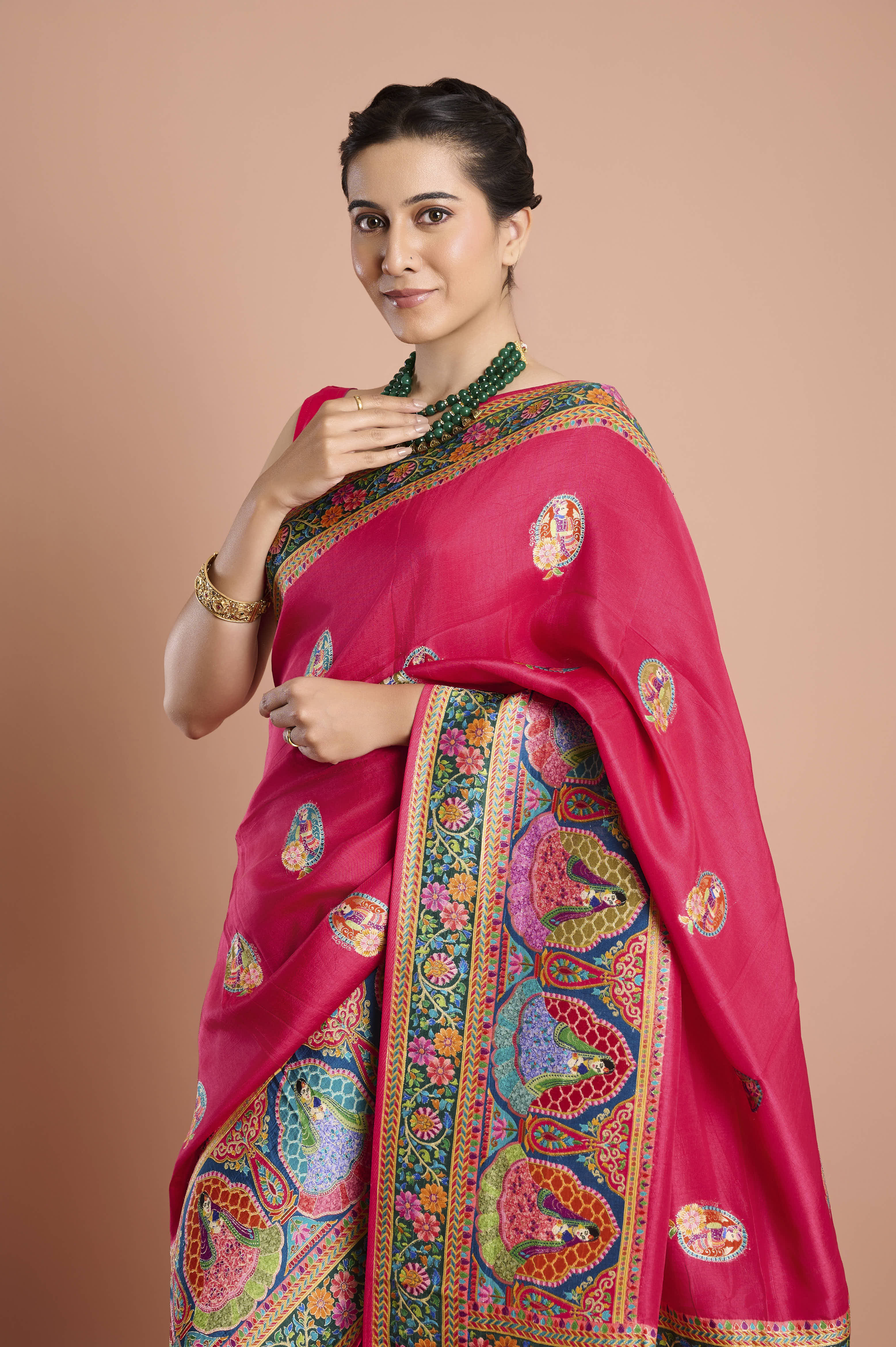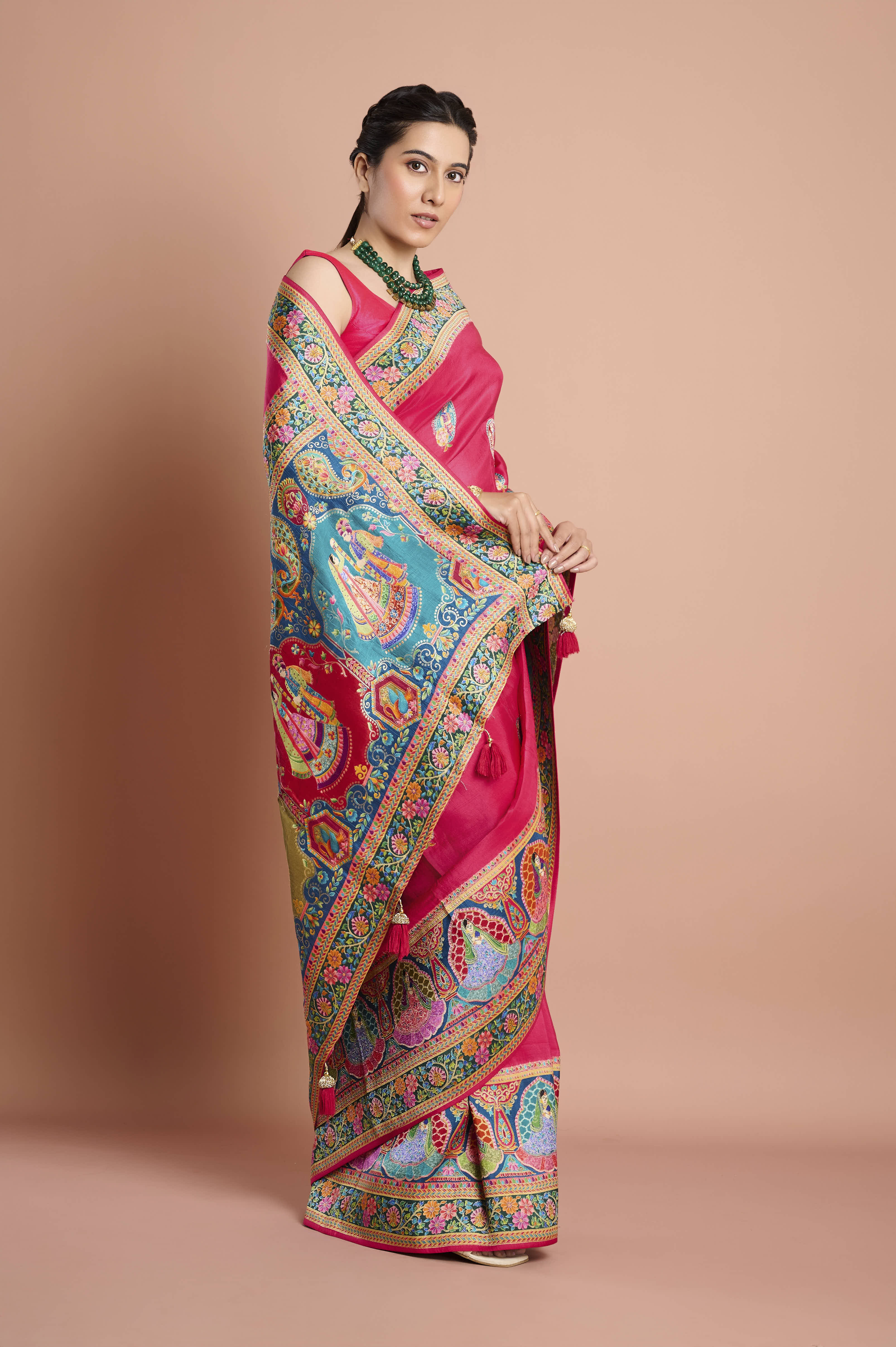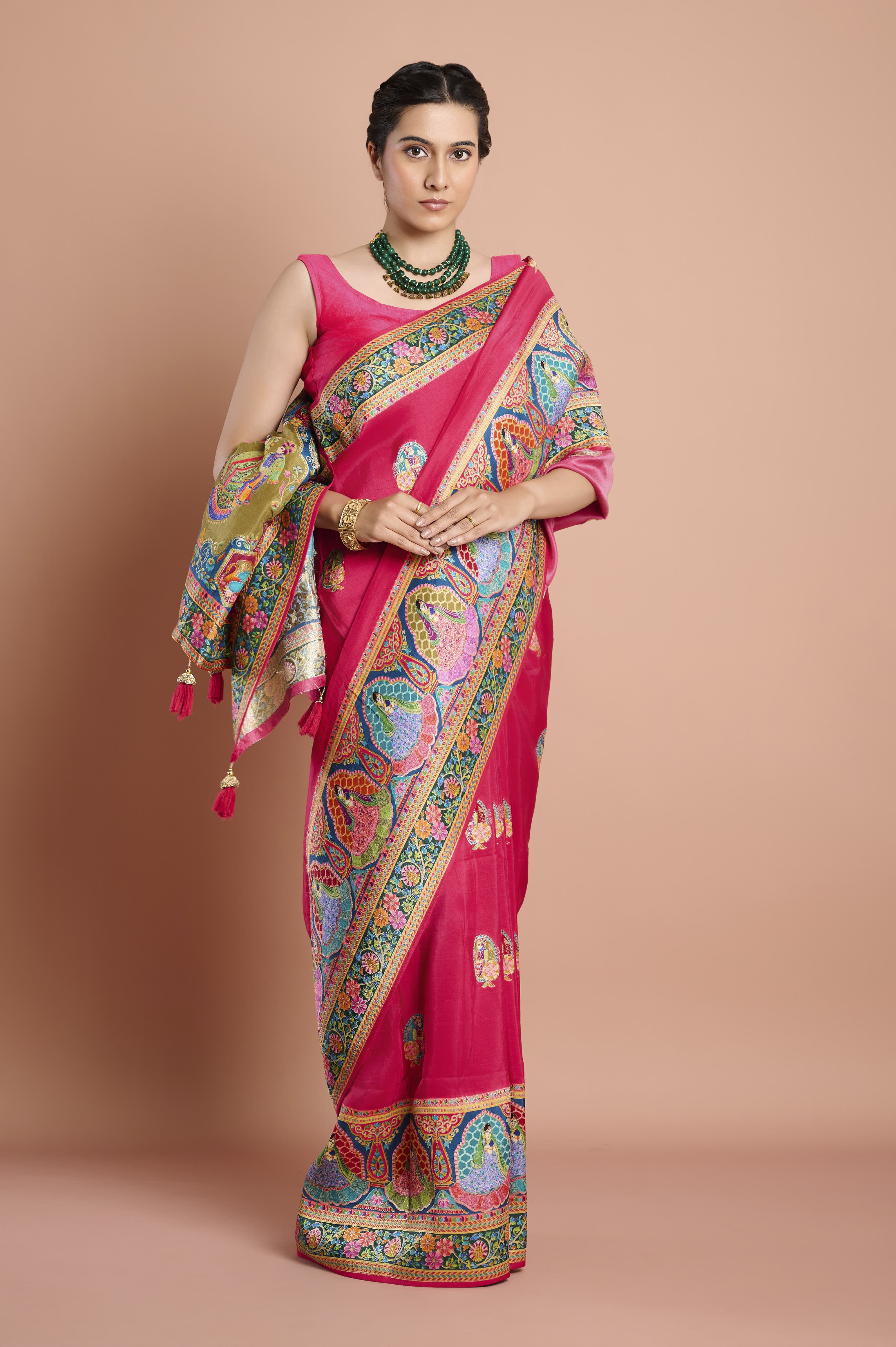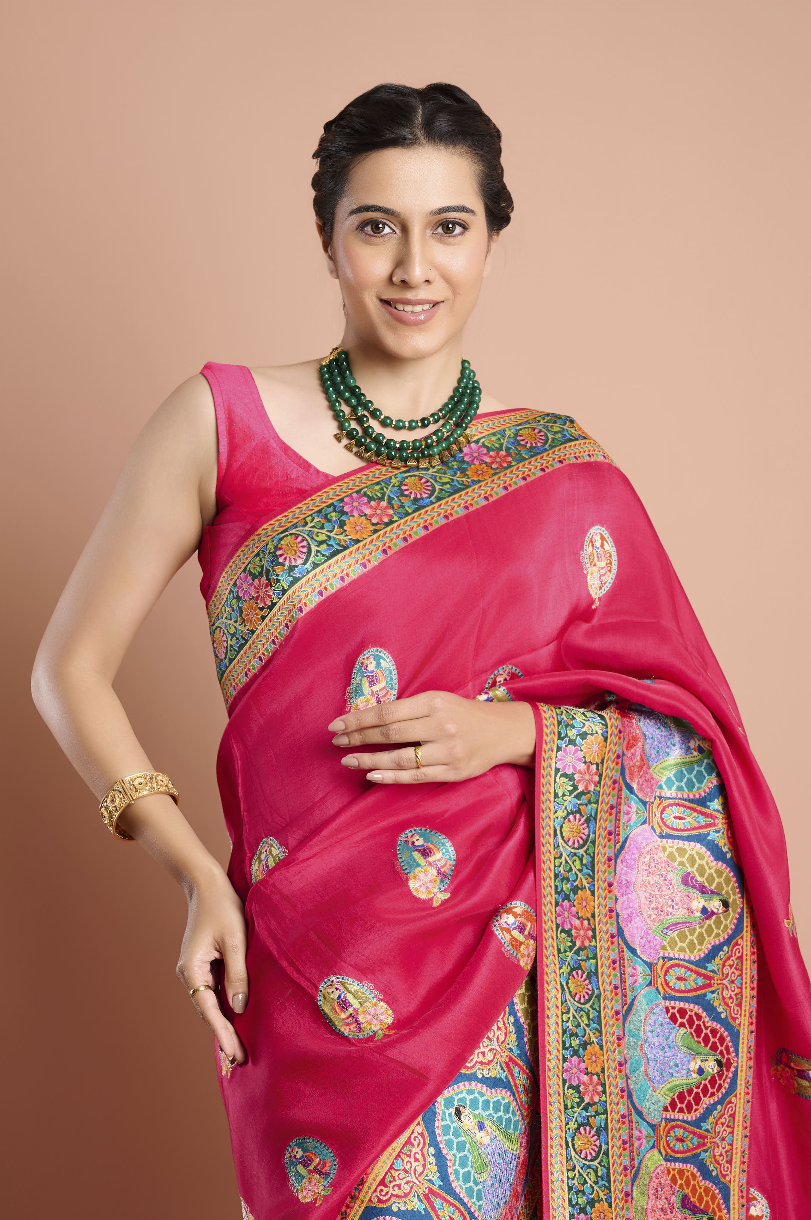 Make a dramatic entry with this vibrant pink Moonga silk saree, featuring striking multicolour Zari weaving, intricate traditional patterns, and beautifully woven figures along the broad border. The saree presents a colorful display of paisley and floral motifs in bright orange, green, turquoise, and gold, blending heritage craftsmanship with festive flair. Light-reflecting silk ensures every drape glows with sophistication, while woven medallion buttas add extra detail to the body. Perfect for weddings, receptions, or special celebrations, this saree commands attention.Â