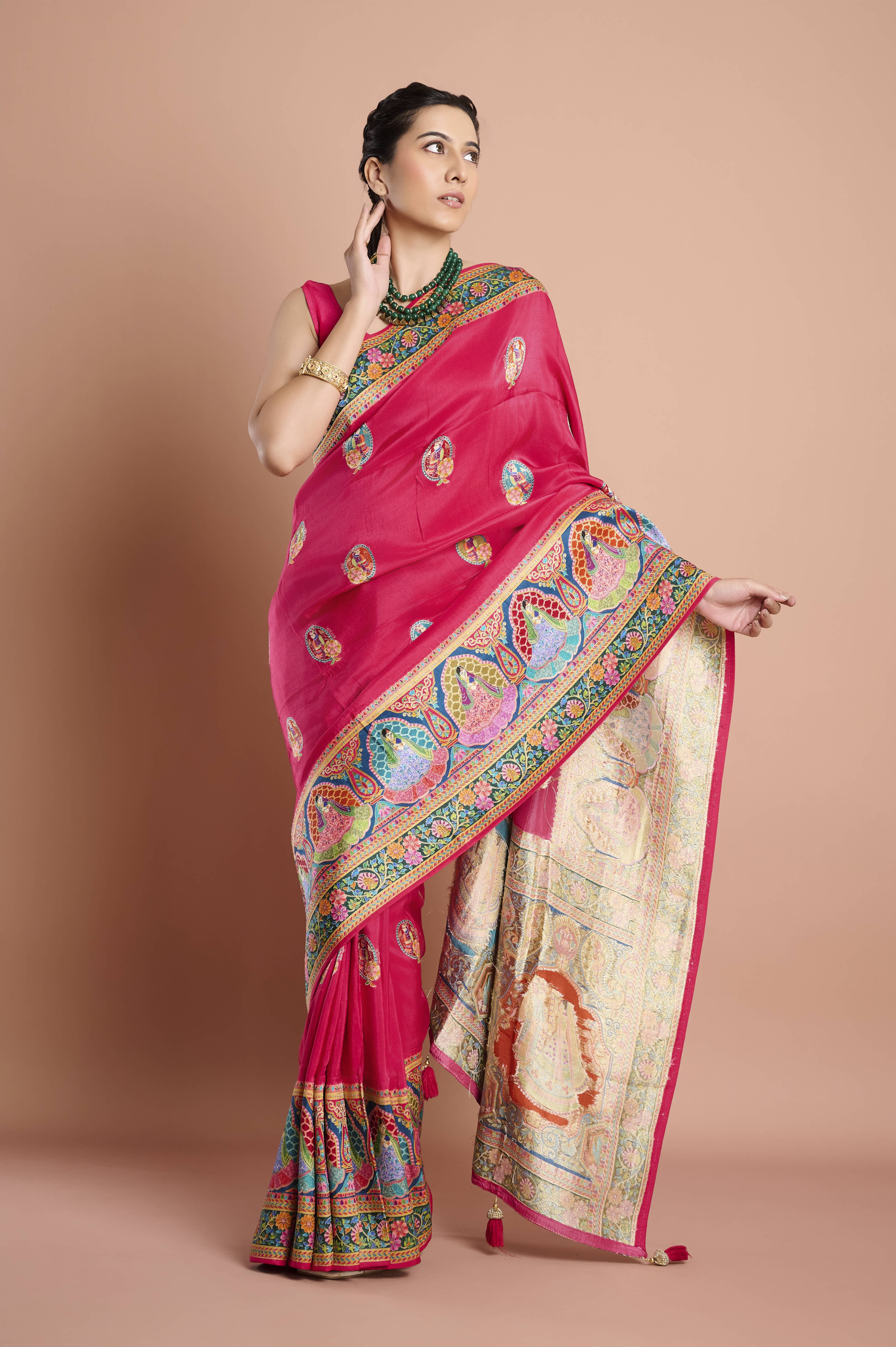 Jewellery: Layered emerald strings, polki necklaces, or antique gold jewellery to complement the color palette.