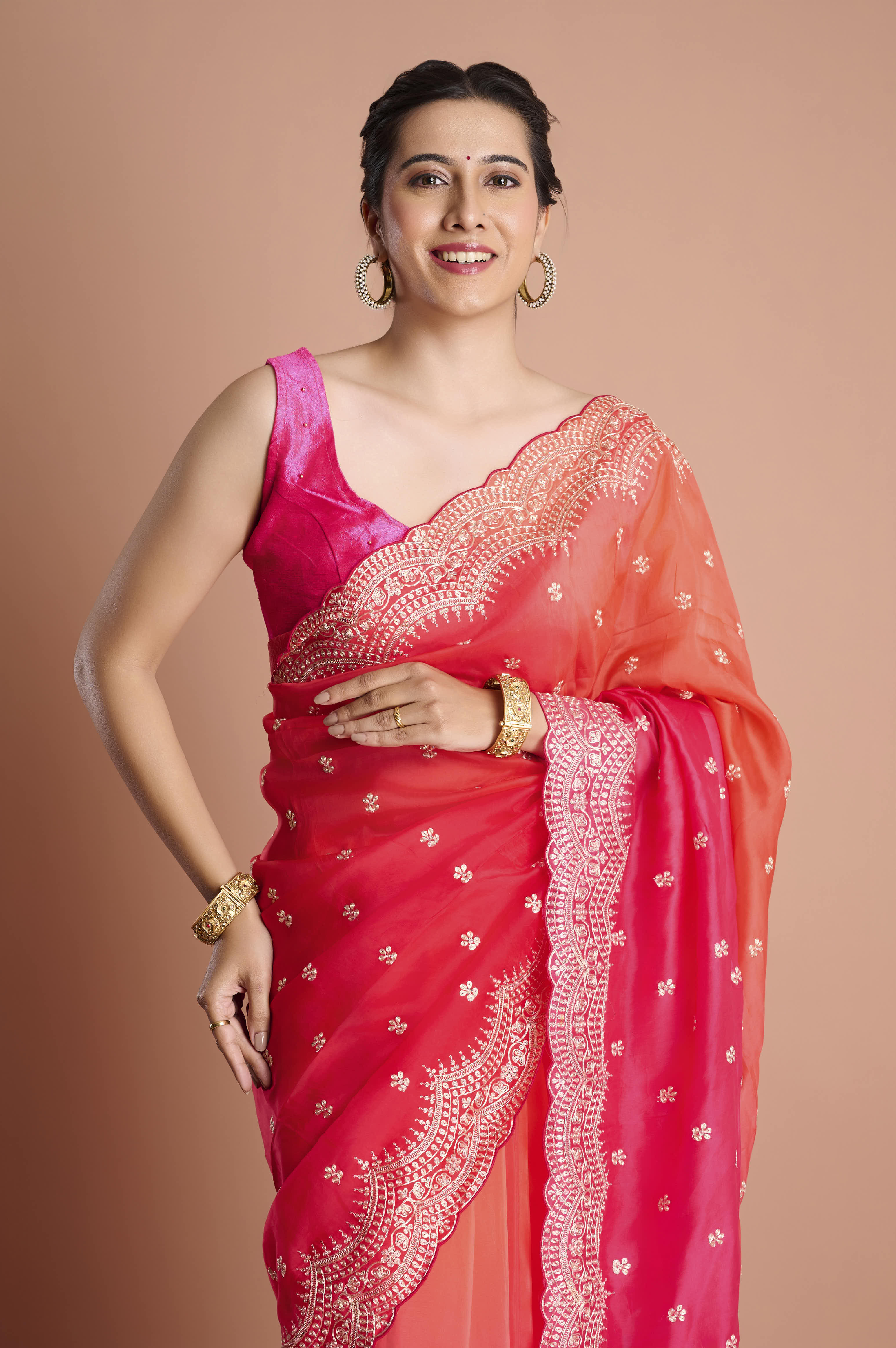 The saree is crafted from luxurious HO Silk, featuring an elegant peach and coral blend that exudes warmth and festive vibrancy. It is intricately adorned with traditional Peeta work, form of hand embroidery known for its detailed floral and vine motifs-enhanced with delicately applied beads and pearls. The scalloped border showcases the craftsmanship of Peeta embroidery, adding depth and opulence to the saree. The lightweight yet rich HO silk fabric drapes gracefully, making it ideal for weddings, receptions, and grand celebrations. This saree is offered with an unstitched blouse piece for personalized tailoring.