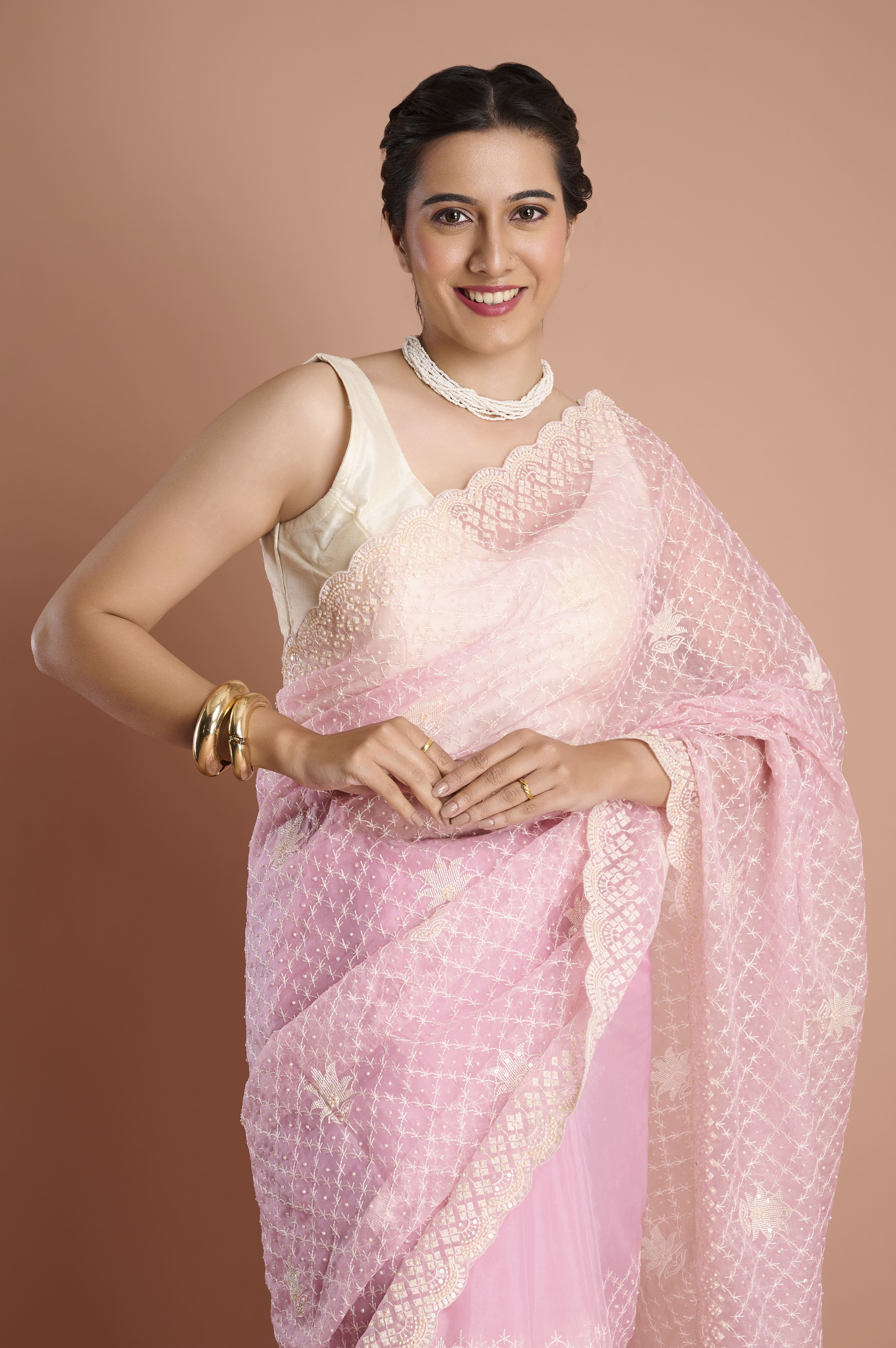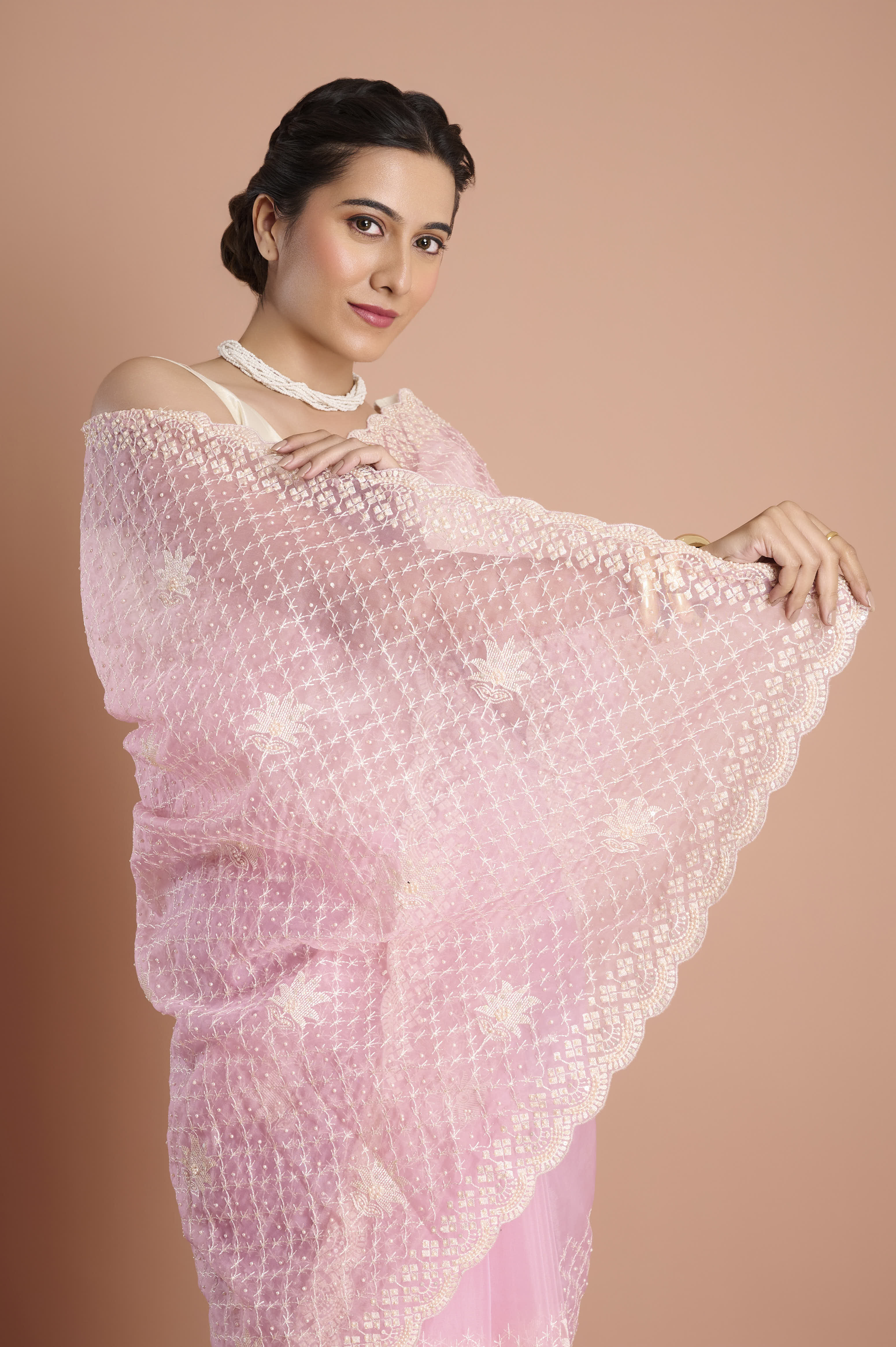 This beautiful pastel pink organza saree features an intricate diamond-pattern embroidery and moti work throughout, accentuated by delicate thread floral motifs that add a soft, feminine elegance. The scalloped embroidered border further enhances its ethereal feel and makes it ideal for festive gatherings or special occasions. The sheer, lightweight organza drapes gracefully to create a striking silhouette, while the soft touch keeps it comfortable for all-day wear. Includes a matching blouse piece for a bespoke finish.