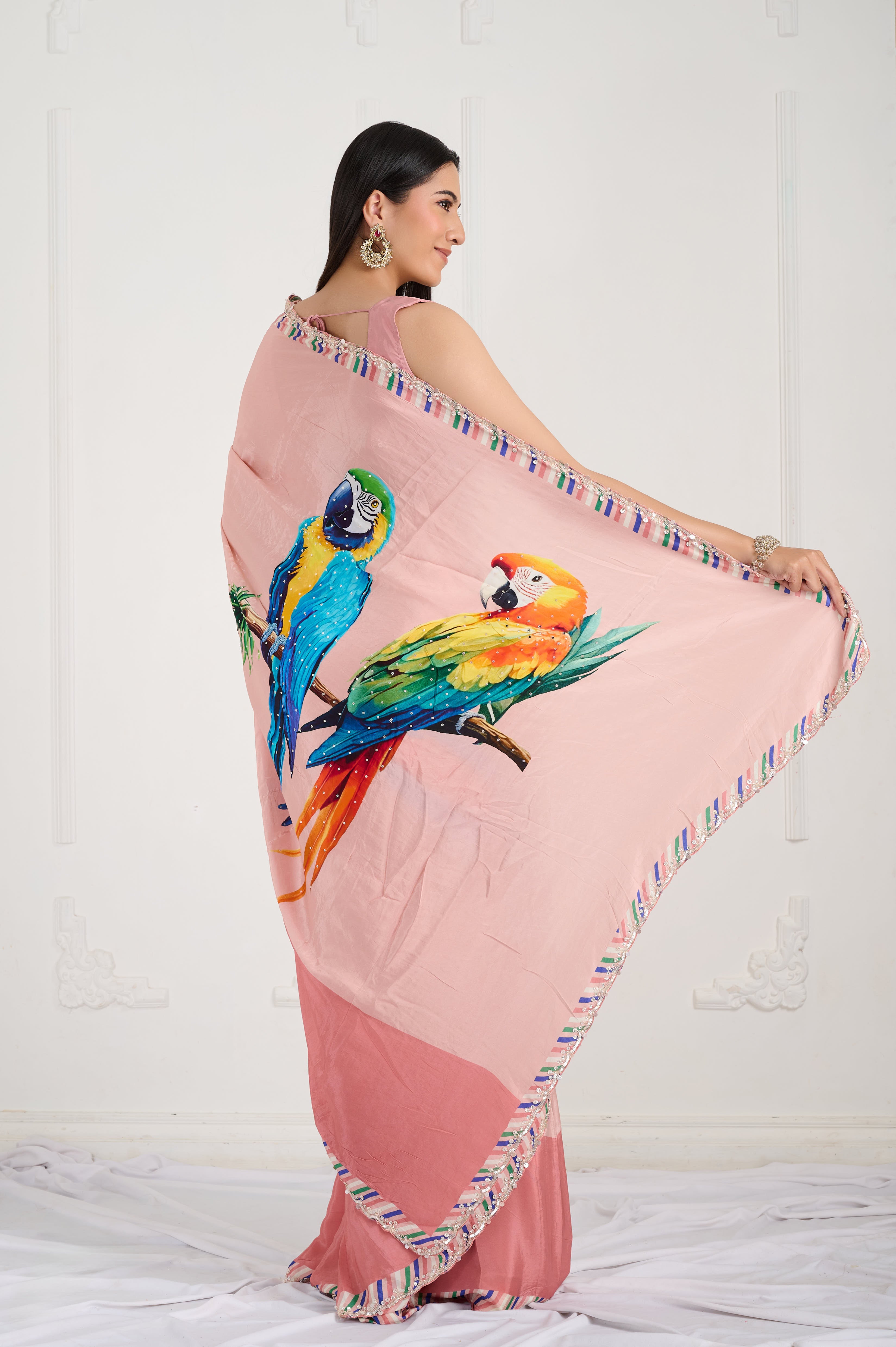 A playful crepe saree in soft blush pink featuring a bold macaw (parrot) placement digital print in cobalt, teal and sunset orange. Finished with a multicolour striped patti border and light hand highlights near the motif. Soft, fluid fall with crisp pleats, perfect for brunches, mehendi and sundowner soirees.