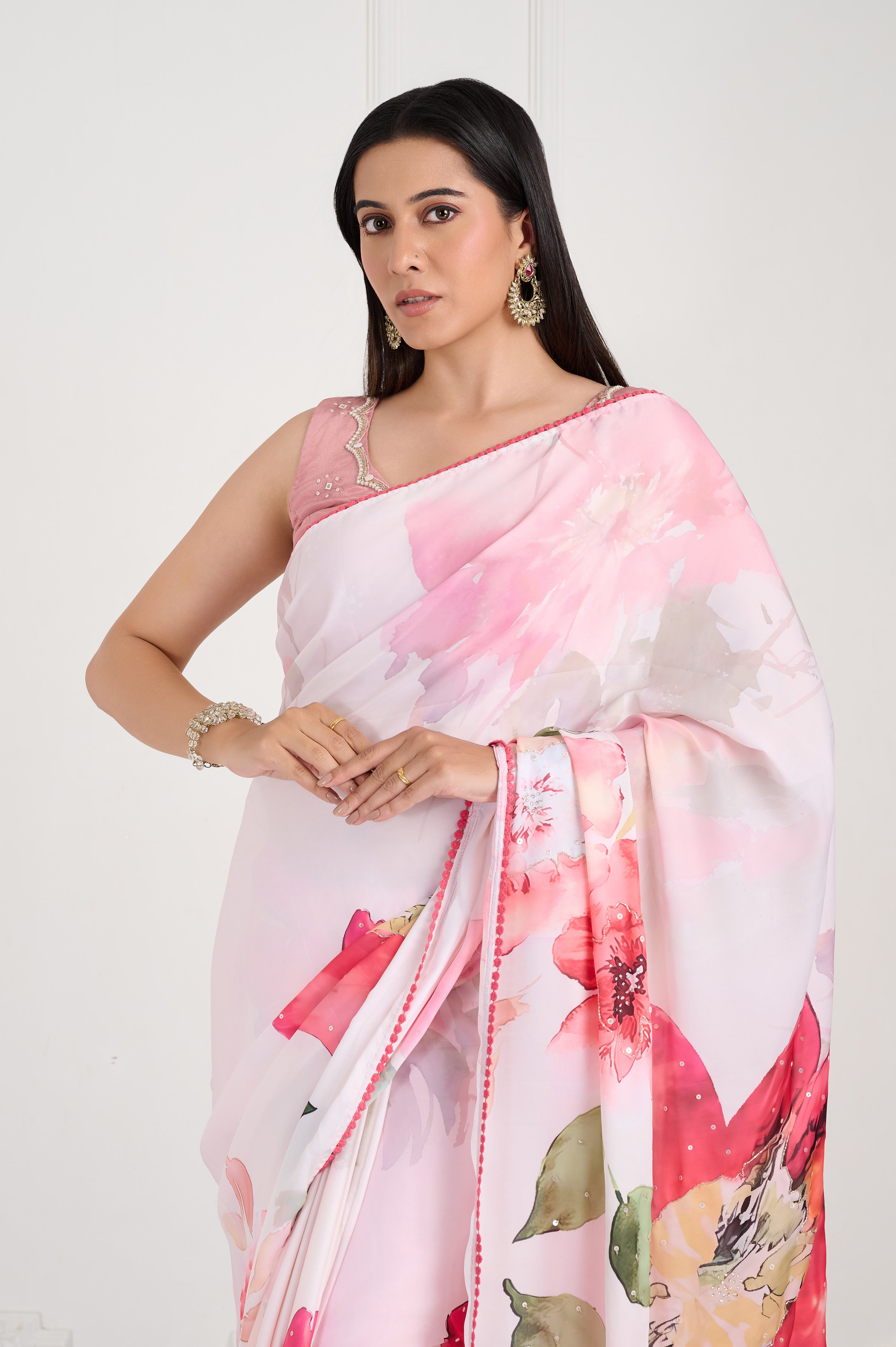 A dreamy crepe satin saree in whisper blush-pink with a watercolour floral digital print in rose, coral and soft green. Trimmed with playful micro pom-pom piping and subtle dotted hand highlights. Cool hand-feel, graceful sheen and a fluid drape that pleats beautifully, ideal for daytime parties, sangeets and cocktail evenings.
