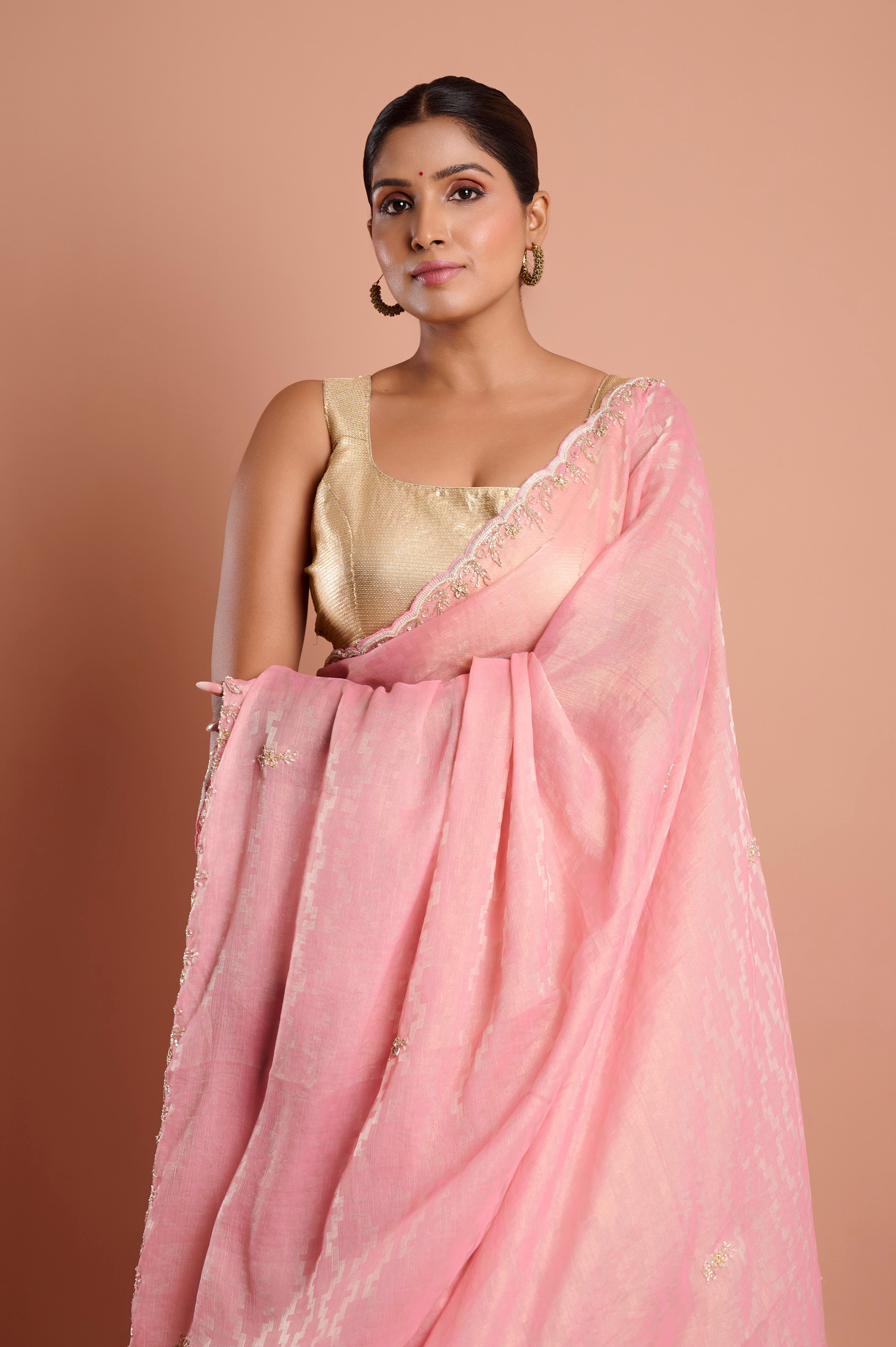 Experience graceful luxury in this blush pink satin tissue jacquard saree, featuring an enchanting blend of lustrous satin shine and delicate tissue transparency. The body is adorned with subtle jacquard woven patterns and dainty zari-embroidered motifs, while the edge is finished with a scalloped border accented by soft thread and sequin detailing. The featherlight drape, paired with a gentle shimmer, makes this saree perfect for festive celebrations, day parties, and evening gatherings. A matching unstitched blouse piece is included for personalized styling.