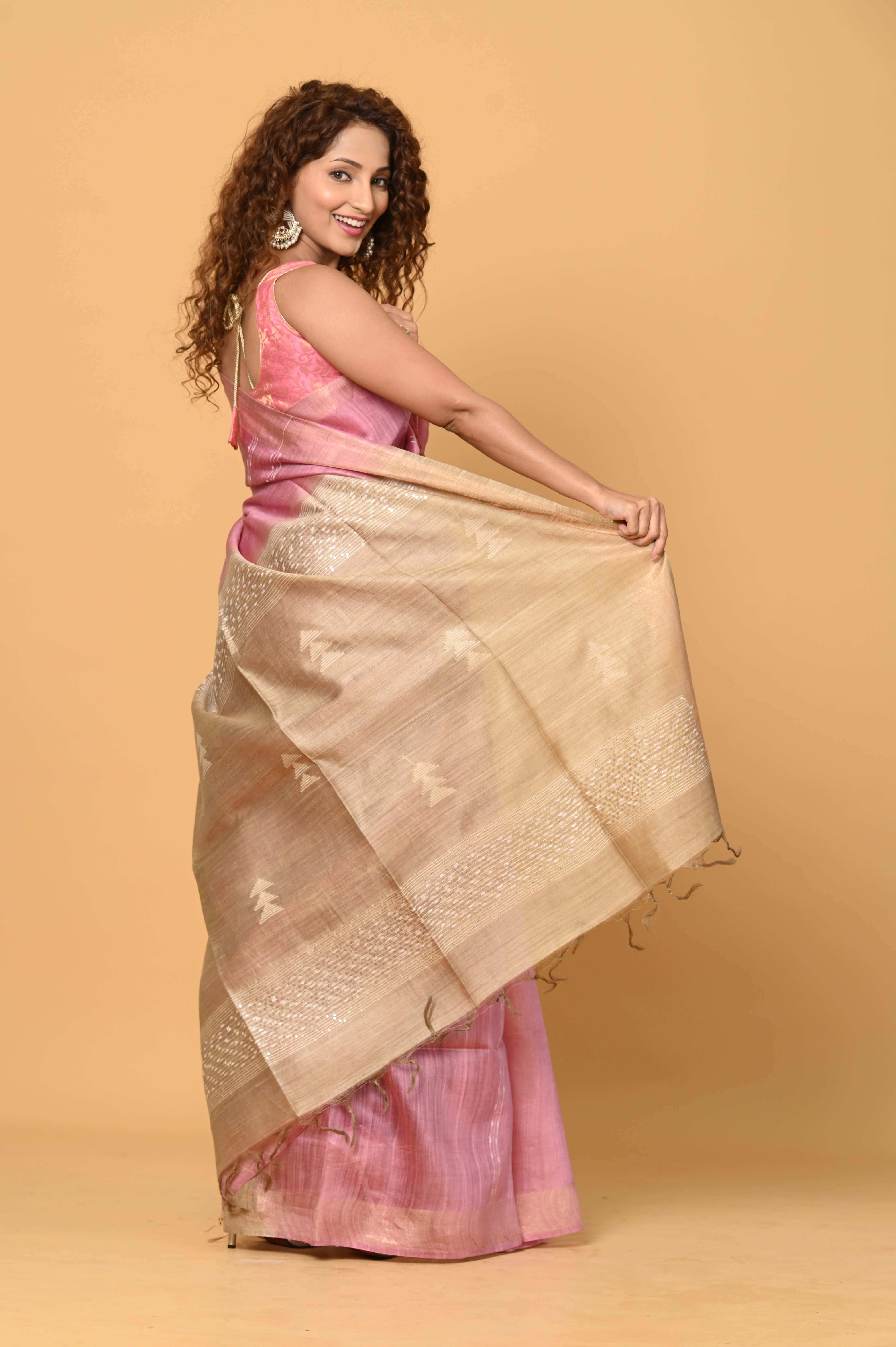 A pure tussar saree with sequins work combines the elegance of tussar silk with the glimmer and sparkle of sequins. The sequins can be hand-stitched onto the saree in various designs, which might include floral patterns, geometric shapes, or other motifs.
