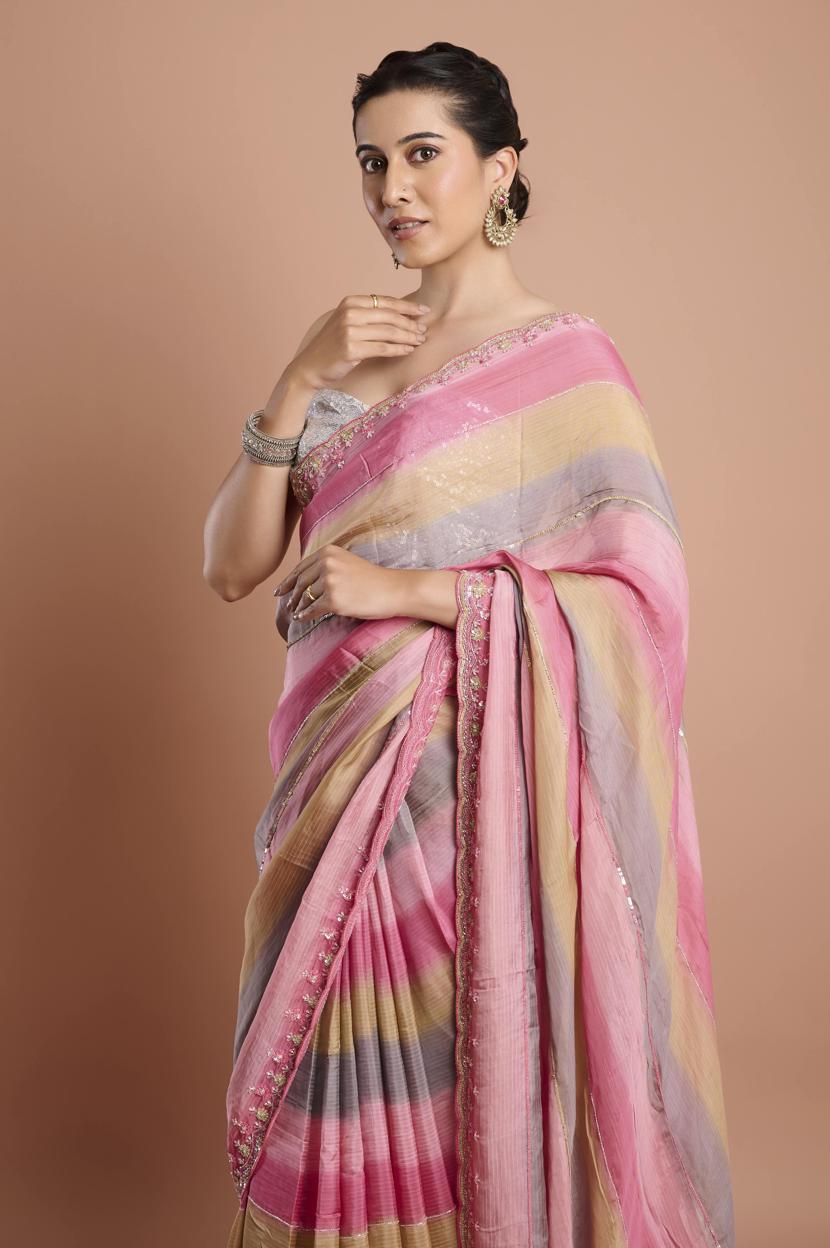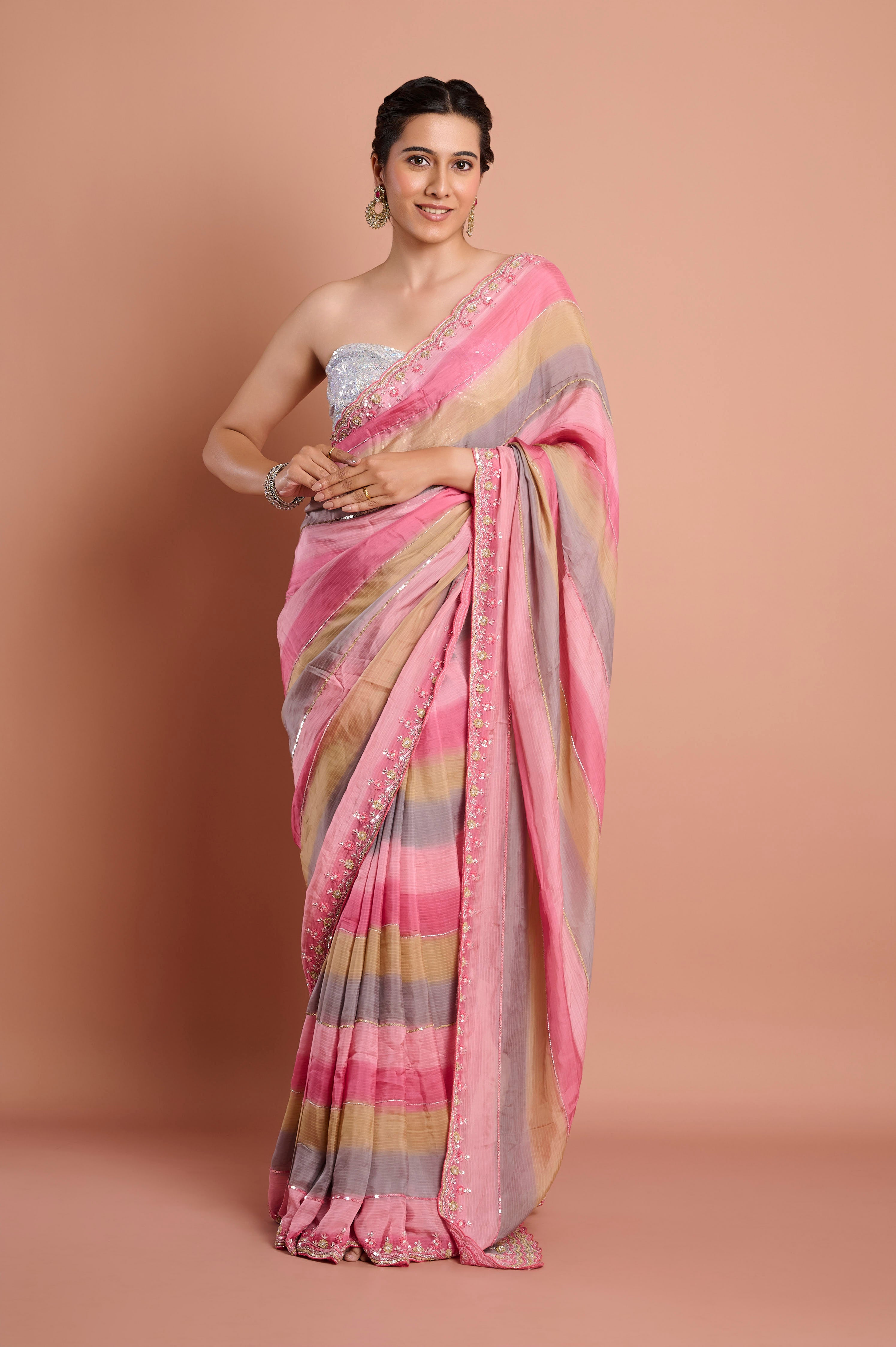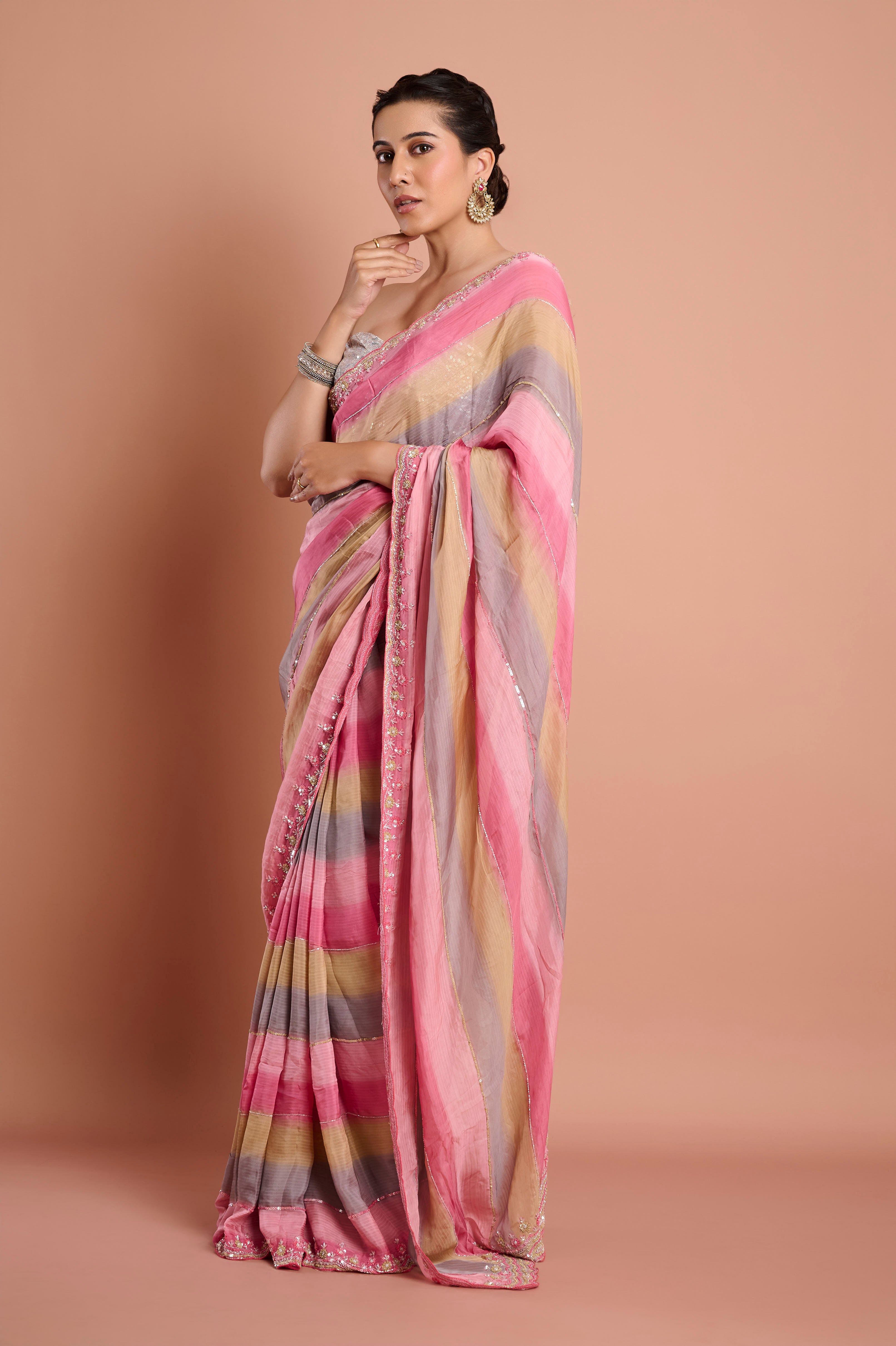 Celebrate color and fluidity with this soft organza saree, showcasing shadow-striped bands of blush pink, soft taupe, and silvery grey for a soothing ombrŽ effect. The breezy organza material delivers contemporary grace and crisp structure, while the borderÕs delicate sequin and floral beadwork add just a hint of sparkle. The featherlight drape makes this saree ideal for summer soirees, festive brunches, or elegant evening events. Each saree comes with an unstitched blouse piece, allowing for customized styling.