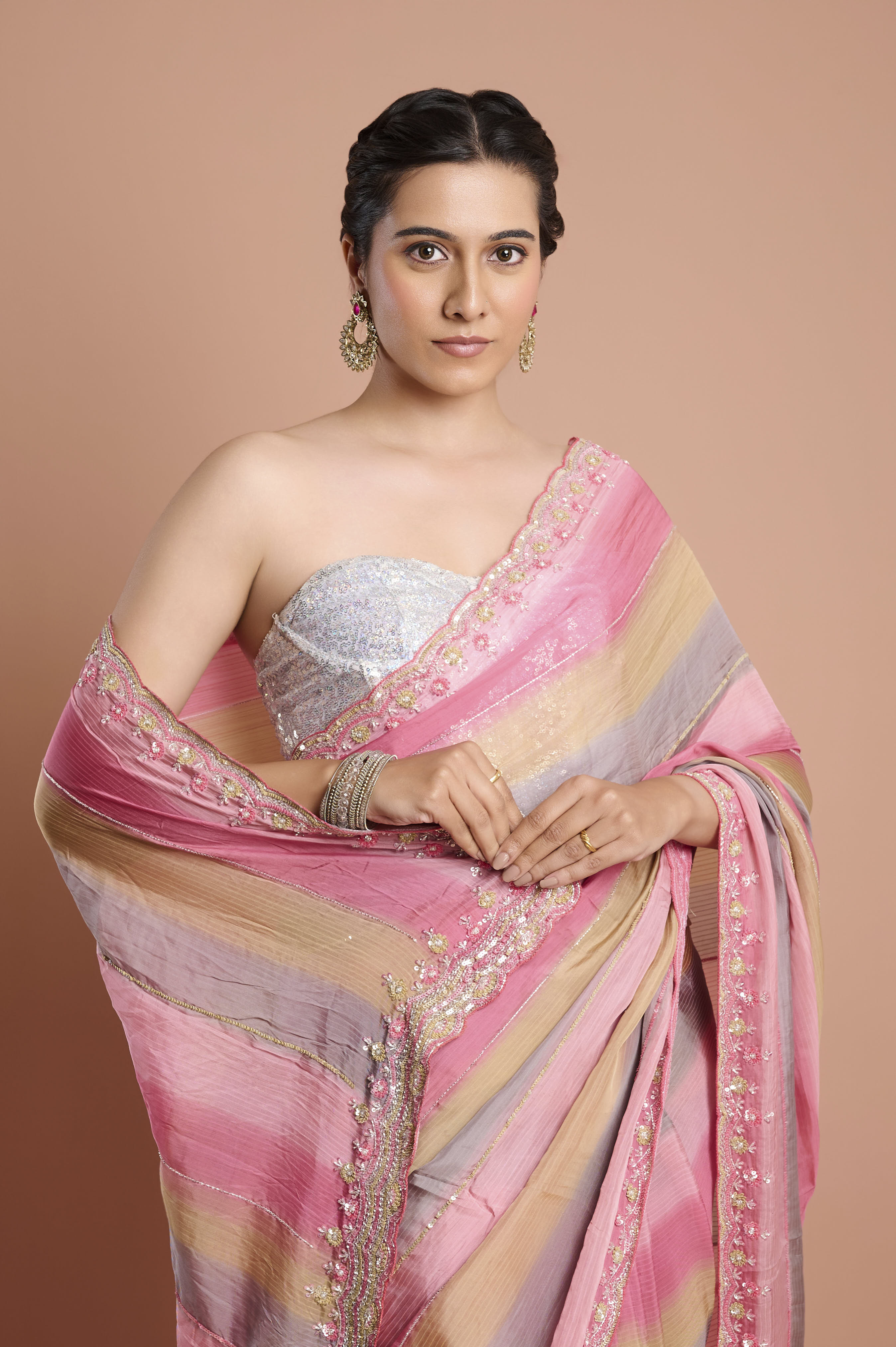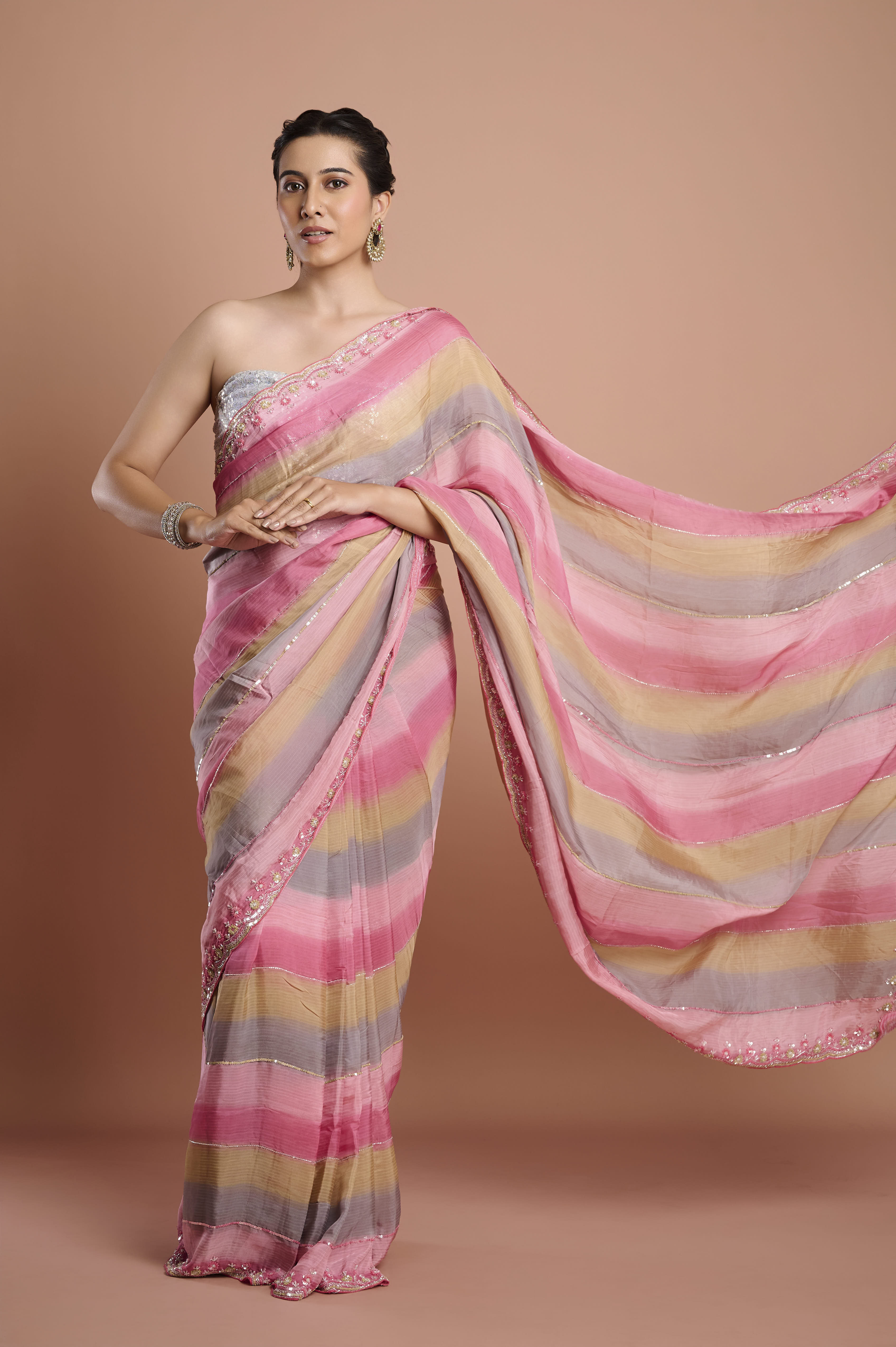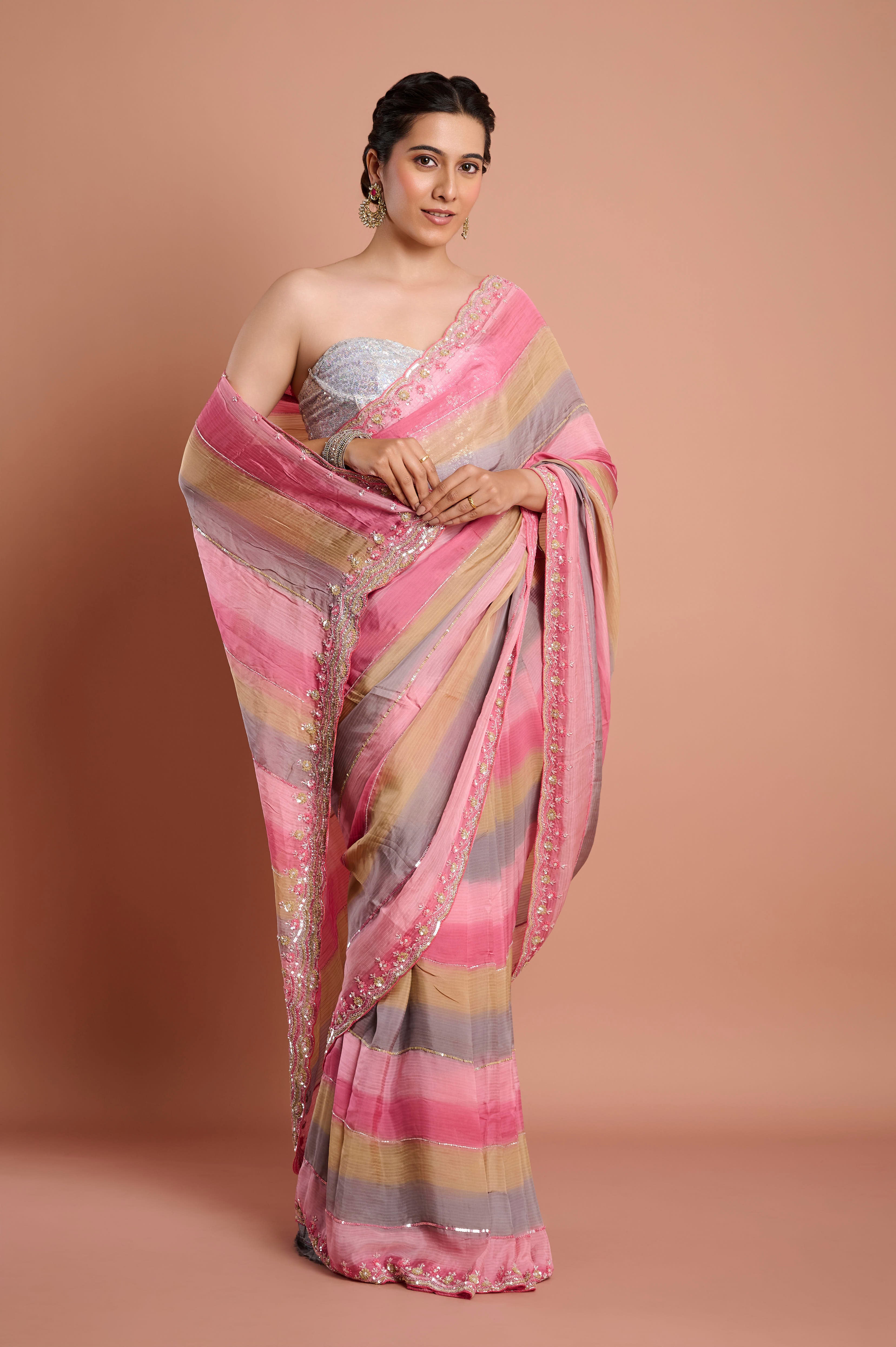 Celebrate color and fluidity with this soft organza saree, showcasing shadow-striped bands of blush pink, soft taupe, and silvery grey for a soothing ombrŽ effect. The breezy organza material delivers contemporary grace and crisp structure, while the borderÕs delicate sequin and floral beadwork add just a hint of sparkle. The featherlight drape makes this saree ideal for summer soirees, festive brunches, or elegant evening events. Each saree comes with an unstitched blouse piece, allowing for customized styling.