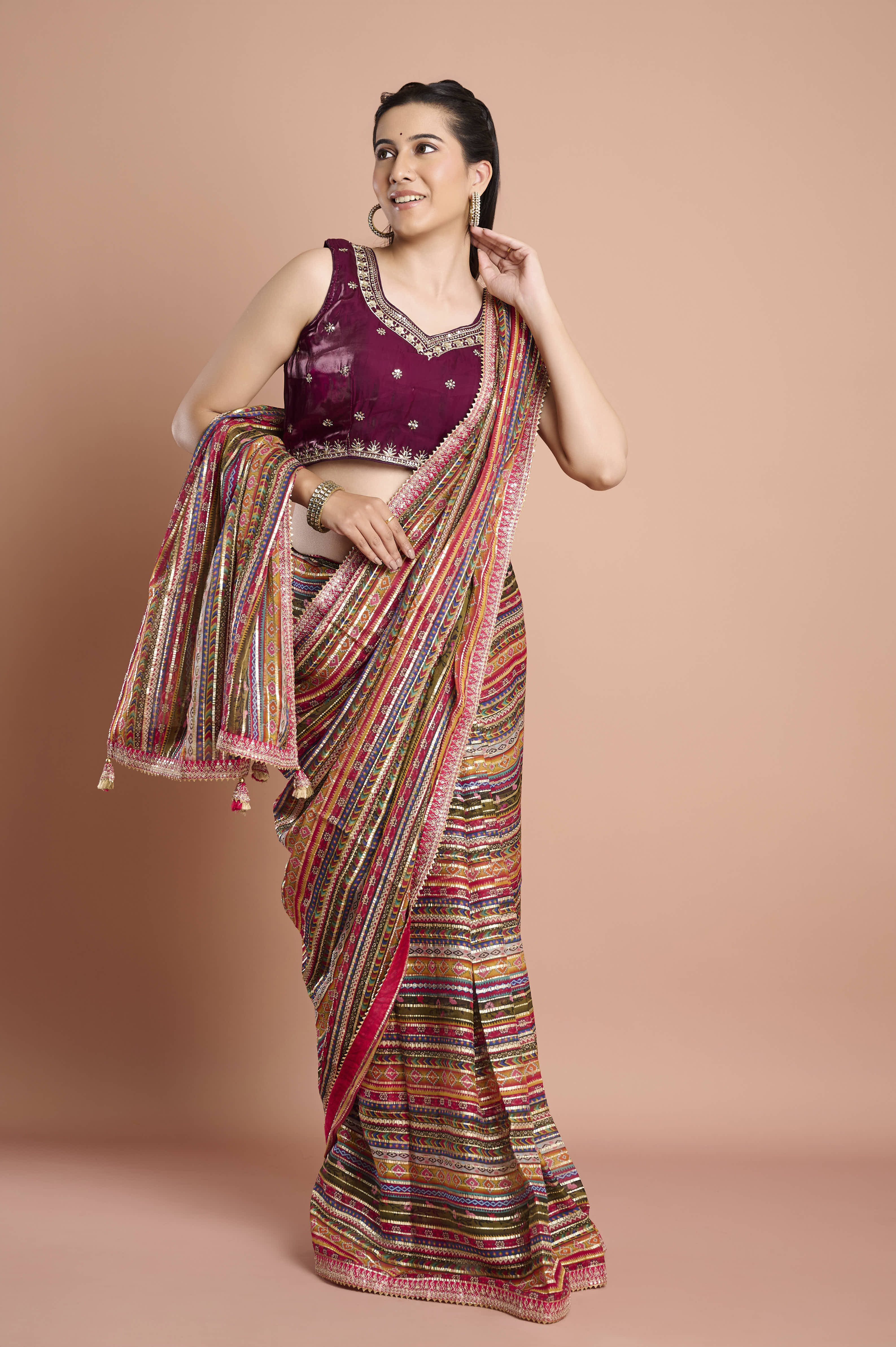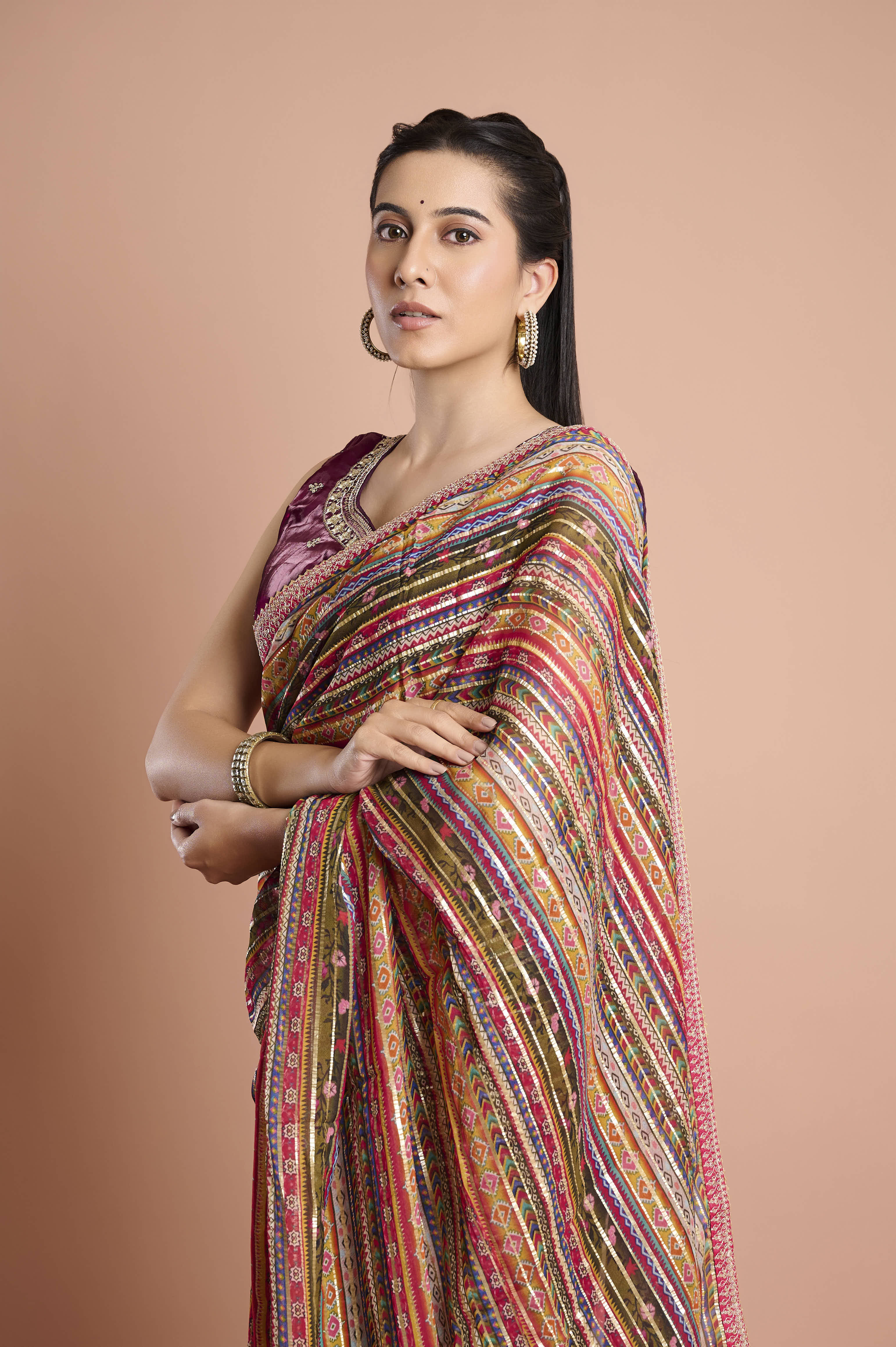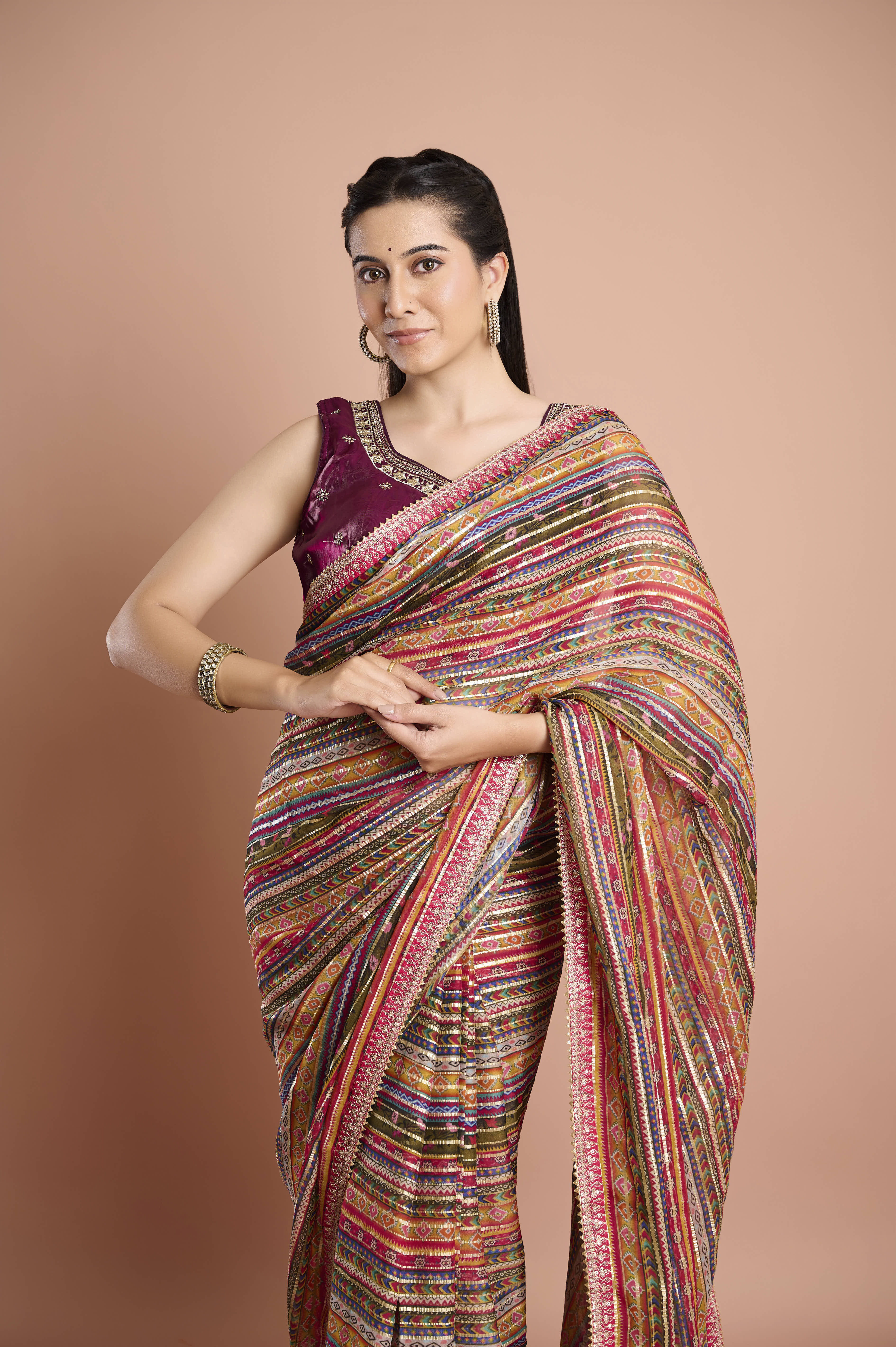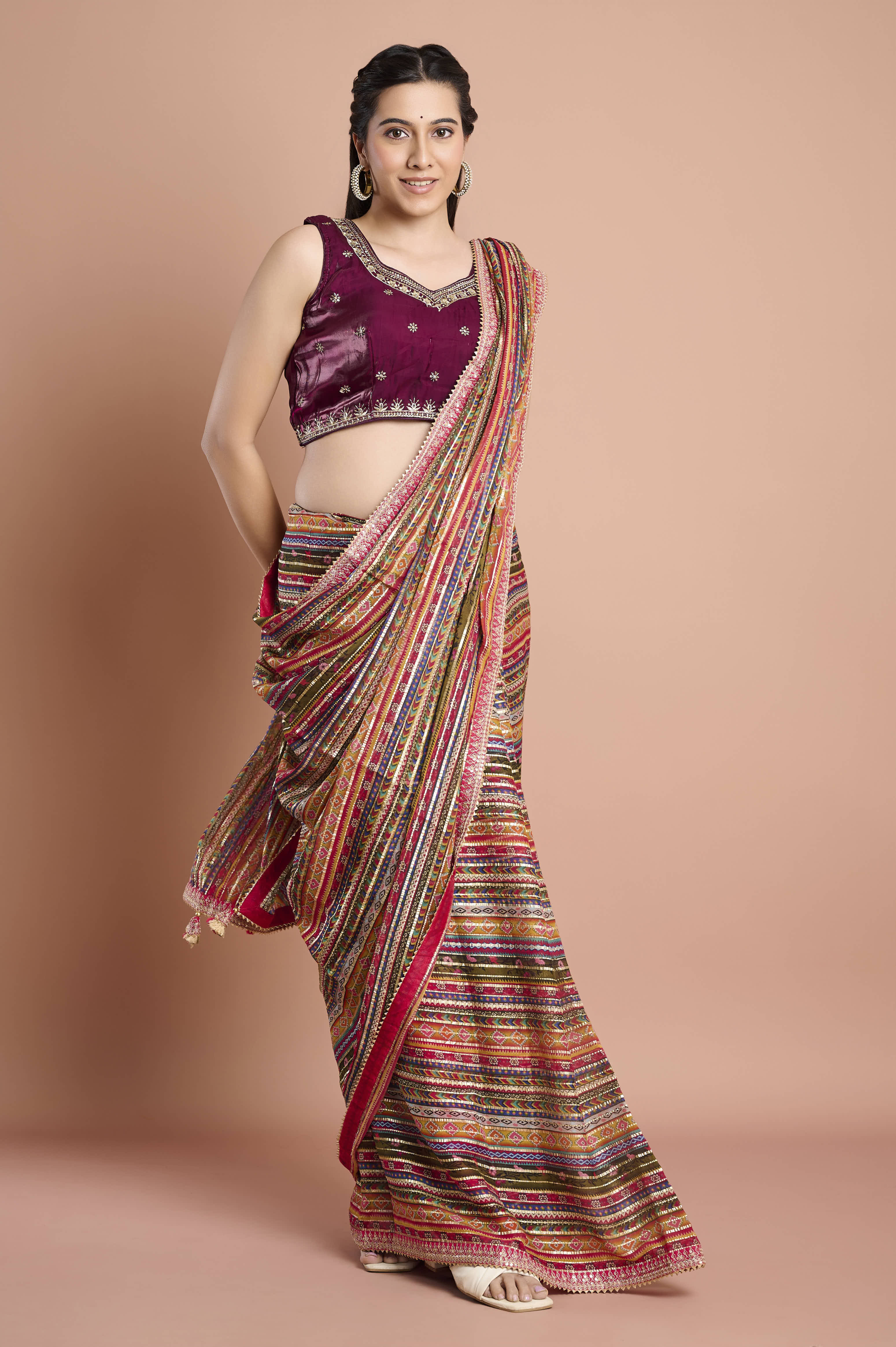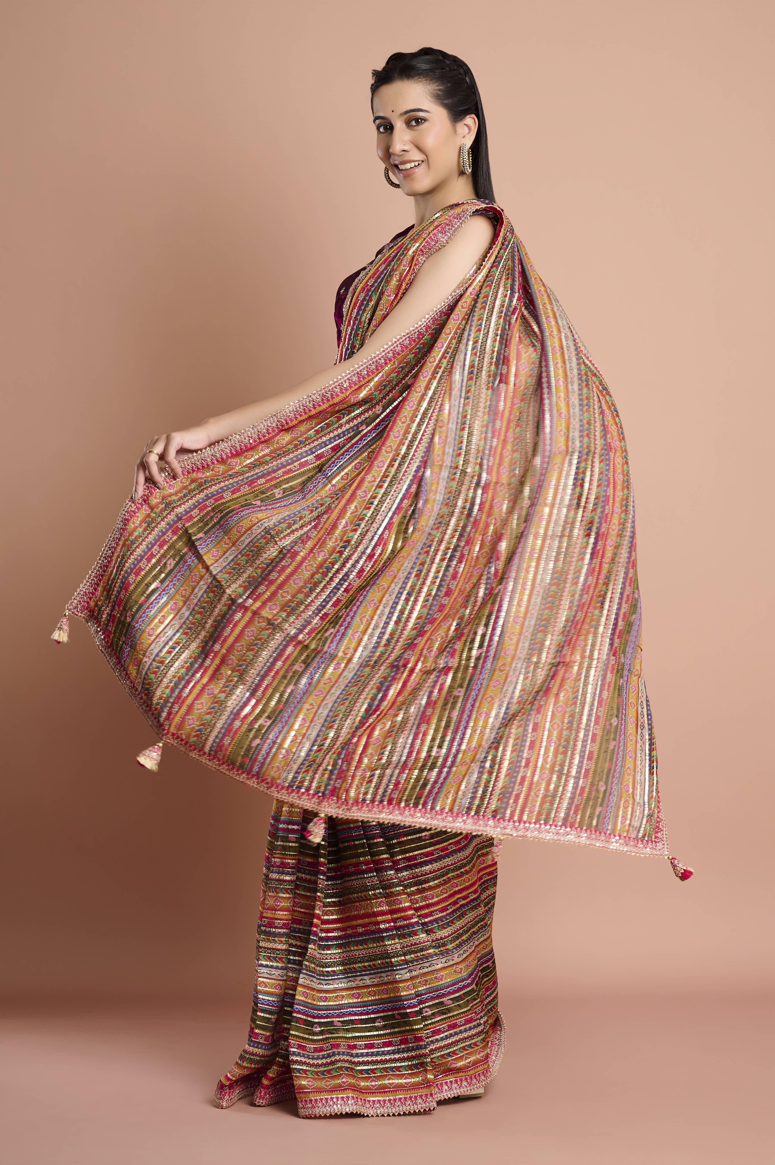 A lightweight organza saree with lively diagonal multicolour stripes and tiny ethnic motifs, accented by sleek metallic foil lines. The crisp, sheer drape is finished with a refined champagne scallop lace and subtle rani-pink piping. Floaty structure with sharp pleatsÑideal for mehendi, sangeet and festive evenings.