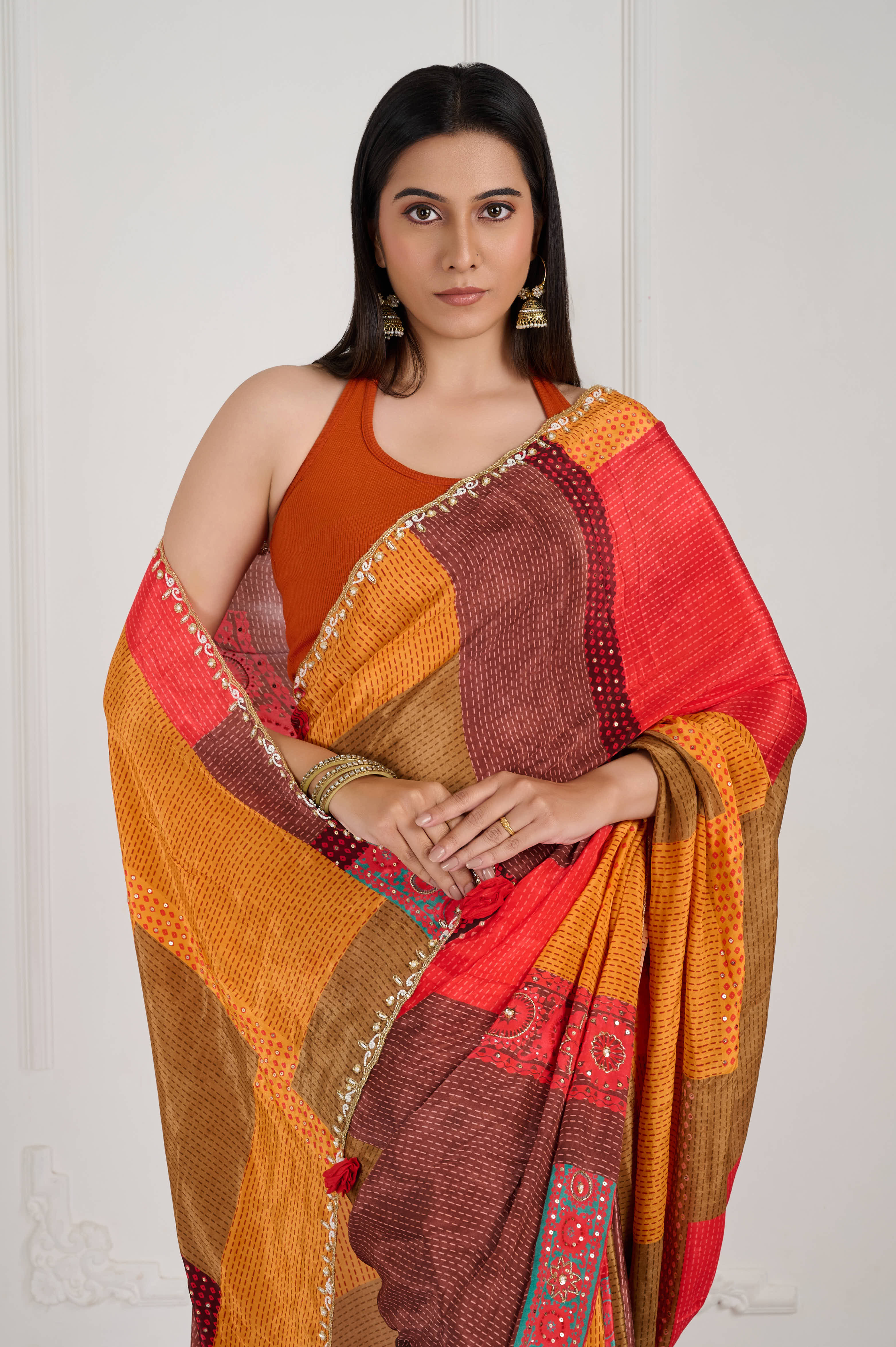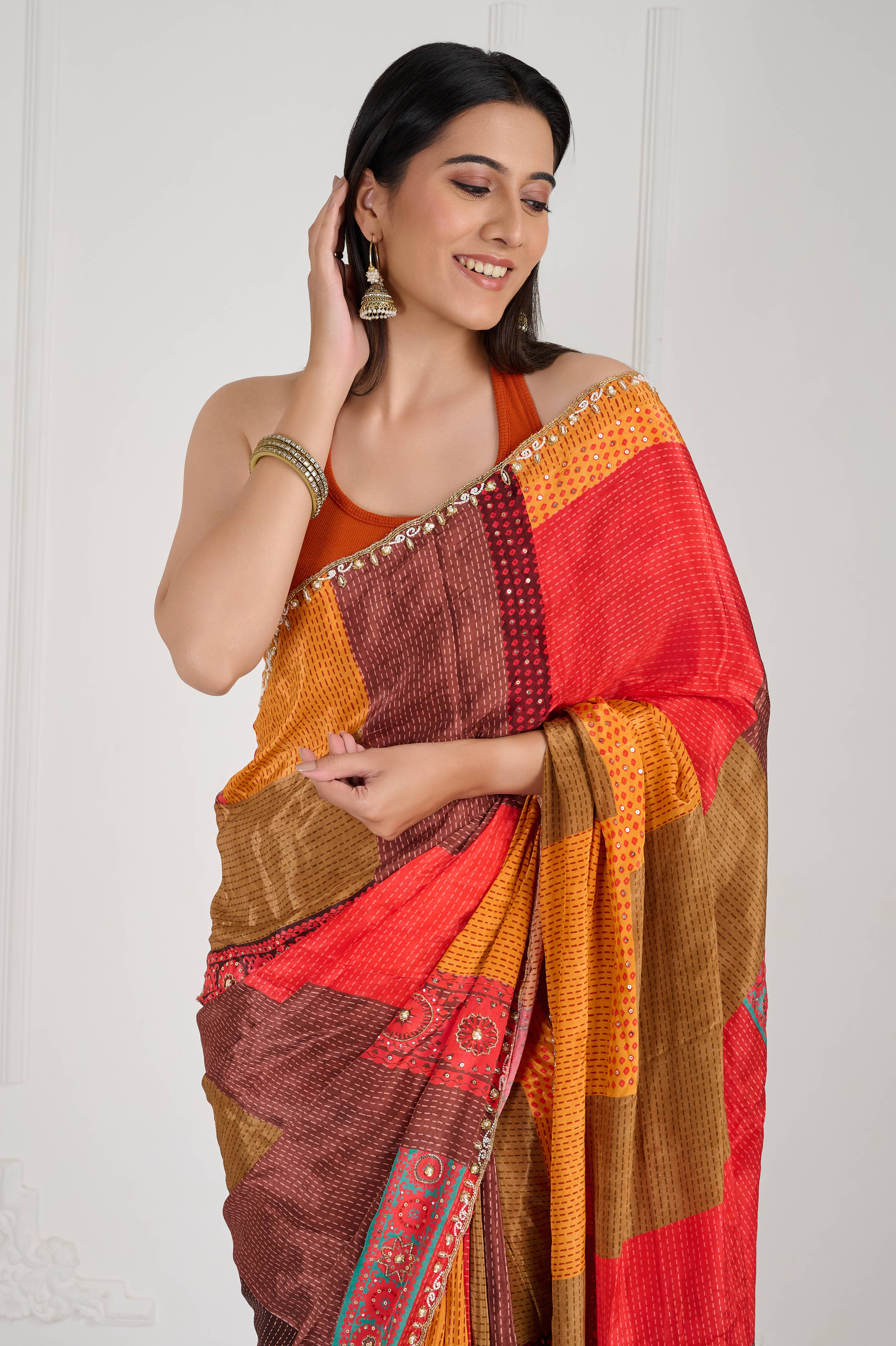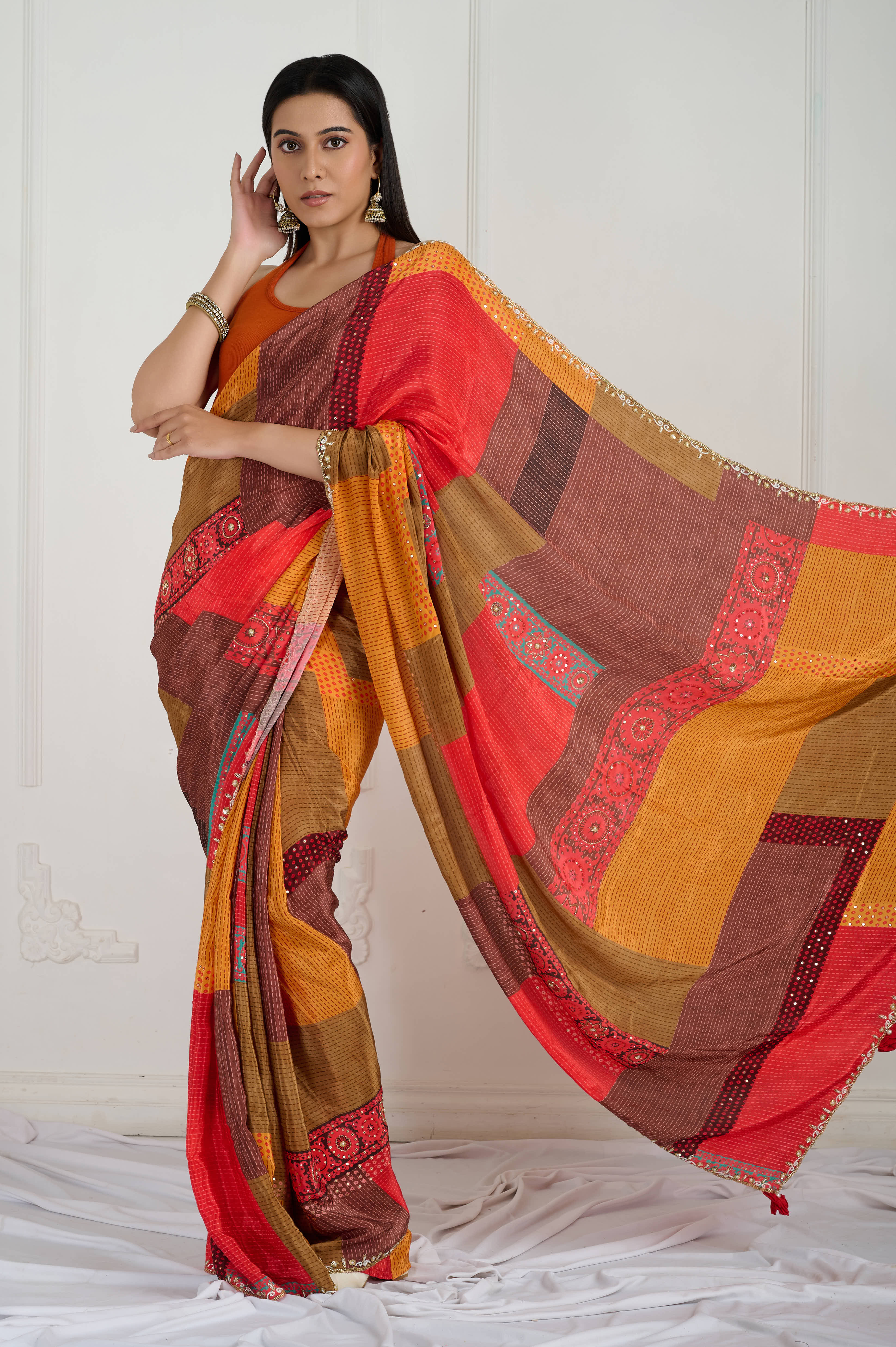 A vibrant crepe saree with a patchwork-inspired mix of bandhani/folk motifs in rust, coral, mustard and coffee brown, punctuated with pops of teal. Framed by a twinkling moti-work + sequin border with light hand highlights. Soft, fluid drape that pleats crisply, ideal for festive days and mehendi nights.