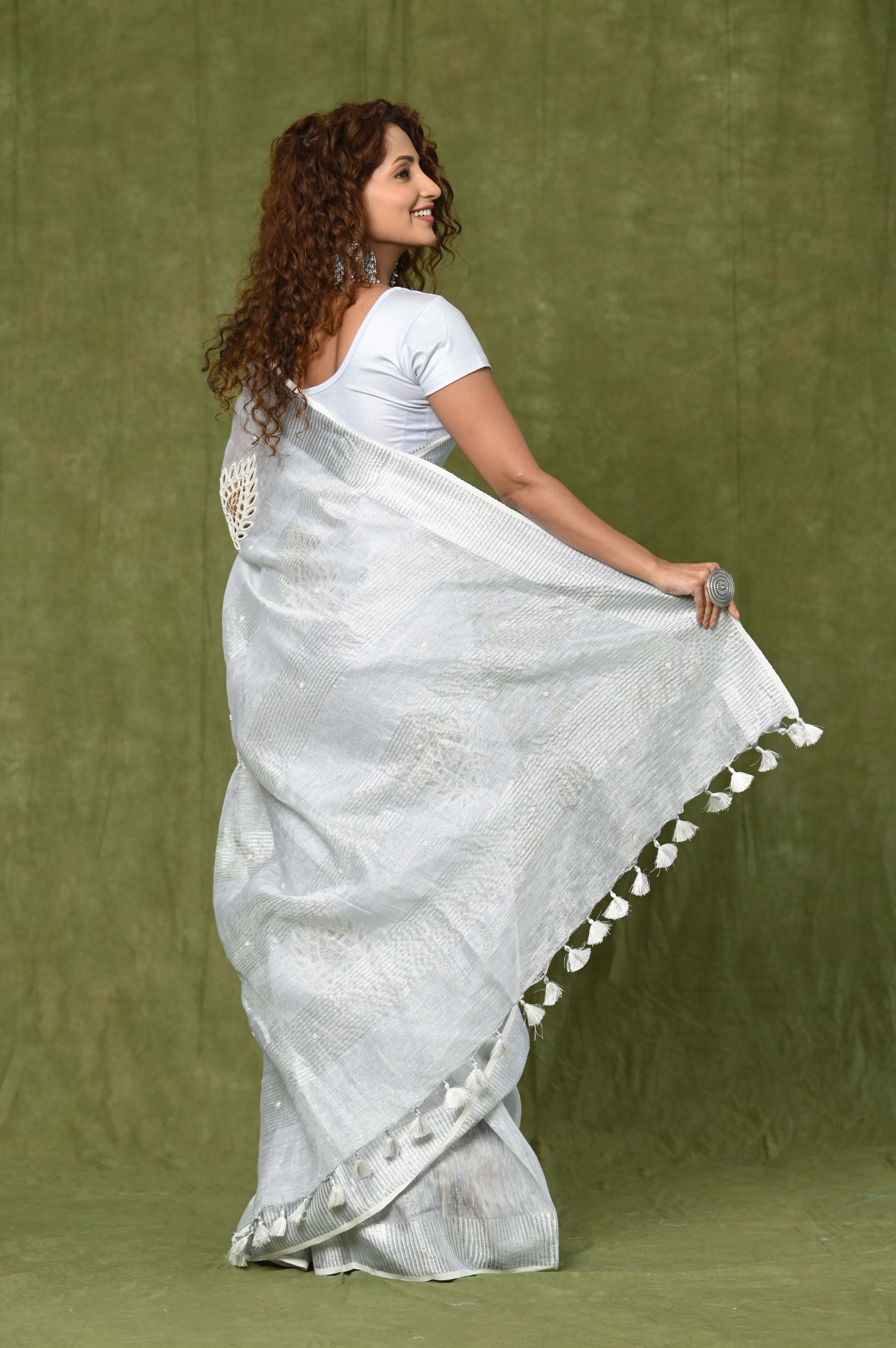 A linen tissue saree with handwork is a beautiful and elegant choice for various occasions. Linen tissue is a combination of linen, known for its breathability and texture, and tissue fabric, which adds a subtle sheen and transparency to the saree. Handwork can include various forms of intricate hand-embroidery, embellishments, or detailing.