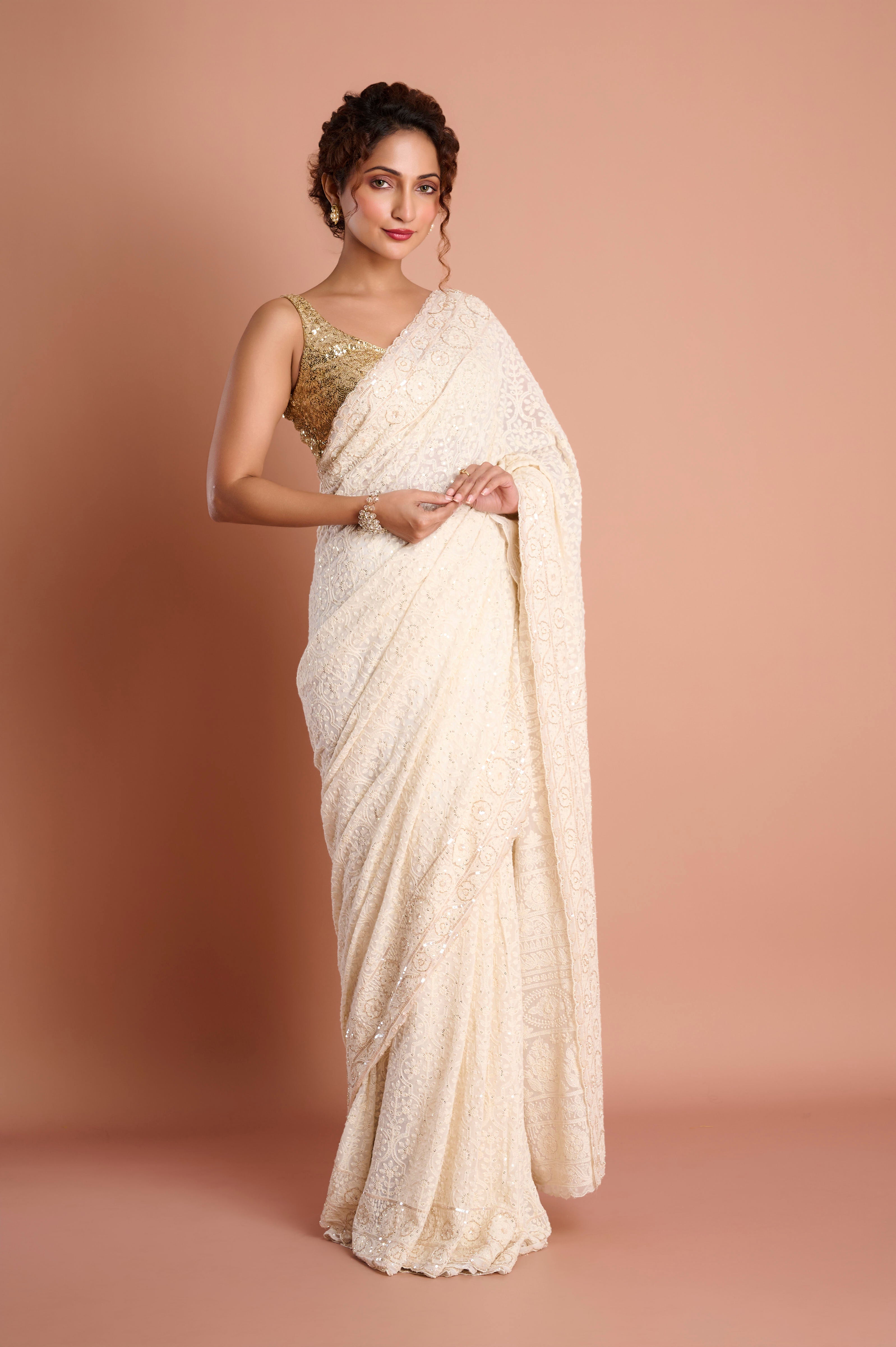 This exquisite ivory georgette saree beautifully combines delicate chikankari embroidery with intricate hand bead and sequin work, creating a subtle shimmering effect across lightweight fabric. The interplay of traditional chikankari stitches alongside sparkling beads and sequins adds texture, elegance, and a refined glamour to the saree. Perfect for festive occasions or weddings, the saree drapes gracefully, with a matching blouse piece included for a coordinated finishing touch.