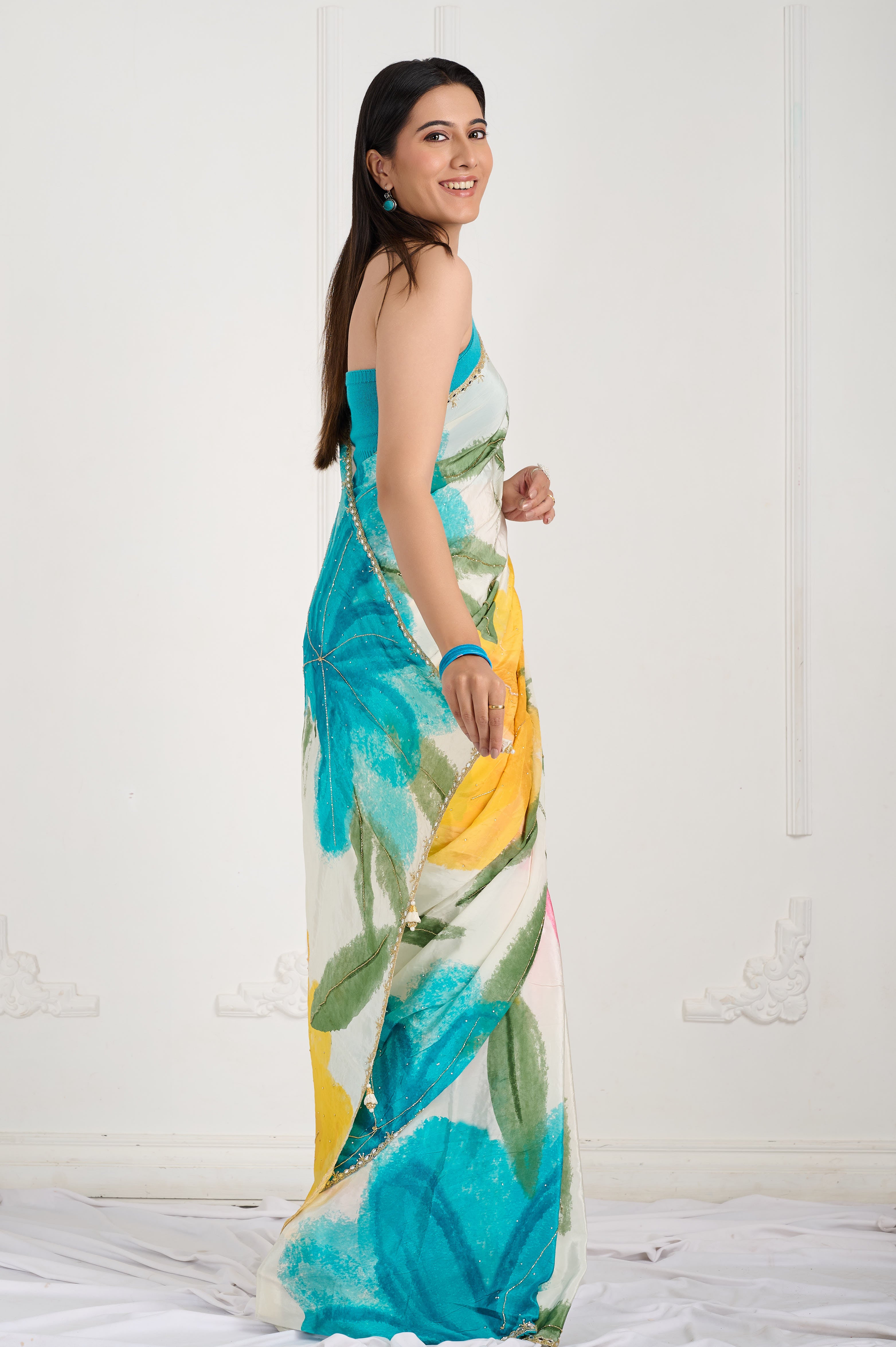 A breezy crepe saree on an ivory base featuring a watercolour-effect digital floral & foliage print in teal, sunshine yellow, petal pink and leaf green. Finished with a champagne micro-beads border with delicate hand-beaded accents, subtle dotted highlights across the body, and tiny tassels at the pallu. Light-medium weight with a fluid fall and crisp pleats, perfect for daytime celebrations and easy-glam evenings.