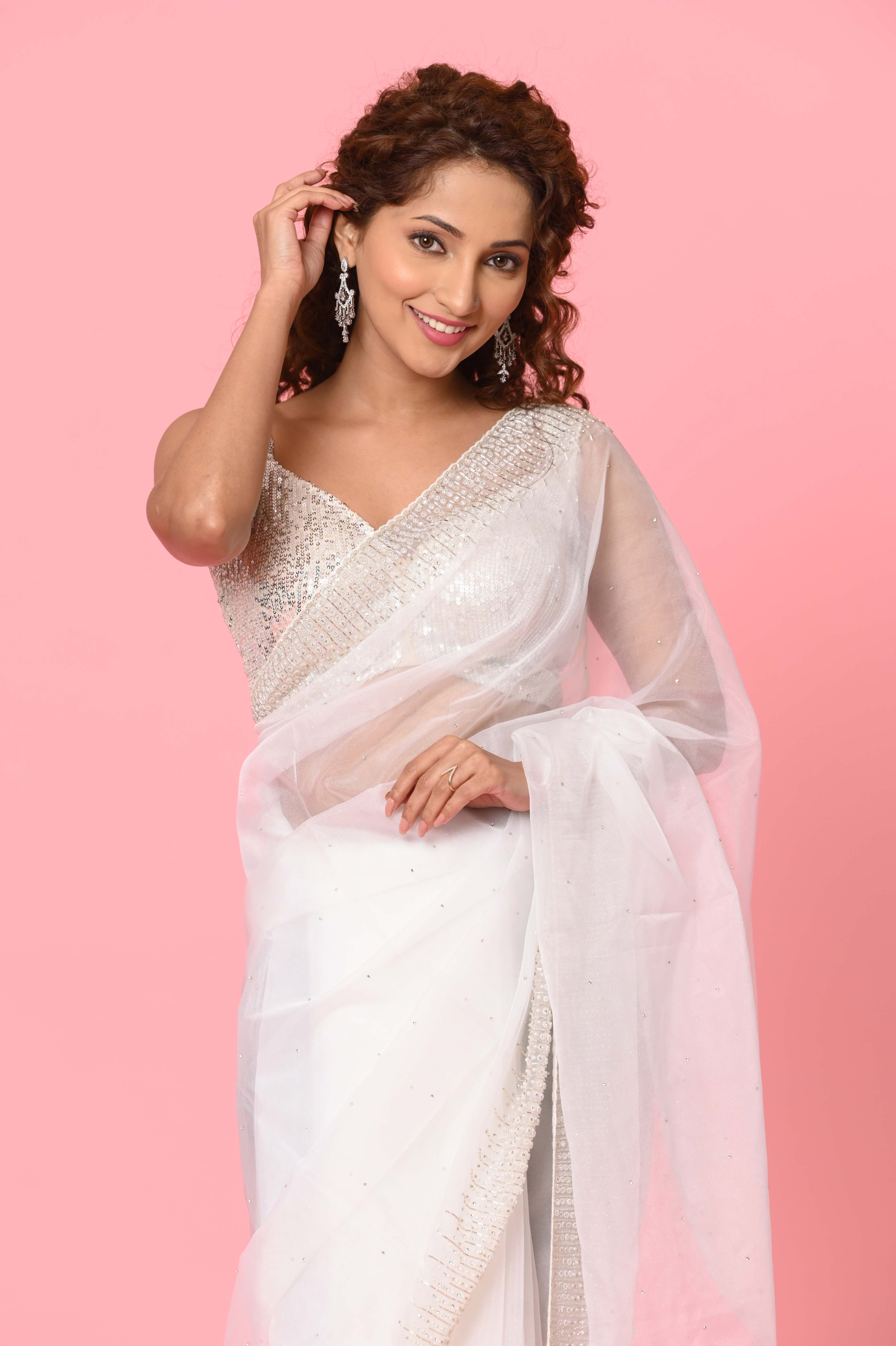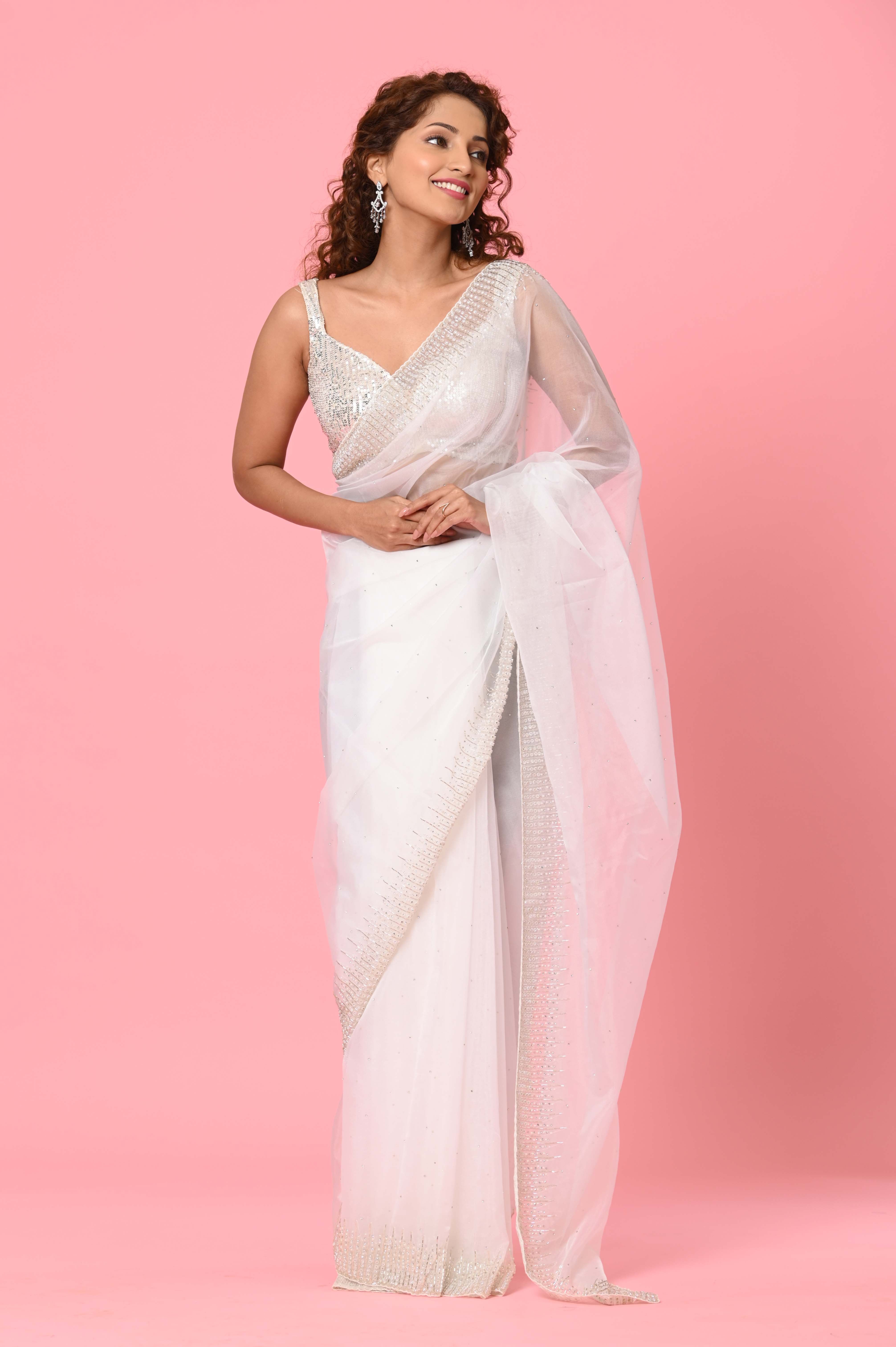An organza saree with beadwork is a beautiful and elegant choice for those who appreciate delicate embellishments and the sheer, ethereal quality of organza fabric. Beadwork adds texture, sparkle, and intricate designs to the saree, making it a luxurious and stylish option for special occasions