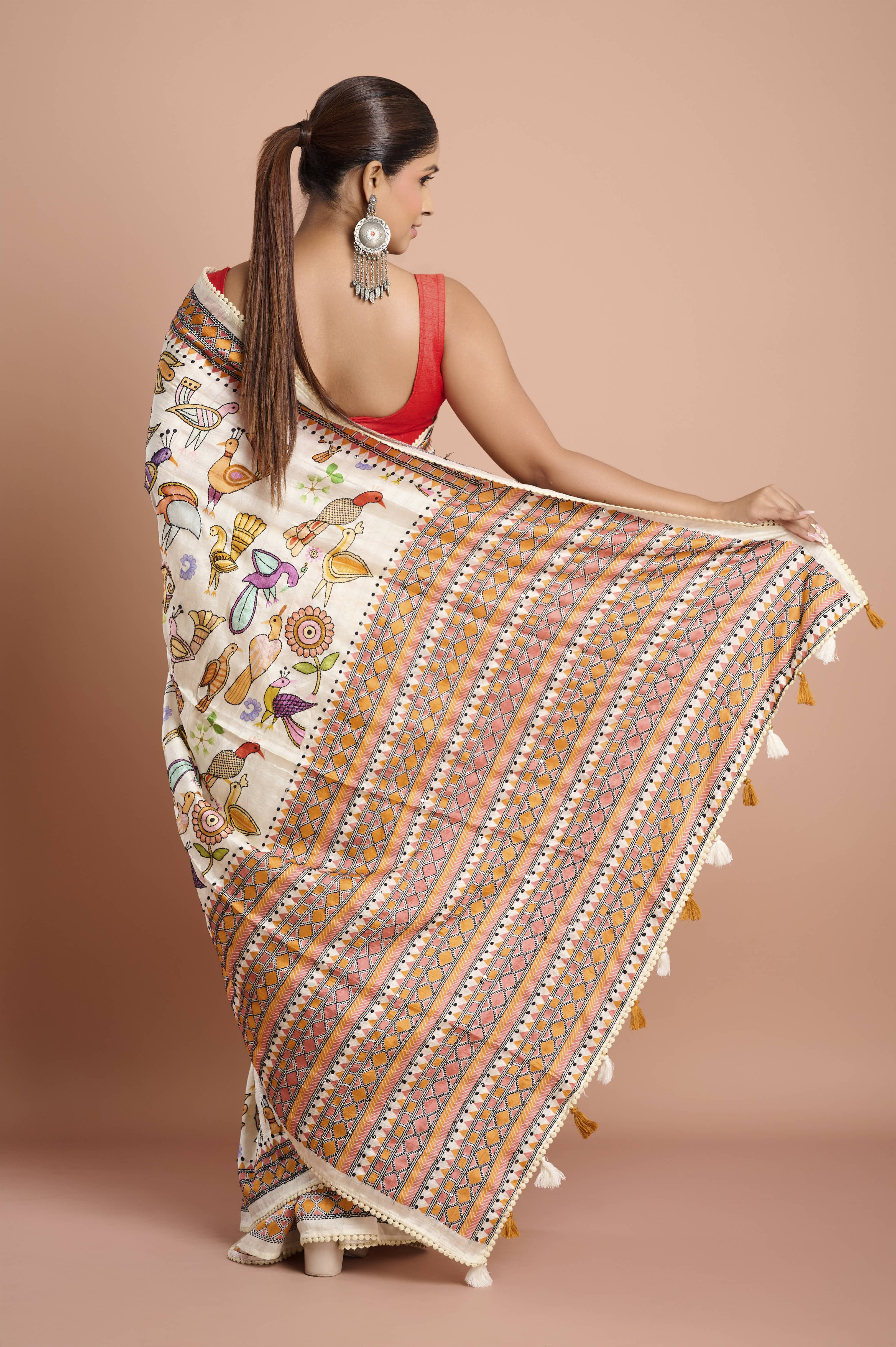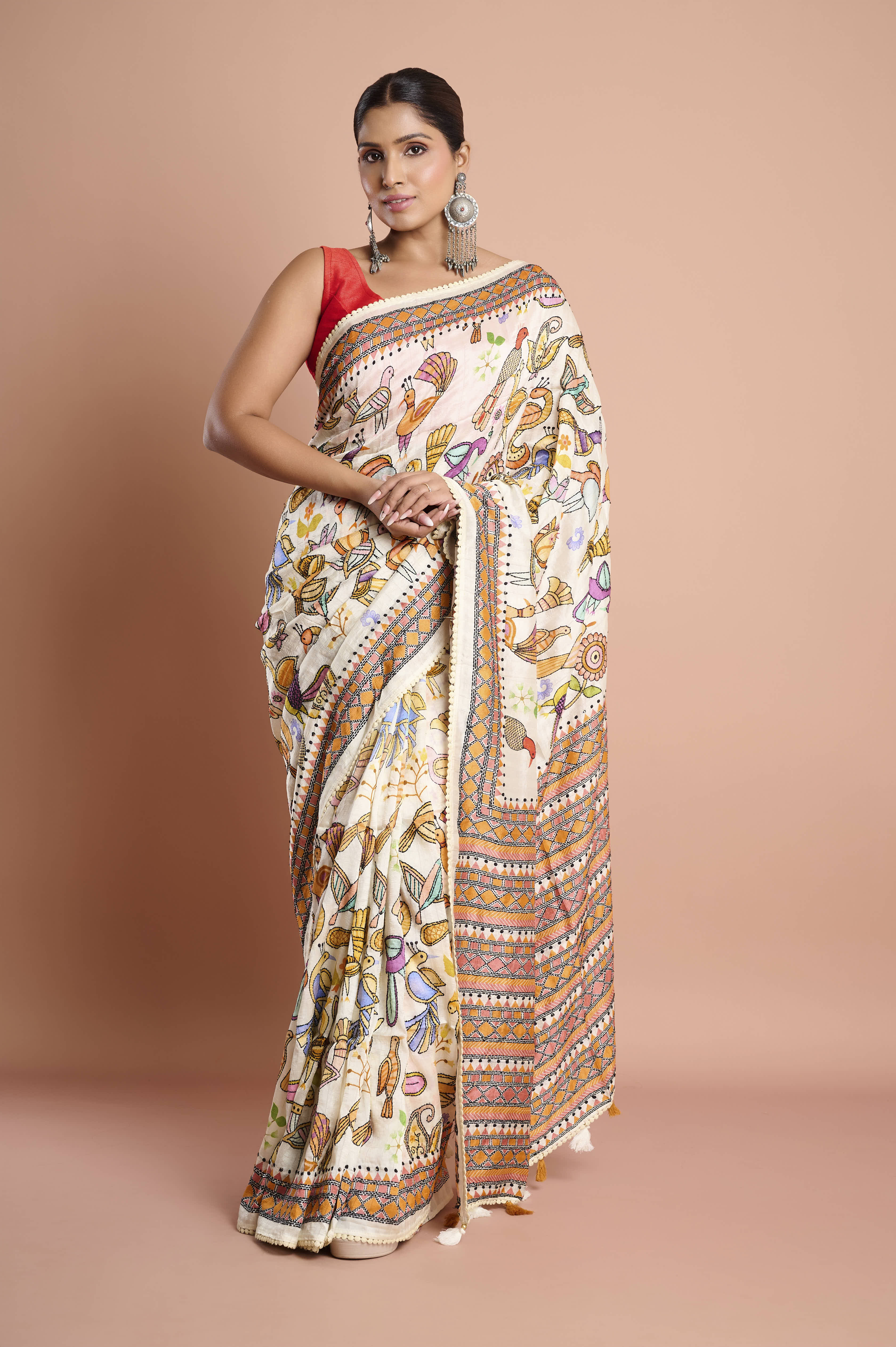 Bring a touch of artistry to your wardrobe with this Russian silk saree in soft ivory, featuring vivid handwork all over. Dotted with whimsical, multicoloured bird and animal motifs across the body and borders, every inch celebrates playful elegance and folk-inspired charm. The lustrous silk enhances each embroidered detail, while orange geometric border patterns frame the saree with a bright, festive vibe. Perfect for collectors and lovers of statement drapes, it ensures both fluid comfort and conversation-starting style. An unstitched blouse piece is provided for your unique finish.