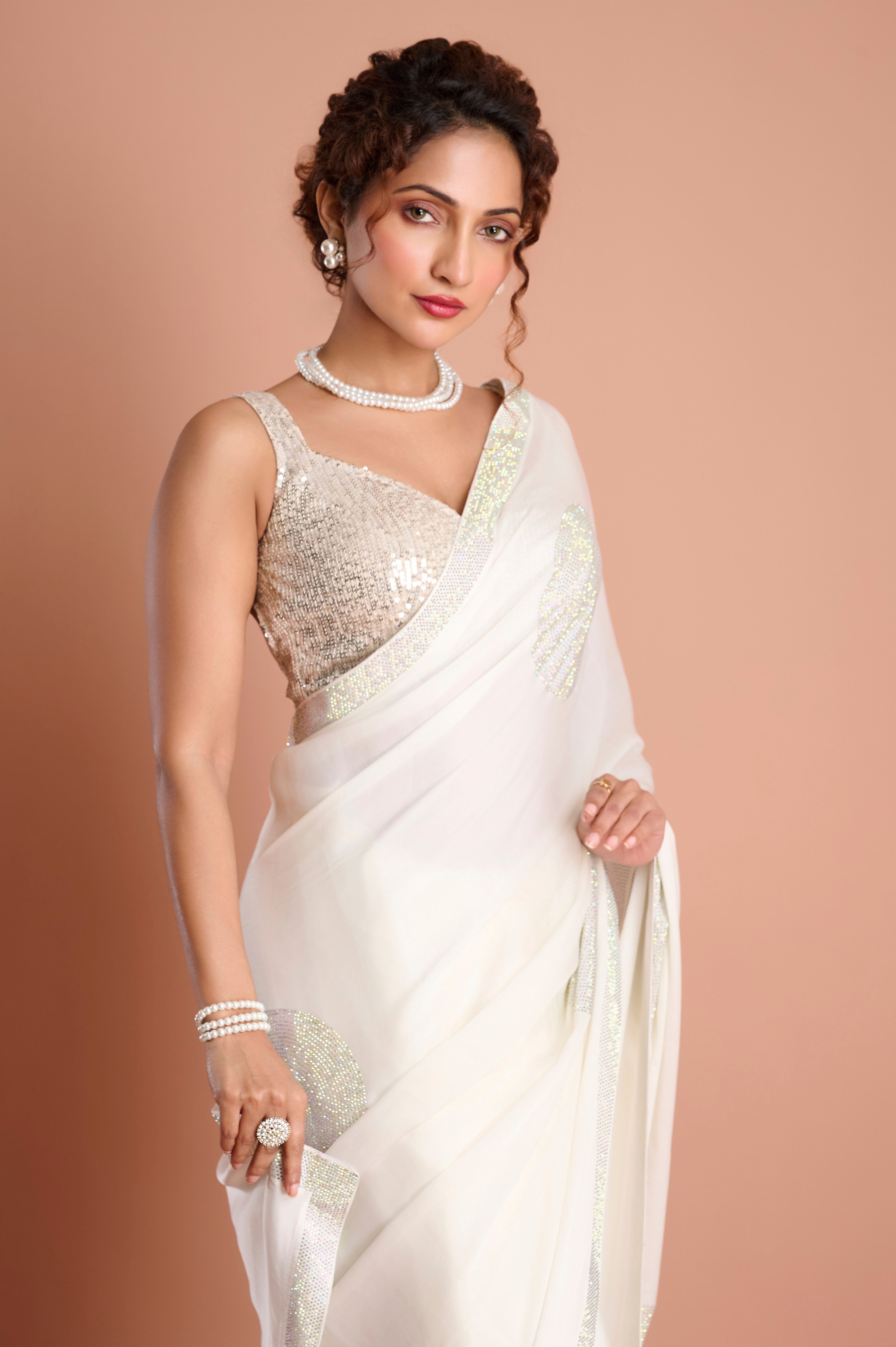 This elegant white satin saree stands out with its ultra-soft, luminous drape, featuring large silver sequin-embroidered circular motifs scattered across the body for a sleek, modern twist. The saree's finishing touch includes a slim metallic border intricately hand-beaded with delicate silver work, perfectly complementing the overall minimal yet festive vibe. The satin's glossy texture and fluidity make it an excellent pick for evening soirees, cocktail parties, or formal celebrations. An unstitched blouse piece is included for versatile, personalized styling.