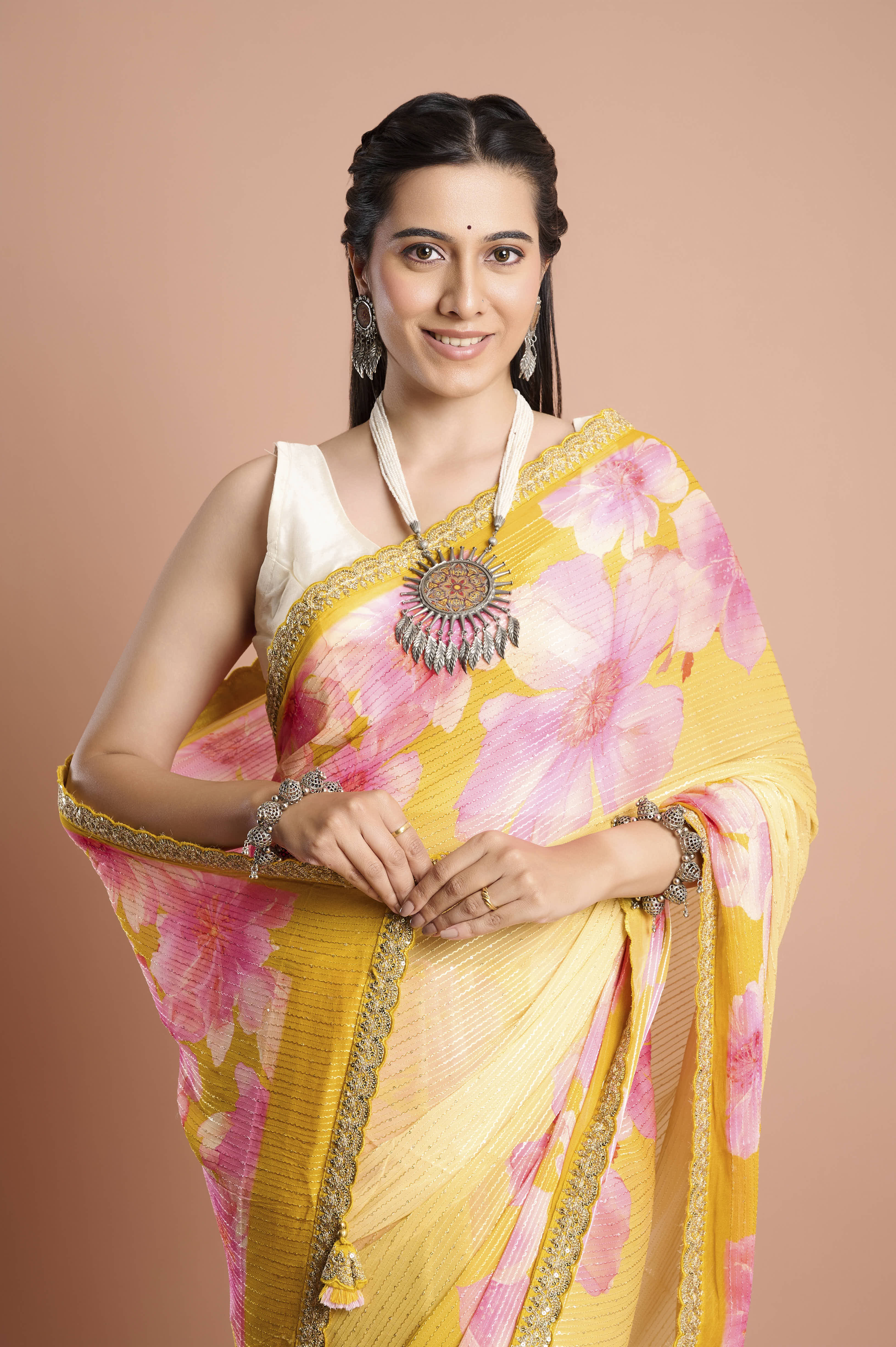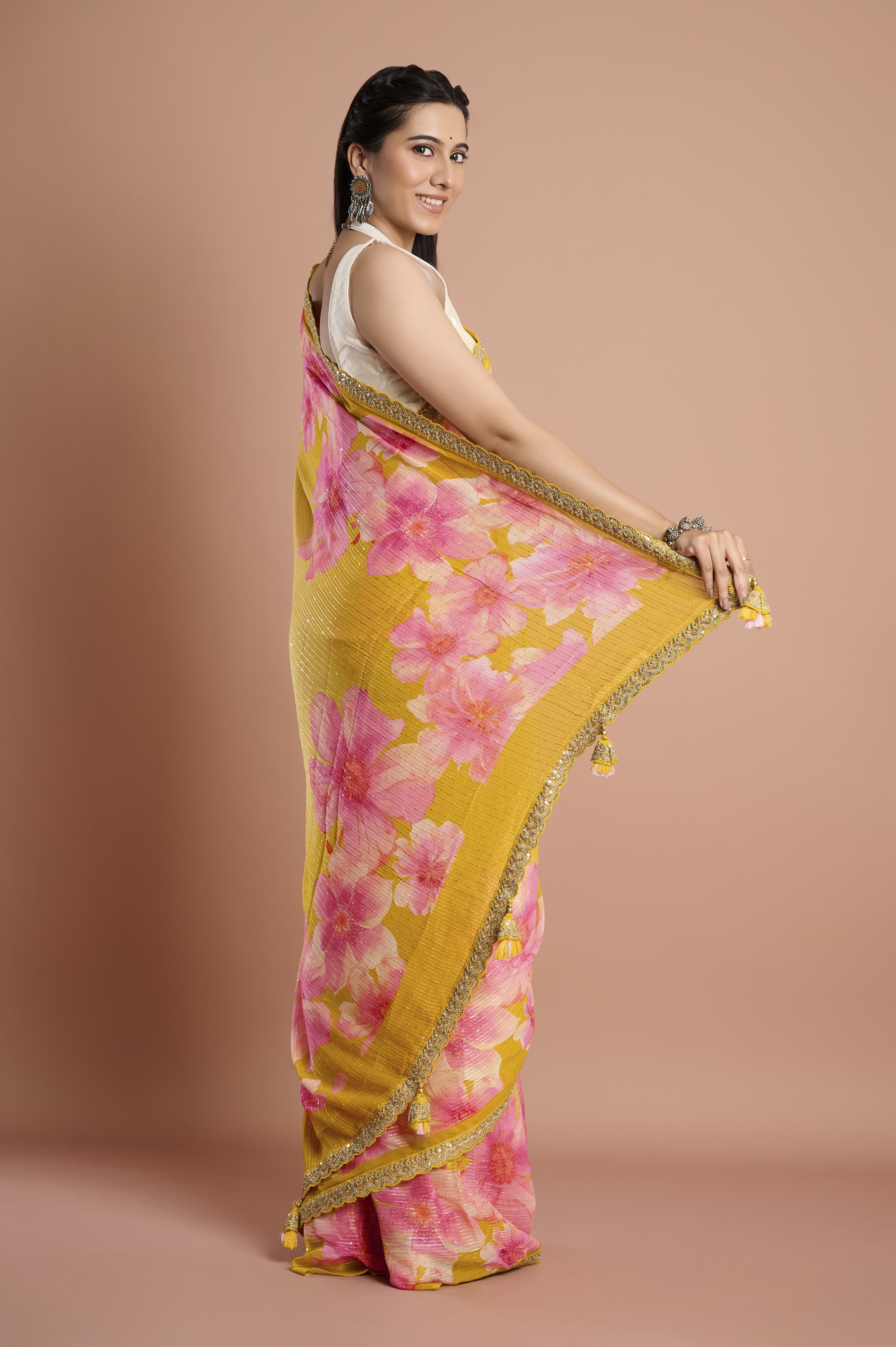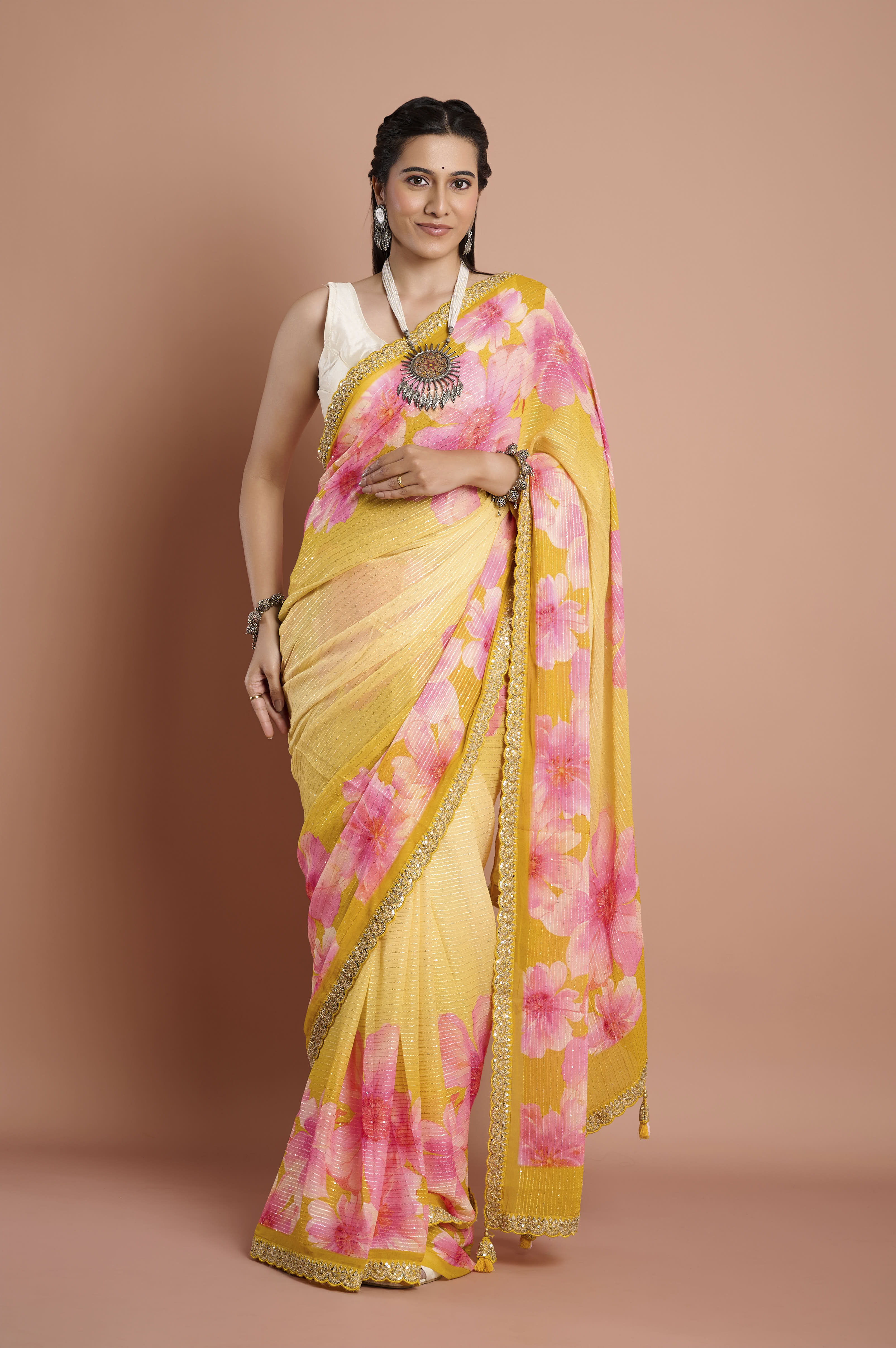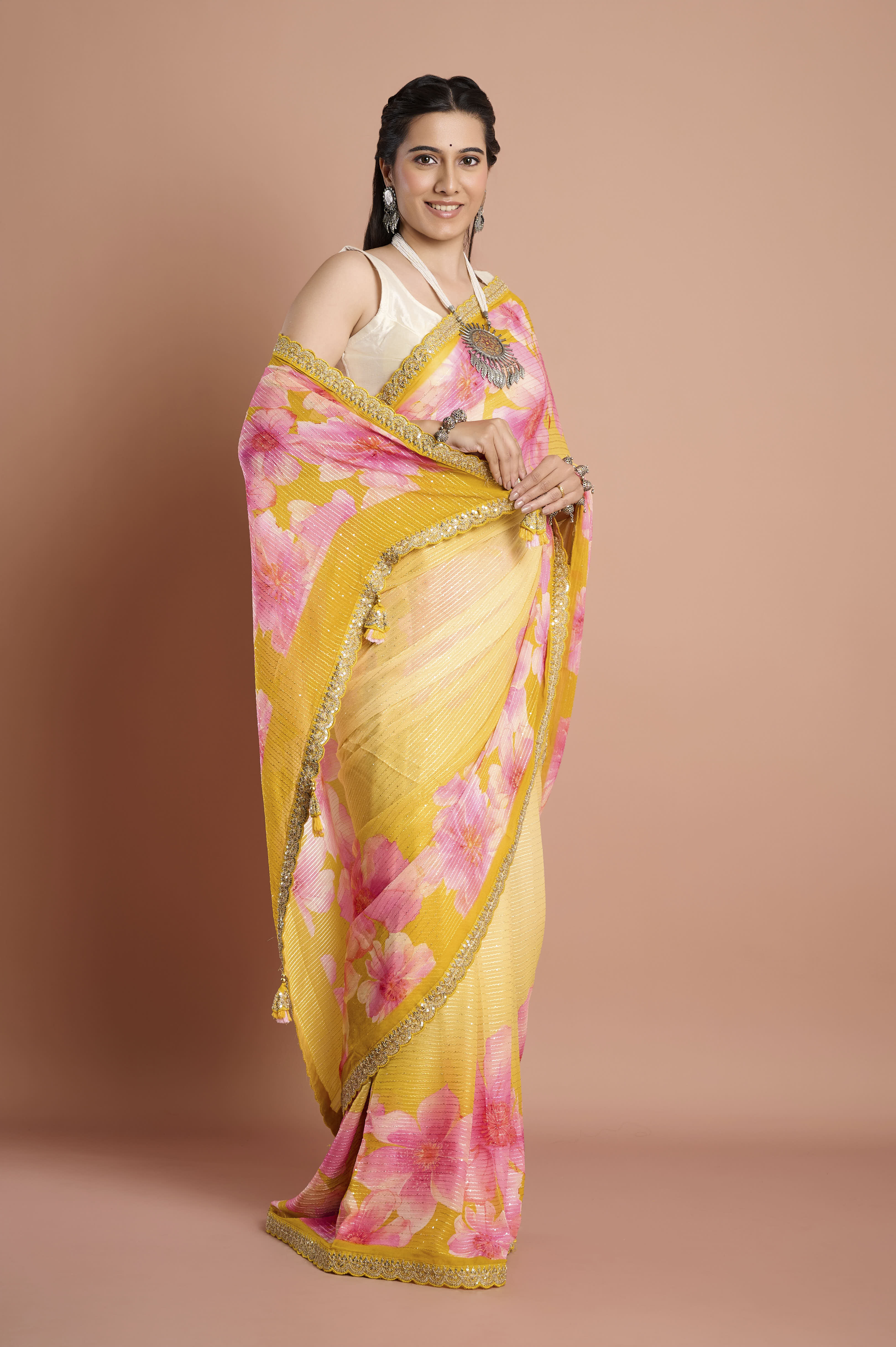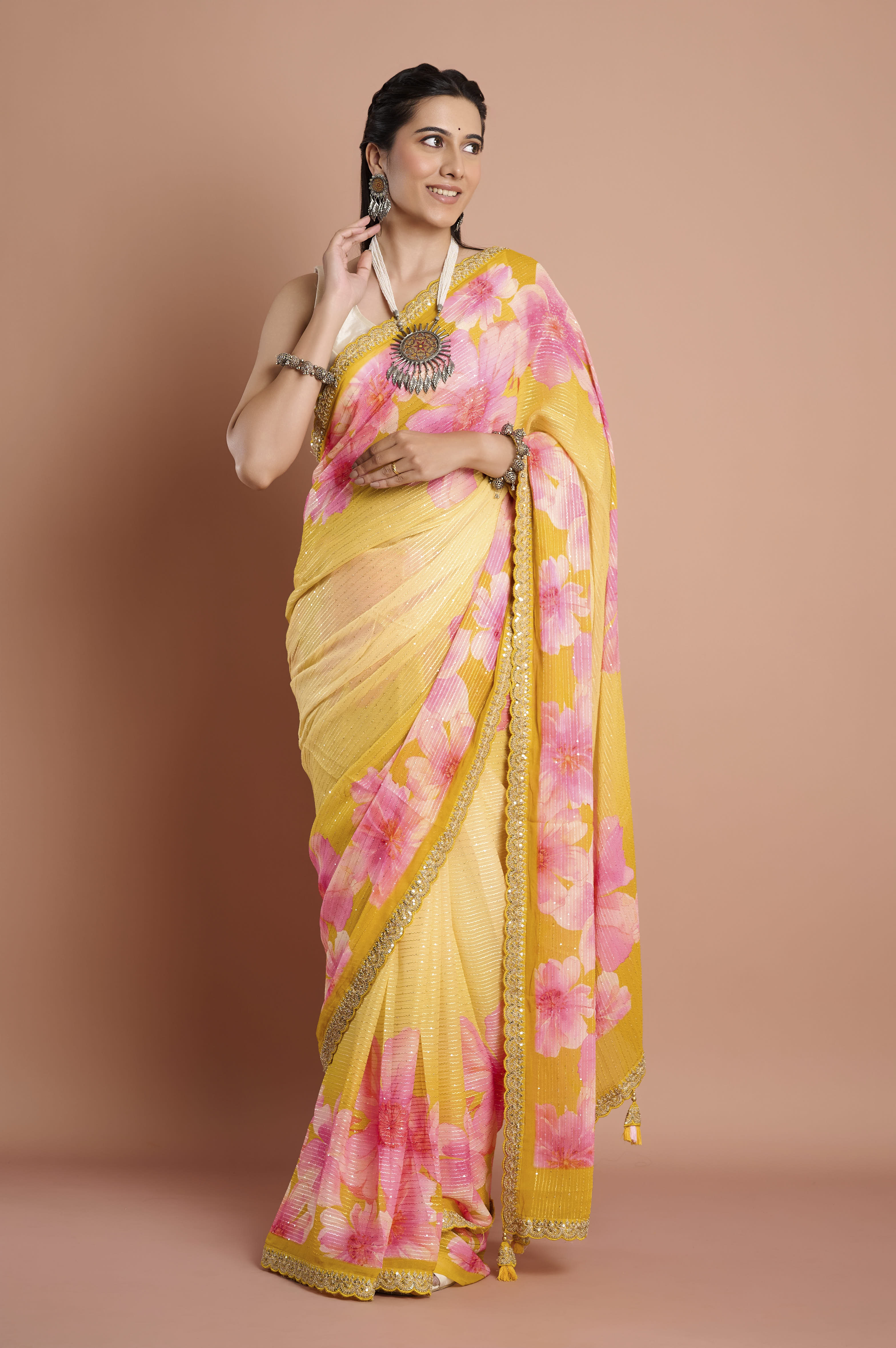 This stunning saree features a vibrant combination of sunshine yellow and soft pink hues in an artistic abstract watercolor print on luxurious chinon fabric. The saree showcases beautiful flowing patterns with painterly brush stroke effects that create a dreamy, ethereal appearance throughout the drape. It is enhanced with an exquisite golden embroidered border with intricate detailing that adds traditional elegance to the contemporary design. The premium chinon fabric ensures effortless draping and all-day comfort, making it perfect for festive occasions, celebrations, and special events.