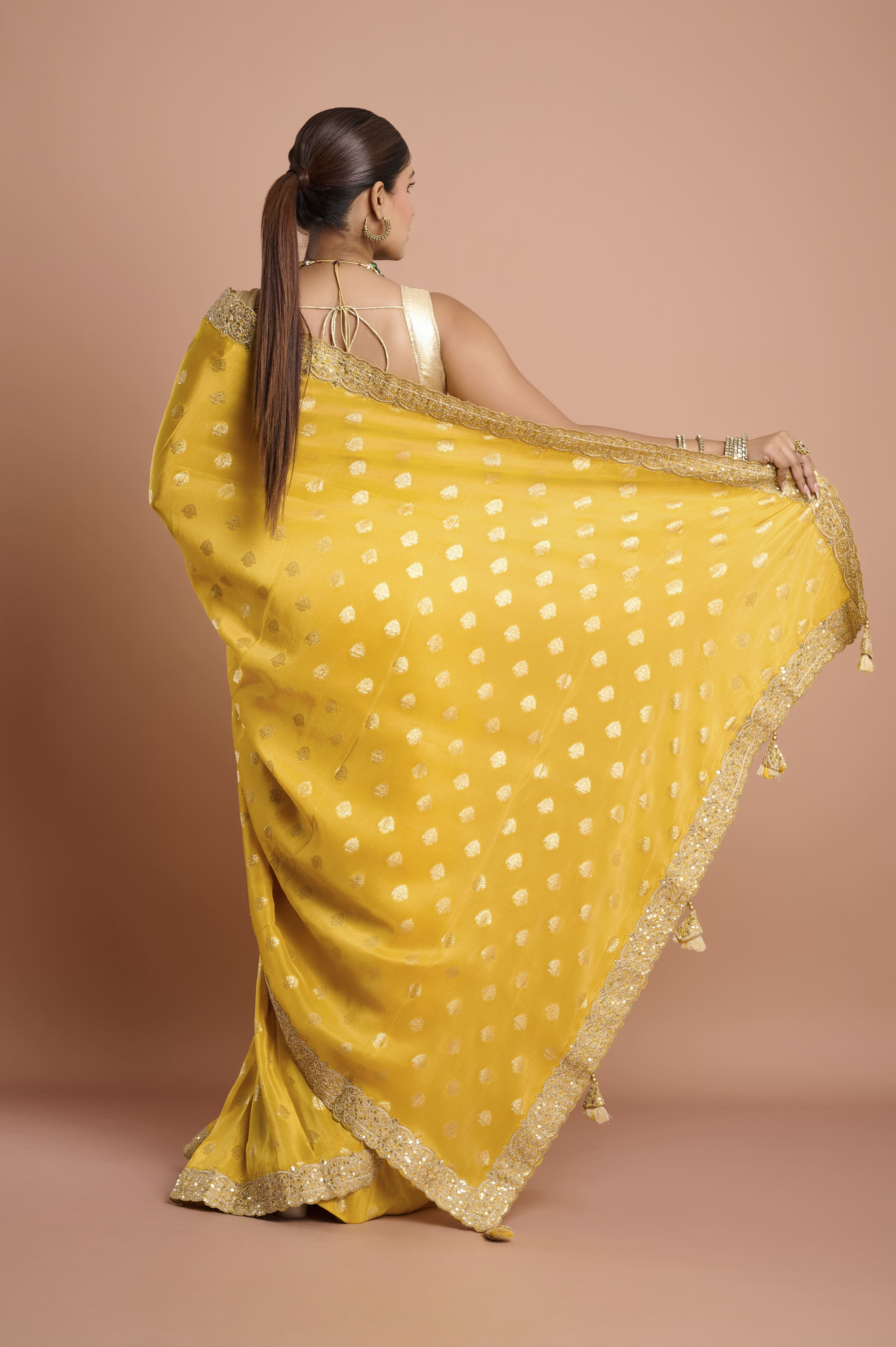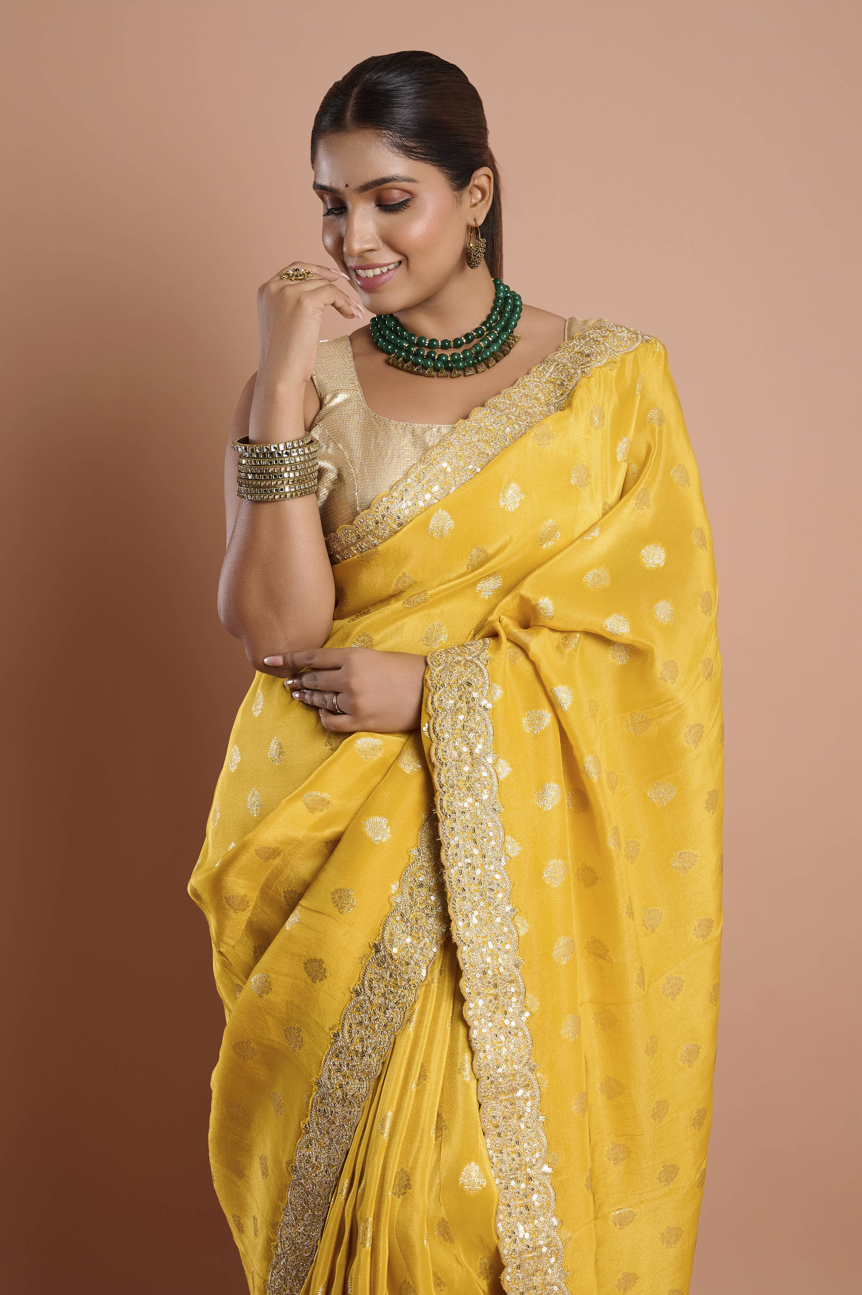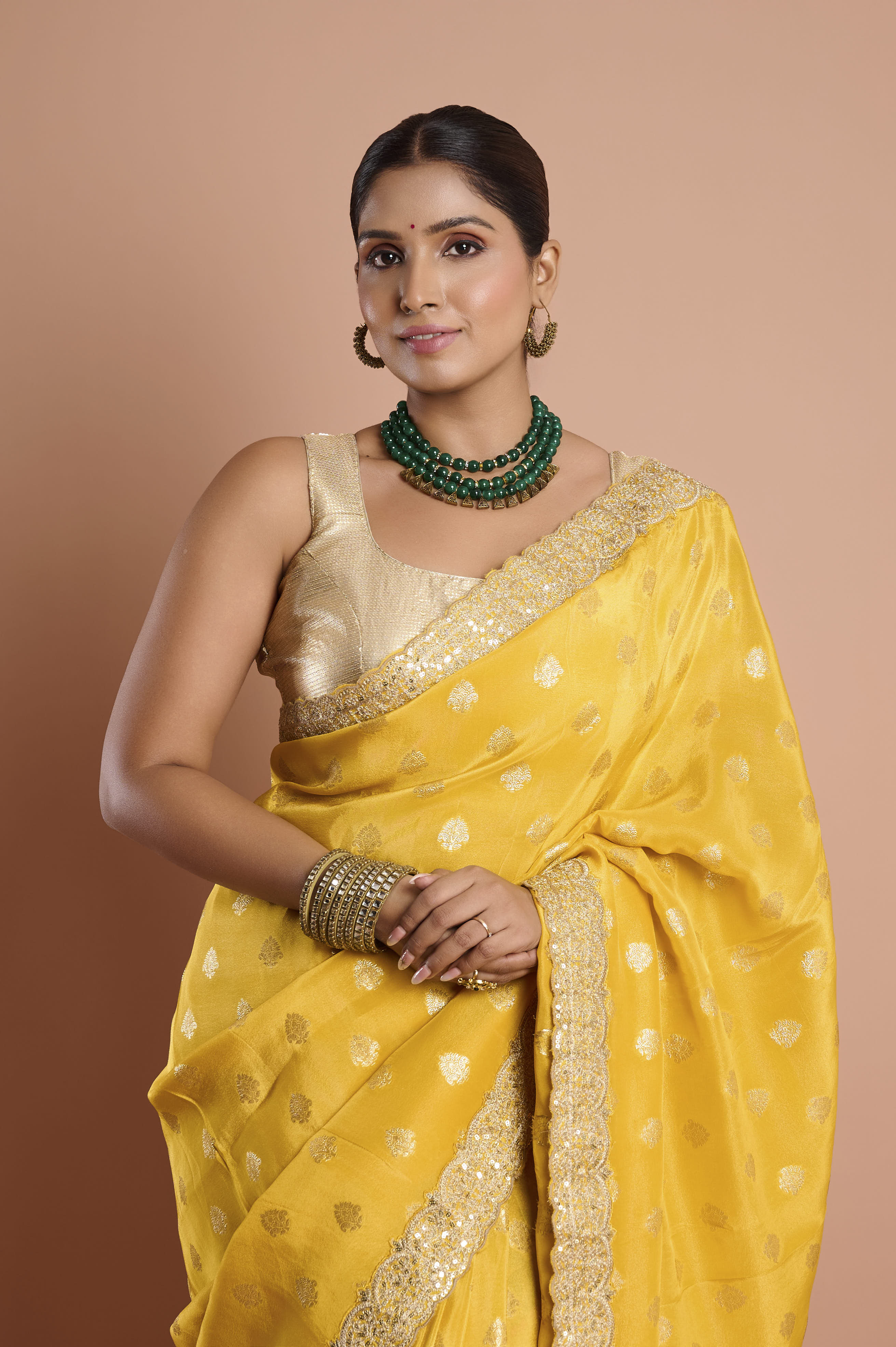 Turn heads at every celebration with this radiant yellow tissue saree, gracefully woven with golden zari buttas for a rich, traditional texture. The saree is bordered with a wide, embellished gold edge adorned with sequins and intricate zari work, finished with matching gold tassels for extra festive flair. The feathery-light, sheer tissue fabric offers a stunning drape and a luminous glow, making this saree a beautiful choice for weddings, haldi ceremonies, or grand festivities. Each saree comes with an unstitched blouse piece for fully customized styling.